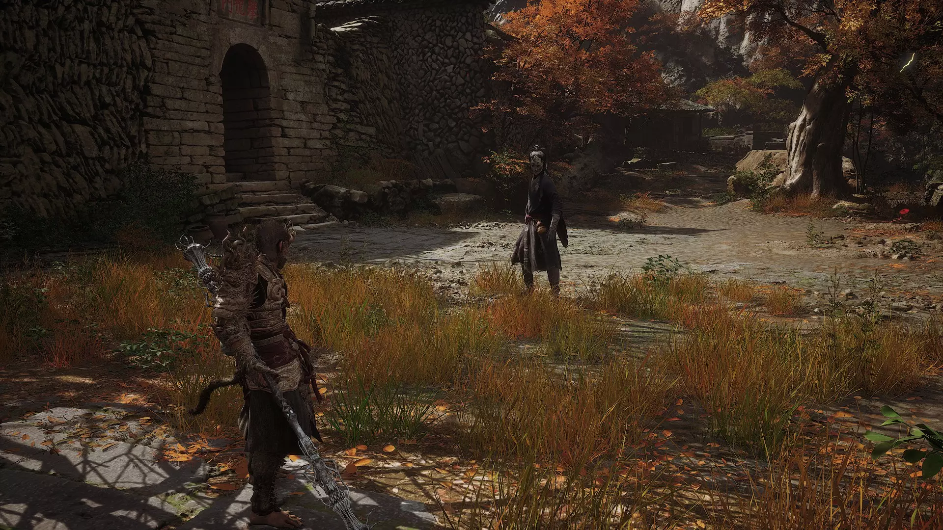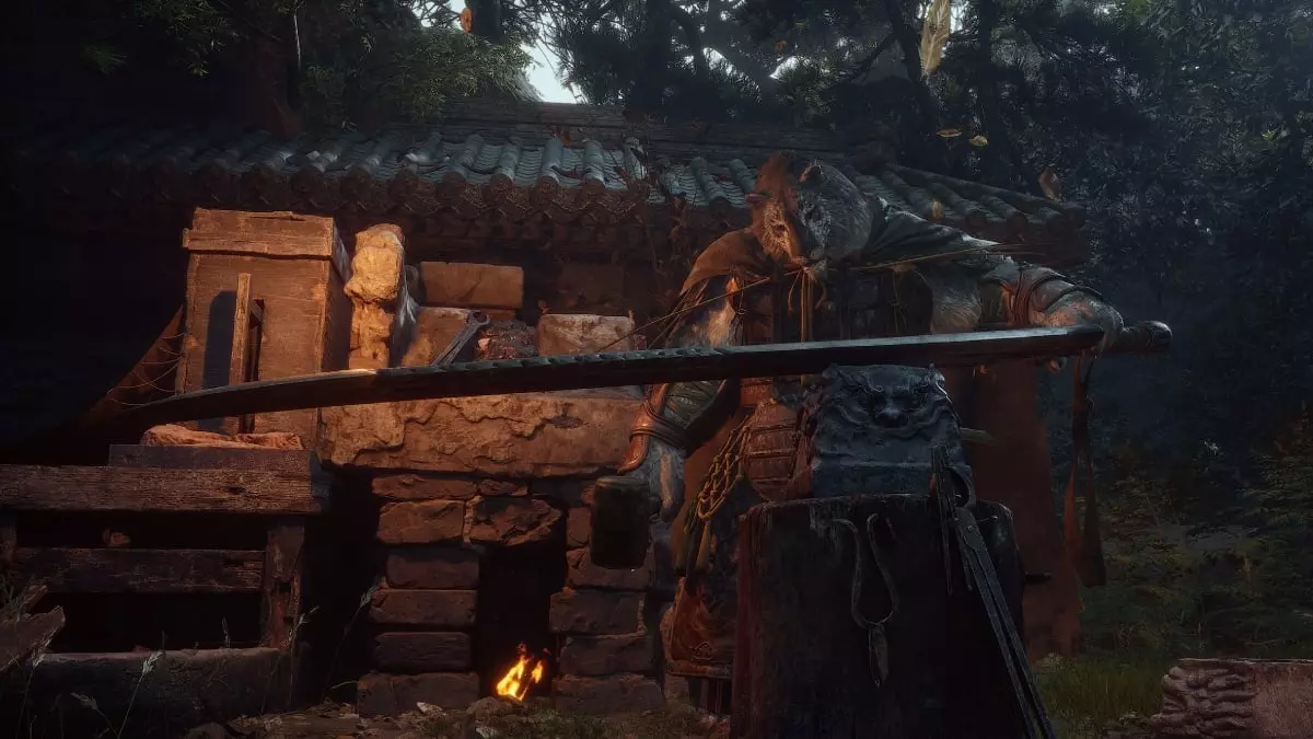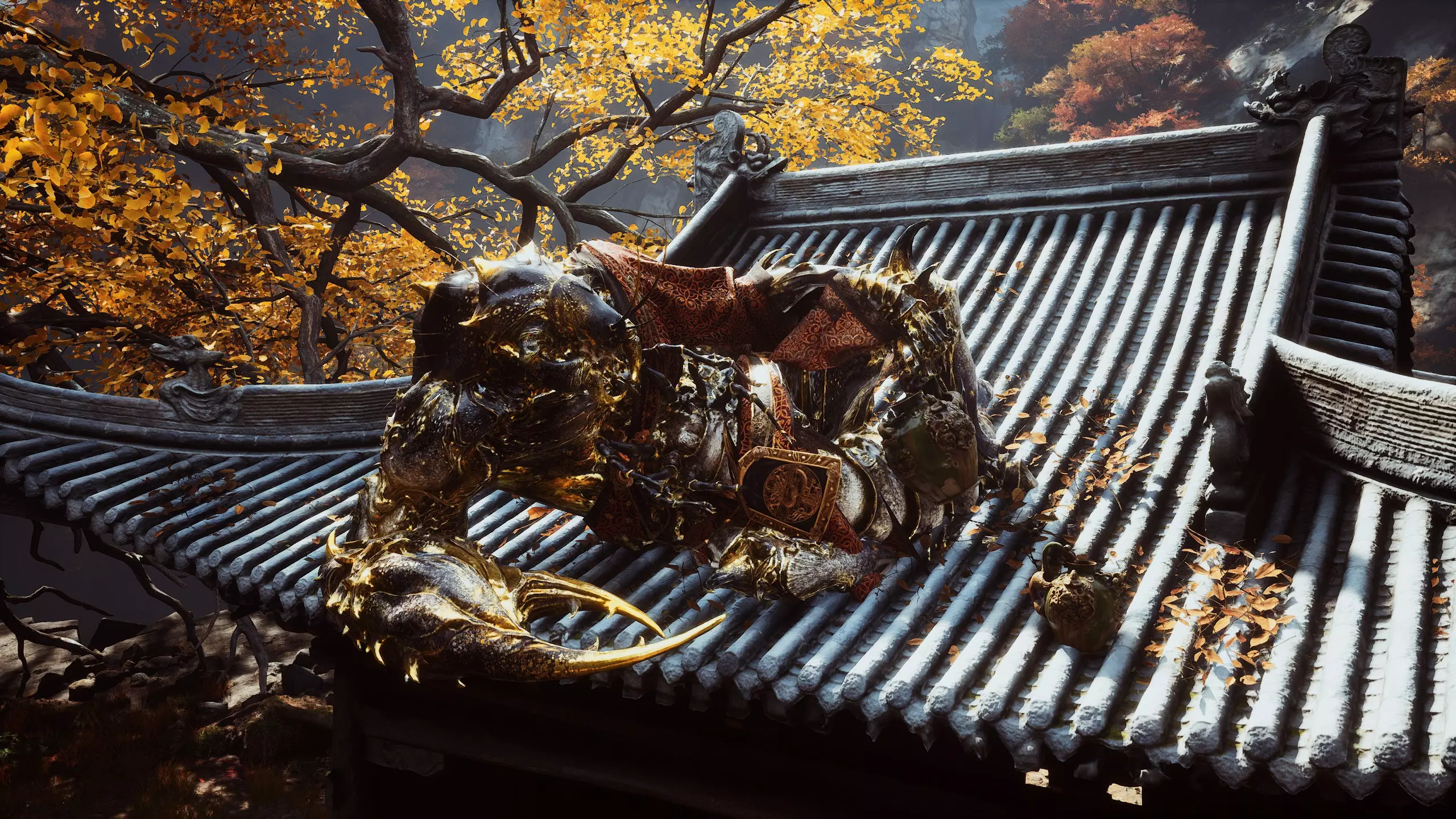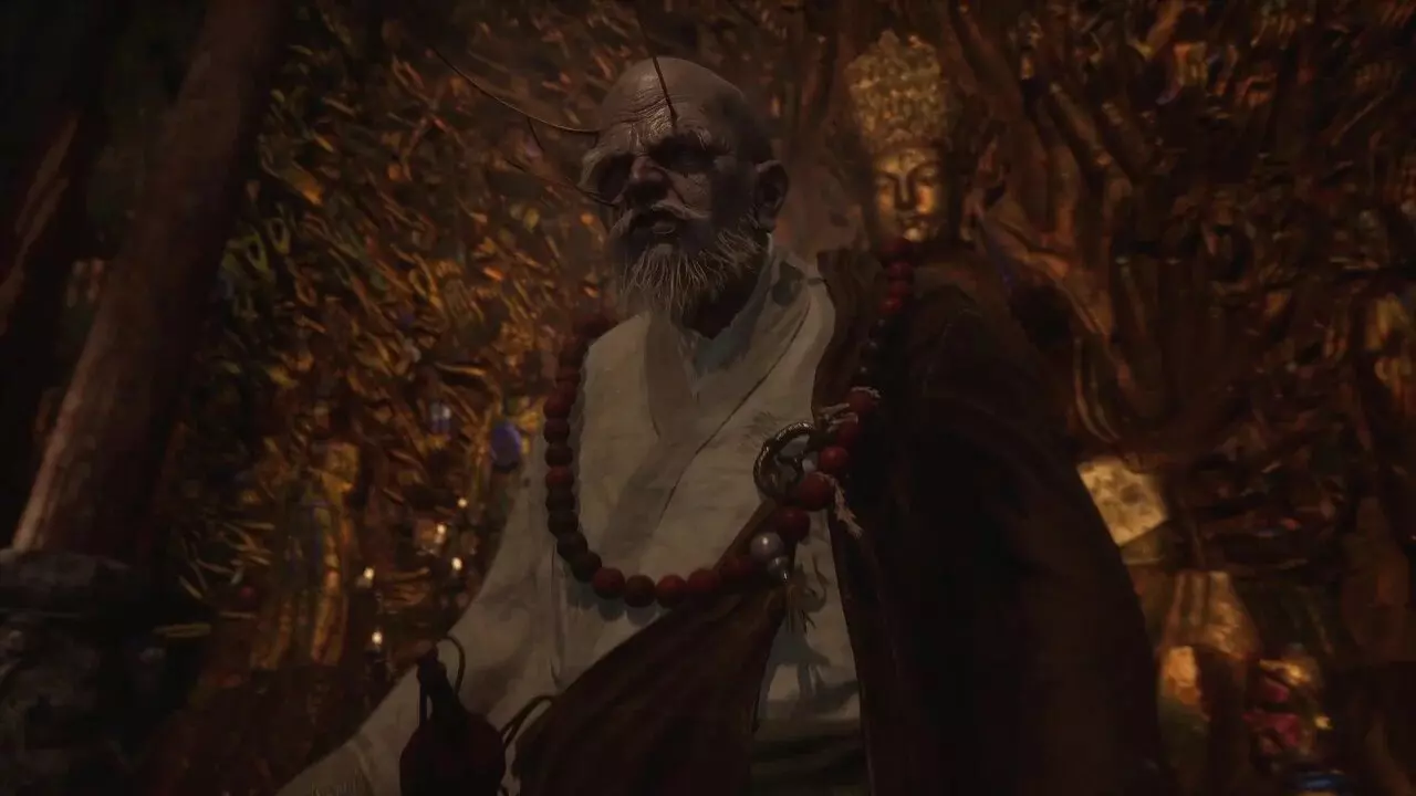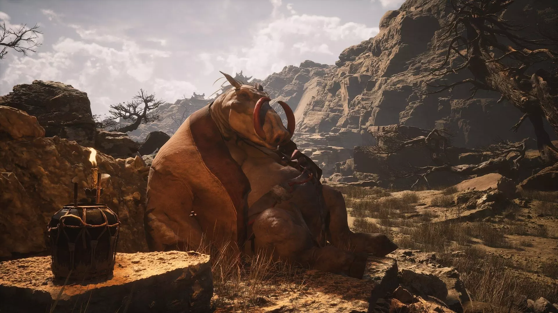 蝎子王(来自新区域)他会坐在屋顶上喝着清酒或米酒,不想下来。而我们是聪明的猴子——不傻,打碎建筑物附近的罐子,他就会乖乖下来。有趣的事实:如果不杀他,也就是不挑衅也不打碎罐子,那么在最终 boss 战时他会帮助我们!而且成就依然会解锁!