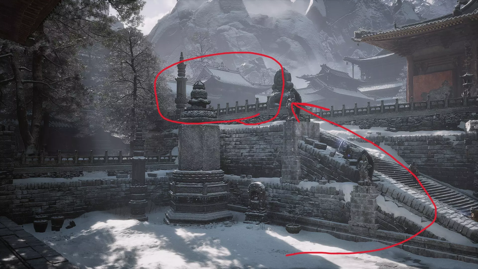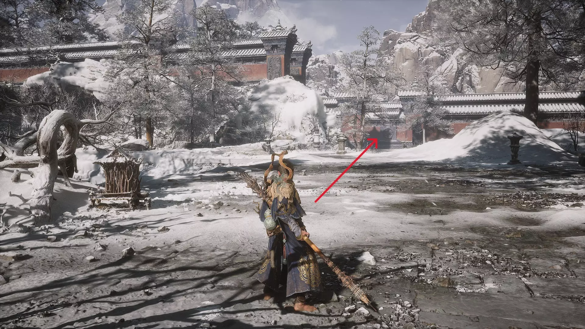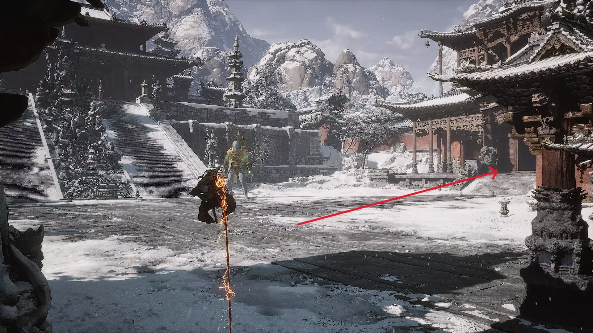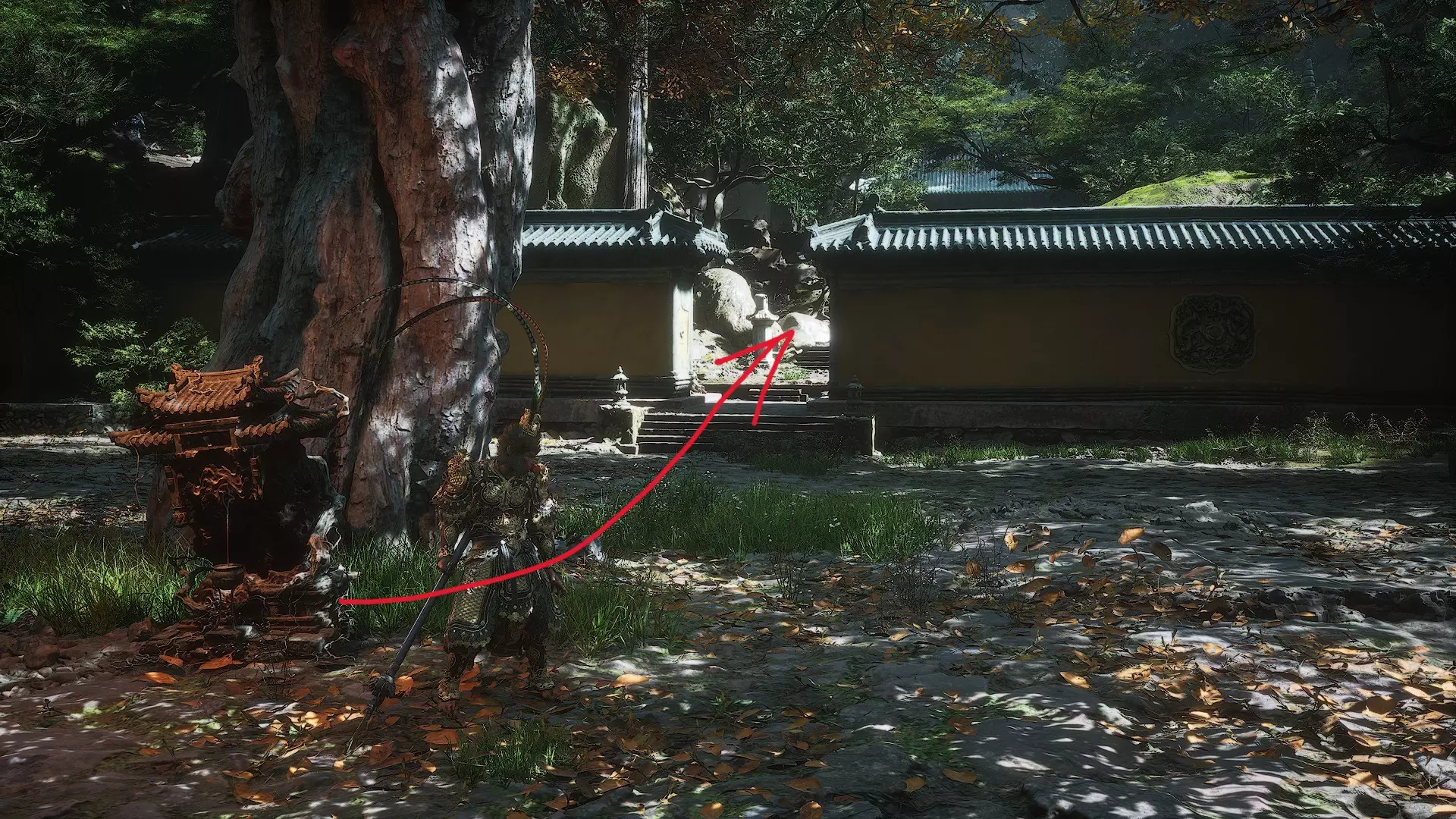 蝎子王(来自新区域)他会坐在屋顶上喝着清酒或米酒,不想下来。而我们是聪明的猴子——不傻,打碎建筑物附近的罐子,他就会乖乖下来。有趣的事实:如果不杀他,也就是不挑衅也不打碎罐子,那么在最终 boss 战时他会帮助我们!而且成就依然会解锁!