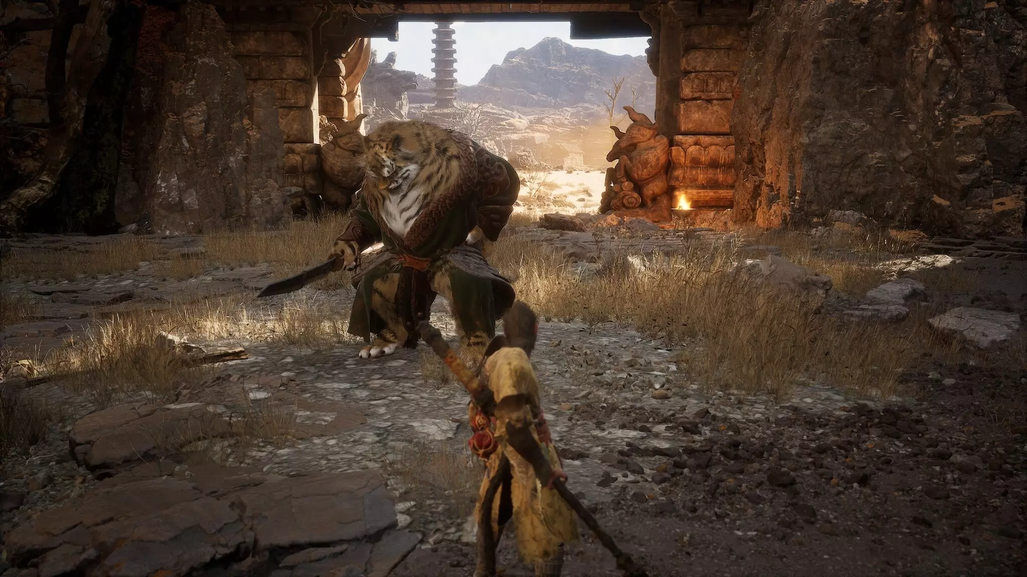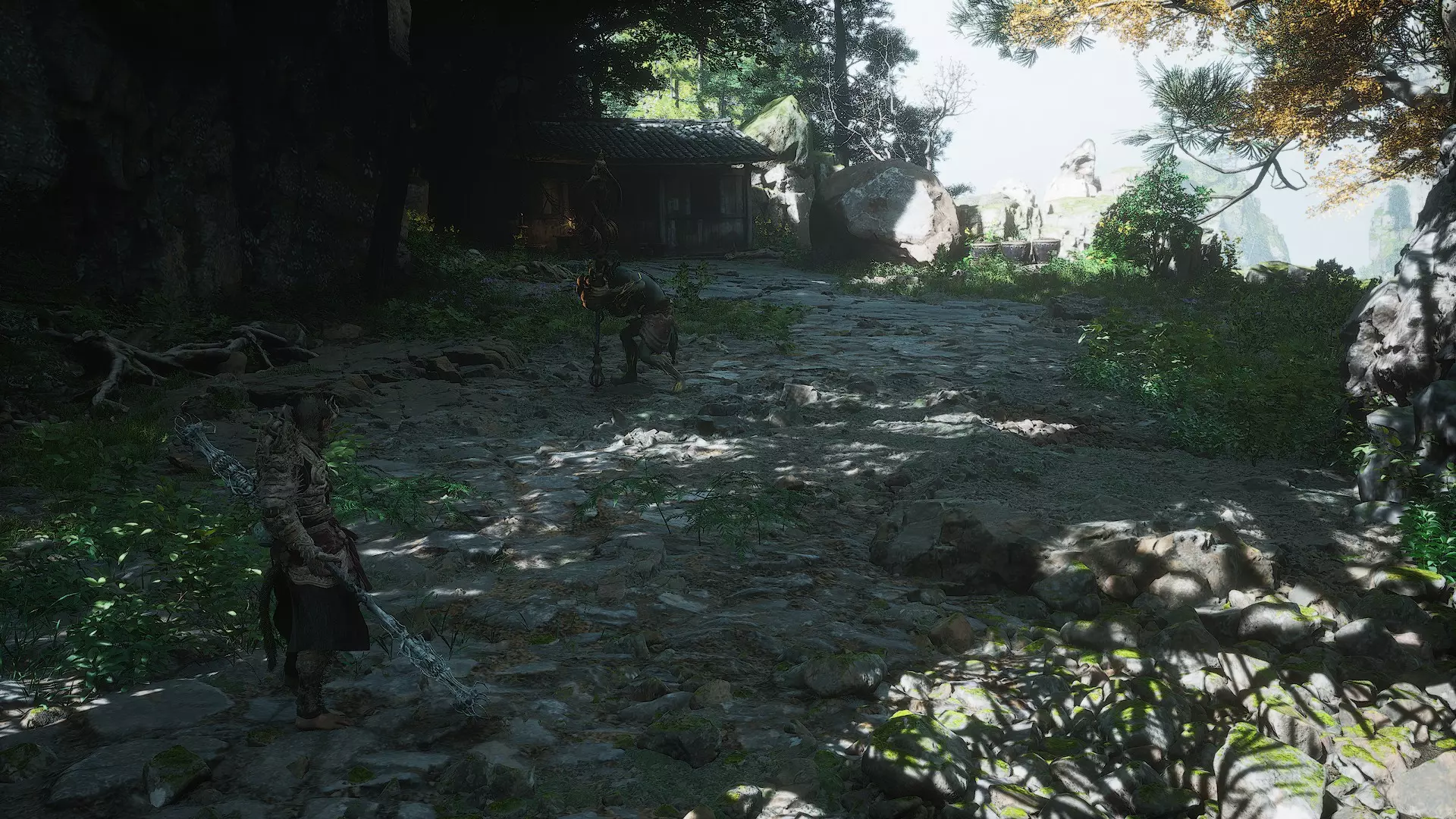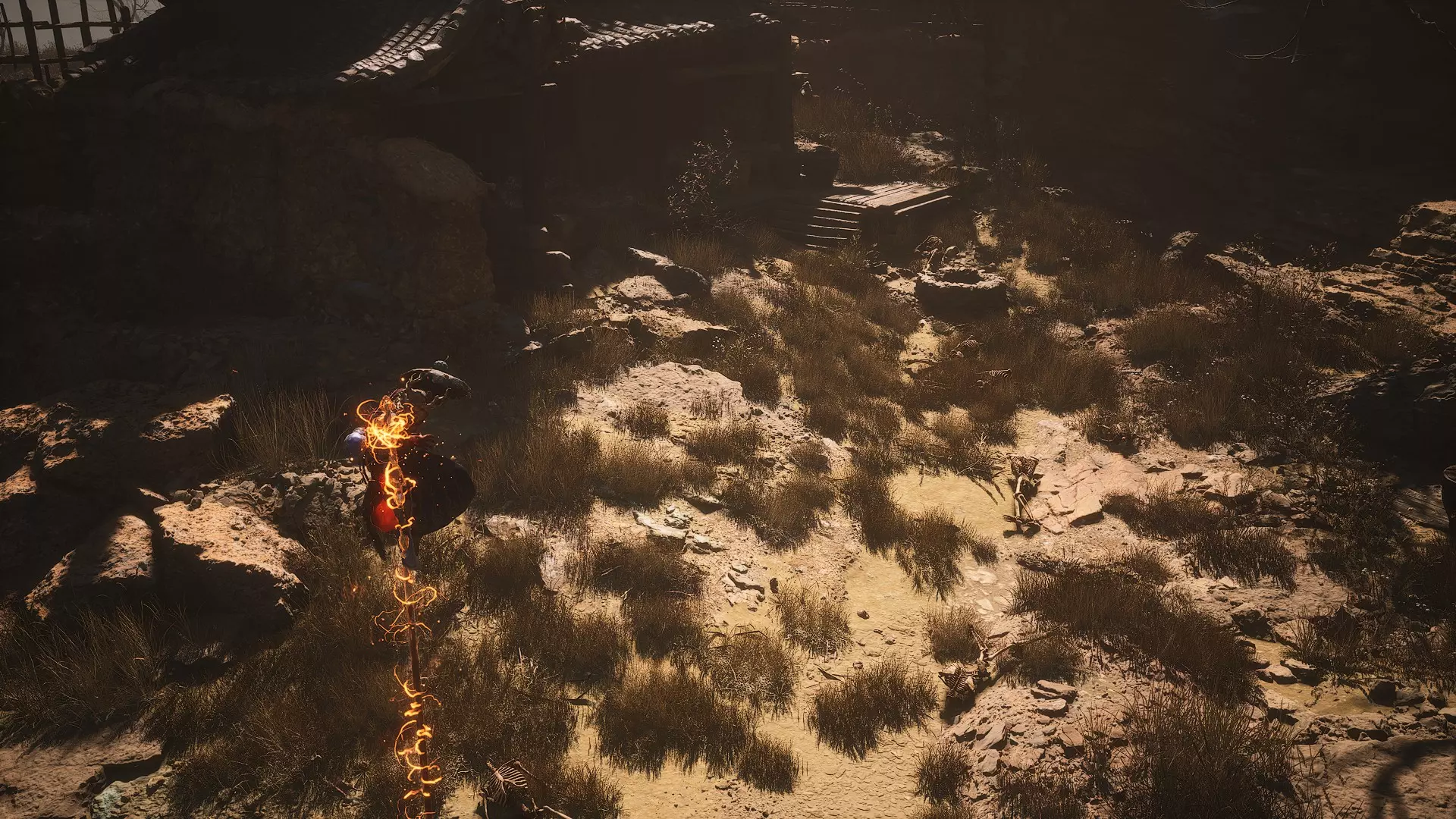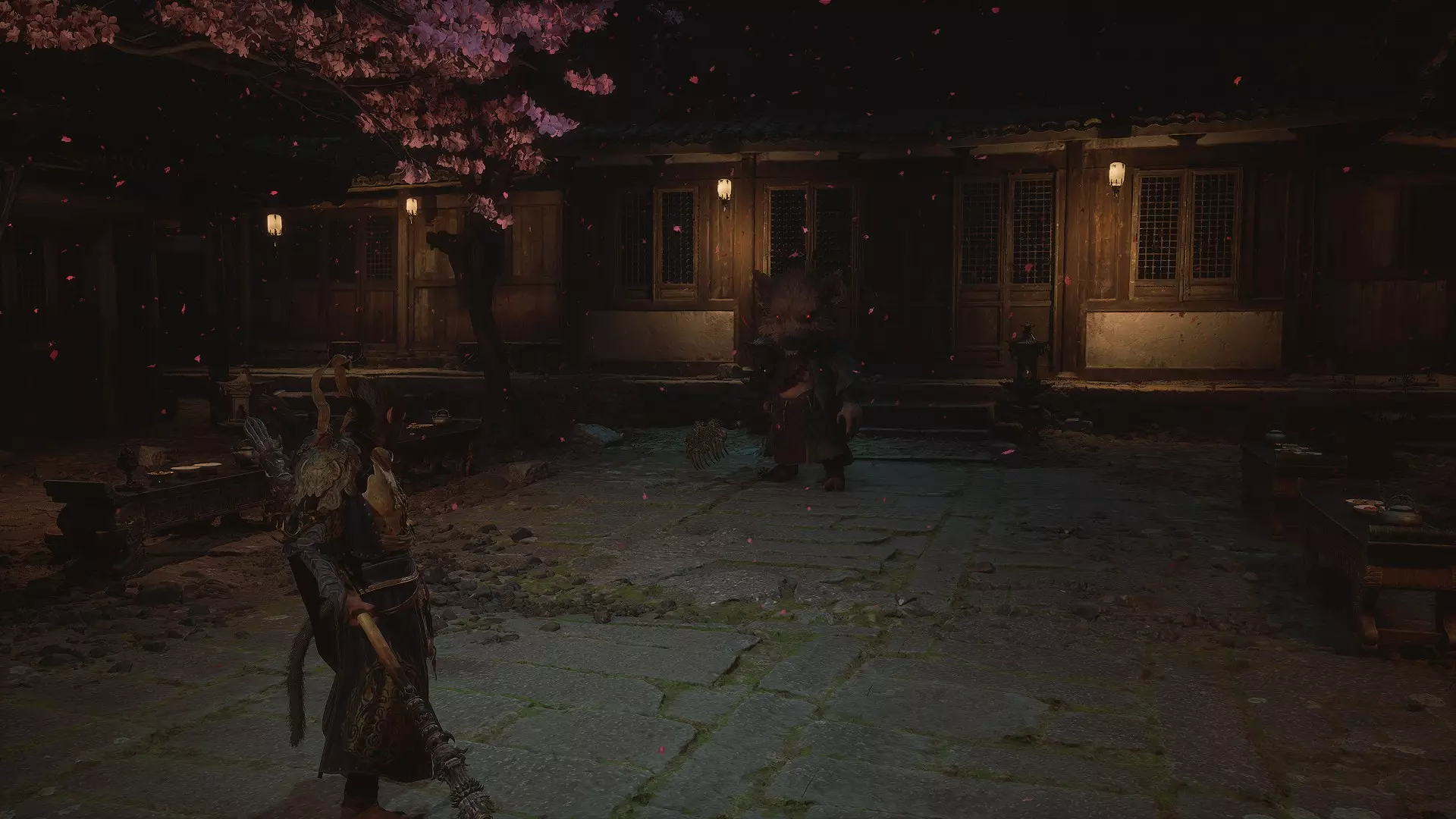 蝎子王(来自新区域)他会坐在屋顶上喝着清酒或米酒,不想下来。而我们是聪明的猴子——不傻,打碎建筑物附近的罐子,他就会乖乖下来。有趣的事实:如果不杀他,也就是不挑衅也不打碎罐子,那么在最终 boss 战时他会帮助我们!而且成就依然会解锁!