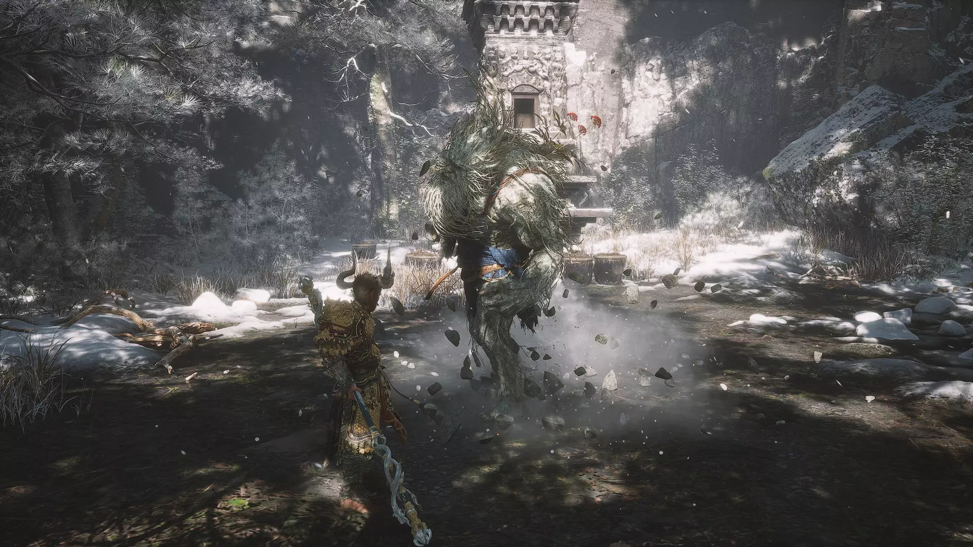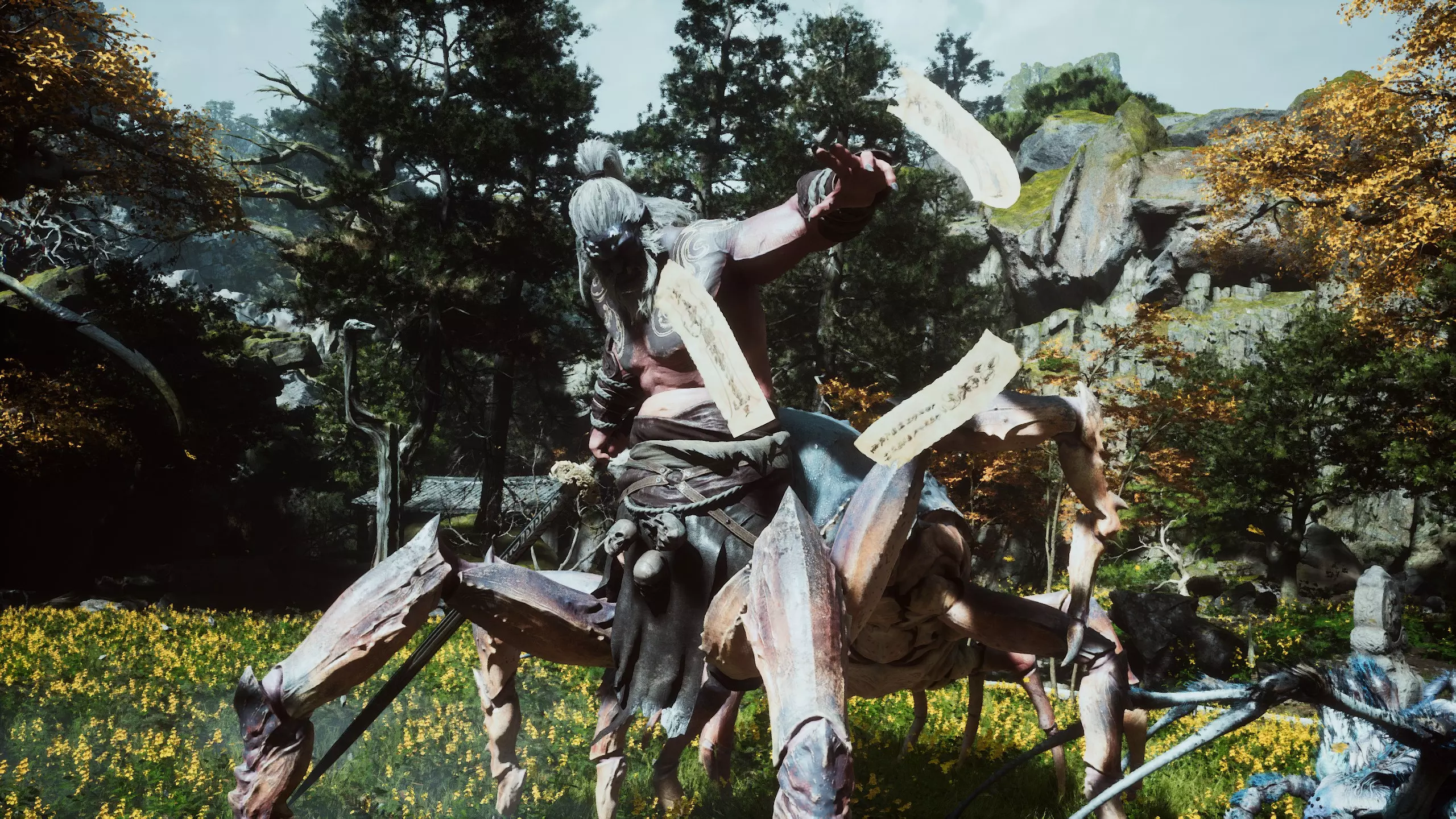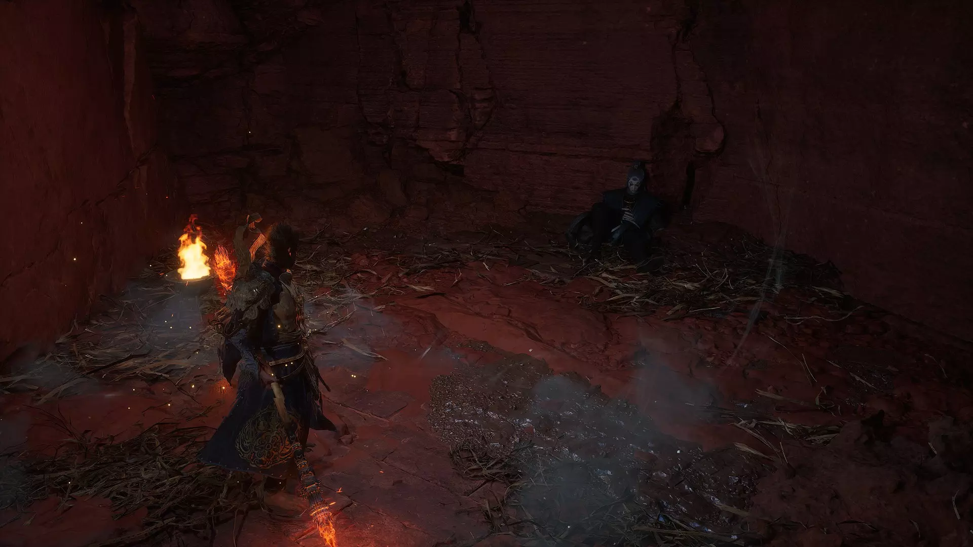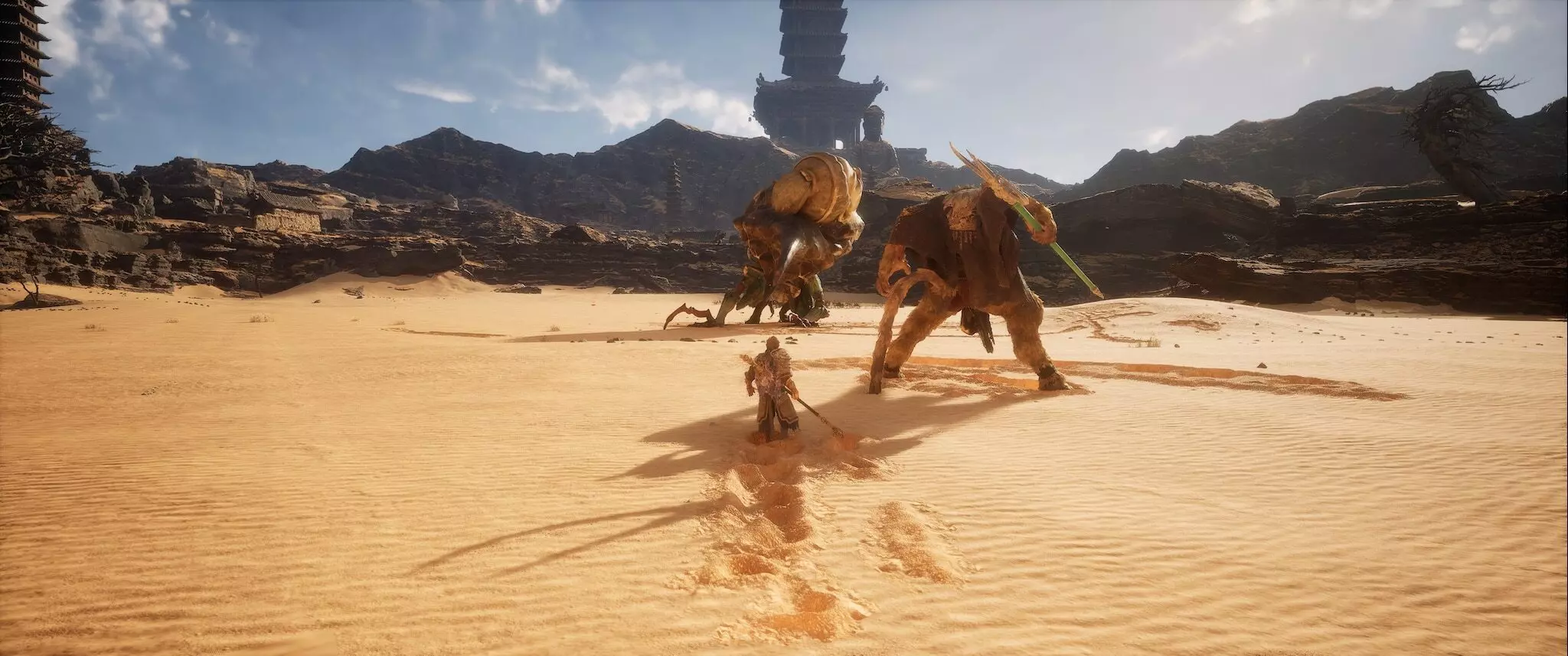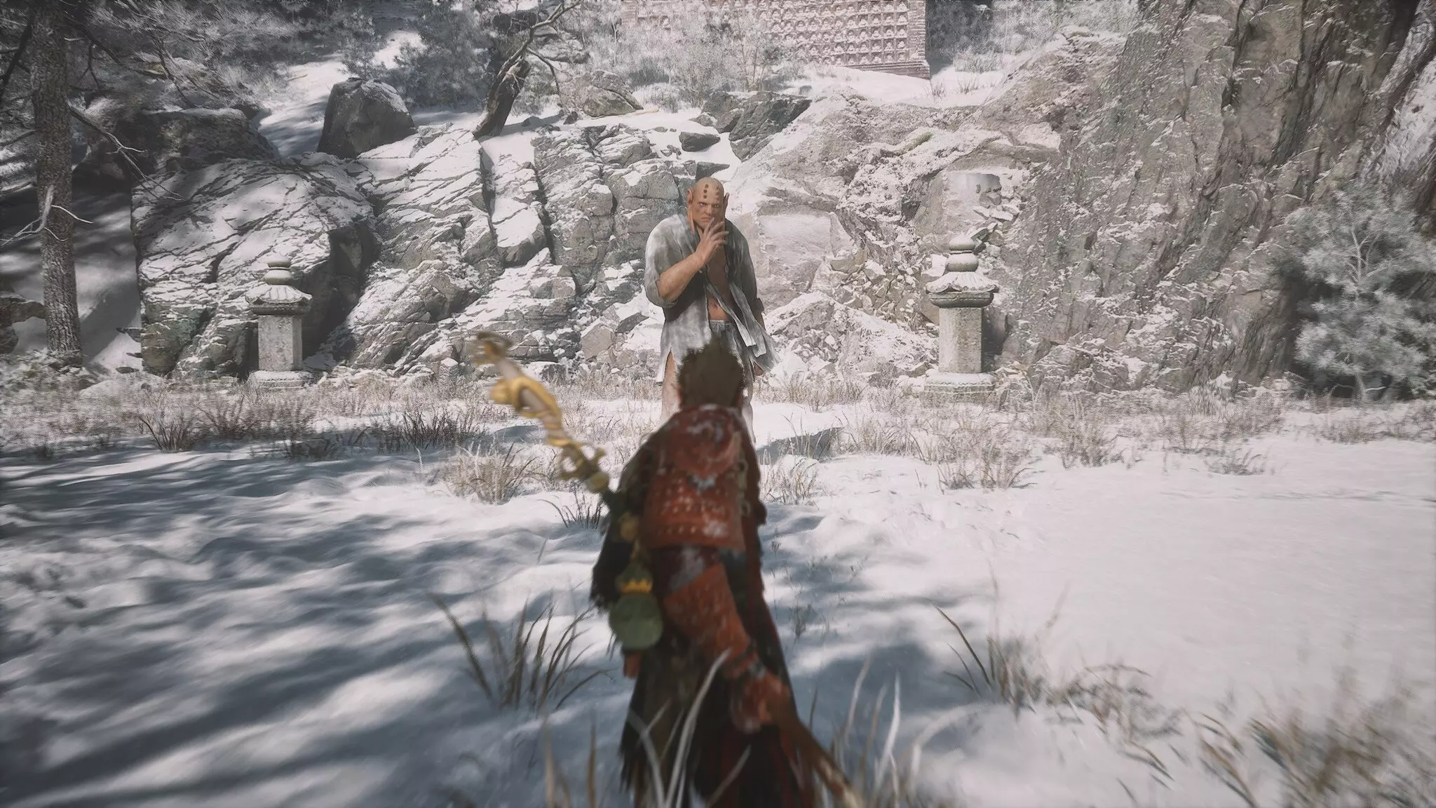 蝎子王(来自新区域)他会坐在屋顶上喝着清酒或米酒,不想下来。而我们是聪明的猴子——不傻,打碎建筑物附近的罐子,他就会乖乖下来。有趣的事实:如果不杀他,也就是不挑衅也不打碎罐子,那么在最终 boss 战时他会帮助我们!而且成就依然会解锁!