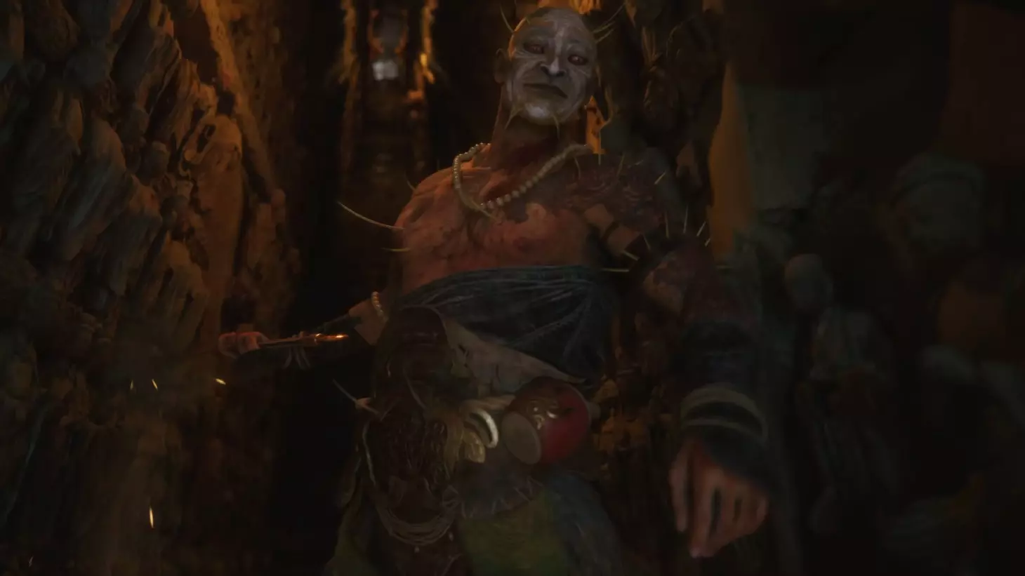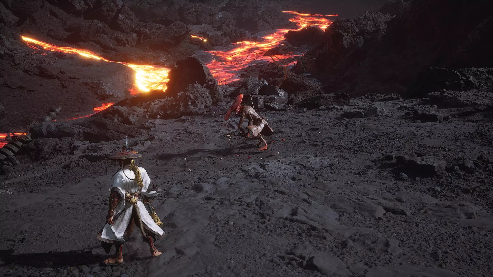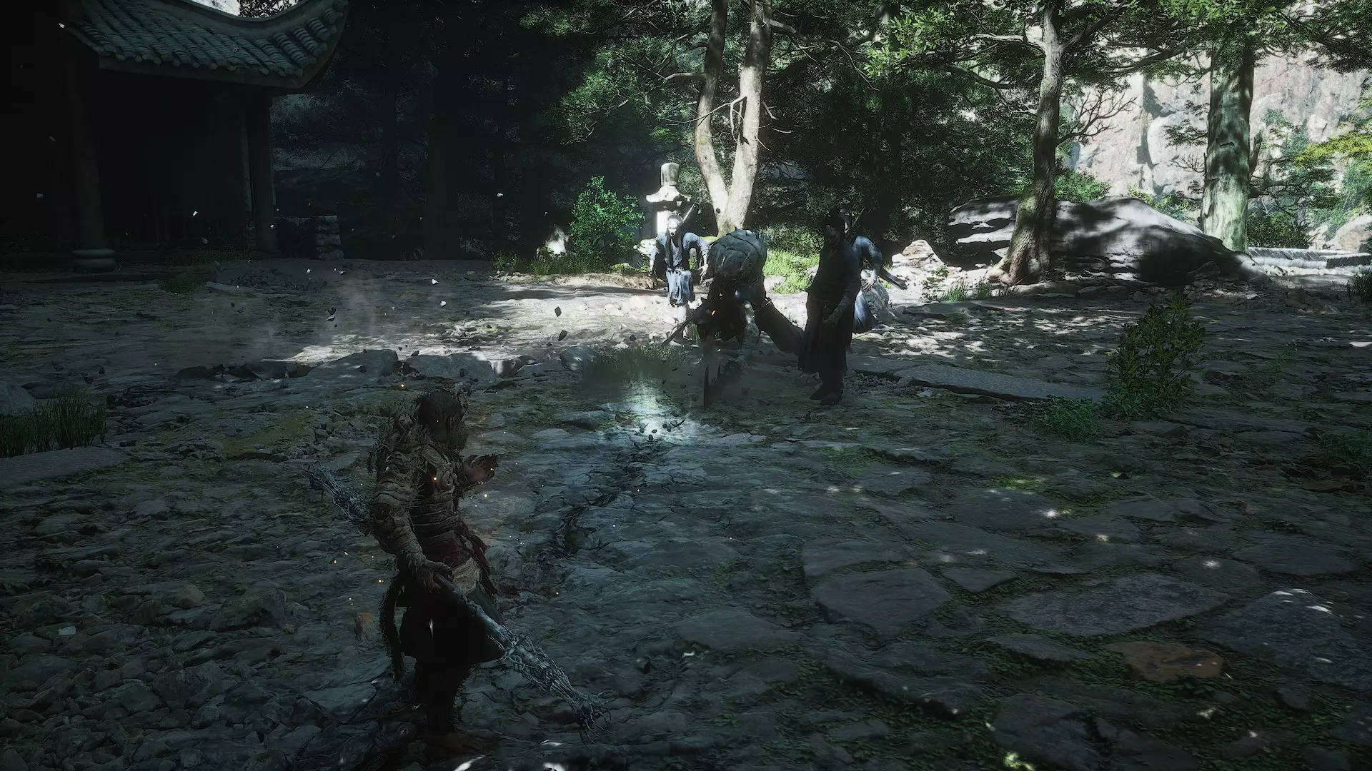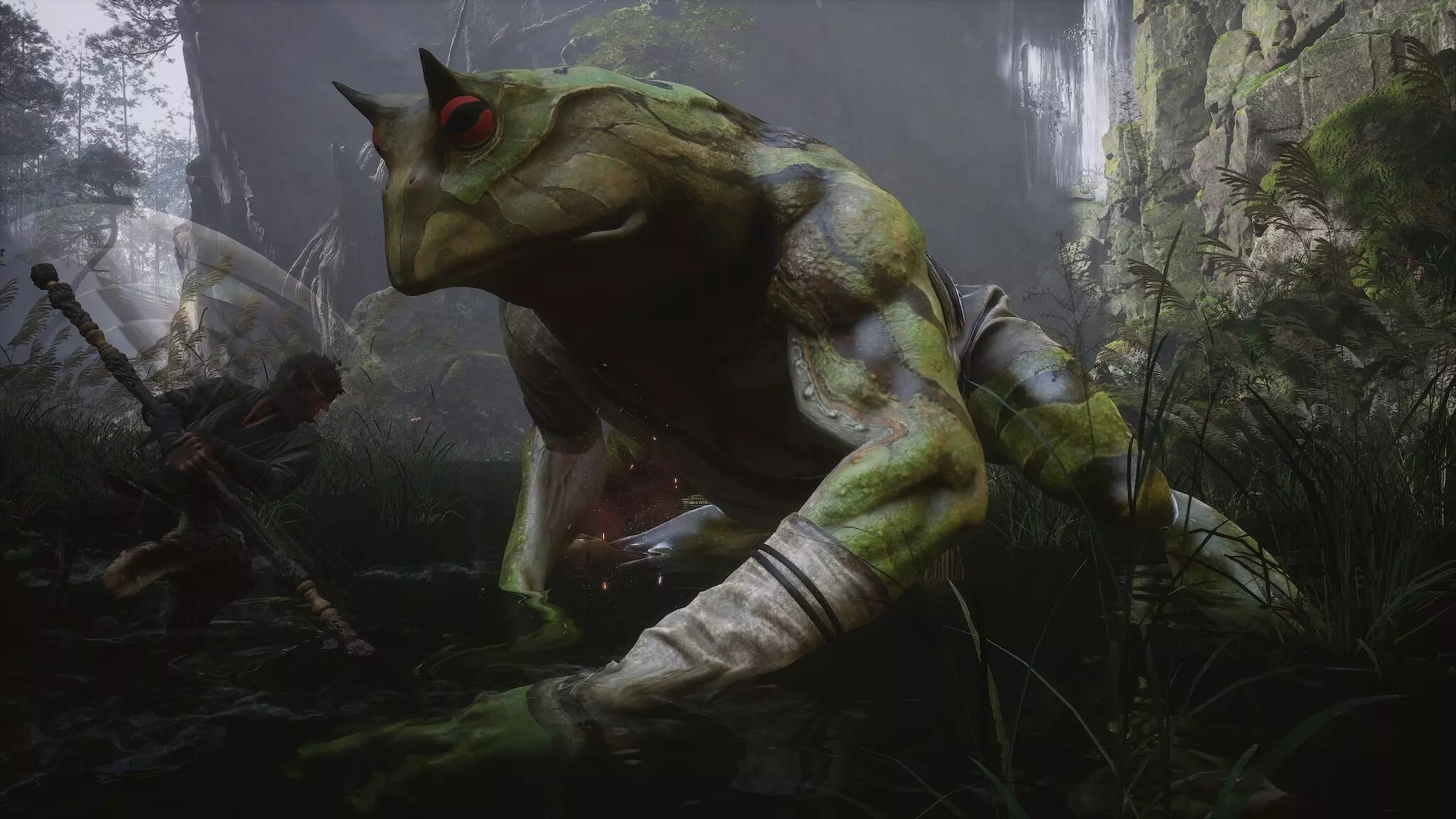 蝎子王(来自新区域)他会坐在屋顶上喝着清酒或米酒,不想下来。而我们是聪明的猴子——不傻,打碎建筑物附近的罐子,他就会乖乖下来。有趣的事实:如果不杀他,也就是不挑衅也不打碎罐子,那么在最终 boss 战时他会帮助我们!而且成就依然会解锁!
