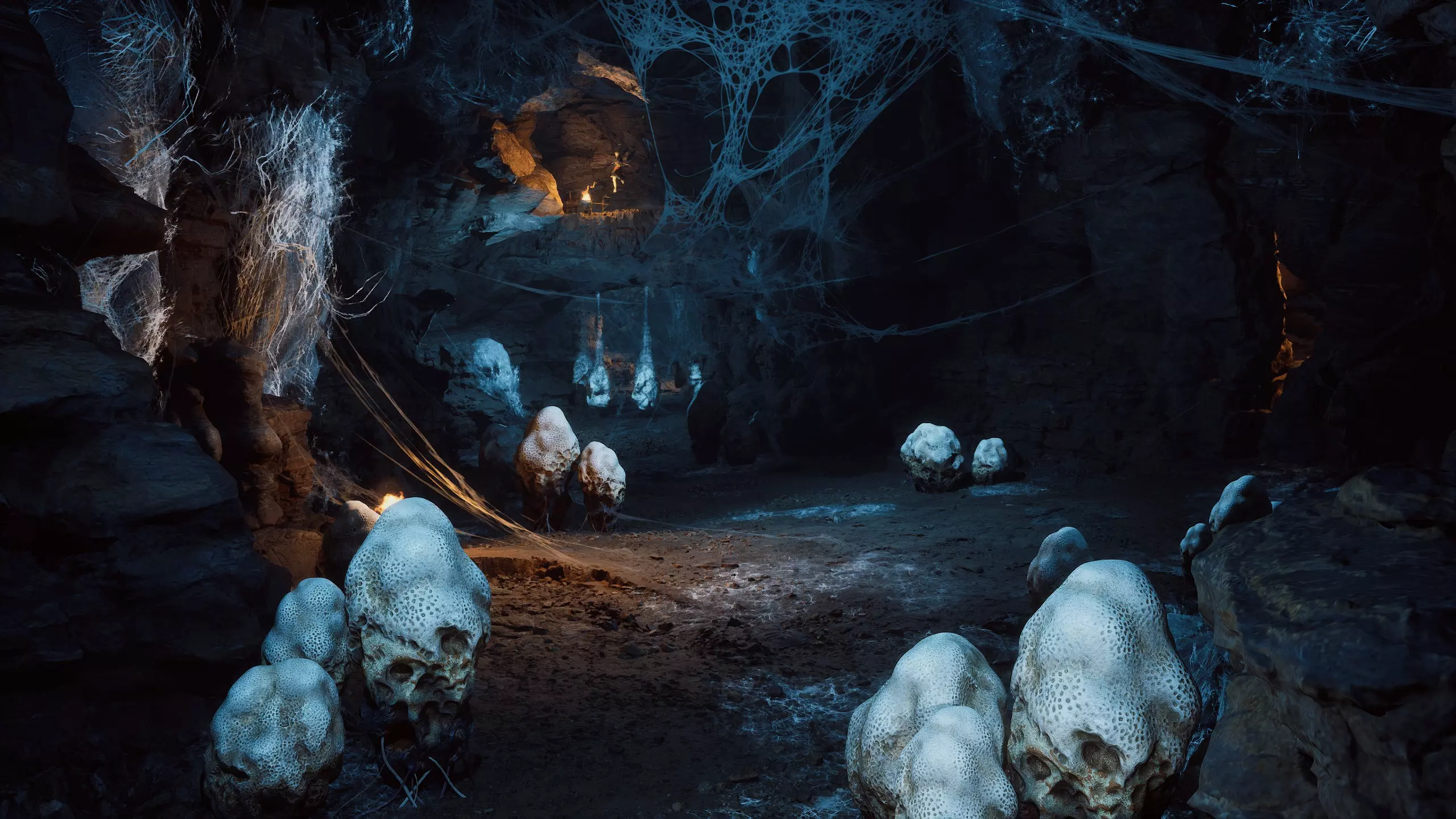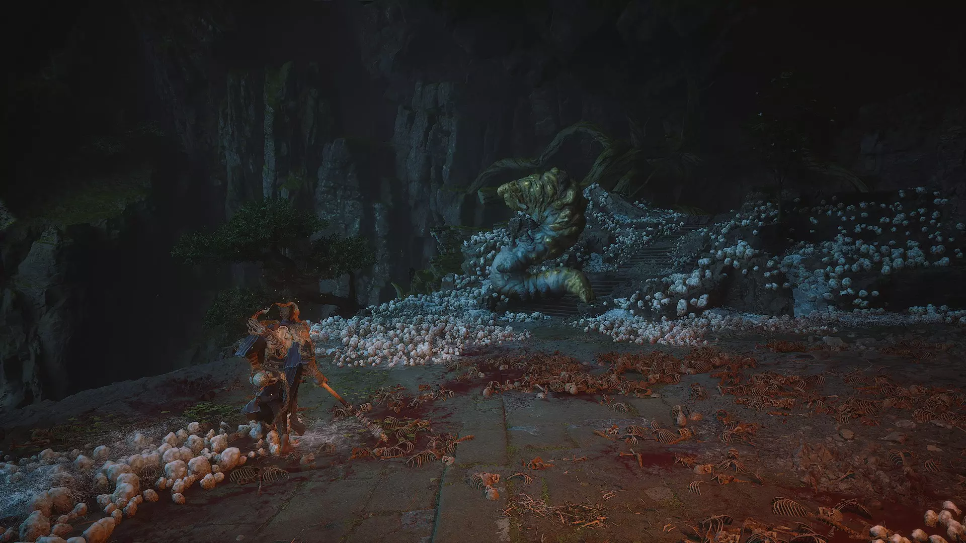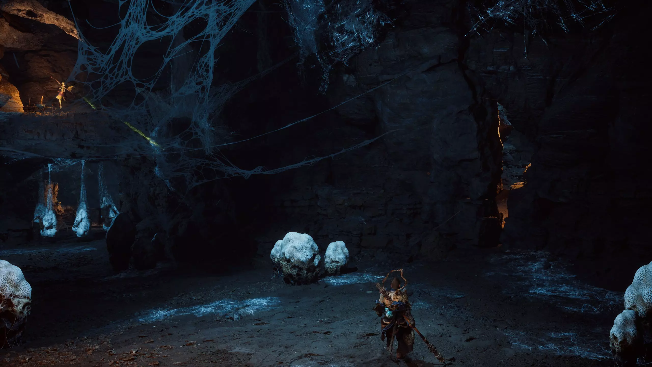 毒道施术者(首次遭遇)从“窟顶”圣坛出发,前往有一堆蜘蛛茧的平台,找到可以向下跳的地方并跳下去。接着穿过有许多敌人和悬挂的敌对茧的隧道,然后找到石阶向上走,在那里会发现与该 boss 战斗的 arena,它会挂在巨大的茧里。