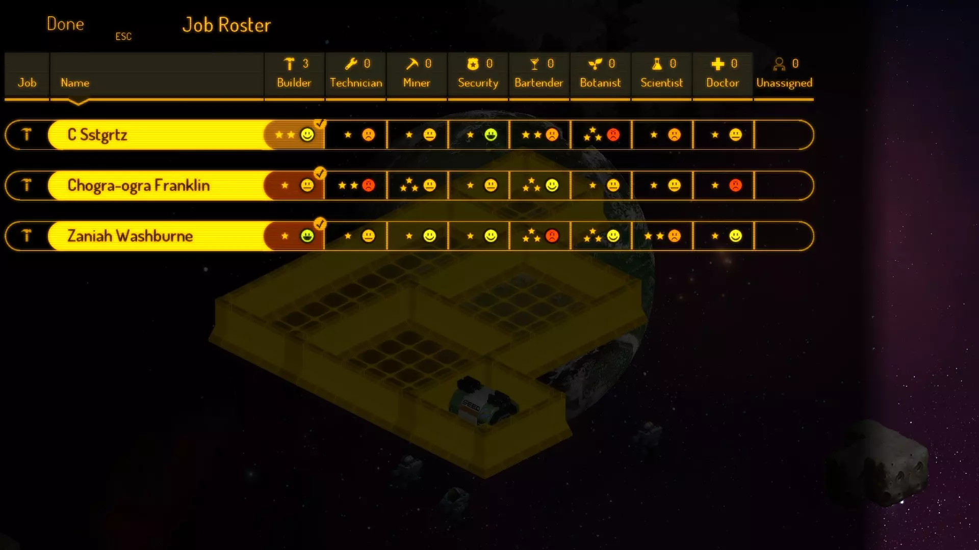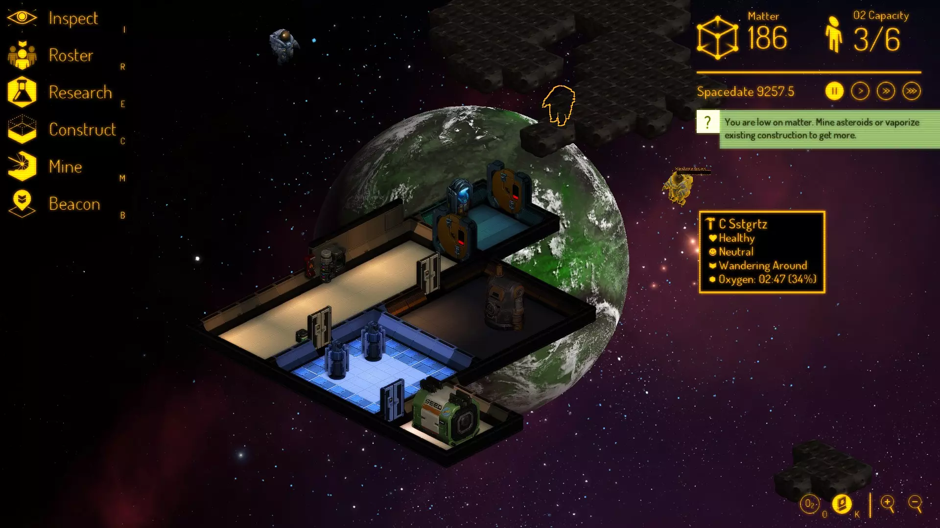此界面会显示你的船员的重要信息。以下是几个要点: 首先,你会看到笑脸和怒脸。绿色且嘴巴张开的表情表示他们非常喜欢那份工作。红色且看起来很生气的表情表示他们讨厌那份工作。让某人做他们讨厌的工作会使他们更有可能发脾气——导致他们攻击基地或其他人。 其次,你会注意到星星。这些是技能等级(以前是数字)——星星越多,他们在该工作上的表现就越好。有时,你会看到带有3颗星星的怒脸——仅仅因为他们擅长这份工作并不意味着他们喜欢它。 双击会显示实际角色,你可以查看更详细的属性——他们喜欢什么、想要什么、感觉如何,以及所有这类信息。以下是当前的重要工作: 建造者 - 负责建造所有蓝图的人员。在初期阶段非常重要。 技术员 - 负责维修基地周围的设施,例如:氧气循环器和精炼厂。 矿工 - 为你收集物质。 安保人员 - 用于处理敌对生物(和斗殴者),但更重要的是 - 这些人员(男性或女性)通过部署信标探索附近的废弃飞船,寻找幸存者/敌对生物以及废弃飞船中隐藏的任何物品。 医生 - 治疗病人,消除疾病。身边有医生很重要,这样就不会有人因旅行者和乞丐带来的太空疾病而丧命。 刚开始建造基地时,你需要将所有人都设置为建造者。目前没有其他工作可以让你安排(矿工没有精炼厂就无法采矿,医生需要稳固的站立之处,以及不用穿着宇航服就能进行检查的方式等等)——所以一开始就把所有人都分配去建造吧。不过在这之前,先按下暂停键,这样你就能探索这些菜单并熟悉游戏的布局了。 在最近的一两次更新后,你最初的所有人对建造工作的态度最差也只是中立。这能确保你不会因为工作士气问题引发冲突,从而保证生存。不过你可能遇到的最倒霉情况是,你的小团队里所有人都讨厌采矿。此外,没有技术人员或医生也很糟糕,但在1-2艘寻求庇护的飞船停靠后,其中可能会有至少对当医生或技术人员持中立态度的人。这些工作都很重要,但建筑工和矿工是其中最重要的。当然,最好把人们分配到他们喜欢的工作岗位上。 建造基地——希望能在8分钟内完成 接下来是比较棘手的部分。不要浪费任何时间——按空格键暂停游戏。之后,你可以稍微探索一下区域,看看有什么可用资源。我建议先弄清楚离你的【种子舱】最近的一大块物质在哪里——【种子舱】现在极其重要。
