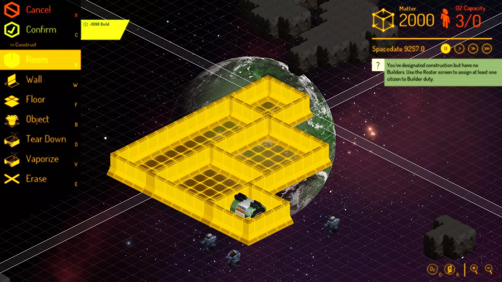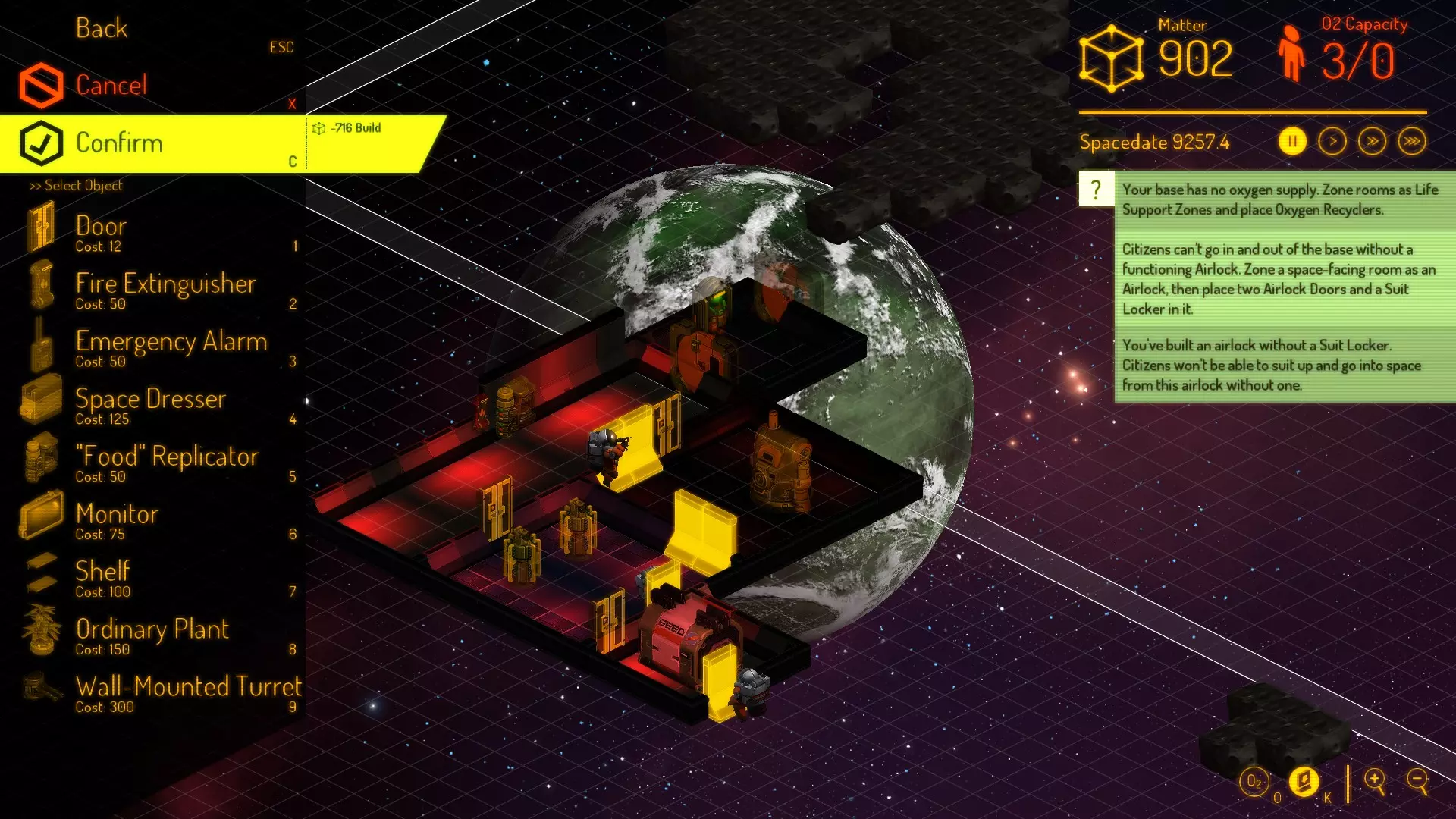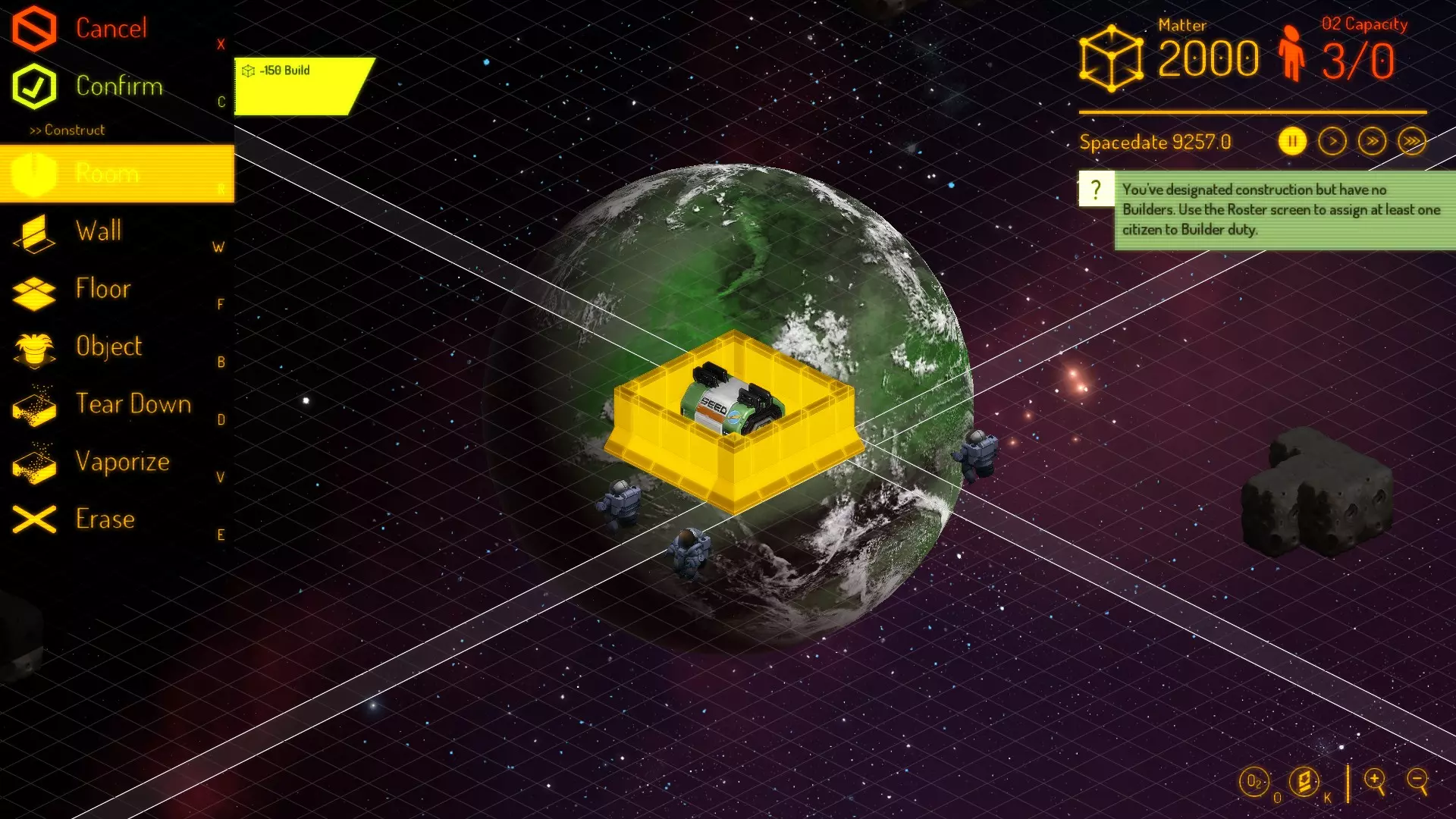 我发现这种布局最适合初始基地。从种子舱开始,建造一个与之共用一面墙的5x5房间。没错,它会超出你现有的5格墙壁范围,但共用墙壁能极大节省时间。在它旁边,再建一个5x5房间。同样,这样做是为了共用墙壁,避免在目前不需要的额外墙壁上浪费时间。之后你可以为了美观重新调整,但现在,时间紧迫。 接下来是走廊。它能帮助人员从A点到达B点。房间将连接到走廊上——目前不要把走廊建得太长,因为你还没有太多物质(或时间)可以浪费。你要建造的最后一个房间是走廊尽头的小型3x3房间。尽量让这个房间面朝一个暗物质块——这将在你开始生存后对采矿有所帮助。最后这个3x3的房间将作为你的气闸门室。完成后,确认建造计划,取消暂停。如果你比较心急,可以点击快进按钮,等待他们铺设大部分地板和部分墙壁后,再继续规划更多内容。
