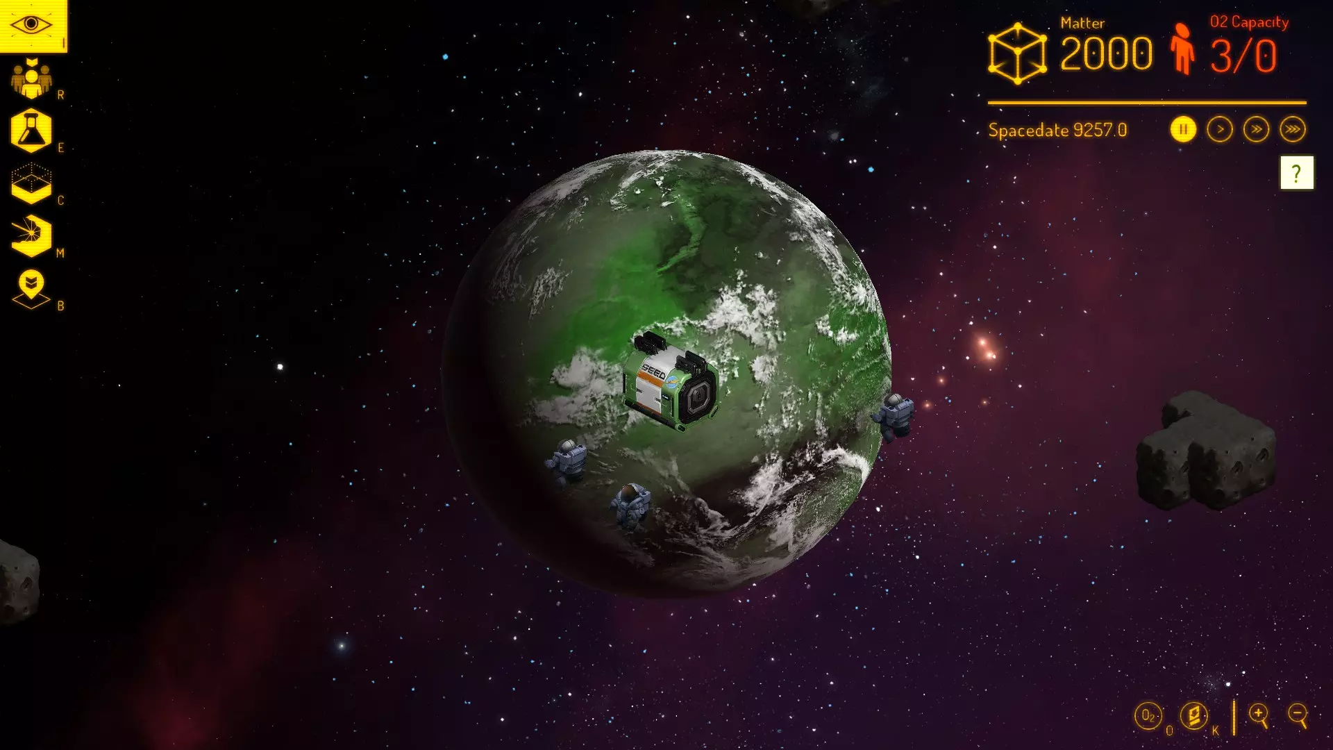 如你所见,你从一个种子舱和3个小人开始。他们只有8分钟的存活时间,所以不要浪费任何时间。游戏在这一点上有点不近人情,这可能是新手最难的部分。一步走错可能很快就意味着要重新开始游戏。