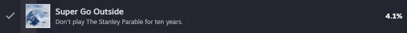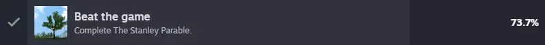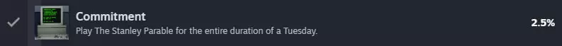 完成《史丹利的寓言》。严格按照旁白的指示行动,就能达成这个成就(这还是最短的结局)。欢迎回来!
