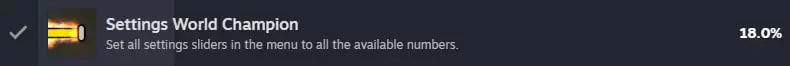 将菜单中所有设置滑块调整到所有可用值。这里的秘诀是要滑动所有设置。不必保存它们,之后可以恢复之前的值。但最重要的是,用鼠标选中设置,然后用键盘上的箭头键点击它,而不是拖动滑块(我因为匆忙一直没拿到这个成就,也不知道问题出在哪里)。不能遗漏任何数值。因此要记住初始值,并尝试每个参数上的所有数字。此外,不要忘记开启和关闭所有可能的选项(有时这样会激活额外参数)。速通