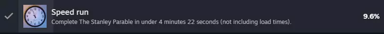 在4分22秒内完成《史丹利的寓言》(不包括加载时间)。 要做到这一点,需要满足以下一系列条件: 0. 进入额外内容的门并完整通关(否则不会出现蓝色或直线路径的办公室)。 1. 按照旁白的标准路线前往老板办公室,并在旁白提及之前在密码锁上输入2845。之后乘坐电梯下楼并重新开始游戏。 2.再次进入老板办公室,旁白会亲自打开门。乘坐电梯下去,之后重启游戏。 这些操作是为了缩短旁白在开门和乘电梯下楼时的叙述(我一开始没坐电梯,结果就差几秒钟没成功。所以不要错过这个步骤)。 3.反复重新加载游戏,直到出现蓝色办公室或直走廊(从直走廊可以直接走到两扇门的岔路口)。蓝色办公室的情况稍微复杂一些,因为如果是第一次见到它,可能无法立刻确定该往哪里走,从而浪费时间。因此建议选择直办公室,或者先熟悉一下蓝色办公室的路线。 4. 以最快速度沿着旁白的经典路线前进,不要在任何地方停留。如果满足这些条件且没有任何失误,那么这个成就就一定是你的!太棒了,到外面去吧。