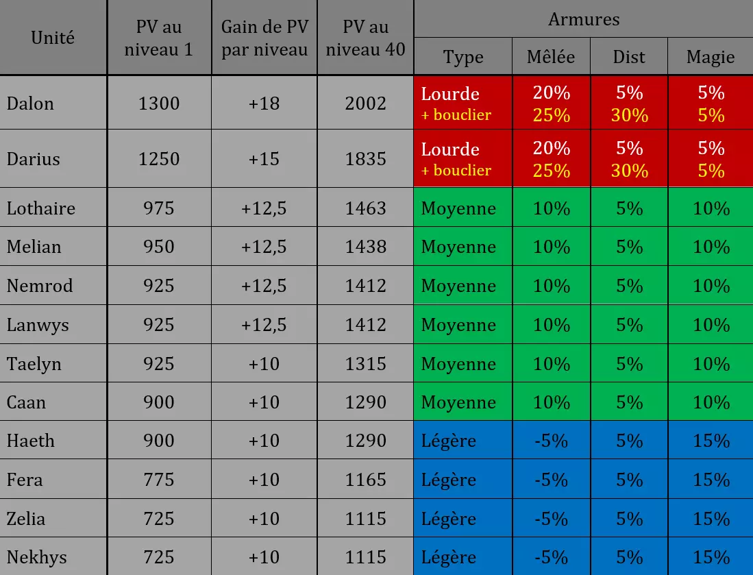 在达隆的奖励关卡中,达隆拥有13点自然体质。 若武器所关联的属性(力量、敏捷或智力)低于10点,武器伤害将受到惩罚。每低于该阈值1点,伤害就会减少2点。当你将光标指向所使用武器的图标时,可以通过比较屏幕右下角显示的数值与属性面板中显示的数值来观察到这一点。 智力和感知的机制与此大致相同,每低于10点,技能效果就会降低1%。举个例子,达隆天生的【自然智慧】特别低(5点),当他使用1级的【强化】技能时,并不会像技能描述中所说的那样在10秒内恢复300点生命值,而是恢复290点生命值(300的95%除以10后向上取整再乘以10)。 伤害与穿透 伤害 在《Confrontation》中,只存在两种伤害类型:物理伤害和魔法伤害。物理伤害分为近战伤害和远程伤害两类。造成伤害的方式有两种:使用武器攻击或使用技能。这些伤害会受到敌人护甲的影响,除非你的穿透属性抵消了敌人的护甲。物理穿透与魔法穿透 穿透率指的是对伤害可能产生的加成或减益效果。它以百分比表示,同时适用于武器攻击和技能。您的单位默认物理穿透率和魔法穿透率均为零。穿透率机制通过替代敌人的护甲来增加或减少每秒伤害。因此,高穿透值对高护甲敌人尤其有效,这类敌人在困难模式中较为常见。它并非简单地按一定百分比提升已被敌人护甲削减后的伤害,而是直接降低敌人的护甲,从而造成更高伤害。在防御方面,降低敌人穿透的效果与你的护甲等级成正比。因此,对于拥有高护甲的坦克职业而言,这一特性具有显著优势。 举例:如果你的坦克拥有100%物理护甲,但敌人有20%物理穿透,那么敌人的攻击将能穿透你的单位护甲。而如果此时你的坦克拥有80%物理护甲,且敌人的物理穿透为-20%,那么你的坦克将对敌人的物理攻击免疫。如果你的护甲值为零或负数,敌人的穿透率+x%将以“普通”增益的方式使其伤害增加+x%。 狮鹫派系有8个技能可修改穿透率,其他三个派系共有11个。其中蝎子派系有2个,豺狼派系有4个,狼派系有5个。 生命值、能量和护甲 生命值和能量:除了使用耐力(固定为100且不可改变)的单位外,每个等级提升都会为单位带来生命值(HP)和能量值。对于另外两种能量类型,即信仰值(FP)和魔法值(MP),每级提升为5点。耐力的恢复固定为每秒5点,而法力值的恢复则尤其取决于智力和智慧属性。至于信仰值,依赖信仰值的单位需要队友(即使处于濒死状态)在其身边才能以最佳方式恢复信仰值。每有一名附近的盟友,信仰值每秒恢复2点,最多可达到每秒6点。如果单位在战场上孤立无援,其能量恢复将会被阻断。不过,可以通过为该单位装备智慧符文来解决这一问题。同样,法力值的恢复也可以通过特定符文得到提升。护甲 护甲分为三种类型:近战、远程和魔法。其数值以百分比表示,可正可负,因此能增加或减少所受伤害。我用“护甲”一词来指代这个百分比,因为“抗性”一词可能会有歧义,它涉及游戏中另一个稍后会描述的元素。敌方阵营的单位也拥有各自的护甲。 以下表格按生命值从高到低的顺序列出了狮鹫阵营12个单位的生命值、每级生命值增益以及在普通难度模式下的抗性。