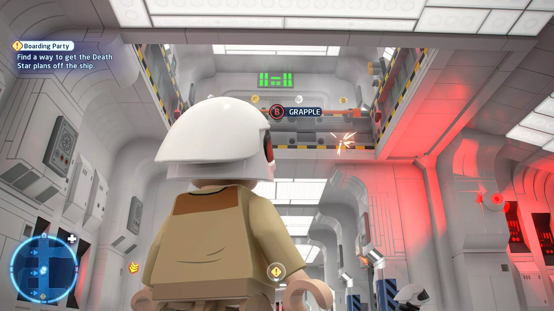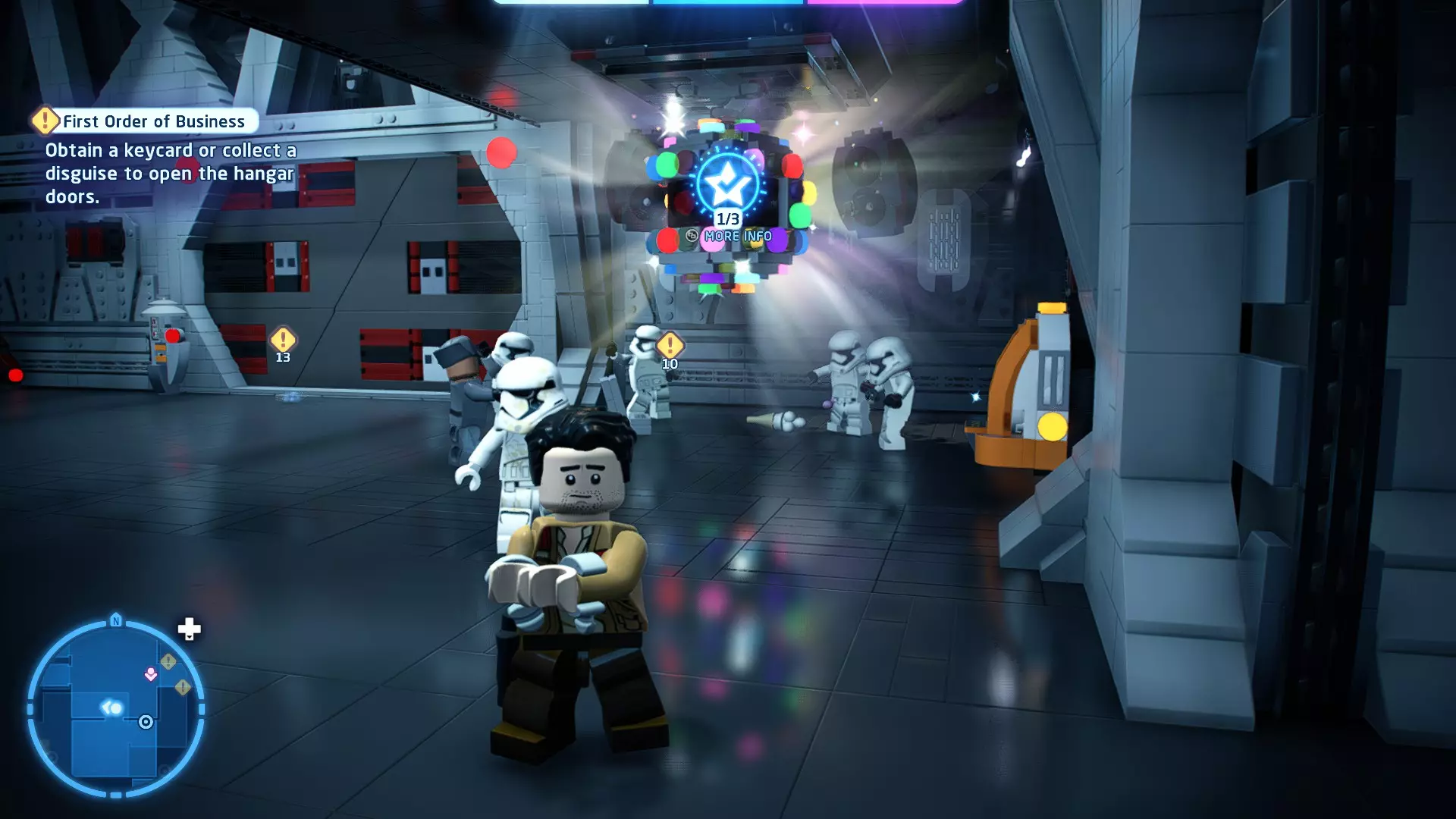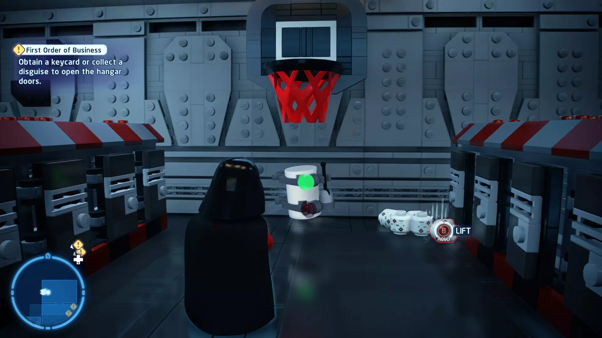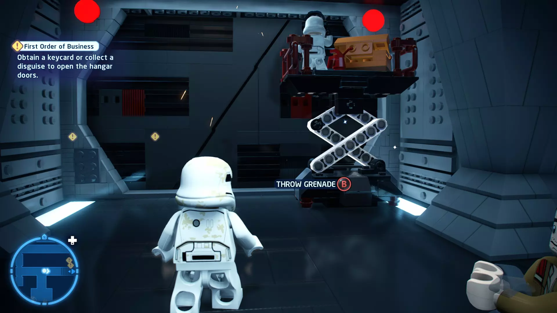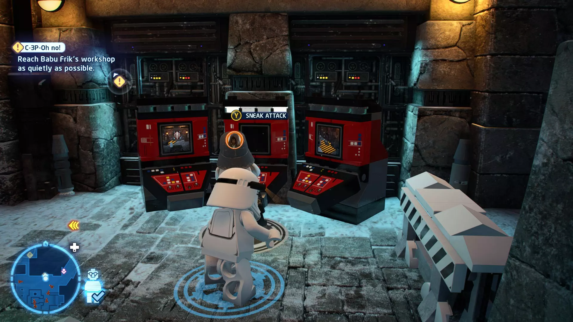 要完成此挑战,你需要在不被任何第一秩序部队发现的情况下抵达巴布的工坊。这意味着不能与任何第一秩序士兵战斗,不能向任何UA-TT开火,也不能进入黄色圆圈(代表士兵的视野范围)。小心穿过关卡,尽可能避免战斗。确保只有在波提示时,才能消灭第一道门后的士兵,否则他们会发现你。击败基吉米恶棍后,让出现的第一秩序巡逻队从你身边走过。到达最终庭院后,使用【潜行】或【清理庭院】方法(参见故事模式),在不被发现的情况下抵达巴布的工坊。如果你确实对此感到困难,你可以始终在自由游玩模式中进入该关卡,并将你的整个小队设置为反派或黑暗面角色,这样你就能直接从敌人身边走过。 挑战2 - 新指令 详情:在不触发警报的情况下,和平清理主庭院的冲锋队员。