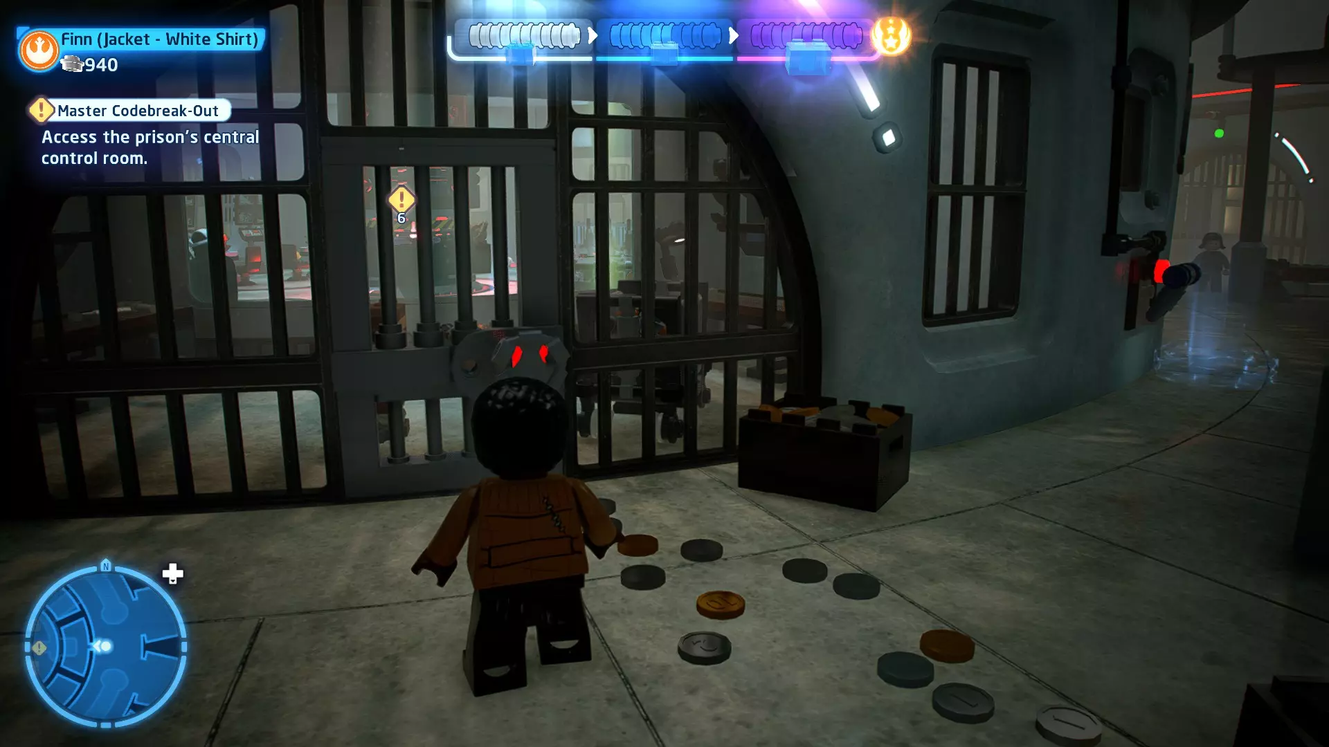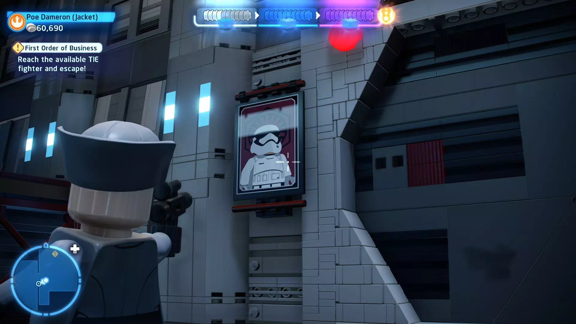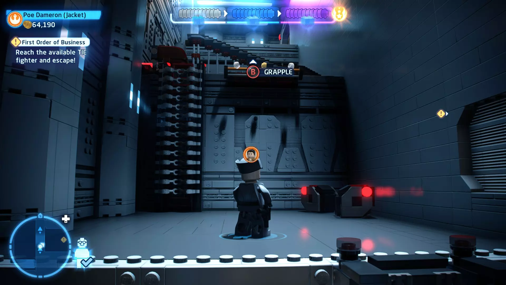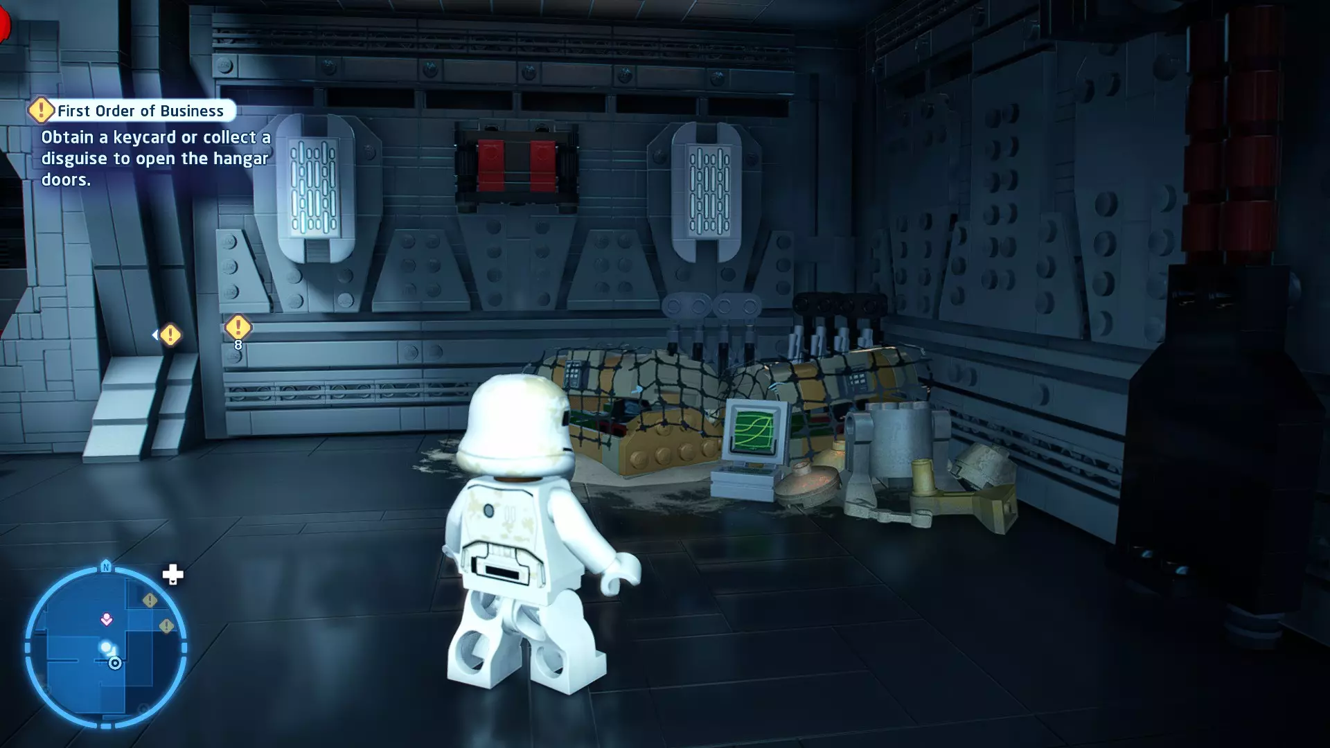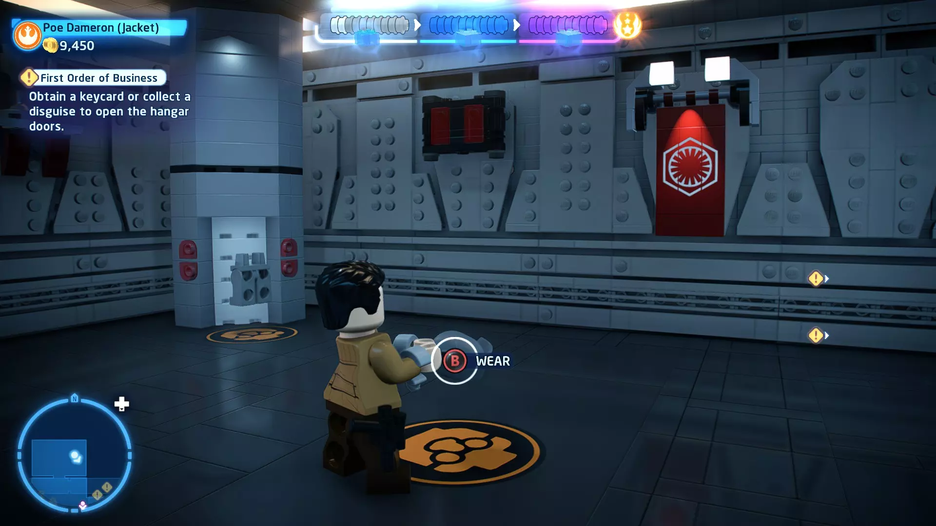 要完成此挑战,你需要在不被任何第一秩序部队发现的情况下抵达巴布的工坊。这意味着不能与任何第一秩序士兵战斗,不能向任何UA-TT开火,也不能进入黄色圆圈(代表士兵的视野范围)。小心穿过关卡,尽可能避免战斗。确保只有在波提示时,才能消灭第一道门后的士兵,否则他们会发现你。击败基吉米恶棍后,让出现的第一秩序巡逻队从你身边走过。到达最终庭院后,使用【潜行】或【清理庭院】方法(参见故事模式),在不被发现的情况下抵达巴布的工坊。如果你确实对此感到困难,你可以始终在自由游玩模式中进入该关卡,并将你的整个小队设置为反派或黑暗面角色,这样你就能直接从敌人身边走过。 挑战2 - 新指令 详情:在不触发警报的情况下,和平清理主庭院的冲锋队员。