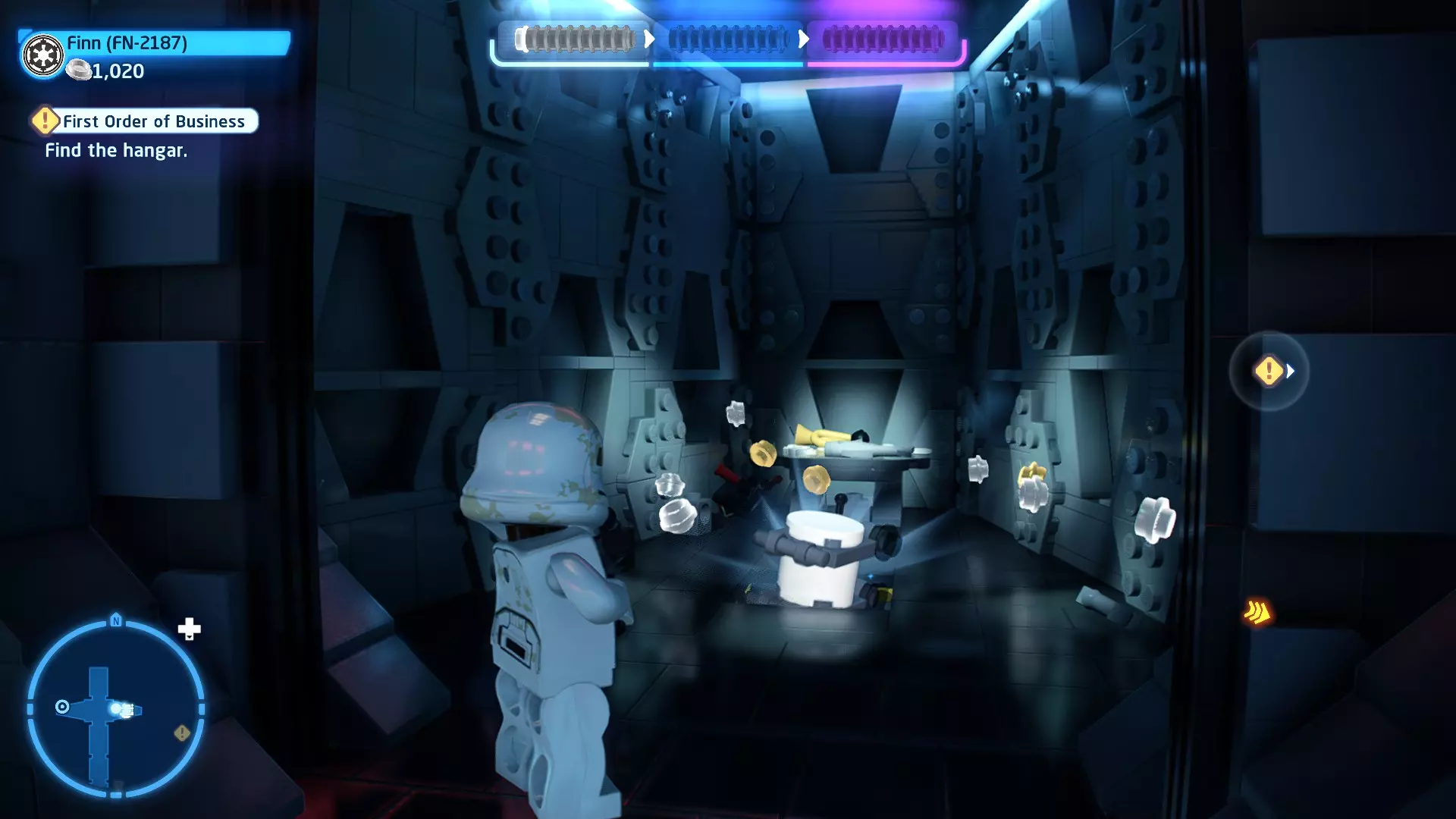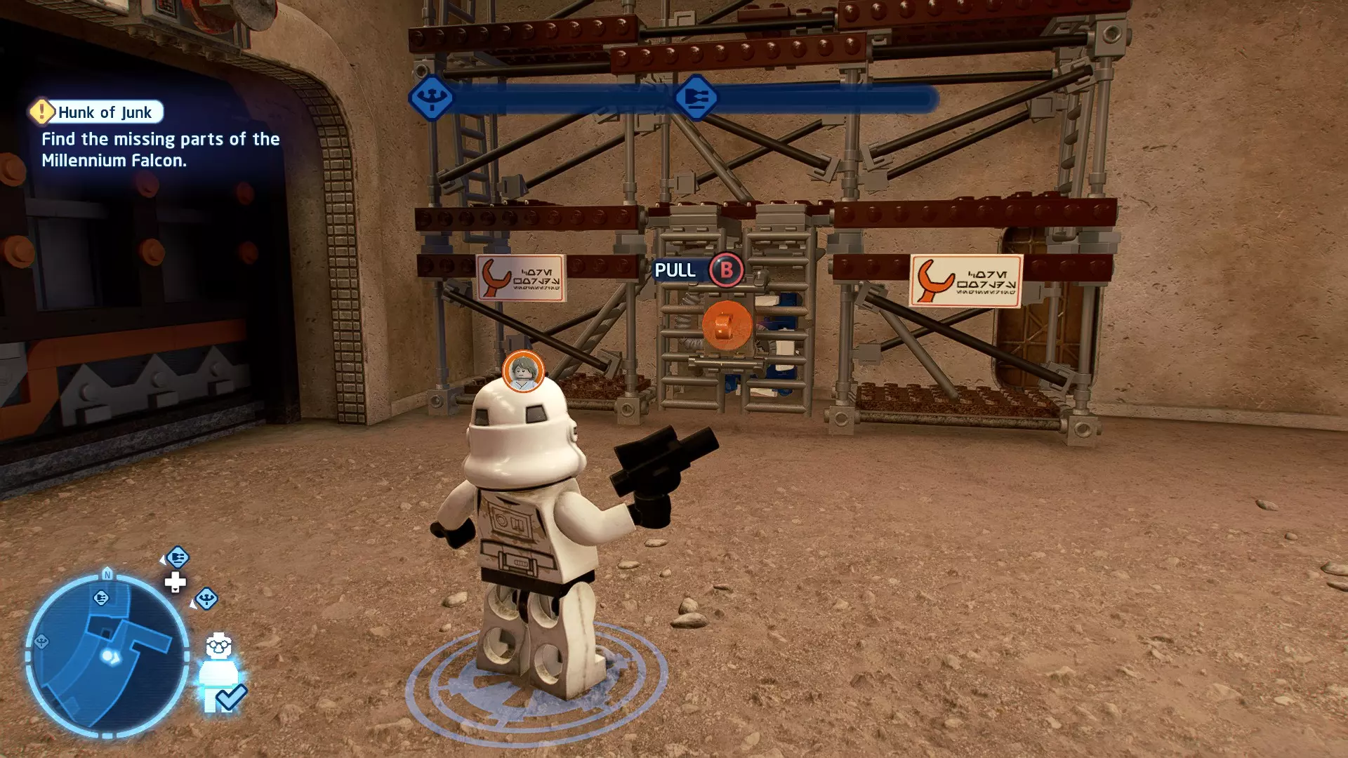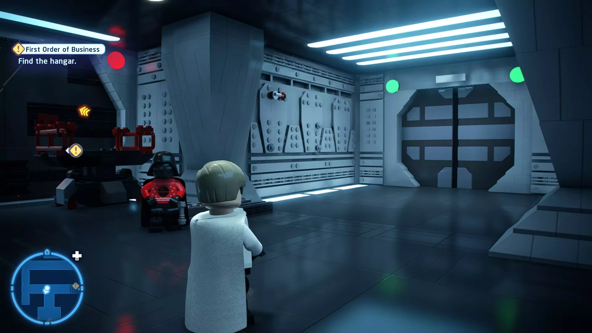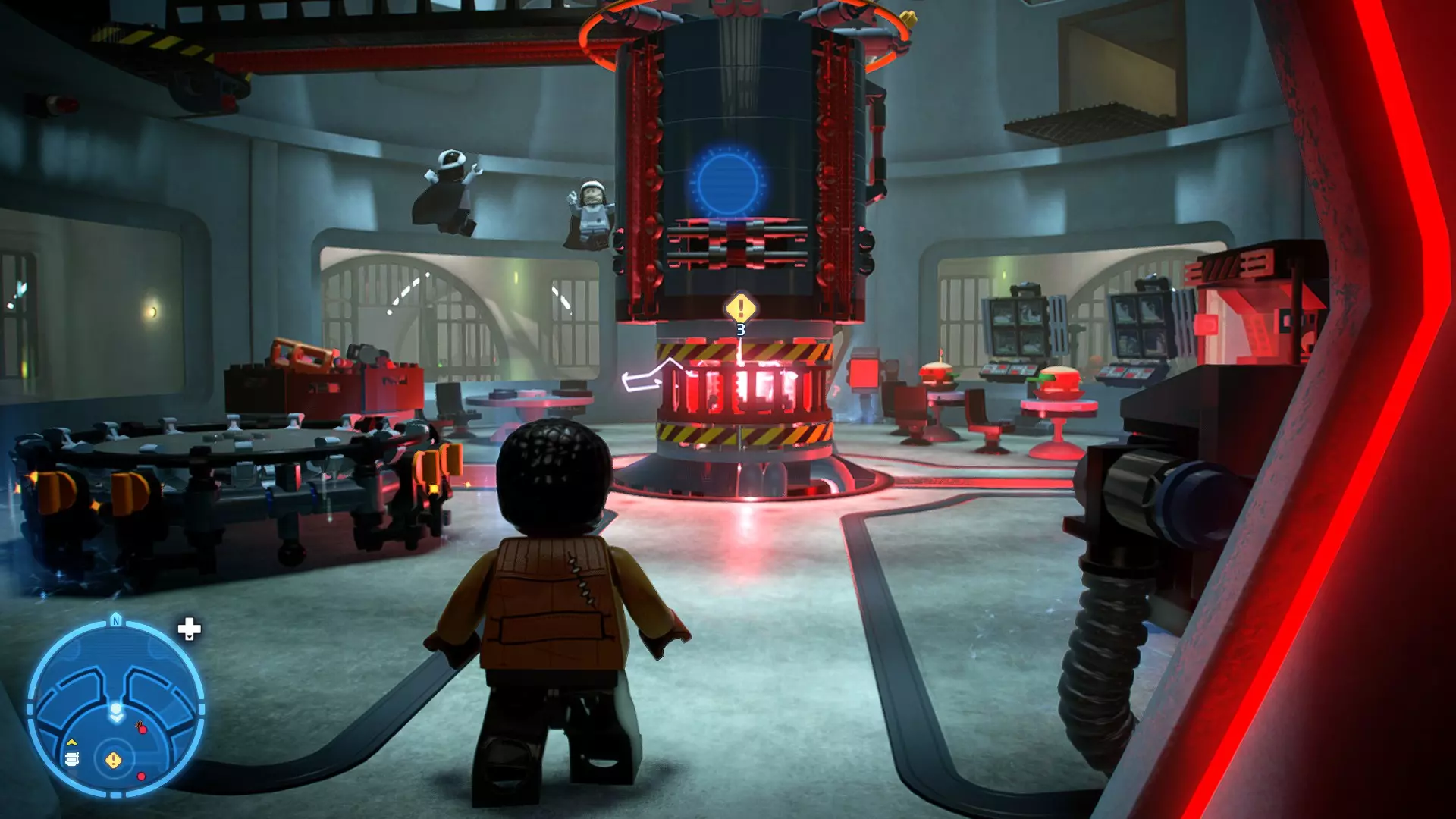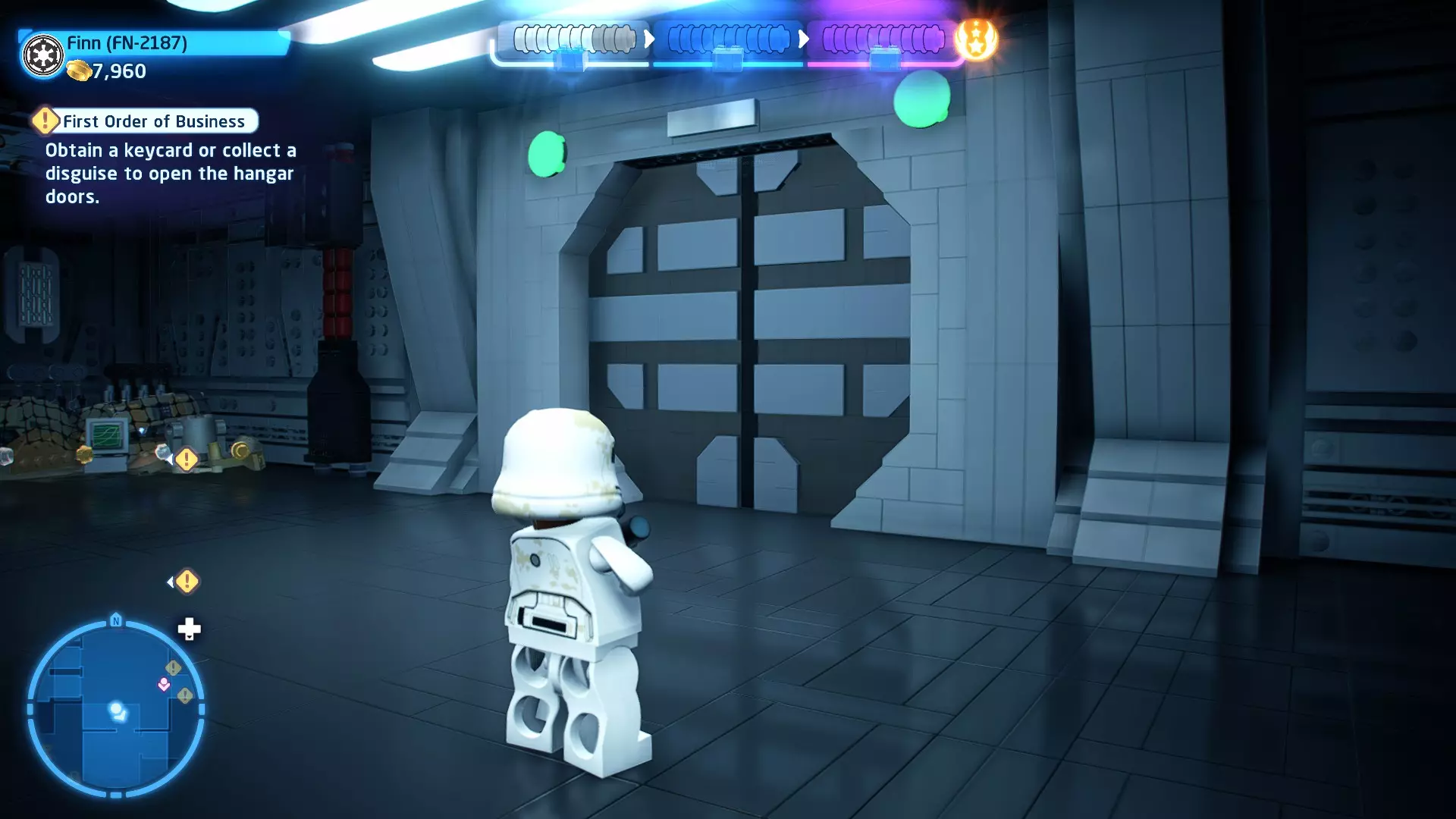 要完成此挑战,你需要在不被任何第一秩序部队发现的情况下抵达巴布的工坊。这意味着不能与任何第一秩序士兵战斗,不能向任何UA-TT开火,也不能进入黄色圆圈(代表士兵的视野范围)。小心穿过关卡,尽可能避免战斗。确保只有在波提示时,才能消灭第一道门后的士兵,否则他们会发现你。击败基吉米恶棍后,让出现的第一秩序巡逻队从你身边走过。到达最终庭院后,使用【潜行】或【清理庭院】方法(参见故事模式),在不被发现的情况下抵达巴布的工坊。如果你确实对此感到困难,你可以始终在自由游玩模式中进入该关卡,并将你的整个小队设置为反派或黑暗面角色,这样你就能直接从敌人身边走过。 挑战2 - 新指令 详情:在不触发警报的情况下,和平清理主庭院的冲锋队员。