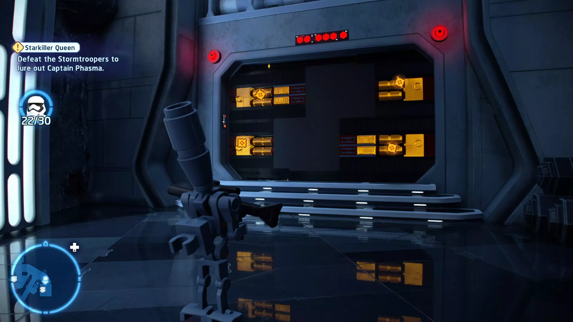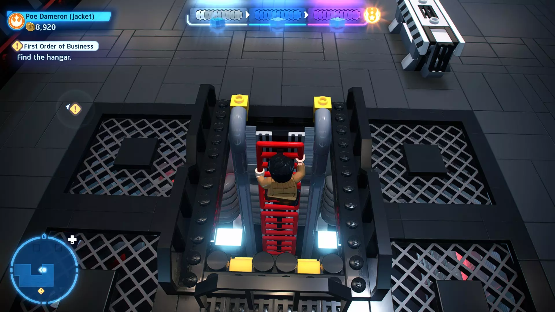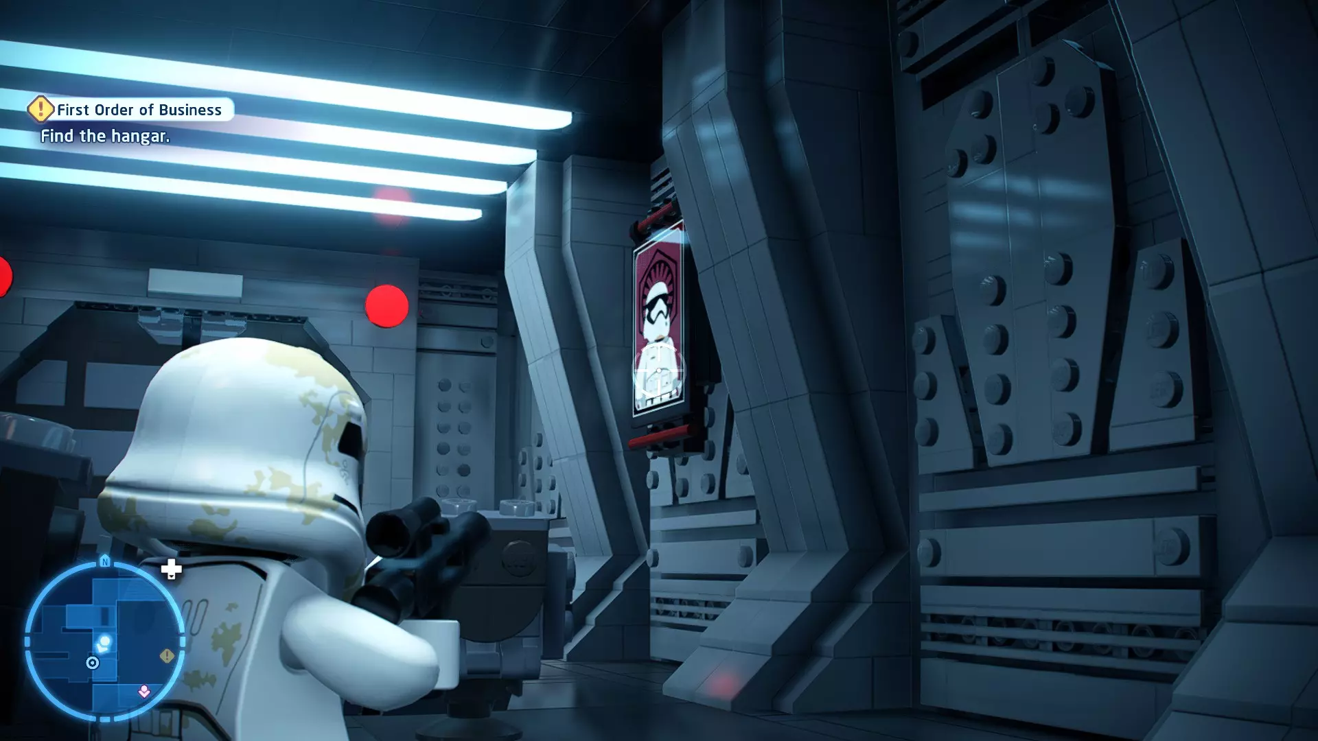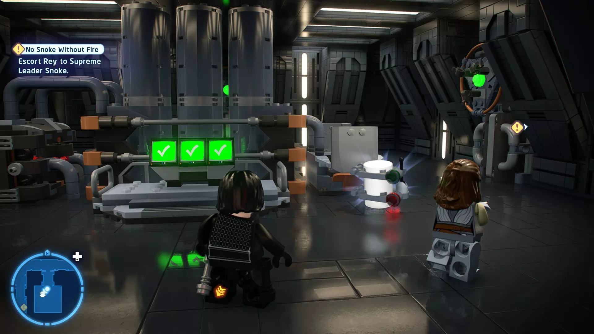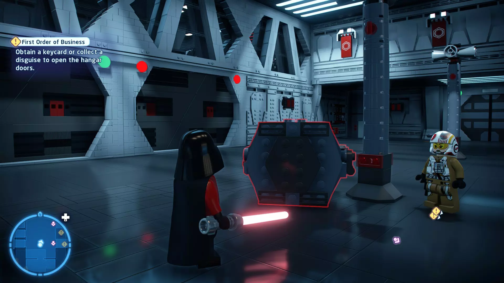 要完成此挑战,你需要在不被任何第一秩序部队发现的情况下抵达巴布的工坊。这意味着不能与任何第一秩序士兵战斗,不能向任何UA-TT开火,也不能进入黄色圆圈(代表士兵的视野范围)。小心穿过关卡,尽可能避免战斗。确保只有在波提示时,才能消灭第一道门后的士兵,否则他们会发现你。击败基吉米恶棍后,让出现的第一秩序巡逻队从你身边走过。到达最终庭院后,使用【潜行】或【清理庭院】方法(参见故事模式),在不被发现的情况下抵达巴布的工坊。如果你确实对此感到困难,你可以始终在自由游玩模式中进入该关卡,并将你的整个小队设置为反派或黑暗面角色,这样你就能直接从敌人身边走过。 挑战2 - 新指令 详情:在不触发警报的情况下,和平清理主庭院的冲锋队员。