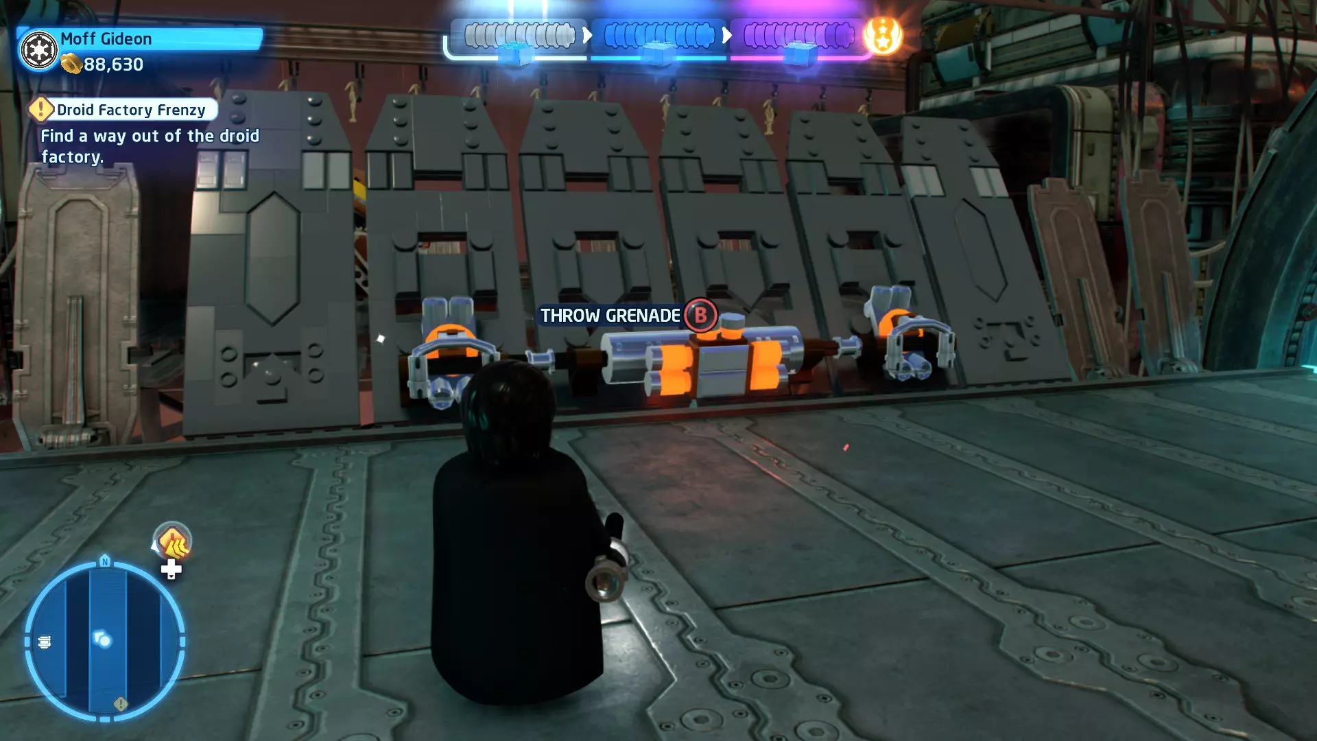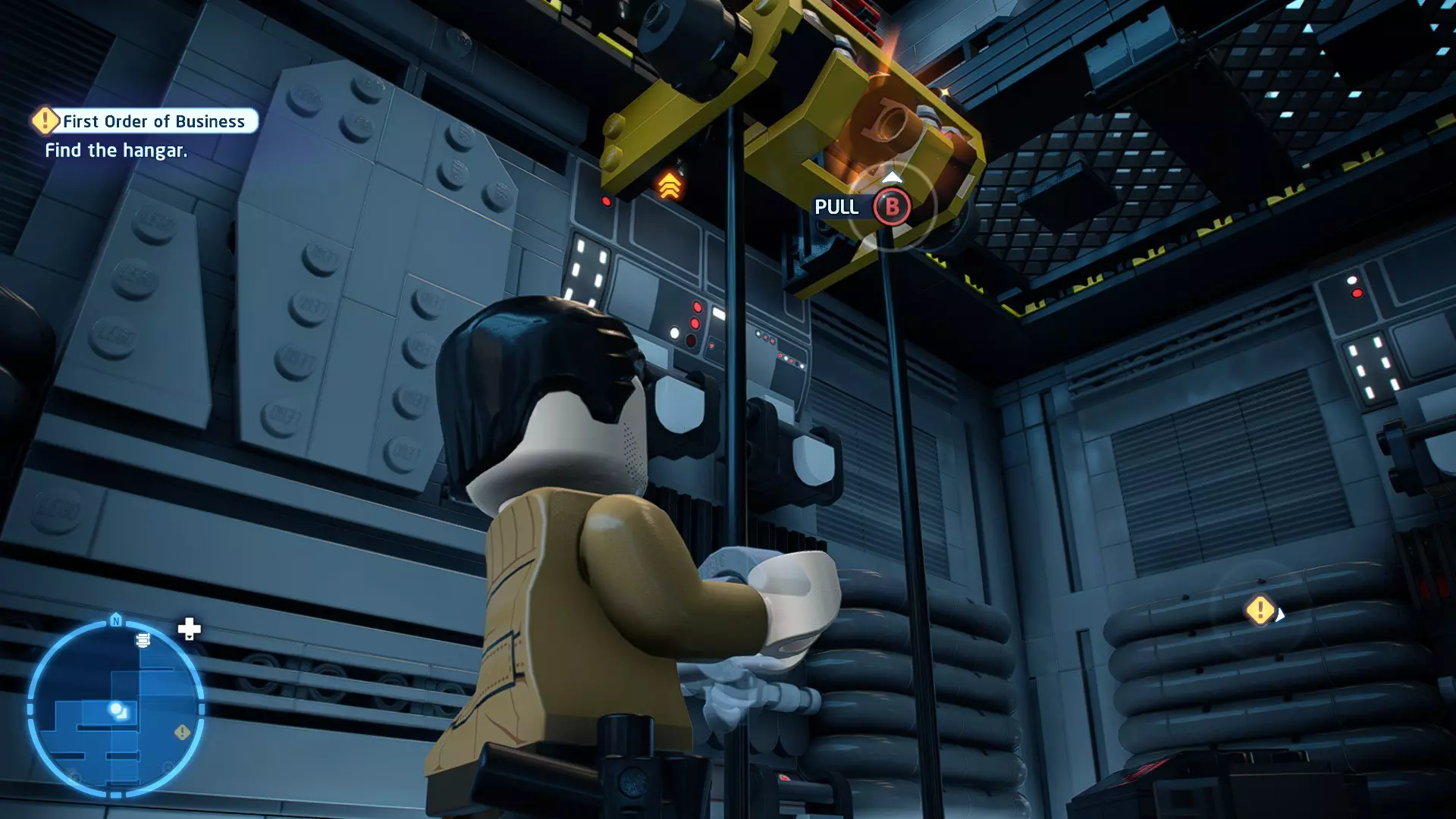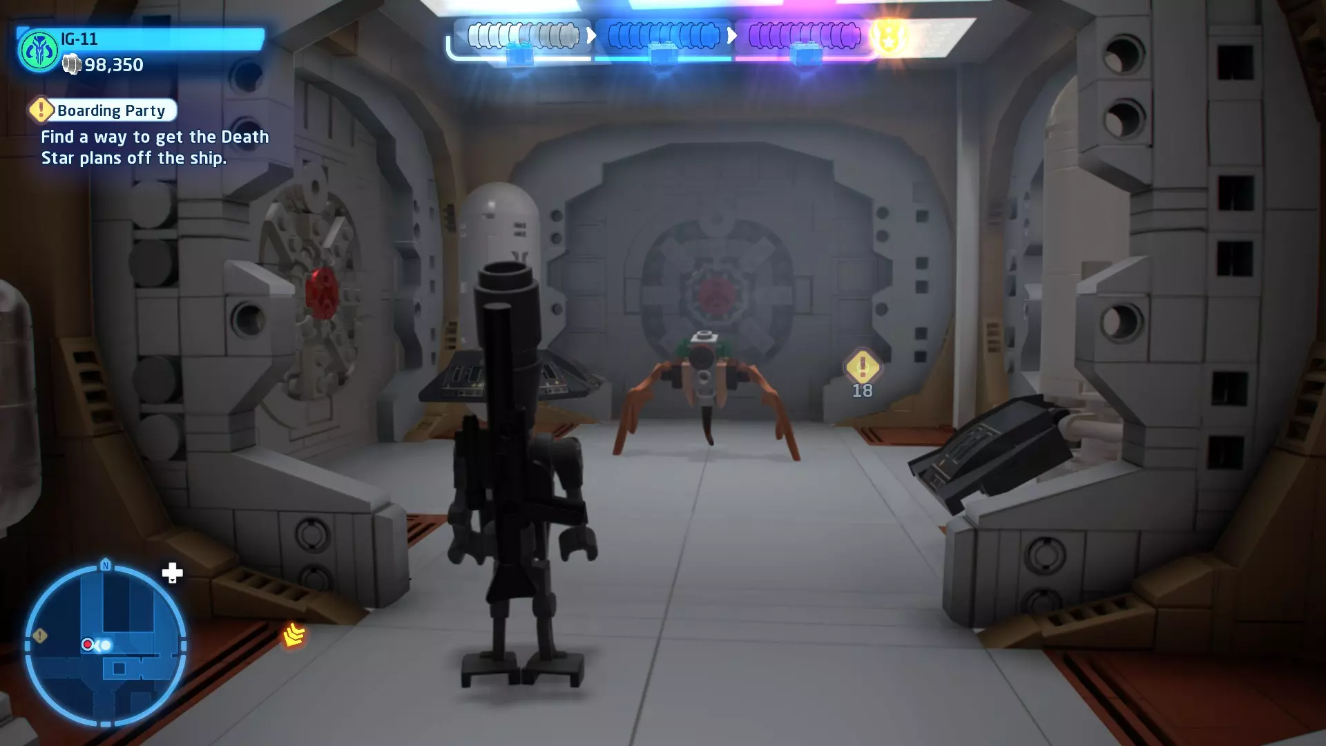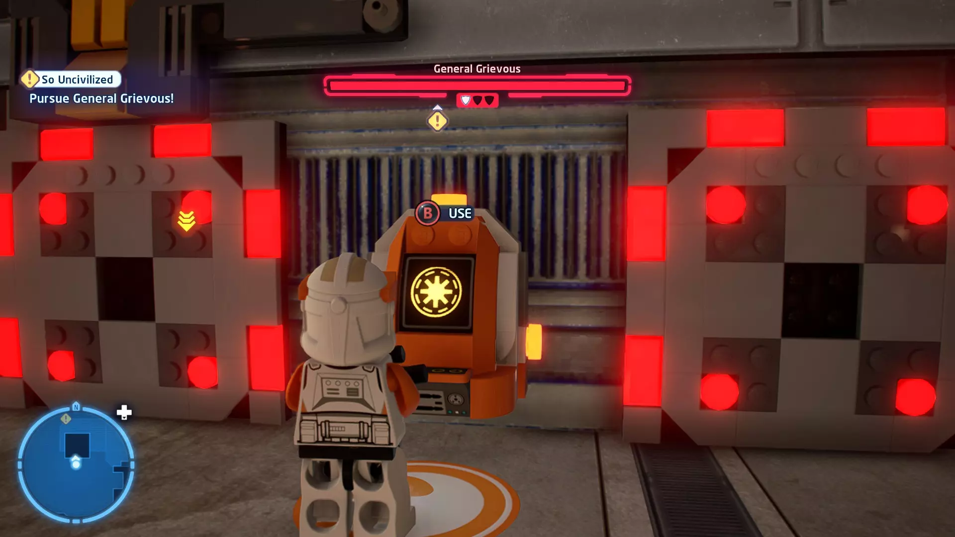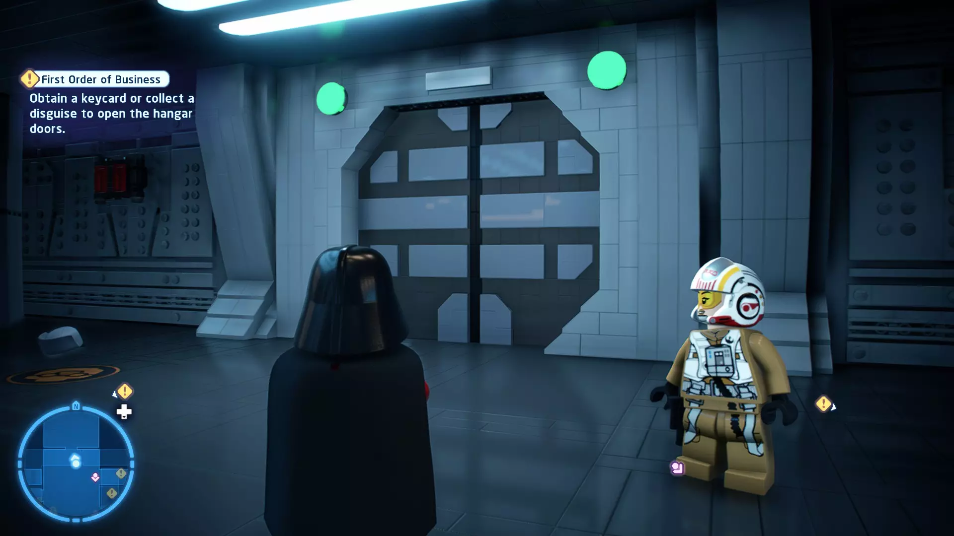 要完成此挑战,你需要在不被任何第一秩序部队发现的情况下抵达巴布的工坊。这意味着不能与任何第一秩序士兵战斗,不能向任何UA-TT开火,也不能进入黄色圆圈(代表士兵的视野范围)。小心穿过关卡,尽可能避免战斗。确保只有在波提示时,才能消灭第一道门后的士兵,否则他们会发现你。击败基吉米恶棍后,让出现的第一秩序巡逻队从你身边走过。到达最终庭院后,使用【潜行】或【清理庭院】方法(参见故事模式),在不被发现的情况下抵达巴布的工坊。如果你确实对此感到困难,你可以始终在自由游玩模式中进入该关卡,并将你的整个小队设置为反派或黑暗面角色,这样你就能直接从敌人身边走过。 挑战2 - 新指令 详情:在不触发警报的情况下,和平清理主庭院的冲锋队员。