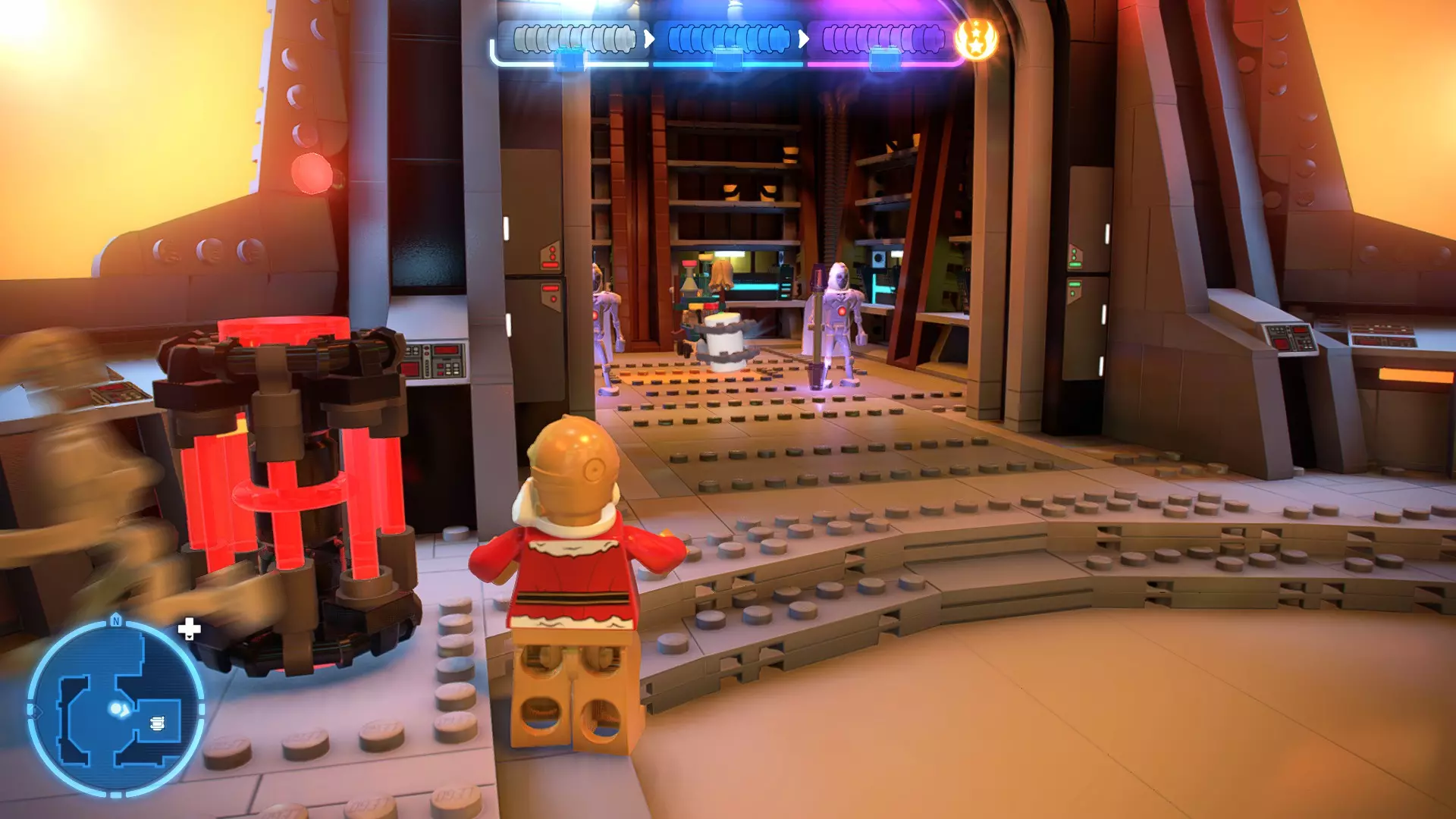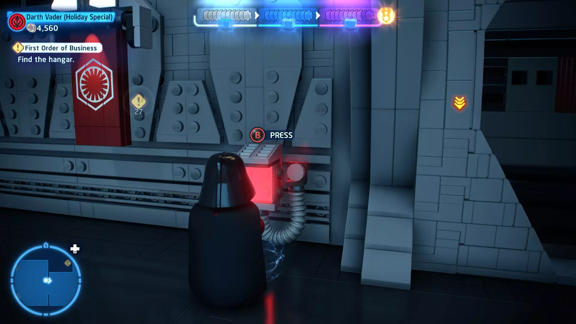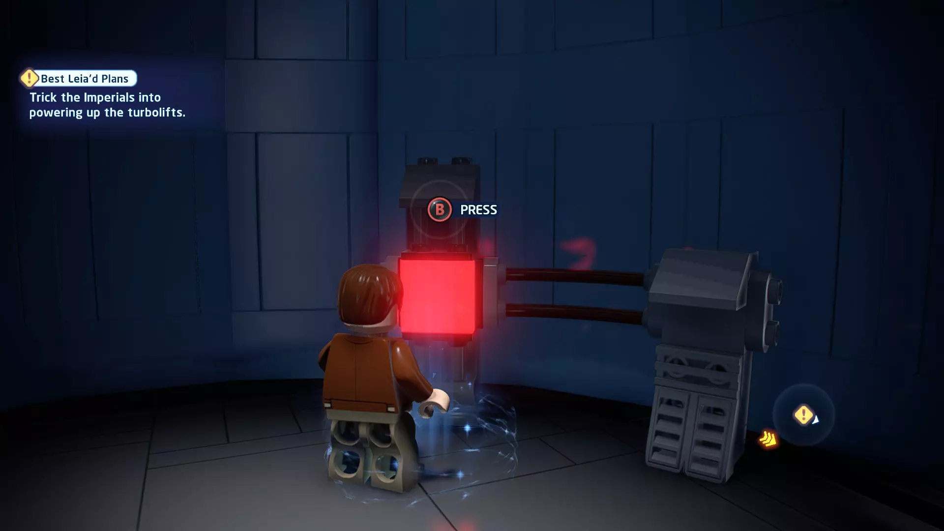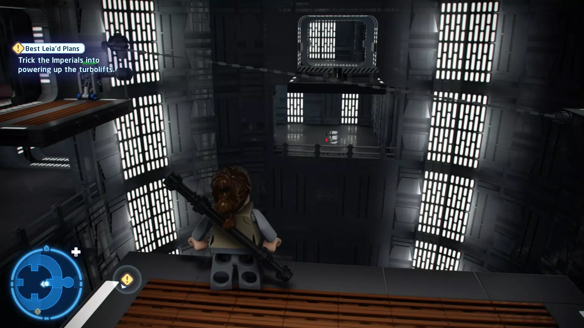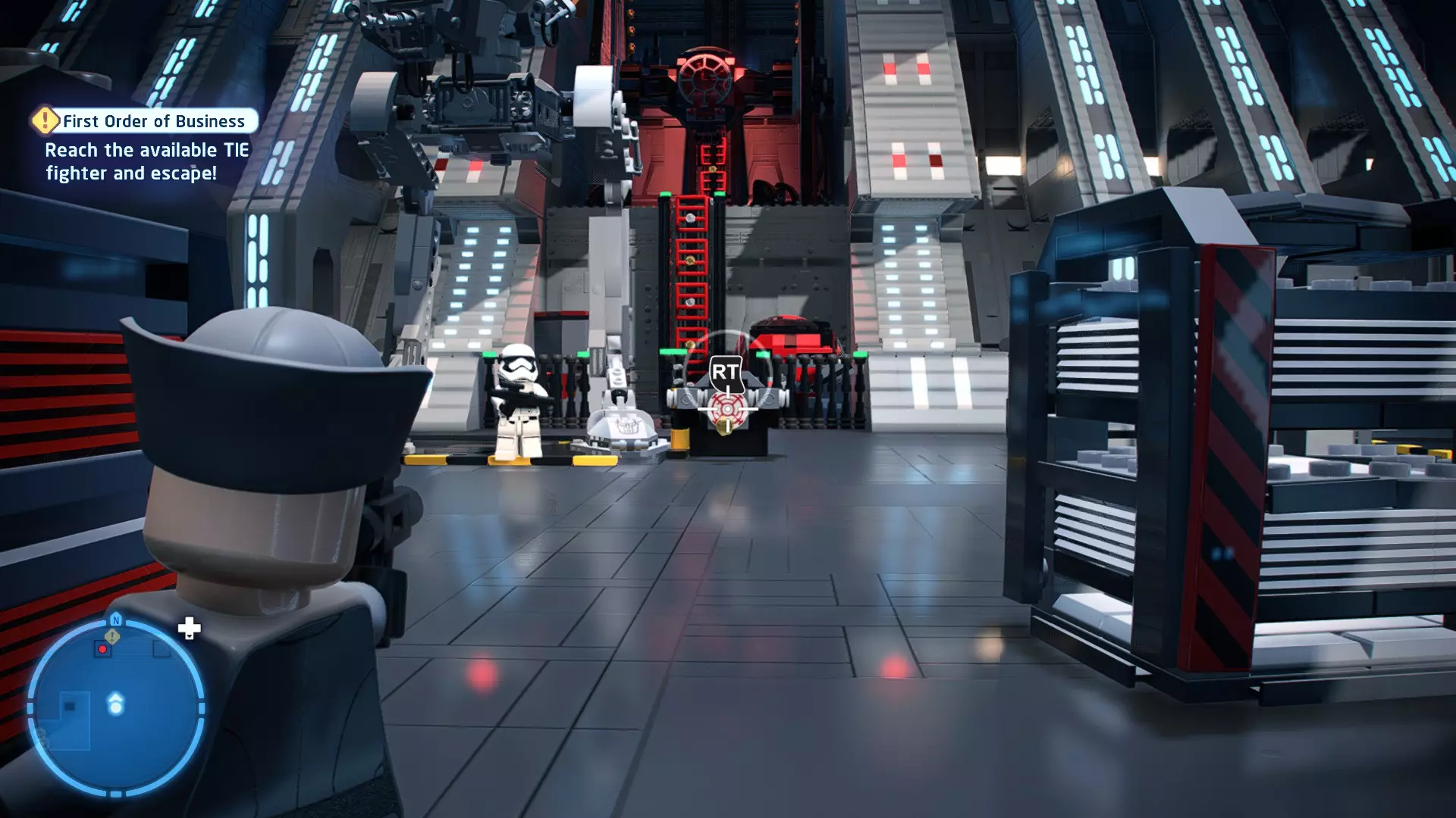 要完成此挑战,你需要在不被任何第一秩序部队发现的情况下抵达巴布的工坊。这意味着不能与任何第一秩序士兵战斗,不能向任何UA-TT开火,也不能进入黄色圆圈(代表士兵的视野范围)。小心穿过关卡,尽可能避免战斗。确保只有在波提示时,才能消灭第一道门后的士兵,否则他们会发现你。击败基吉米恶棍后,让出现的第一秩序巡逻队从你身边走过。到达最终庭院后,使用【潜行】或【清理庭院】方法(参见故事模式),在不被发现的情况下抵达巴布的工坊。如果你确实对此感到困难,你可以始终在自由游玩模式中进入该关卡,并将你的整个小队设置为反派或黑暗面角色,这样你就能直接从敌人身边走过。 挑战2 - 新指令 详情:在不触发警报的情况下,和平清理主庭院的冲锋队员。