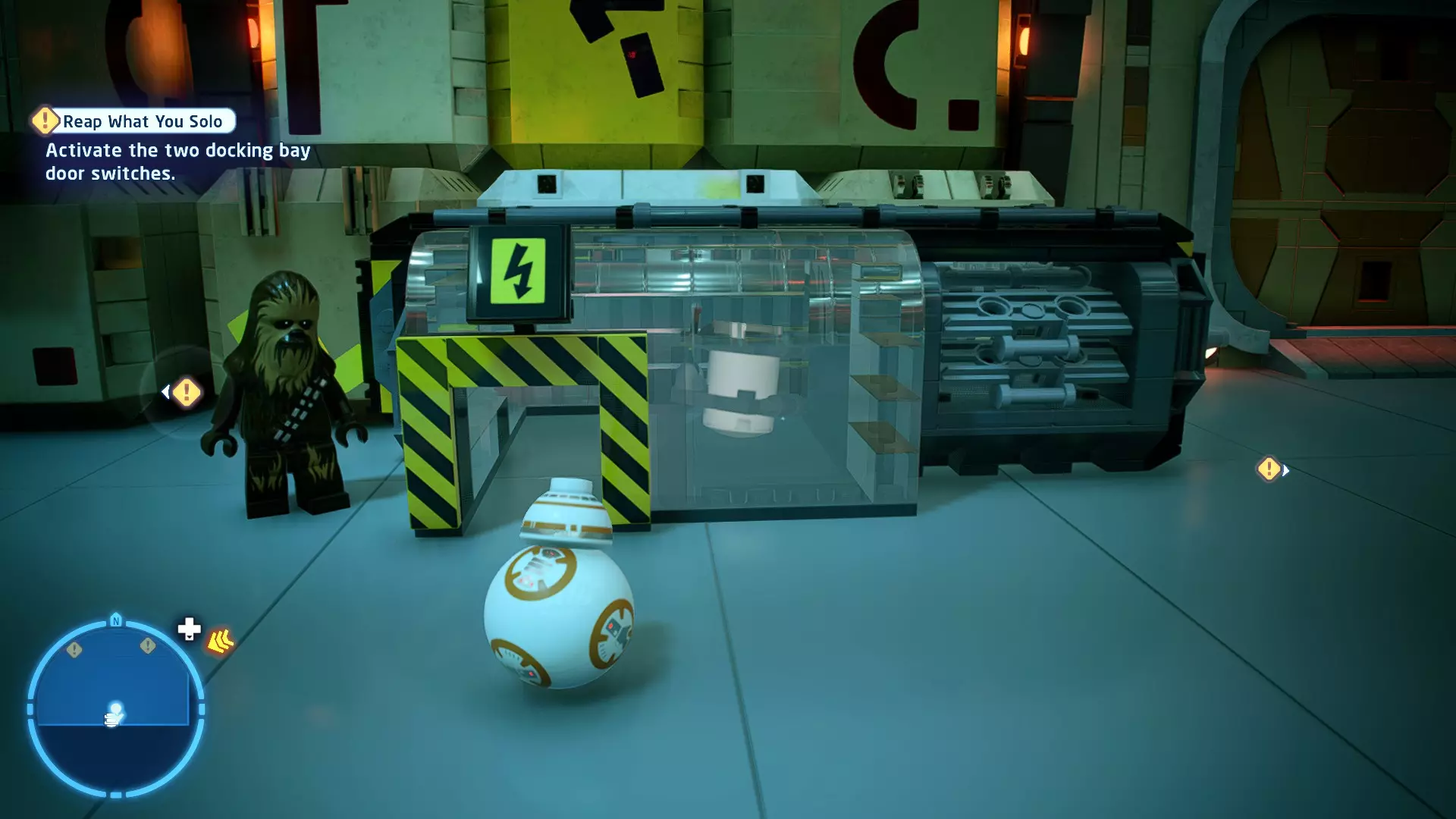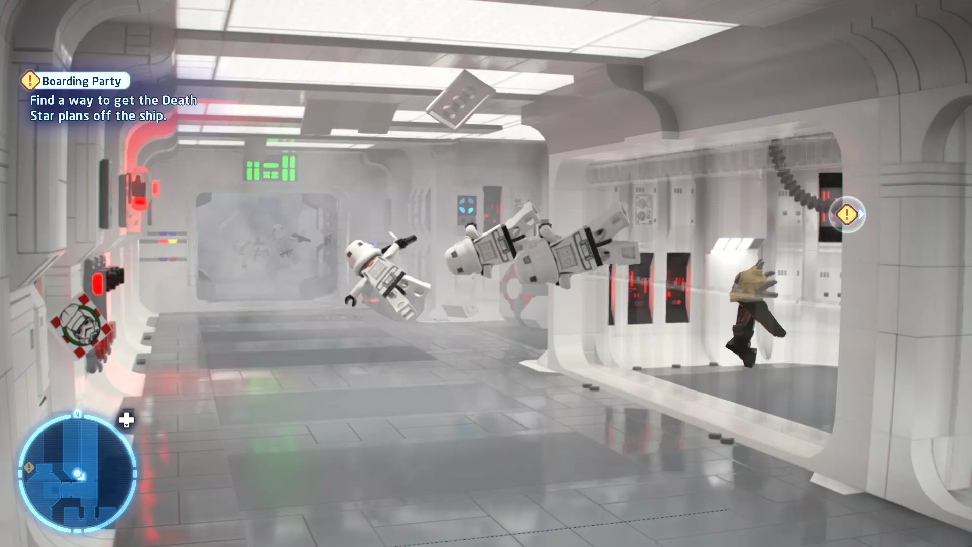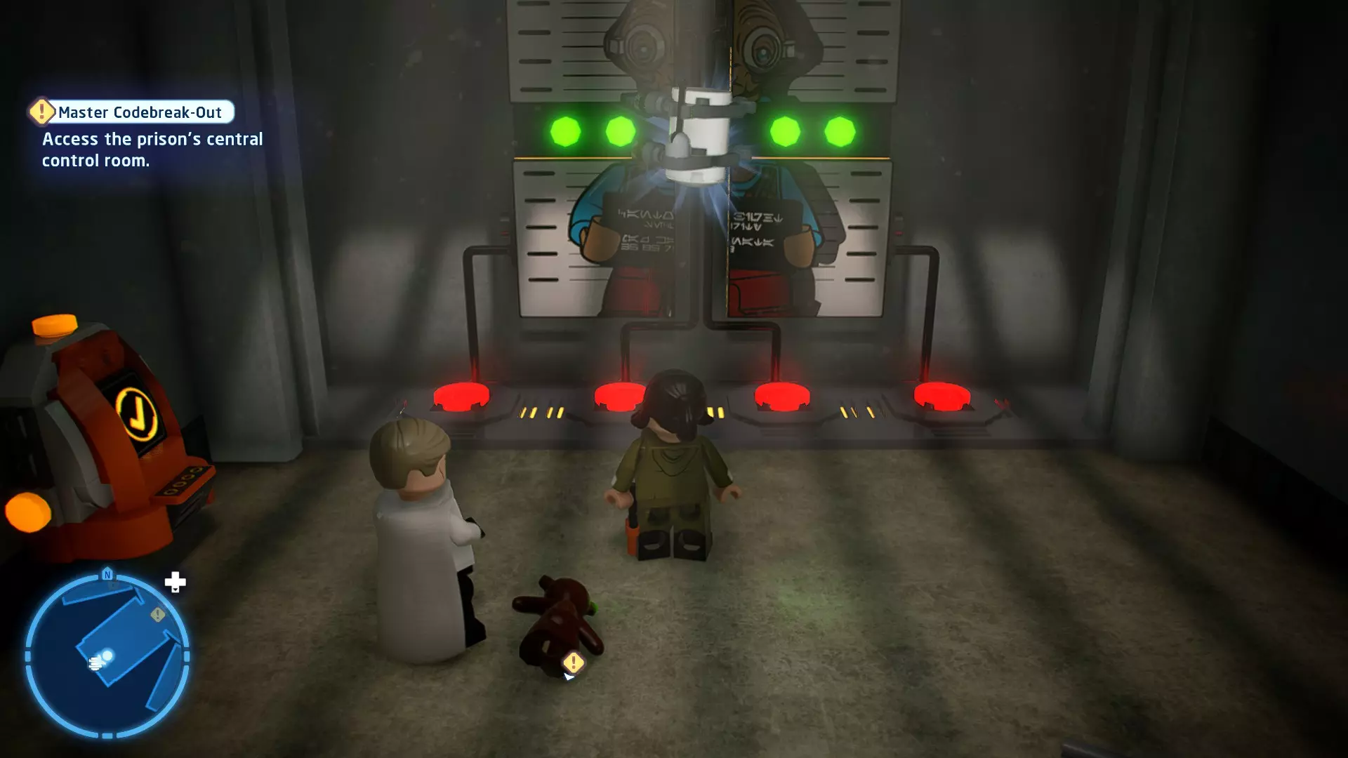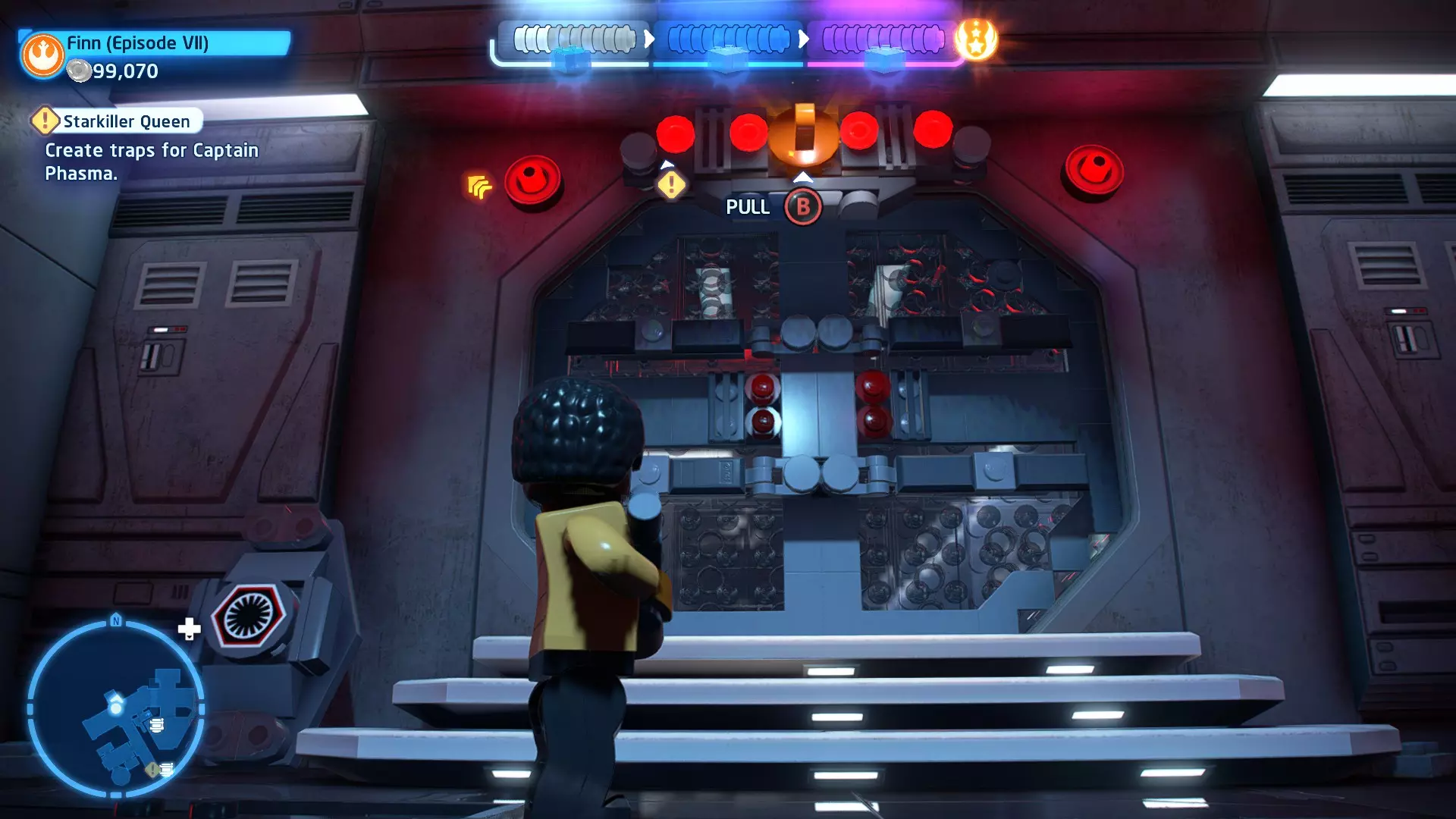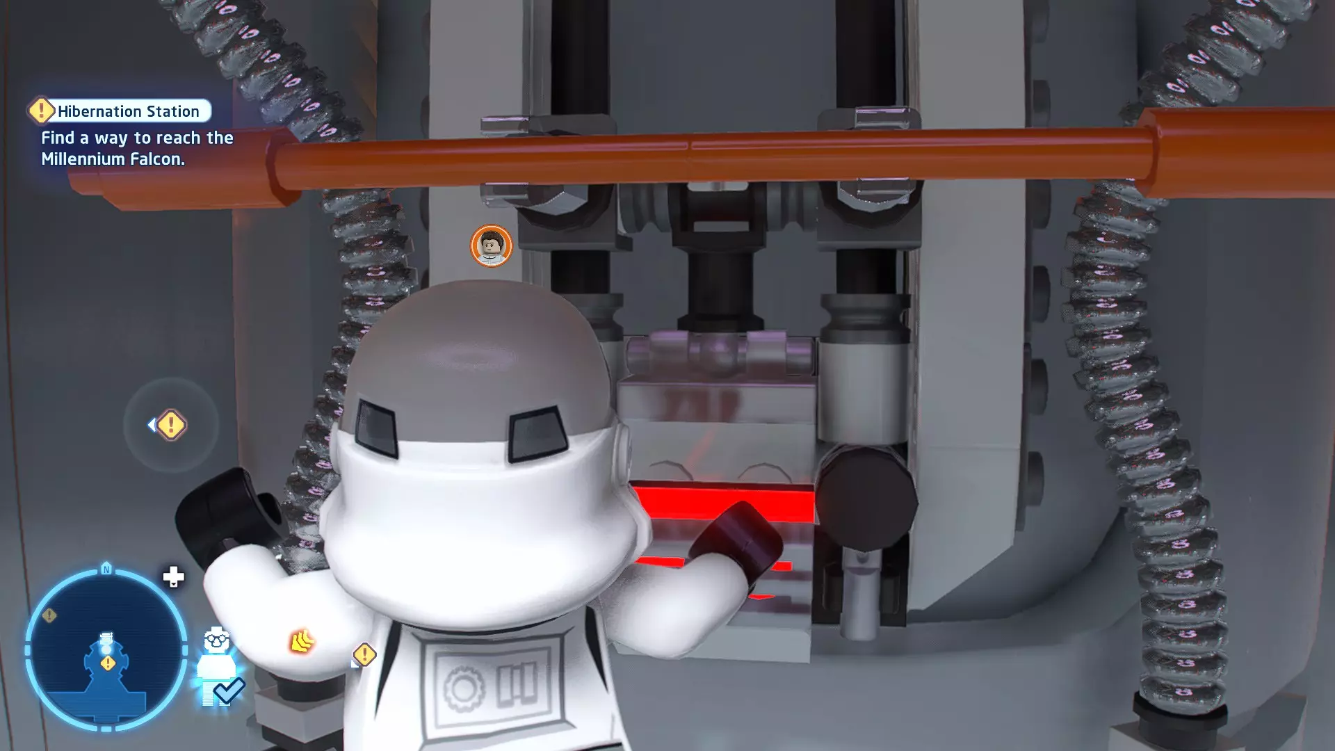 要完成此挑战,你需要在不被任何第一秩序部队发现的情况下抵达巴布的工坊。这意味着不能与任何第一秩序士兵战斗,不能向任何UA-TT开火,也不能进入黄色圆圈(代表士兵的视野范围)。小心穿过关卡,尽可能避免战斗。确保只有在波提示时,才能消灭第一道门后的士兵,否则他们会发现你。击败基吉米恶棍后,让出现的第一秩序巡逻队从你身边走过。到达最终庭院后,使用【潜行】或【清理庭院】方法(参见故事模式),在不被发现的情况下抵达巴布的工坊。如果你确实对此感到困难,你可以始终在自由游玩模式中进入该关卡,并将你的整个小队设置为反派或黑暗面角色,这样你就能直接从敌人身边走过。 挑战2 - 新指令 详情:在不触发警报的情况下,和平清理主庭院的冲锋队员。