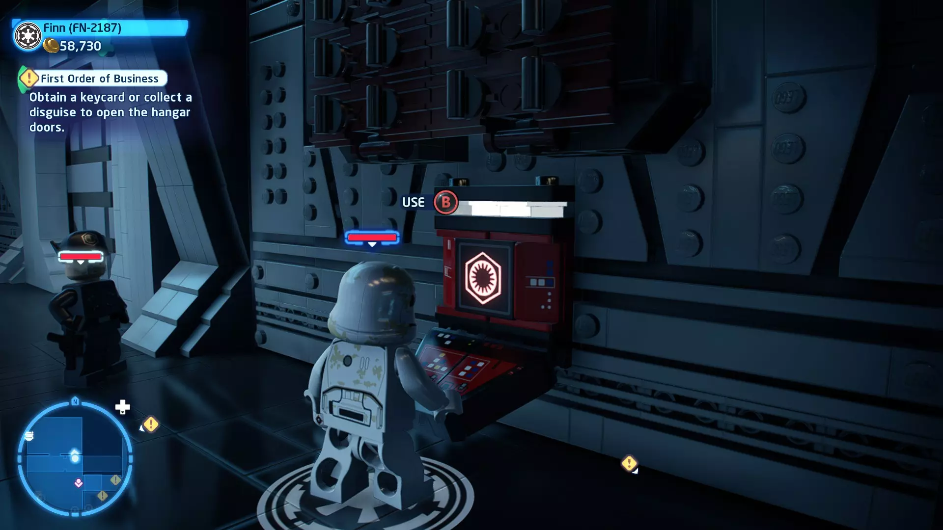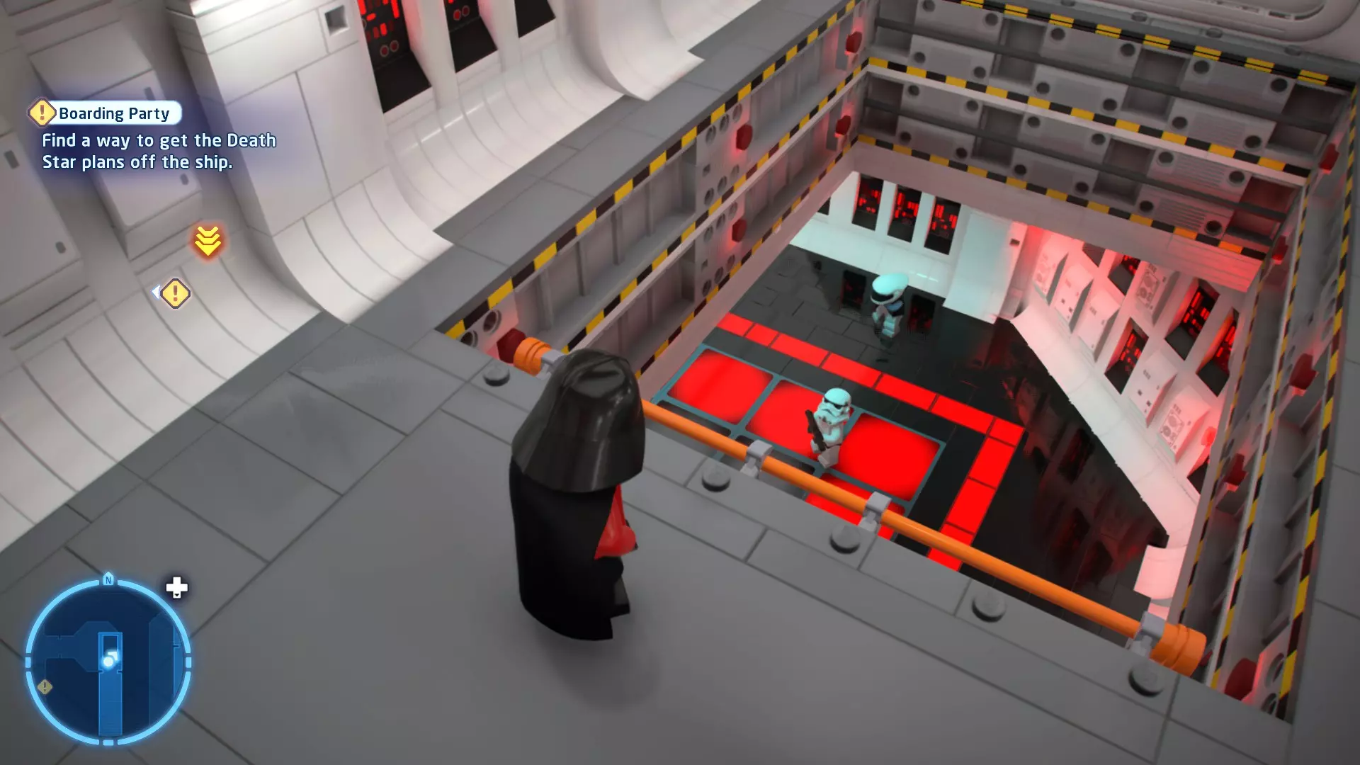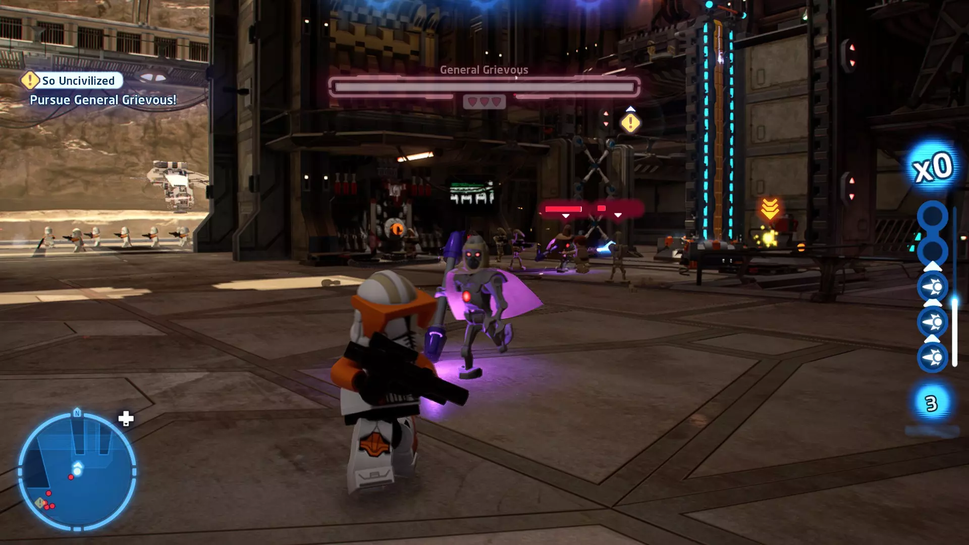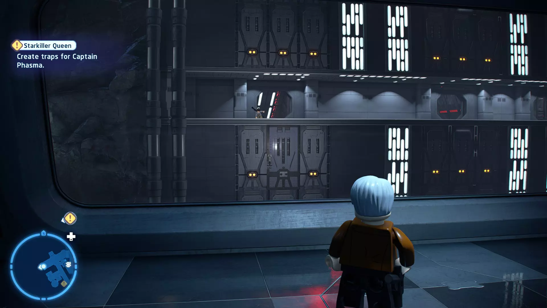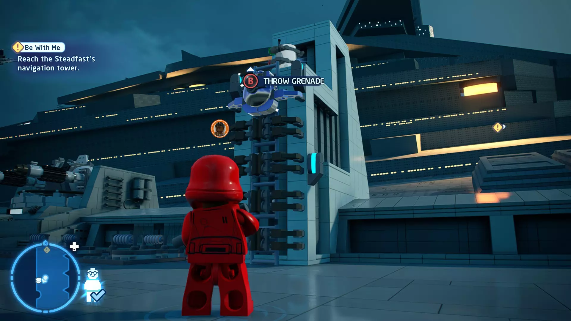 要完成此挑战,你需要在不被任何第一秩序部队发现的情况下抵达巴布的工坊。这意味着不能与任何第一秩序士兵战斗,不能向任何UA-TT开火,也不能进入黄色圆圈(代表士兵的视野范围)。小心穿过关卡,尽可能避免战斗。确保只有在波提示时,才能消灭第一道门后的士兵,否则他们会发现你。击败基吉米恶棍后,让出现的第一秩序巡逻队从你身边走过。到达最终庭院后,使用【潜行】或【清理庭院】方法(参见故事模式),在不被发现的情况下抵达巴布的工坊。如果你确实对此感到困难,你可以始终在自由游玩模式中进入该关卡,并将你的整个小队设置为反派或黑暗面角色,这样你就能直接从敌人身边走过。 挑战2 - 新指令 详情:在不触发警报的情况下,和平清理主庭院的冲锋队员。