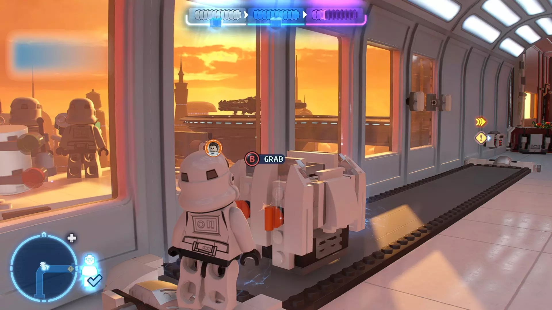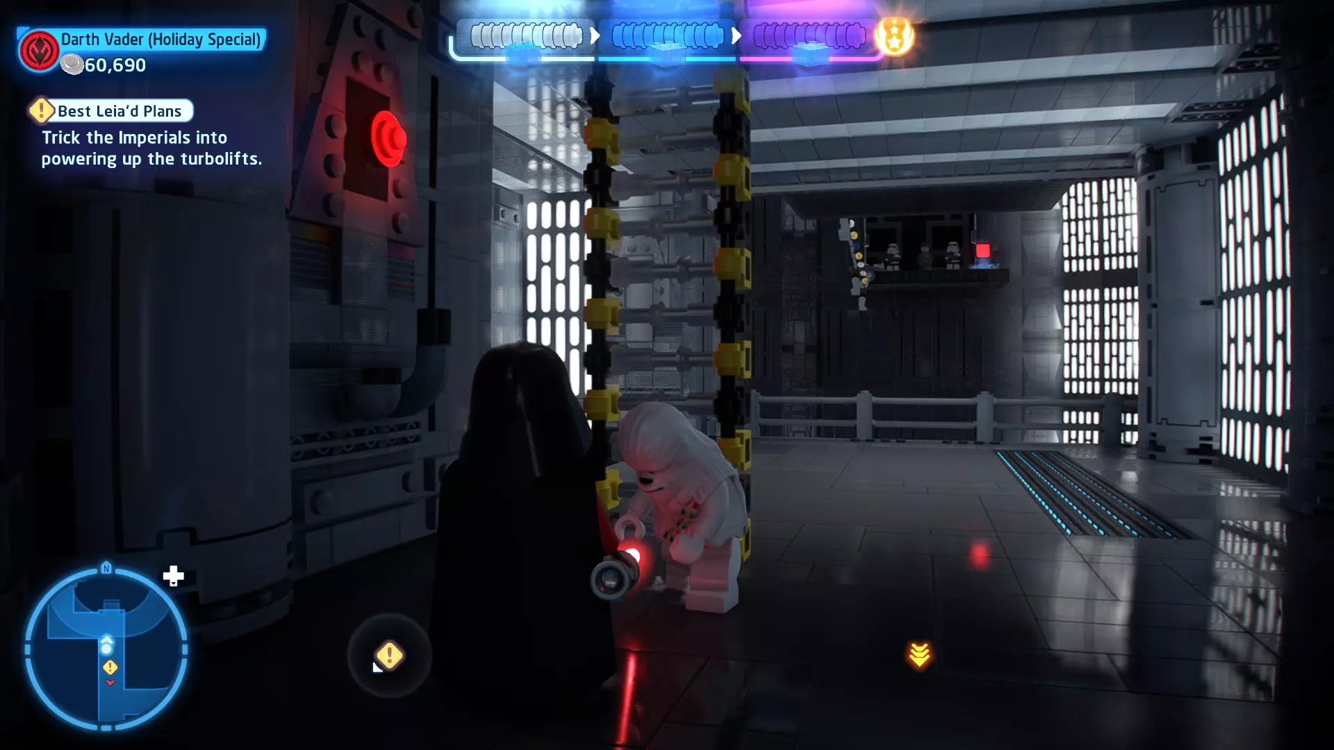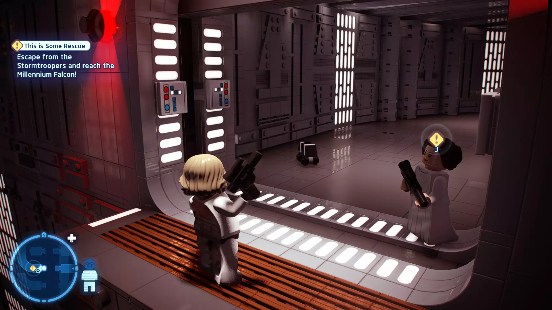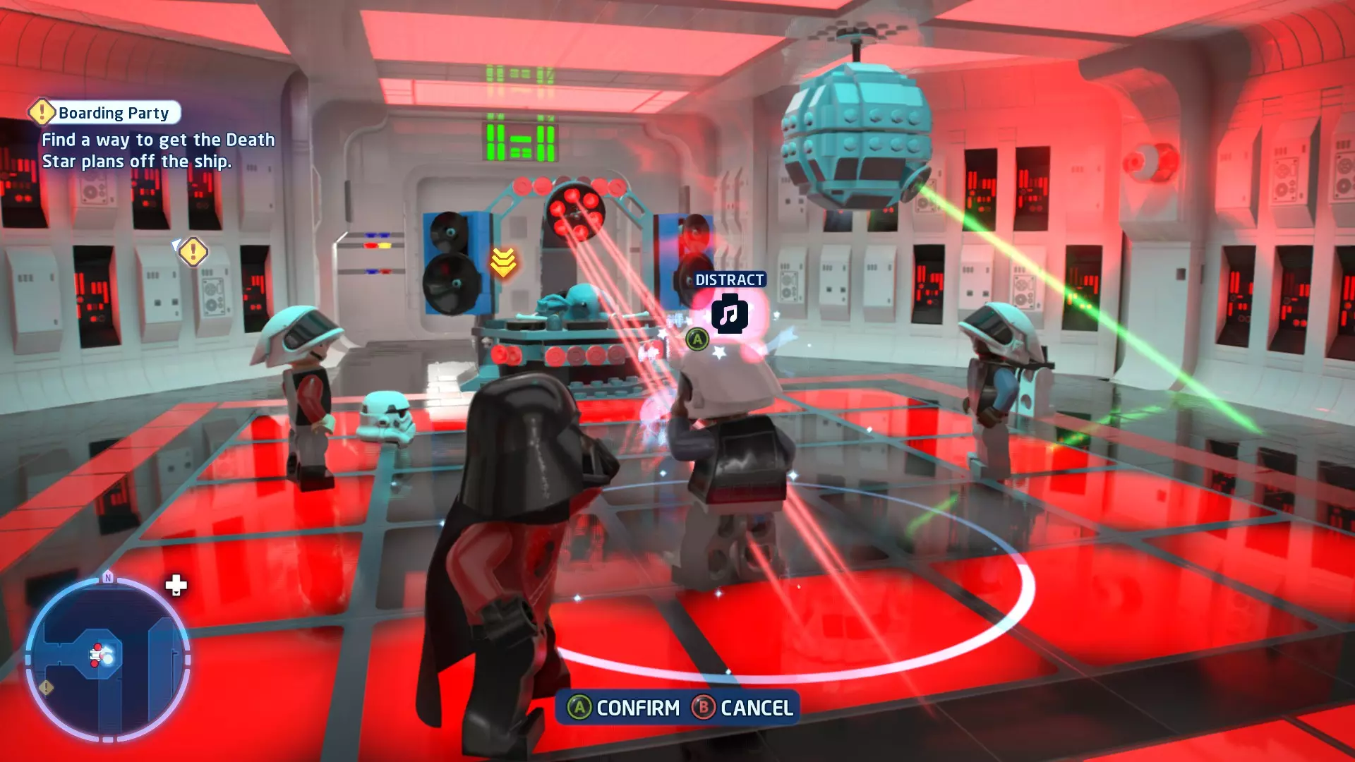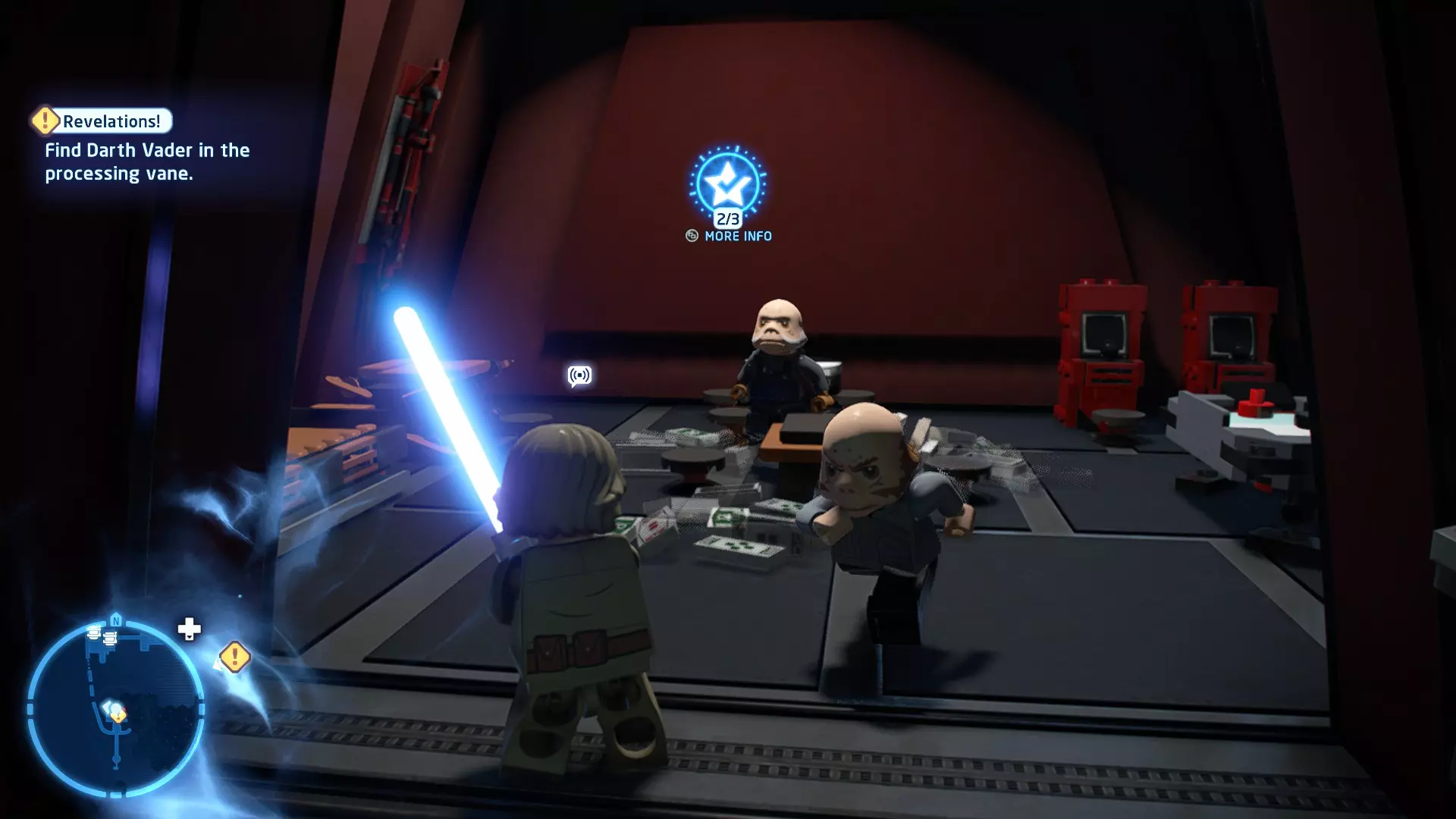 要完成此挑战,你需要在不被任何第一秩序部队发现的情况下抵达巴布的工坊。这意味着不能与任何第一秩序士兵战斗,不能向任何UA-TT开火,也不能进入黄色圆圈(代表士兵的视野范围)。小心穿过关卡,尽可能避免战斗。确保只有在波提示时,才能消灭第一道门后的士兵,否则他们会发现你。击败基吉米恶棍后,让出现的第一秩序巡逻队从你身边走过。到达最终庭院后,使用【潜行】或【清理庭院】方法(参见故事模式),在不被发现的情况下抵达巴布的工坊。如果你确实对此感到困难,你可以始终在自由游玩模式中进入该关卡,并将你的整个小队设置为反派或黑暗面角色,这样你就能直接从敌人身边走过。 挑战2 - 新指令 详情:在不触发警报的情况下,和平清理主庭院的冲锋队员。