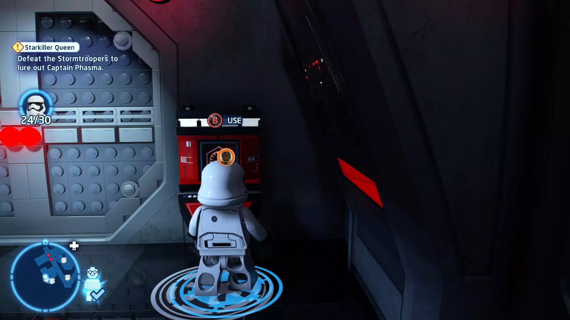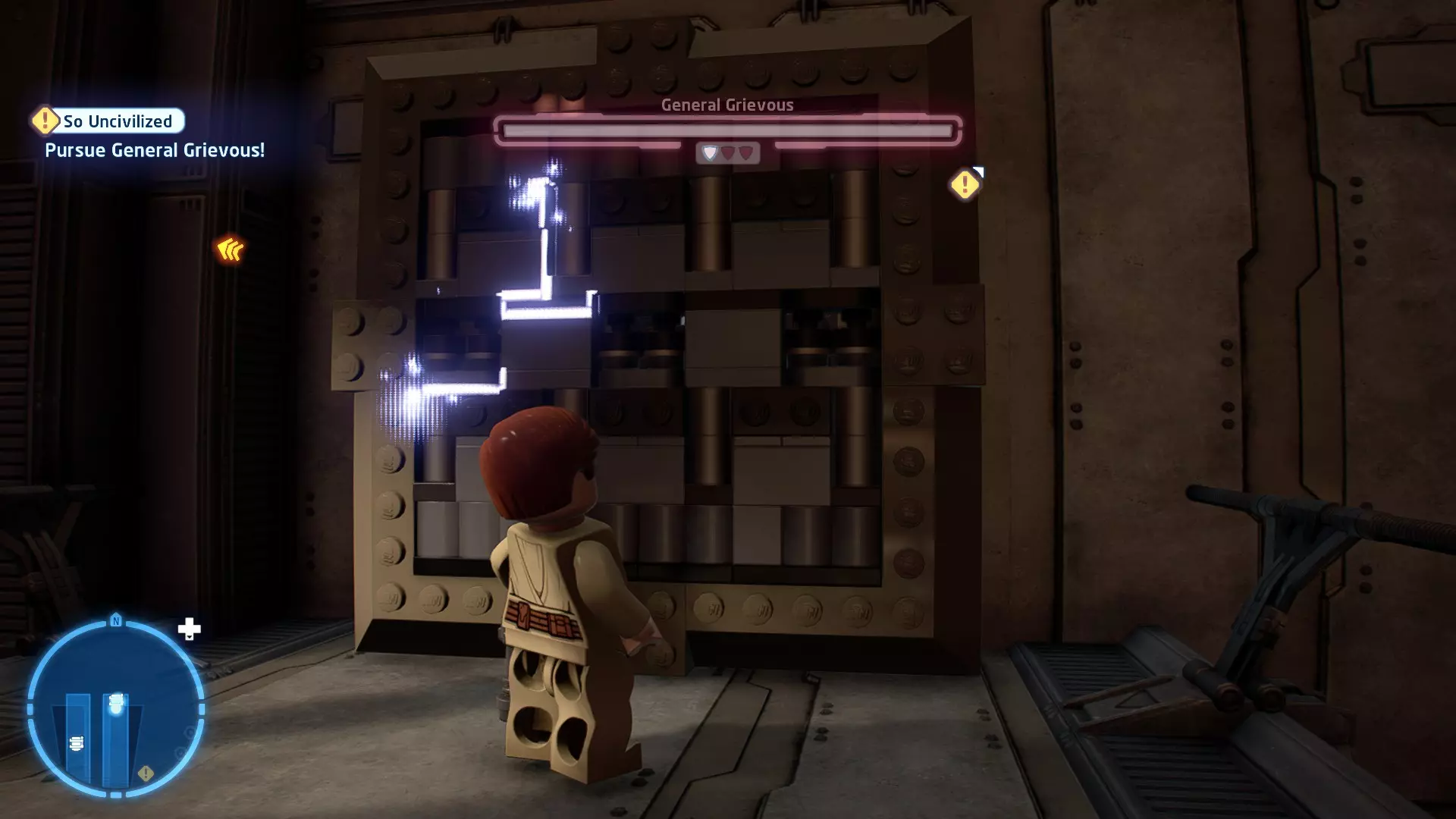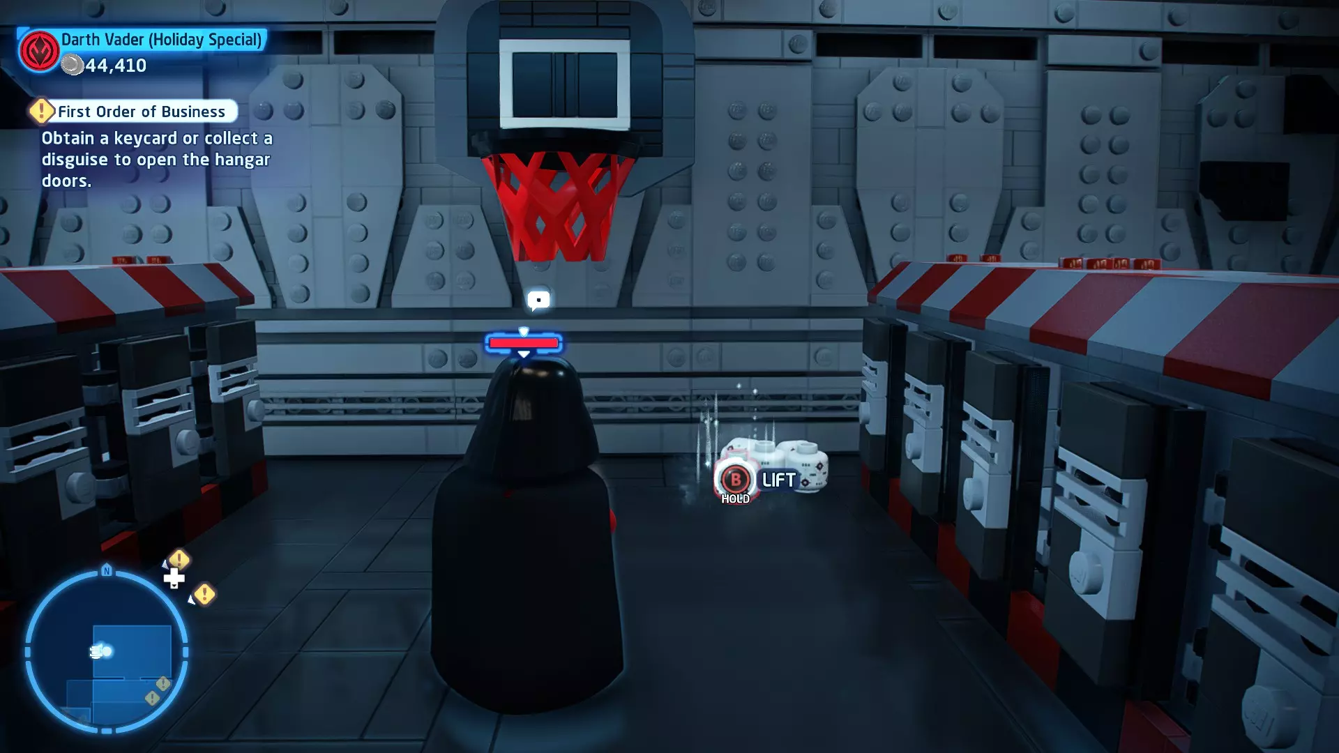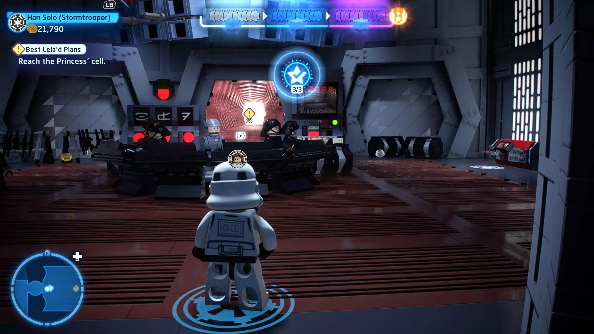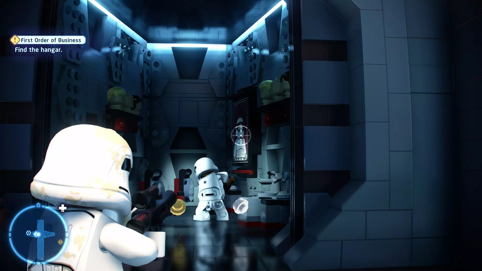 要完成此挑战,你需要在不被任何第一秩序部队发现的情况下抵达巴布的工坊。这意味着不能与任何第一秩序士兵战斗,不能向任何UA-TT开火,也不能进入黄色圆圈(代表士兵的视野范围)。小心穿过关卡,尽可能避免战斗。确保只有在波提示时,才能消灭第一道门后的士兵,否则他们会发现你。击败基吉米恶棍后,让出现的第一秩序巡逻队从你身边走过。到达最终庭院后,使用【潜行】或【清理庭院】方法(参见故事模式),在不被发现的情况下抵达巴布的工坊。如果你确实对此感到困难,你可以始终在自由游玩模式中进入该关卡,并将你的整个小队设置为反派或黑暗面角色,这样你就能直接从敌人身边走过。 挑战2 - 新指令 详情:在不触发警报的情况下,和平清理主庭院的冲锋队员。