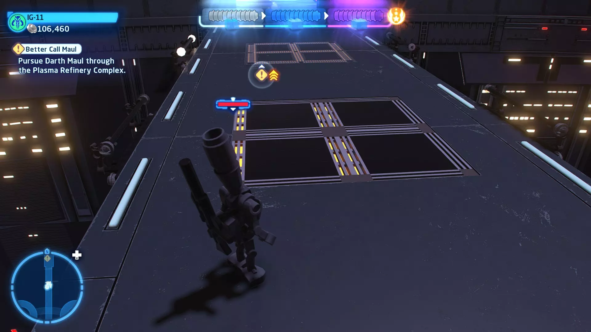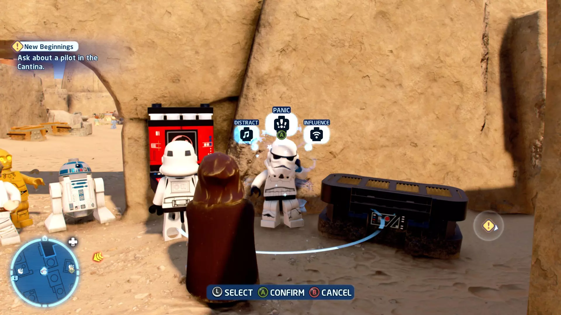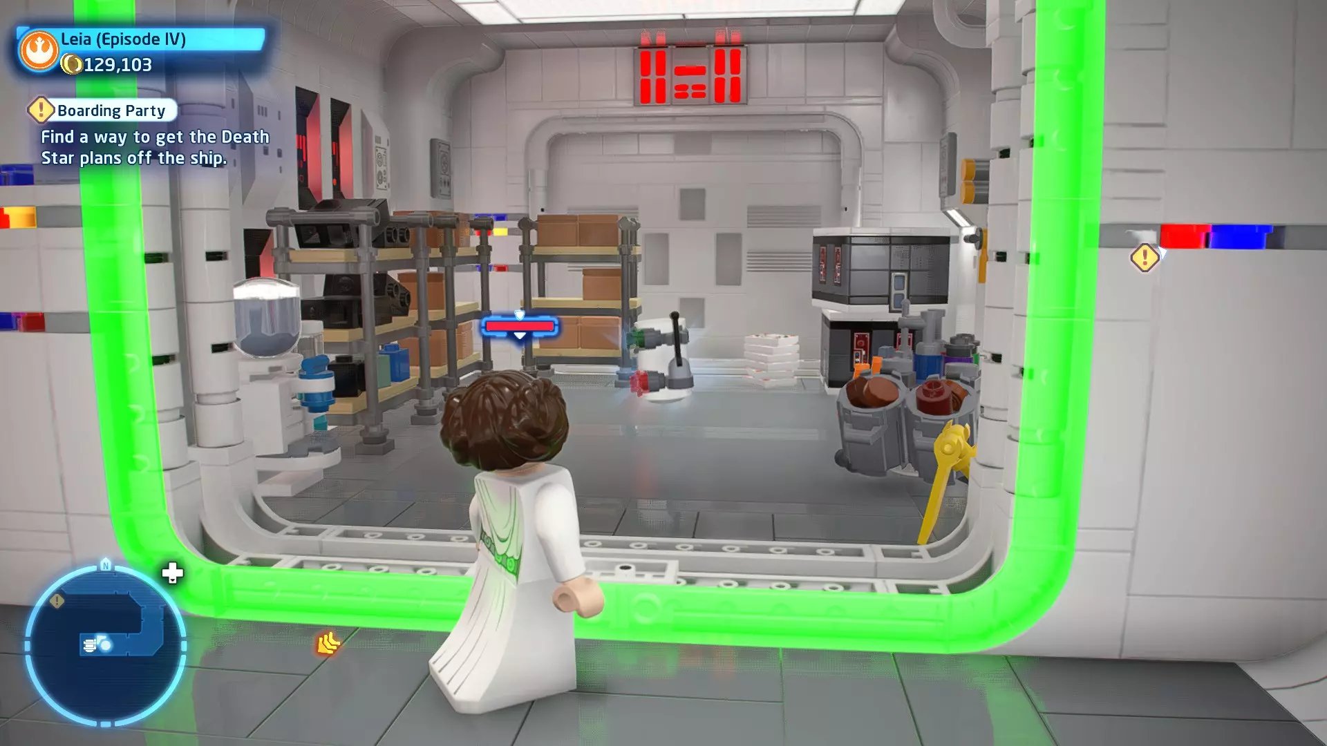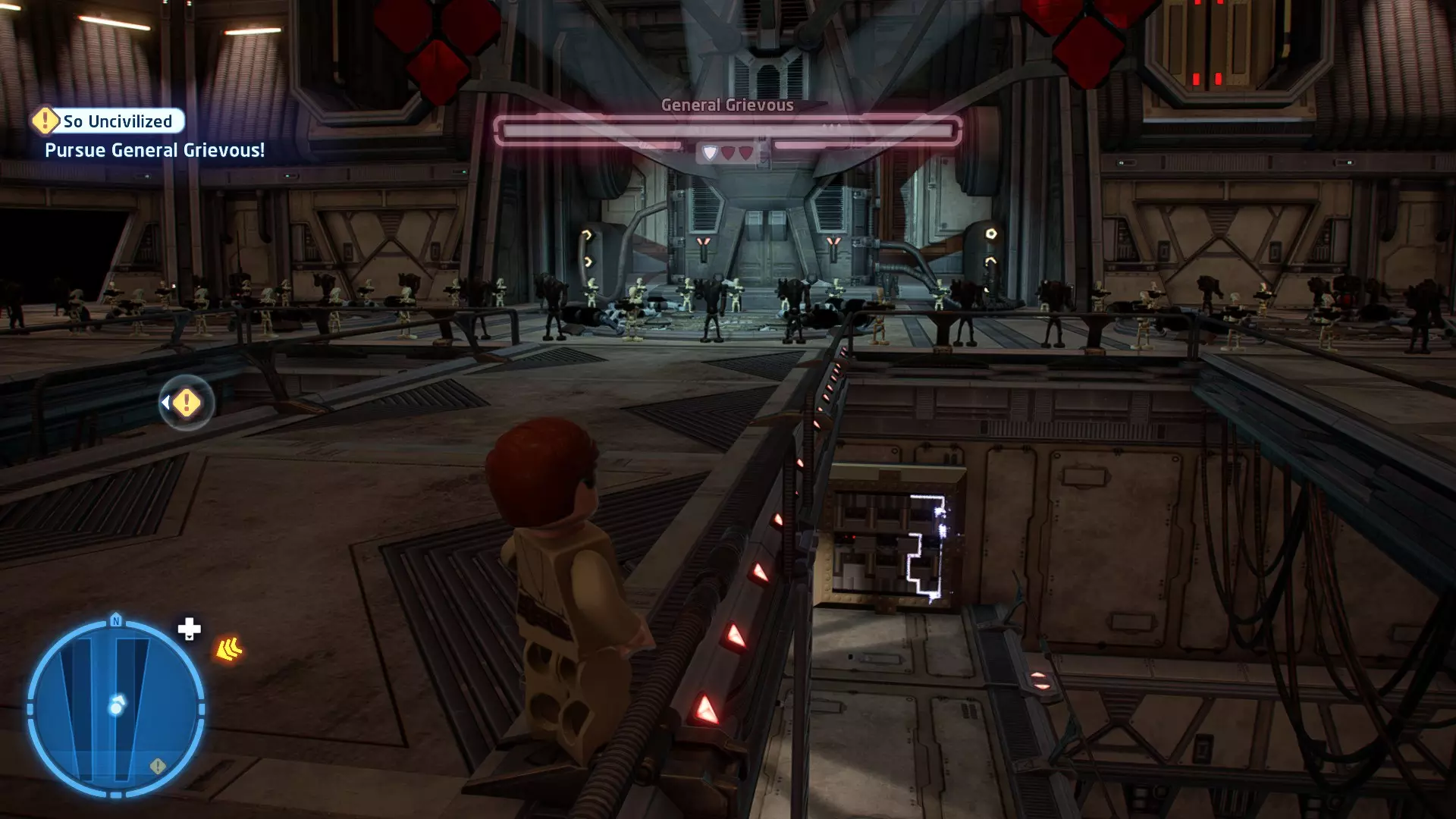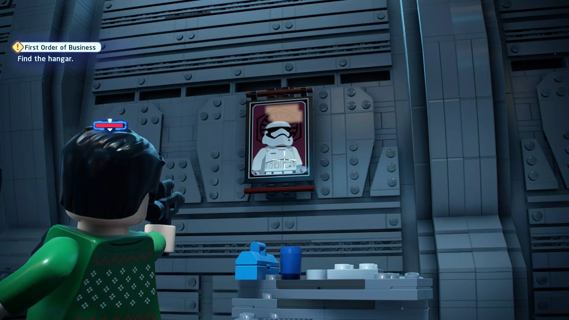 要完成此挑战,你需要在不被任何第一秩序部队发现的情况下抵达巴布的工坊。这意味着不能与任何第一秩序士兵战斗,不能向任何UA-TT开火,也不能进入黄色圆圈(代表士兵的视野范围)。小心穿过关卡,尽可能避免战斗。确保只有在波提示时,才能消灭第一道门后的士兵,否则他们会发现你。击败基吉米恶棍后,让出现的第一秩序巡逻队从你身边走过。到达最终庭院后,使用【潜行】或【清理庭院】方法(参见故事模式),在不被发现的情况下抵达巴布的工坊。如果你确实对此感到困难,你可以始终在自由游玩模式中进入该关卡,并将你的整个小队设置为反派或黑暗面角色,这样你就能直接从敌人身边走过。 挑战2 - 新指令 详情:在不触发警报的情况下,和平清理主庭院的冲锋队员。