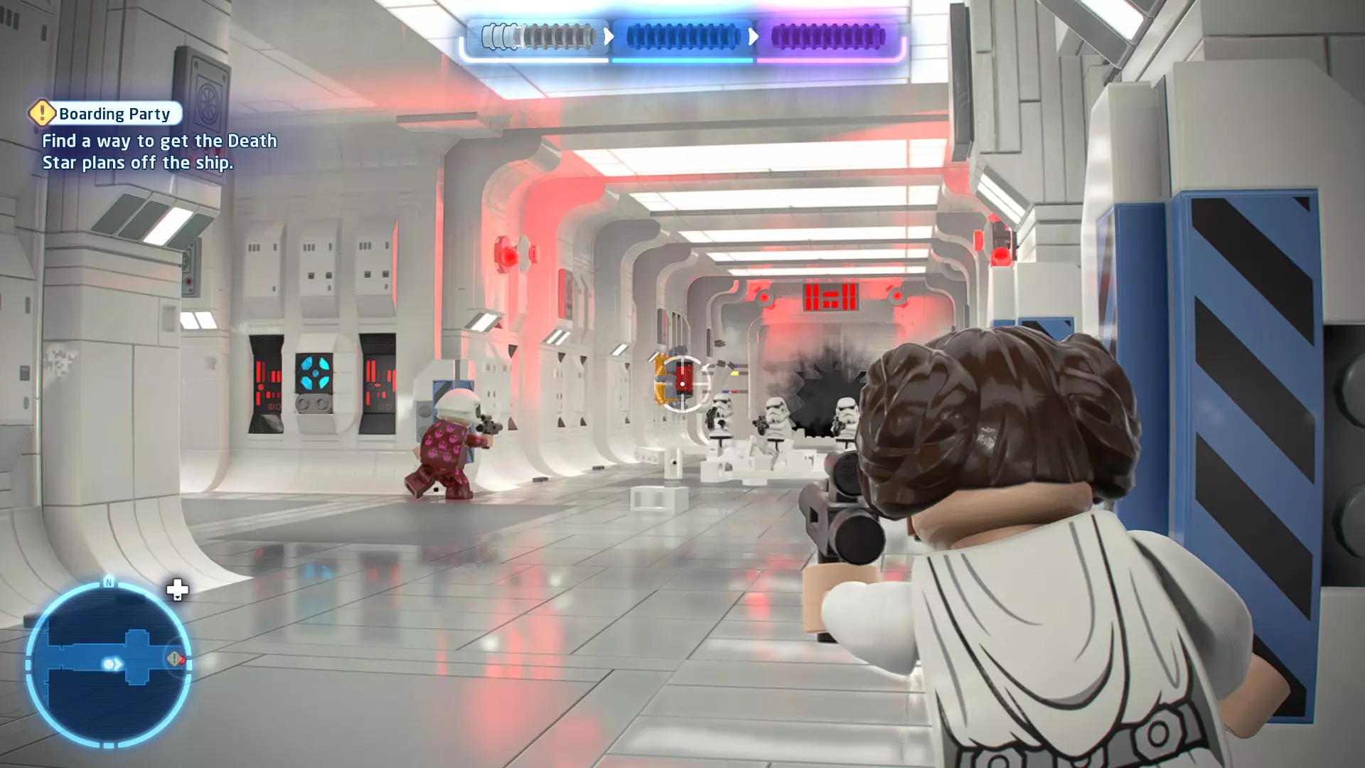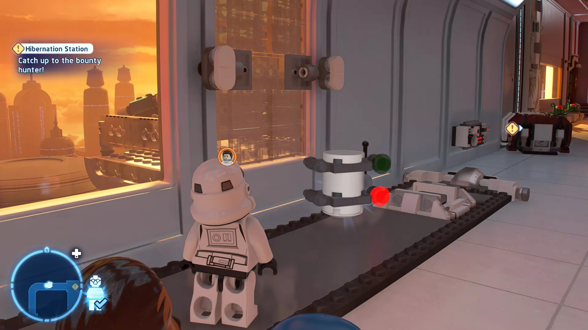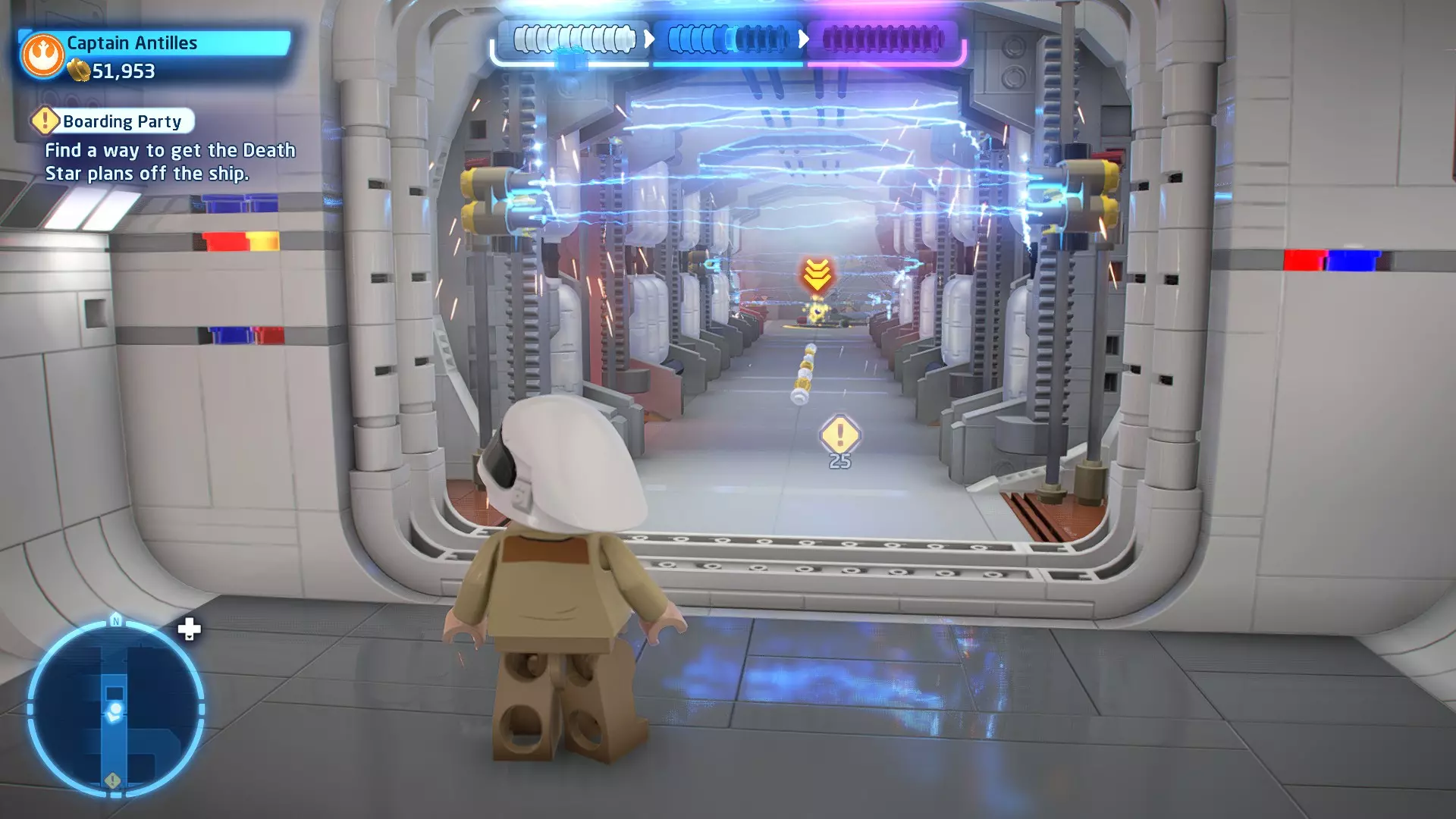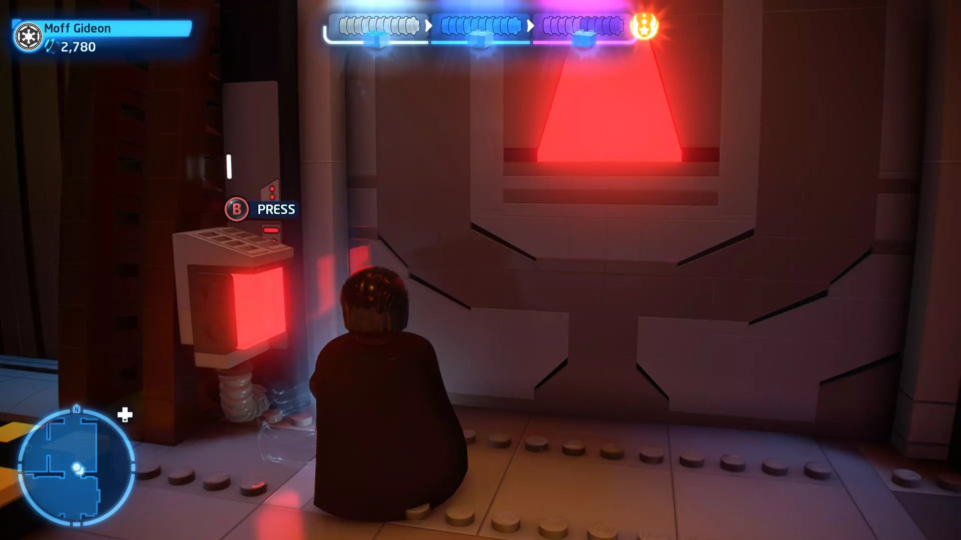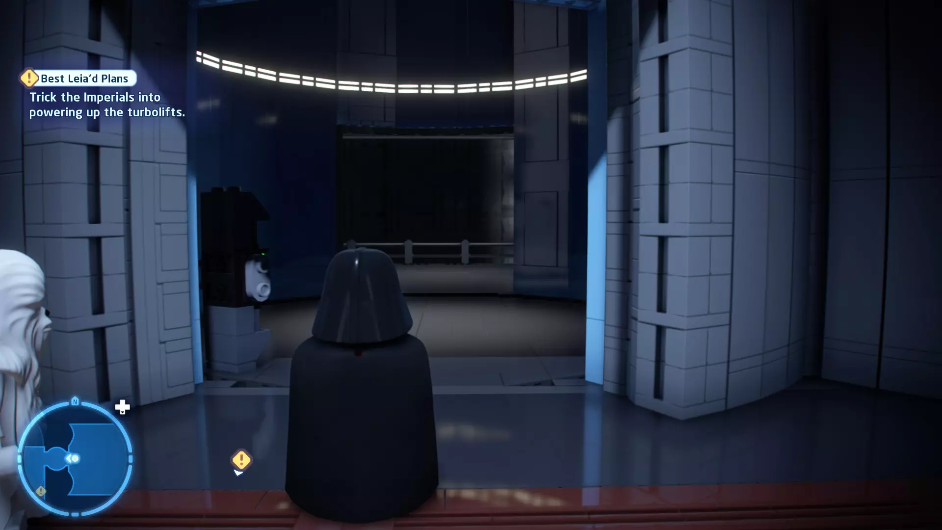 要完成此挑战,你需要在不被任何第一秩序部队发现的情况下抵达巴布的工坊。这意味着不能与任何第一秩序士兵战斗,不能向任何UA-TT开火,也不能进入黄色圆圈(代表士兵的视野范围)。小心穿过关卡,尽可能避免战斗。确保只有在波提示时,才能消灭第一道门后的士兵,否则他们会发现你。击败基吉米恶棍后,让出现的第一秩序巡逻队从你身边走过。到达最终庭院后,使用【潜行】或【清理庭院】方法(参见故事模式),在不被发现的情况下抵达巴布的工坊。如果你确实对此感到困难,你可以始终在自由游玩模式中进入该关卡,并将你的整个小队设置为反派或黑暗面角色,这样你就能直接从敌人身边走过。 挑战2 - 新指令 详情:在不触发警报的情况下,和平清理主庭院的冲锋队员。