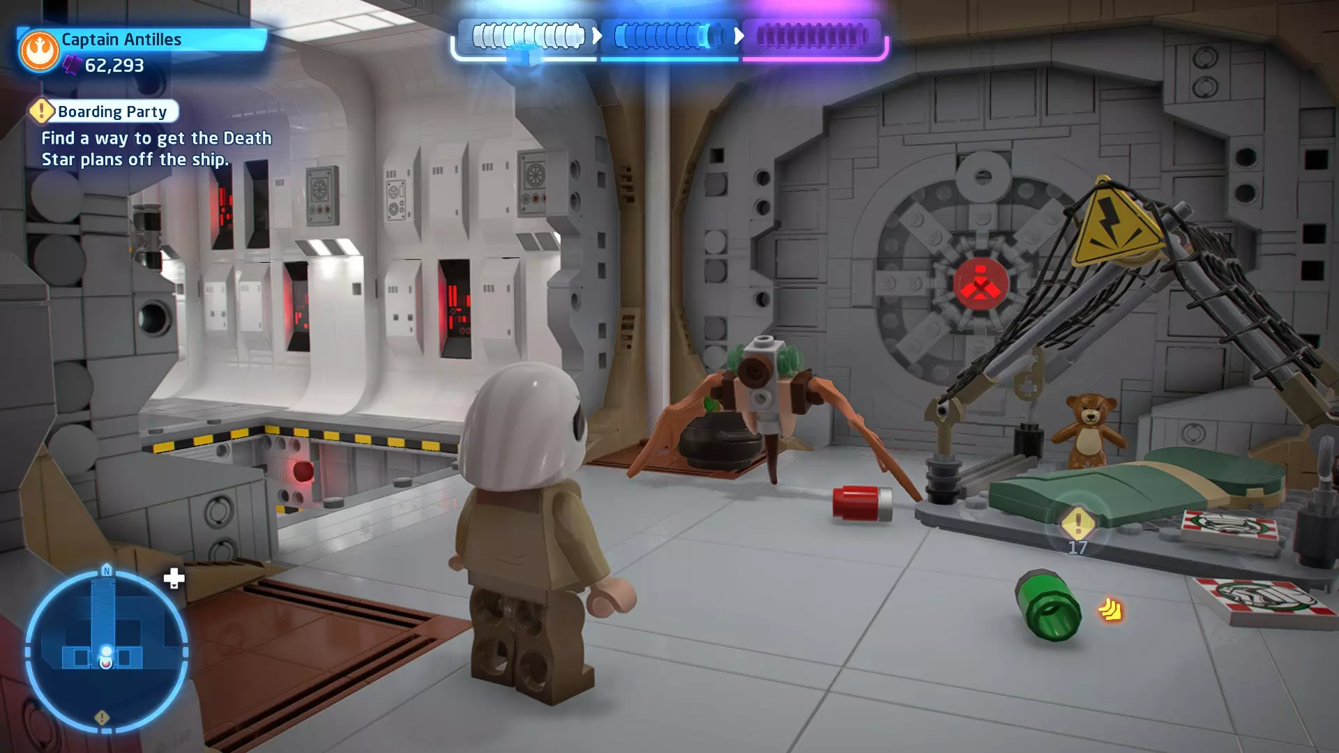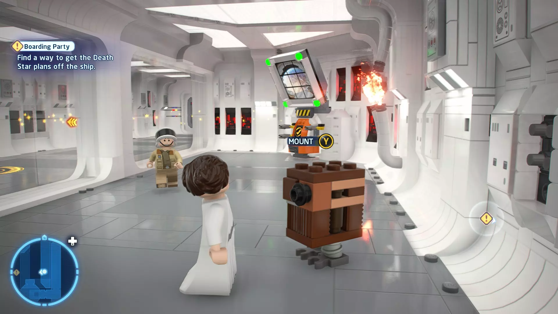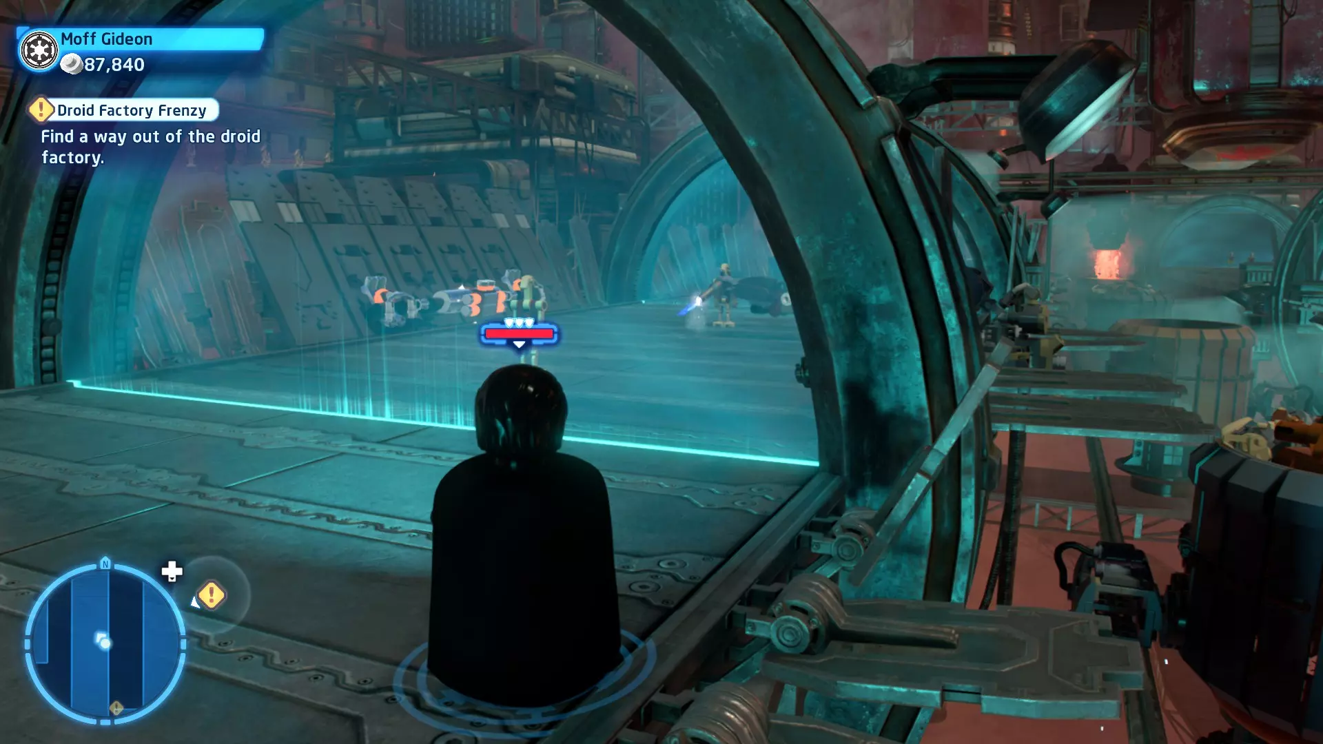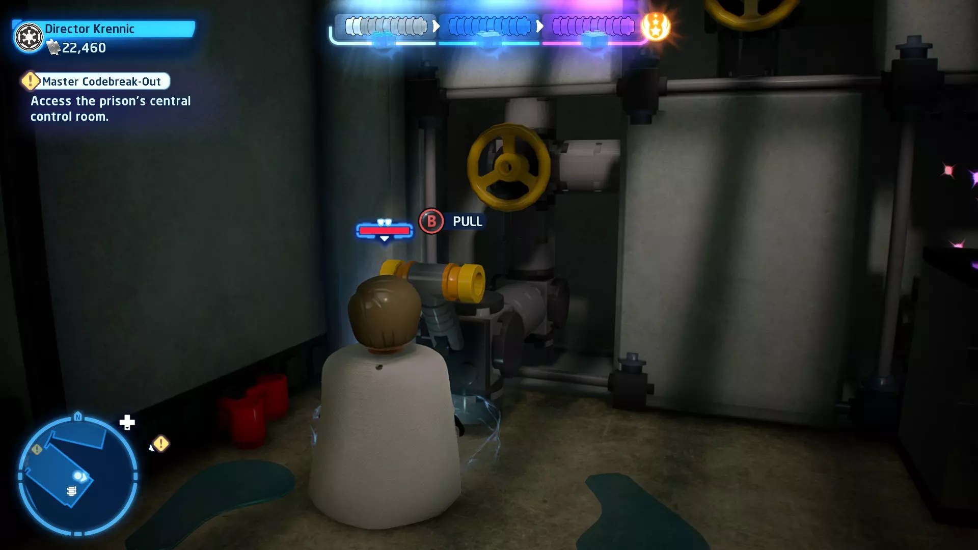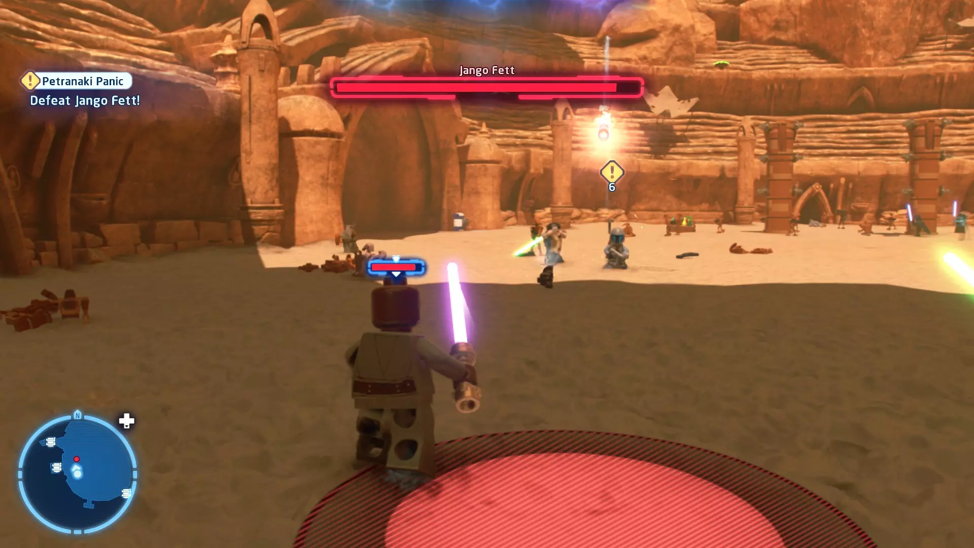 要完成此挑战,你需要在不被任何第一秩序部队发现的情况下抵达巴布的工坊。这意味着不能与任何第一秩序士兵战斗,不能向任何UA-TT开火,也不能进入黄色圆圈(代表士兵的视野范围)。小心穿过关卡,尽可能避免战斗。确保只有在波提示时,才能消灭第一道门后的士兵,否则他们会发现你。击败基吉米恶棍后,让出现的第一秩序巡逻队从你身边走过。到达最终庭院后,使用【潜行】或【清理庭院】方法(参见故事模式),在不被发现的情况下抵达巴布的工坊。如果你确实对此感到困难,你可以始终在自由游玩模式中进入该关卡,并将你的整个小队设置为反派或黑暗面角色,这样你就能直接从敌人身边走过。 挑战2 - 新指令 详情:在不触发警报的情况下,和平清理主庭院的冲锋队员。