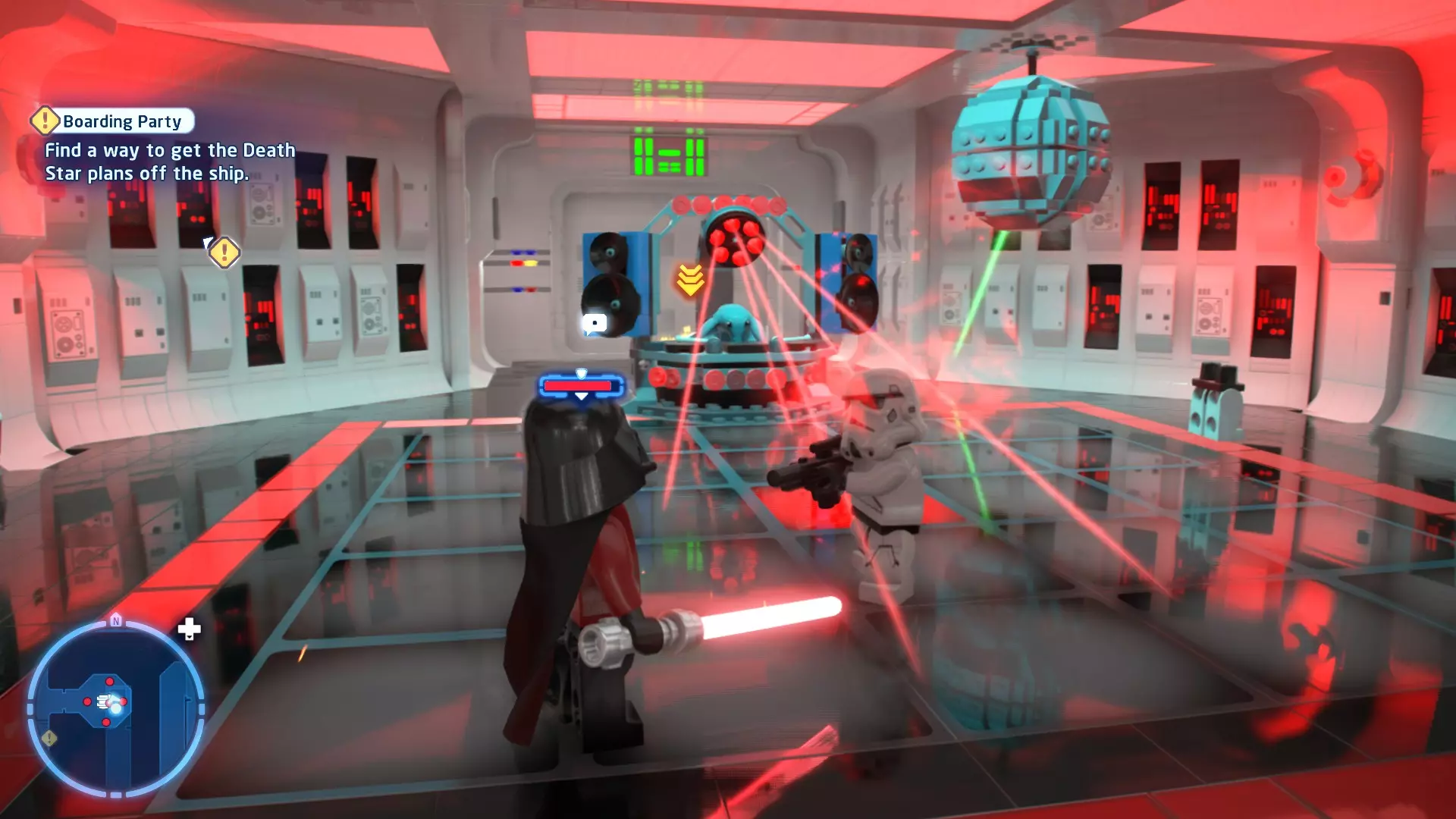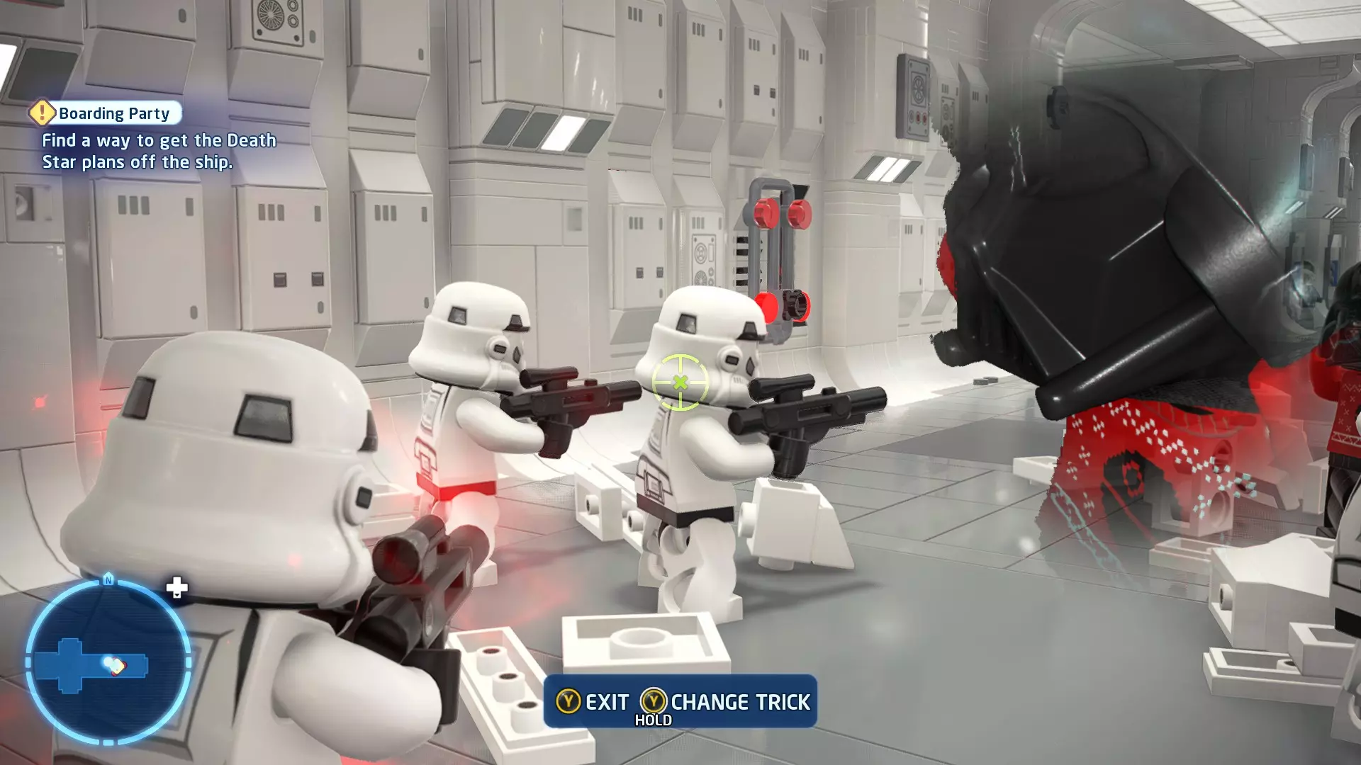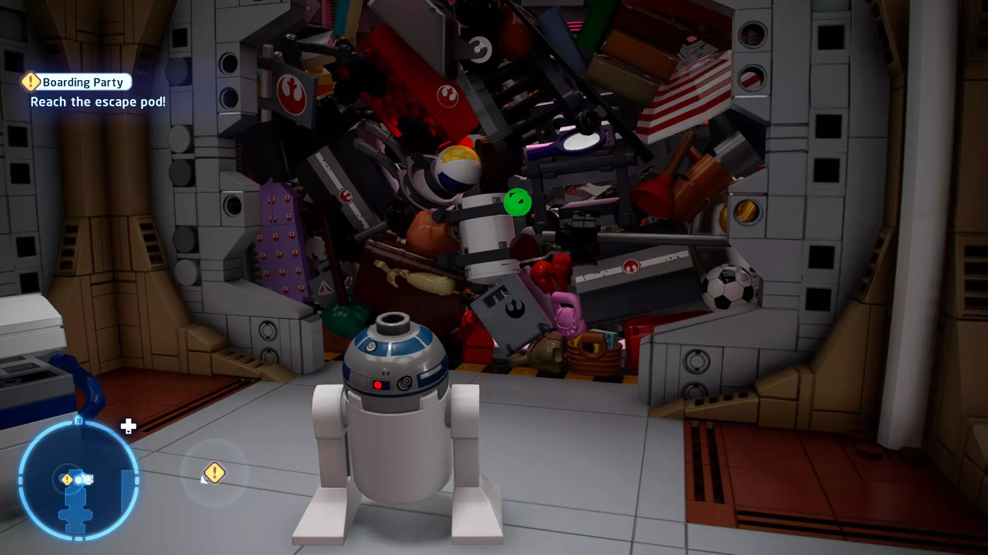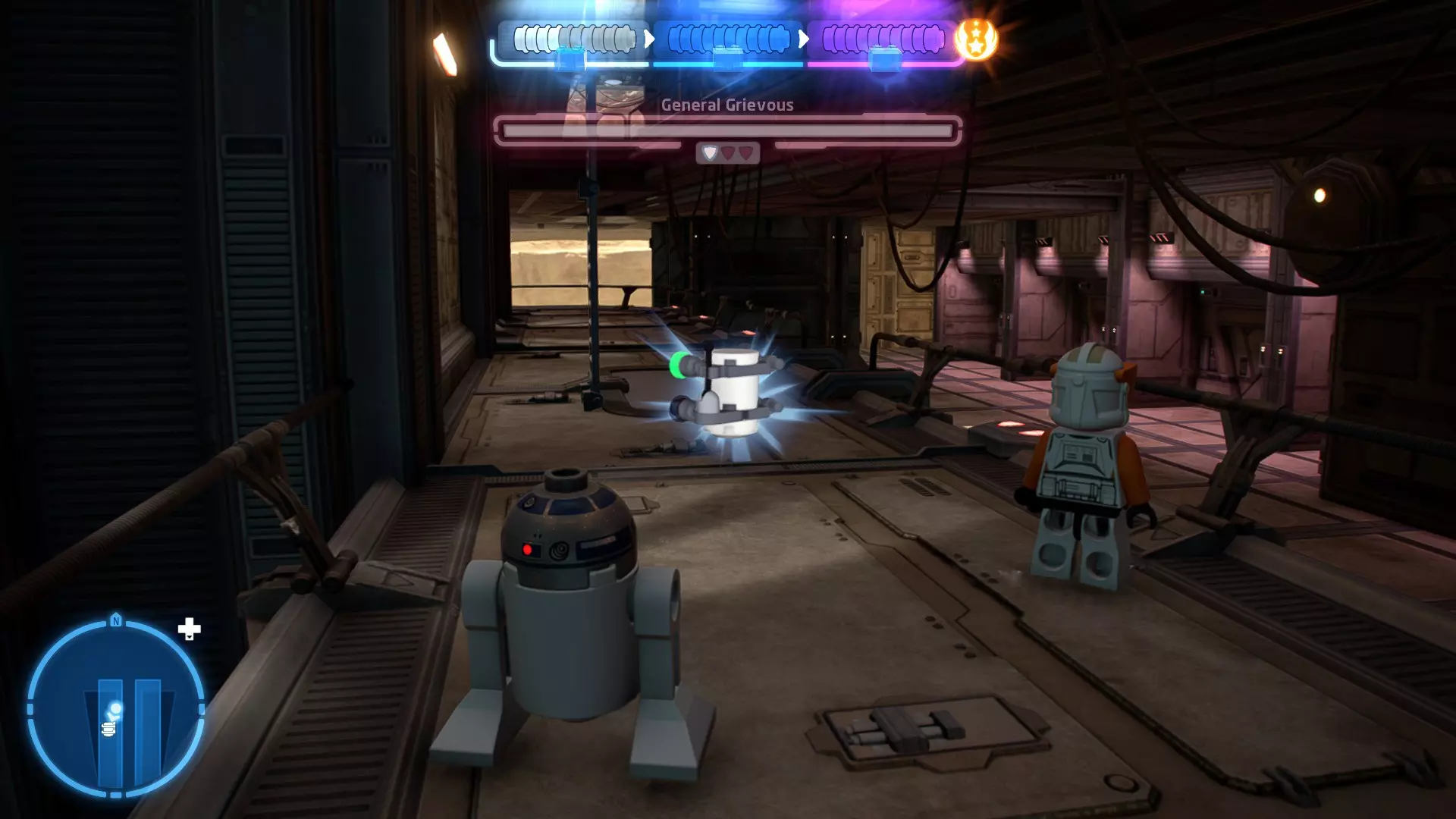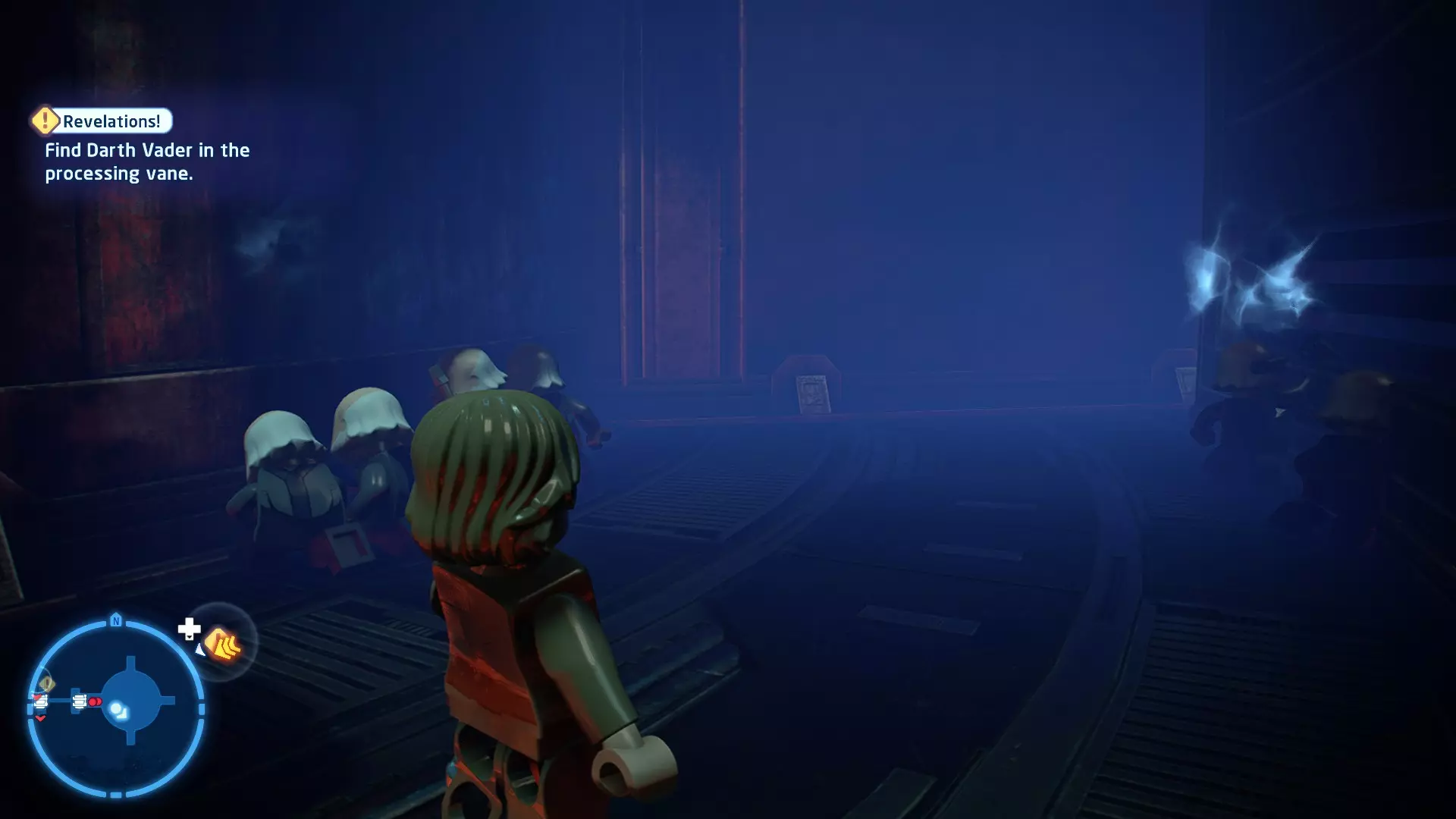 要完成此挑战,你需要在不被任何第一秩序部队发现的情况下抵达巴布的工坊。这意味着不能与任何第一秩序士兵战斗,不能向任何UA-TT开火,也不能进入黄色圆圈(代表士兵的视野范围)。小心穿过关卡,尽可能避免战斗。确保只有在波提示时,才能消灭第一道门后的士兵,否则他们会发现你。击败基吉米恶棍后,让出现的第一秩序巡逻队从你身边走过。到达最终庭院后,使用【潜行】或【清理庭院】方法(参见故事模式),在不被发现的情况下抵达巴布的工坊。如果你确实对此感到困难,你可以始终在自由游玩模式中进入该关卡,并将你的整个小队设置为反派或黑暗面角色,这样你就能直接从敌人身边走过。 挑战2 - 新指令 详情:在不触发警报的情况下,和平清理主庭院的冲锋队员。