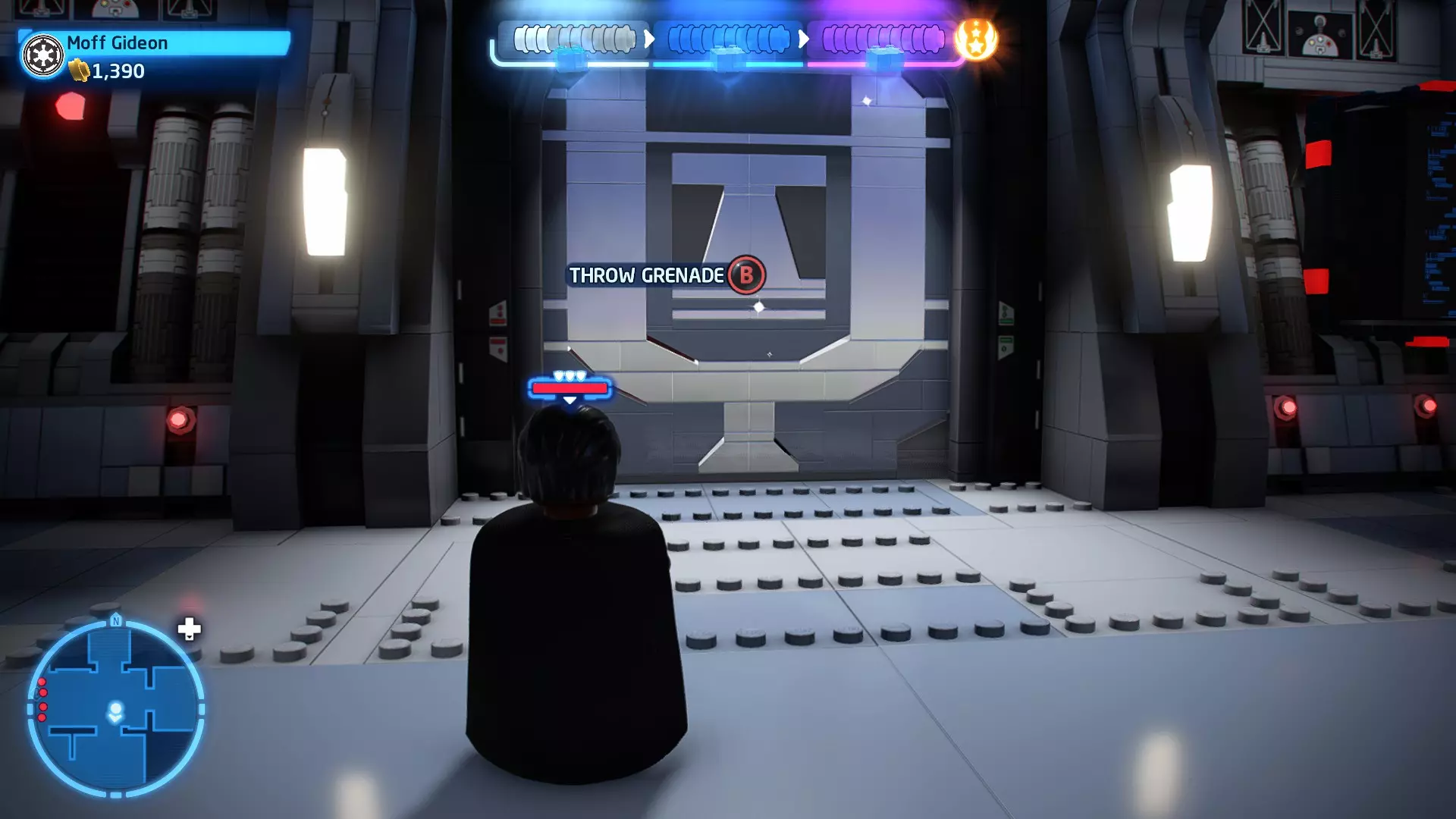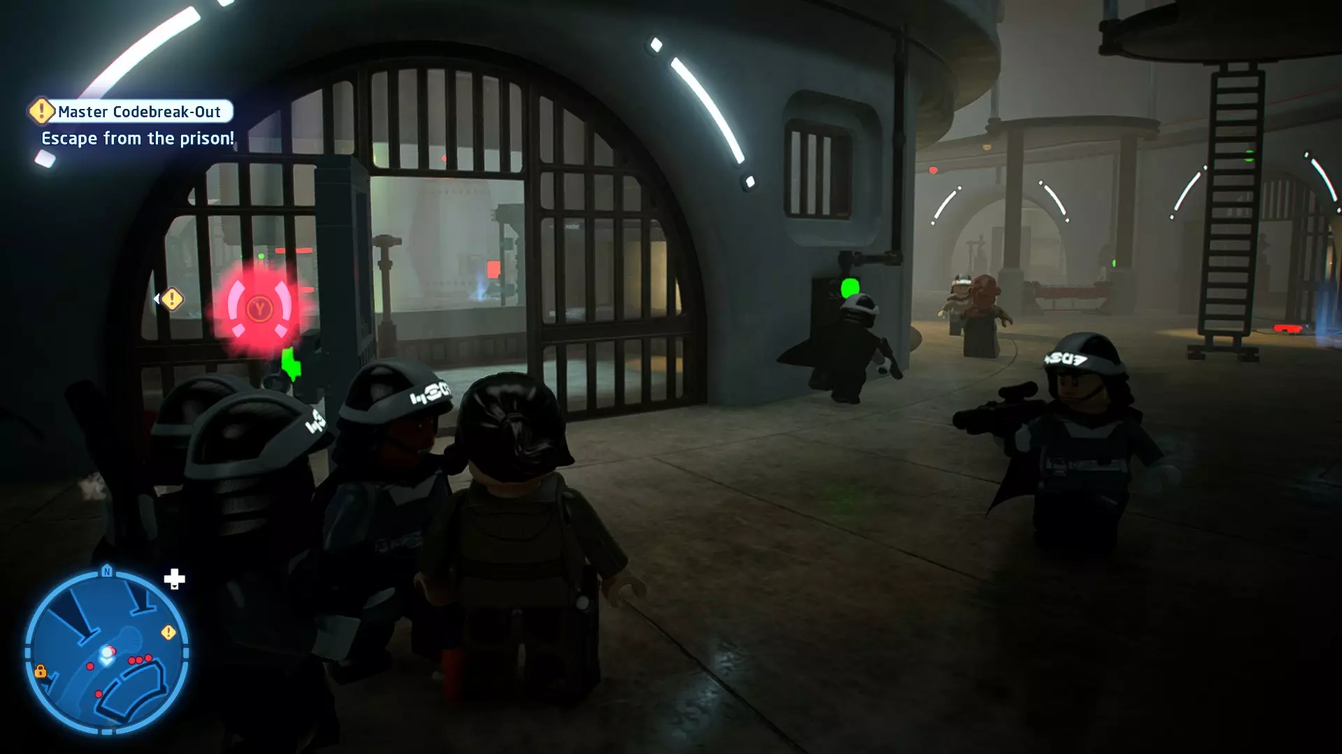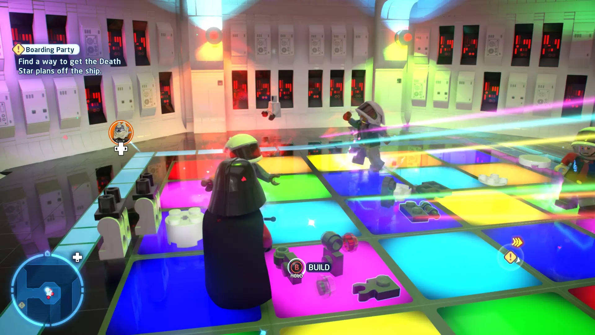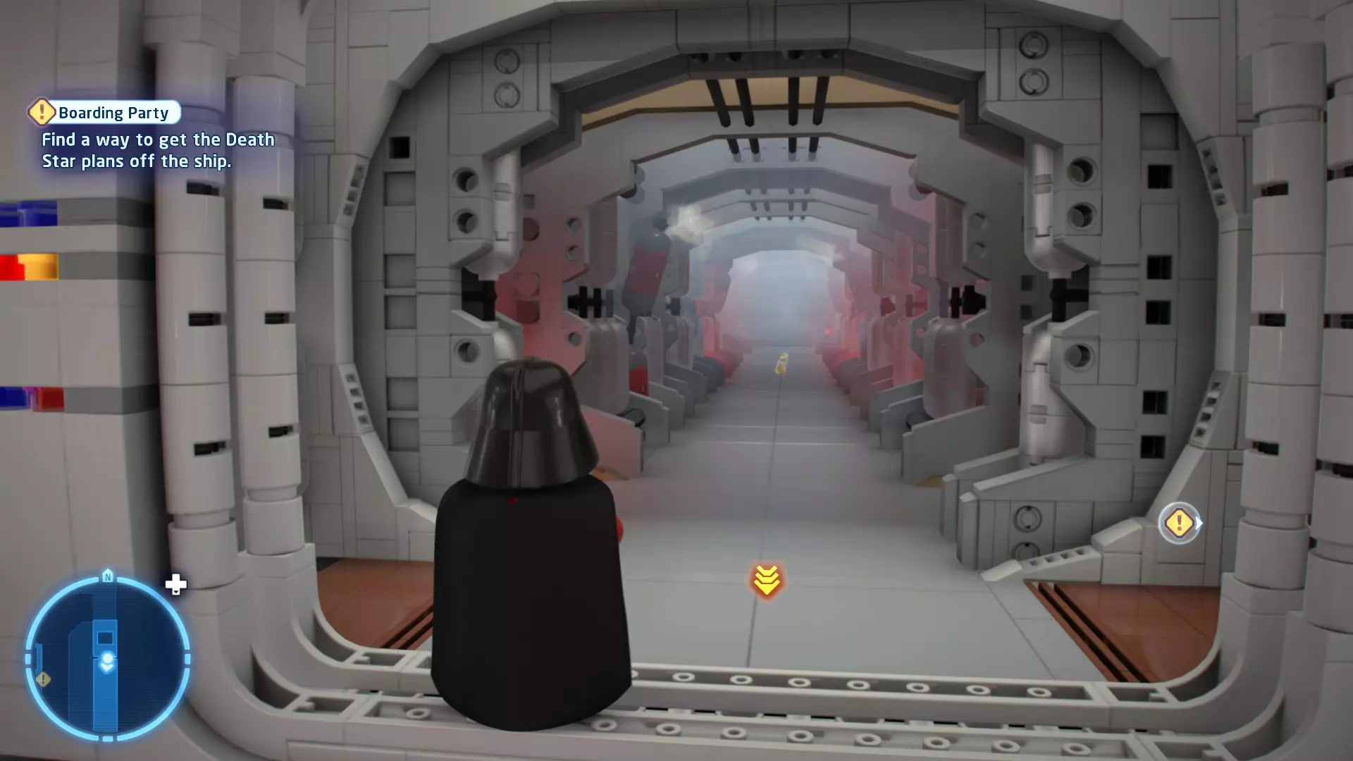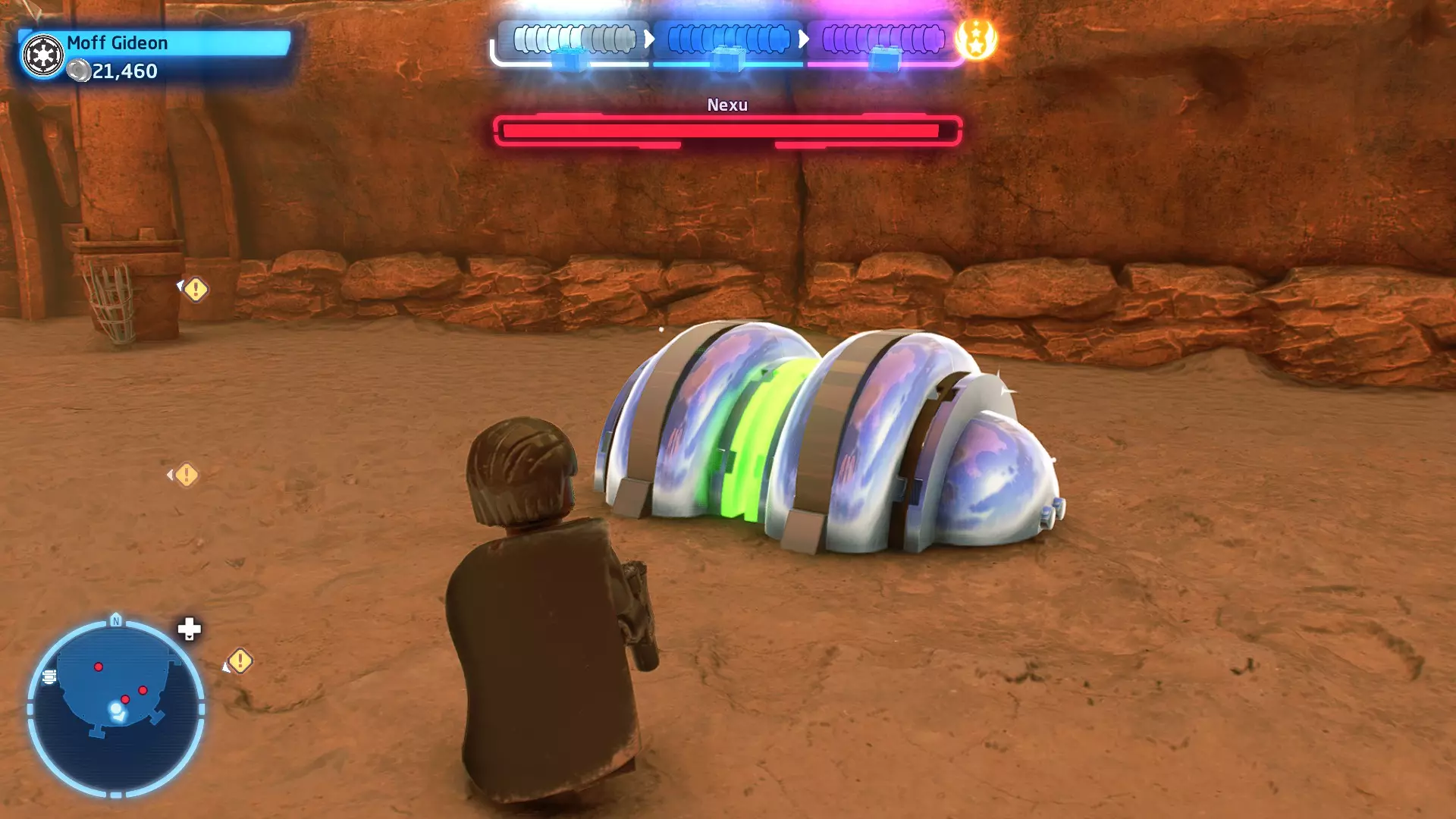 要完成此挑战,你需要在不被任何第一秩序部队发现的情况下抵达巴布的工坊。这意味着不能与任何第一秩序士兵战斗,不能向任何UA-TT开火,也不能进入黄色圆圈(代表士兵的视野范围)。小心穿过关卡,尽可能避免战斗。确保只有在波提示时,才能消灭第一道门后的士兵,否则他们会发现你。击败基吉米恶棍后,让出现的第一秩序巡逻队从你身边走过。到达最终庭院后,使用【潜行】或【清理庭院】方法(参见故事模式),在不被发现的情况下抵达巴布的工坊。如果你确实对此感到困难,你可以始终在自由游玩模式中进入该关卡,并将你的整个小队设置为反派或黑暗面角色,这样你就能直接从敌人身边走过。 挑战2 - 新指令 详情:在不触发警报的情况下,和平清理主庭院的冲锋队员。