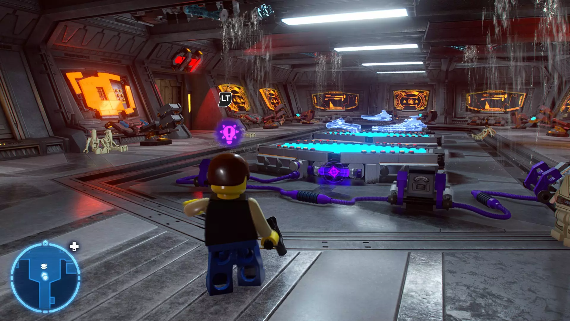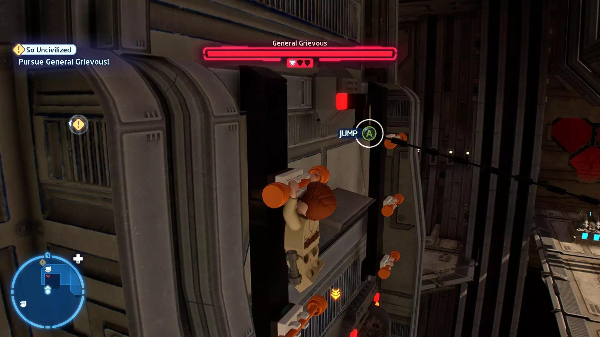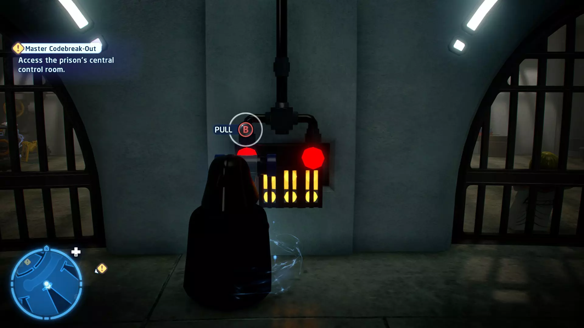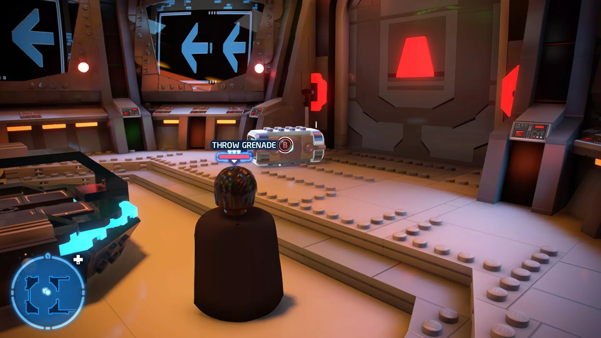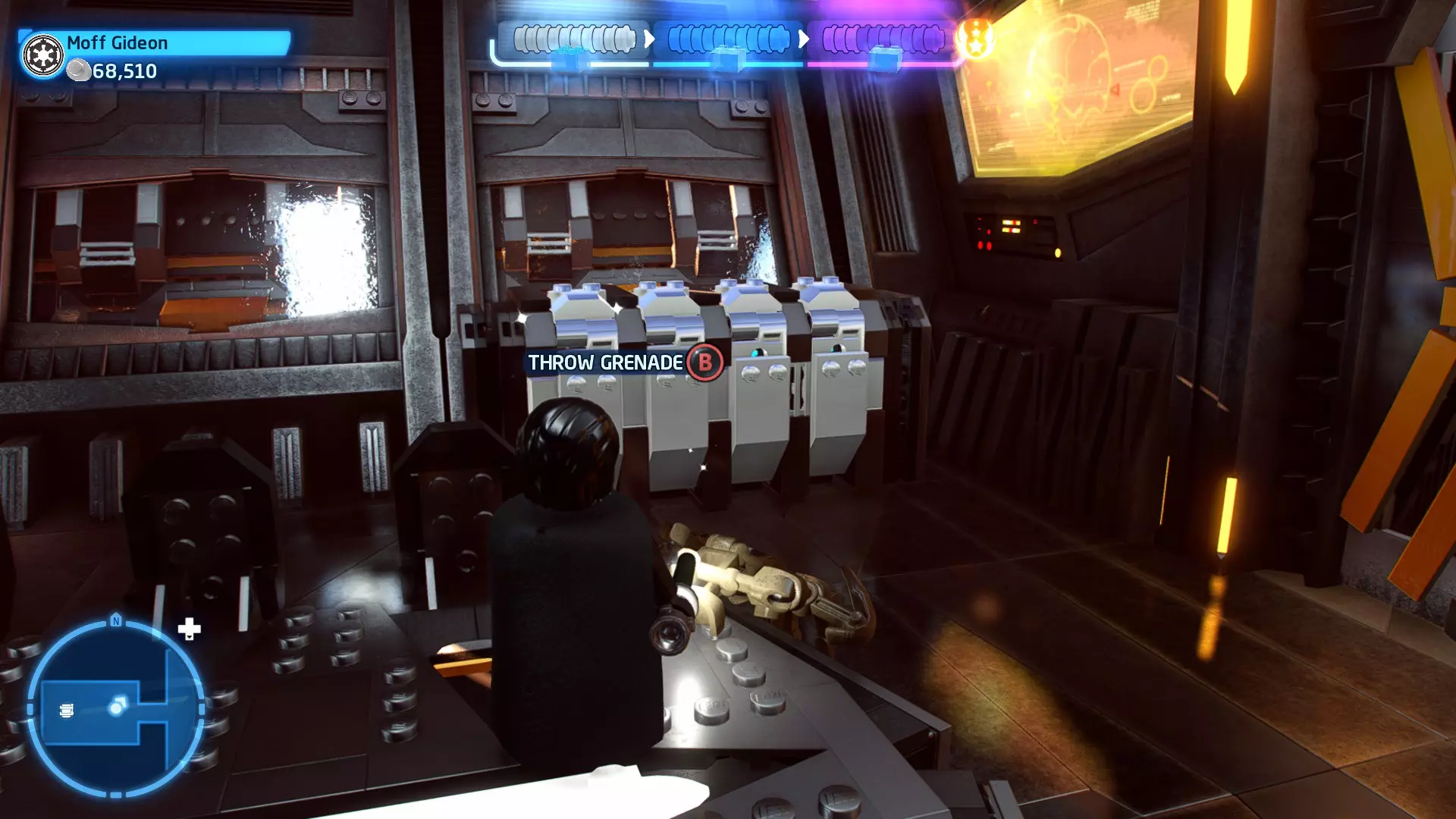 要完成此挑战,你需要在不被任何第一秩序部队发现的情况下抵达巴布的工坊。这意味着不能与任何第一秩序士兵战斗,不能向任何UA-TT开火,也不能进入黄色圆圈(代表士兵的视野范围)。小心穿过关卡,尽可能避免战斗。确保只有在波提示时,才能消灭第一道门后的士兵,否则他们会发现你。击败基吉米恶棍后,让出现的第一秩序巡逻队从你身边走过。到达最终庭院后,使用【潜行】或【清理庭院】方法(参见故事模式),在不被发现的情况下抵达巴布的工坊。如果你确实对此感到困难,你可以始终在自由游玩模式中进入该关卡,并将你的整个小队设置为反派或黑暗面角色,这样你就能直接从敌人身边走过。 挑战2 - 新指令 详情:在不触发警报的情况下,和平清理主庭院的冲锋队员。
