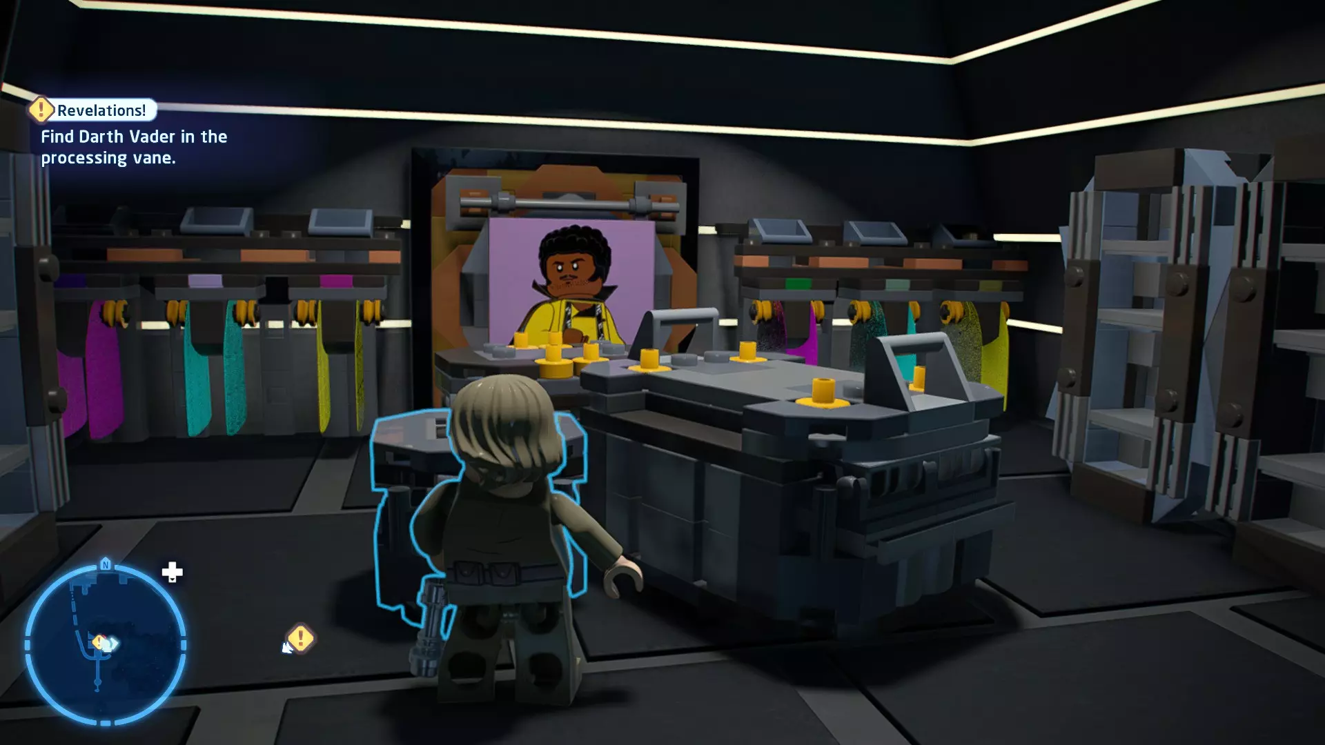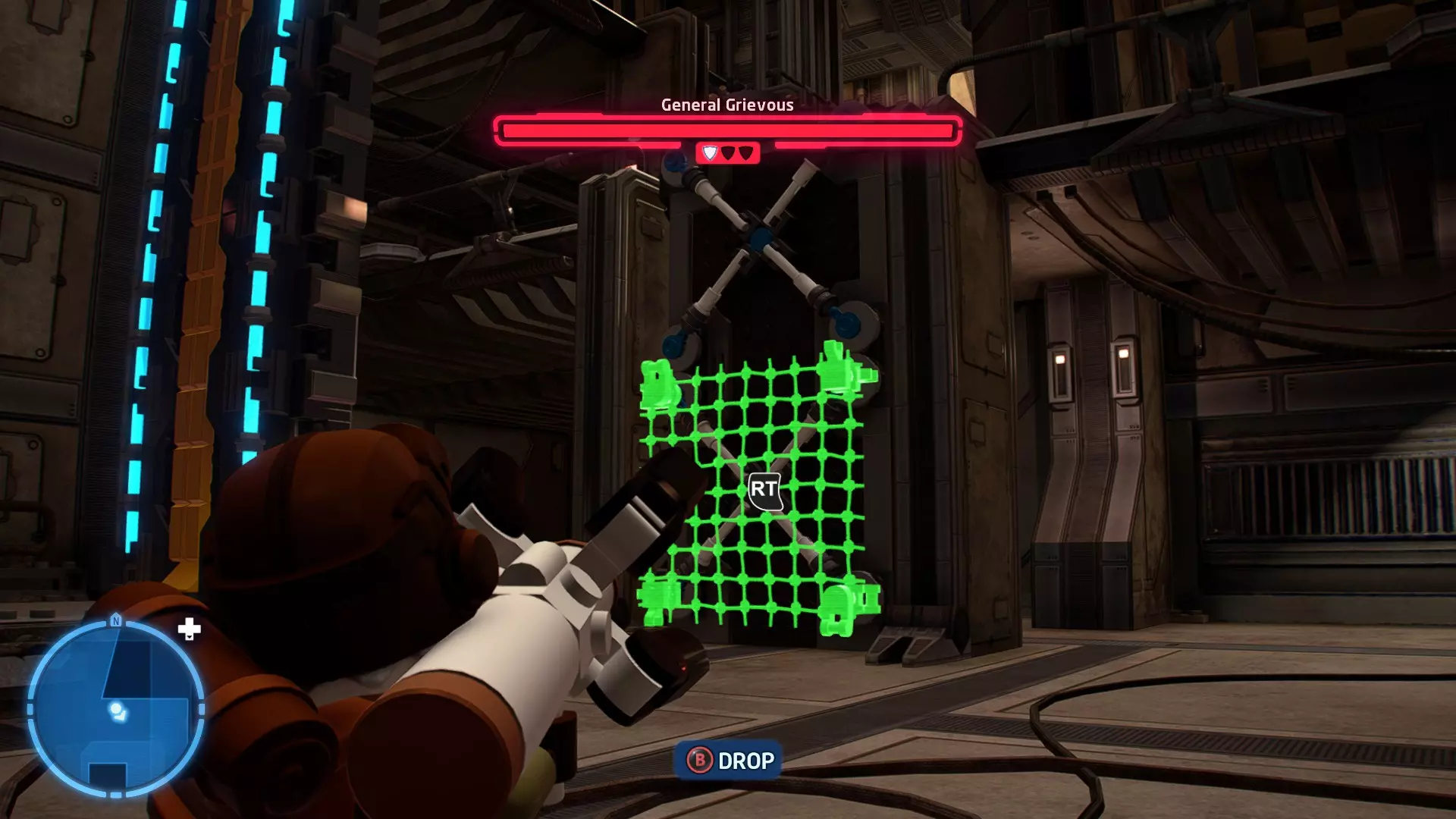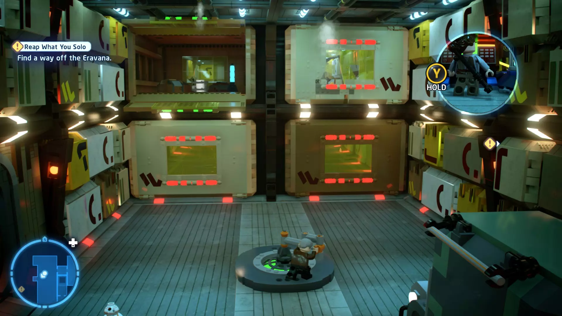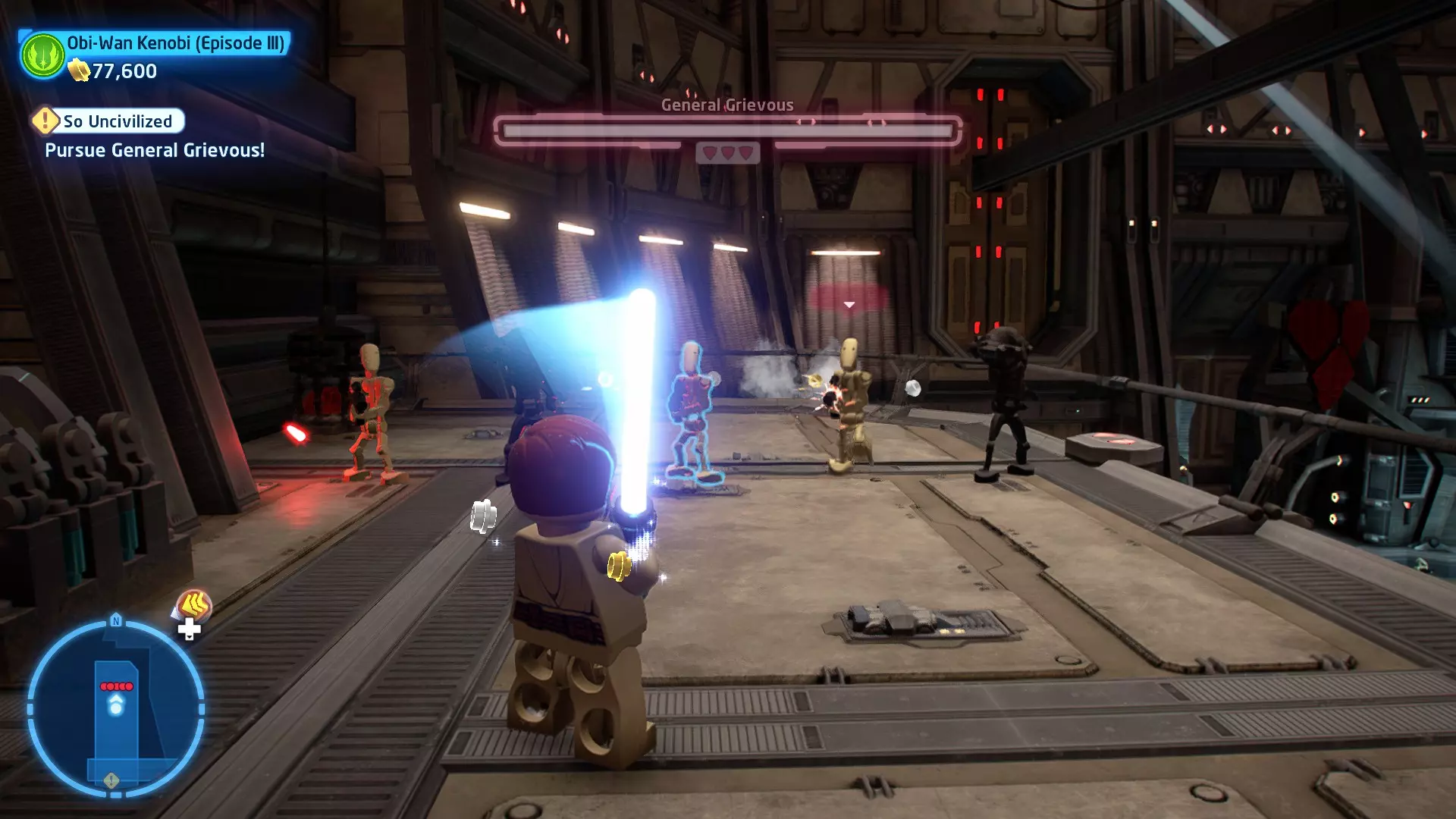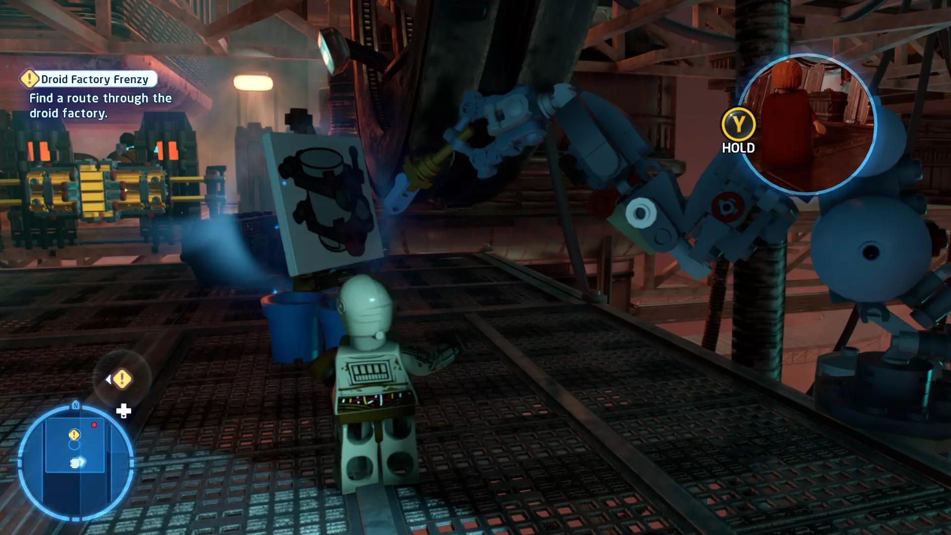 要完成此挑战,你需要在不被任何第一秩序部队发现的情况下抵达巴布的工坊。这意味着不能与任何第一秩序士兵战斗,不能向任何UA-TT开火,也不能进入黄色圆圈(代表士兵的视野范围)。小心穿过关卡,尽可能避免战斗。确保只有在波提示时,才能消灭第一道门后的士兵,否则他们会发现你。击败基吉米恶棍后,让出现的第一秩序巡逻队从你身边走过。到达最终庭院后,使用【潜行】或【清理庭院】方法(参见故事模式),在不被发现的情况下抵达巴布的工坊。如果你确实对此感到困难,你可以始终在自由游玩模式中进入该关卡,并将你的整个小队设置为反派或黑暗面角色,这样你就能直接从敌人身边走过。 挑战2 - 新指令 详情:在不触发警报的情况下,和平清理主庭院的冲锋队员。