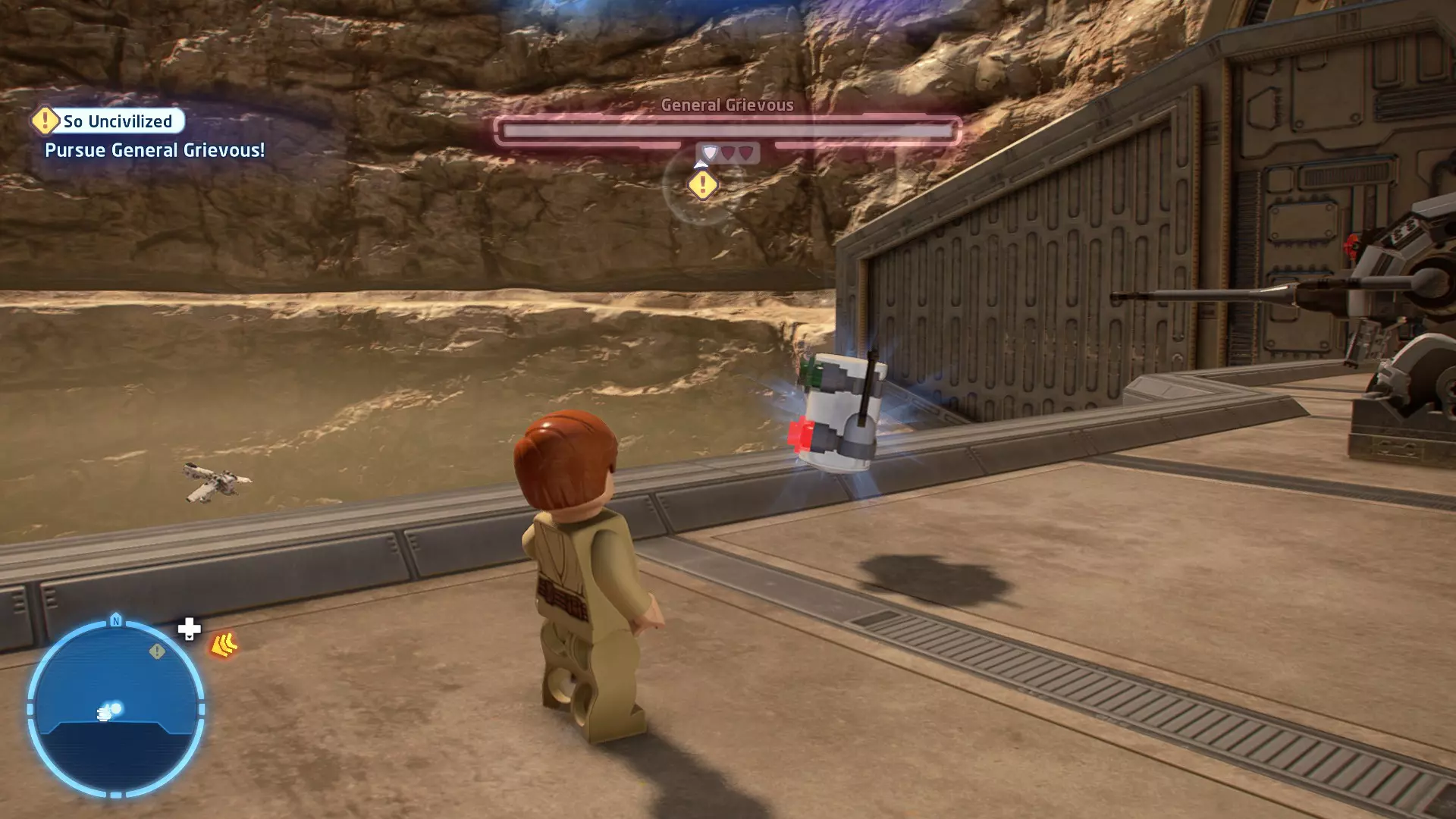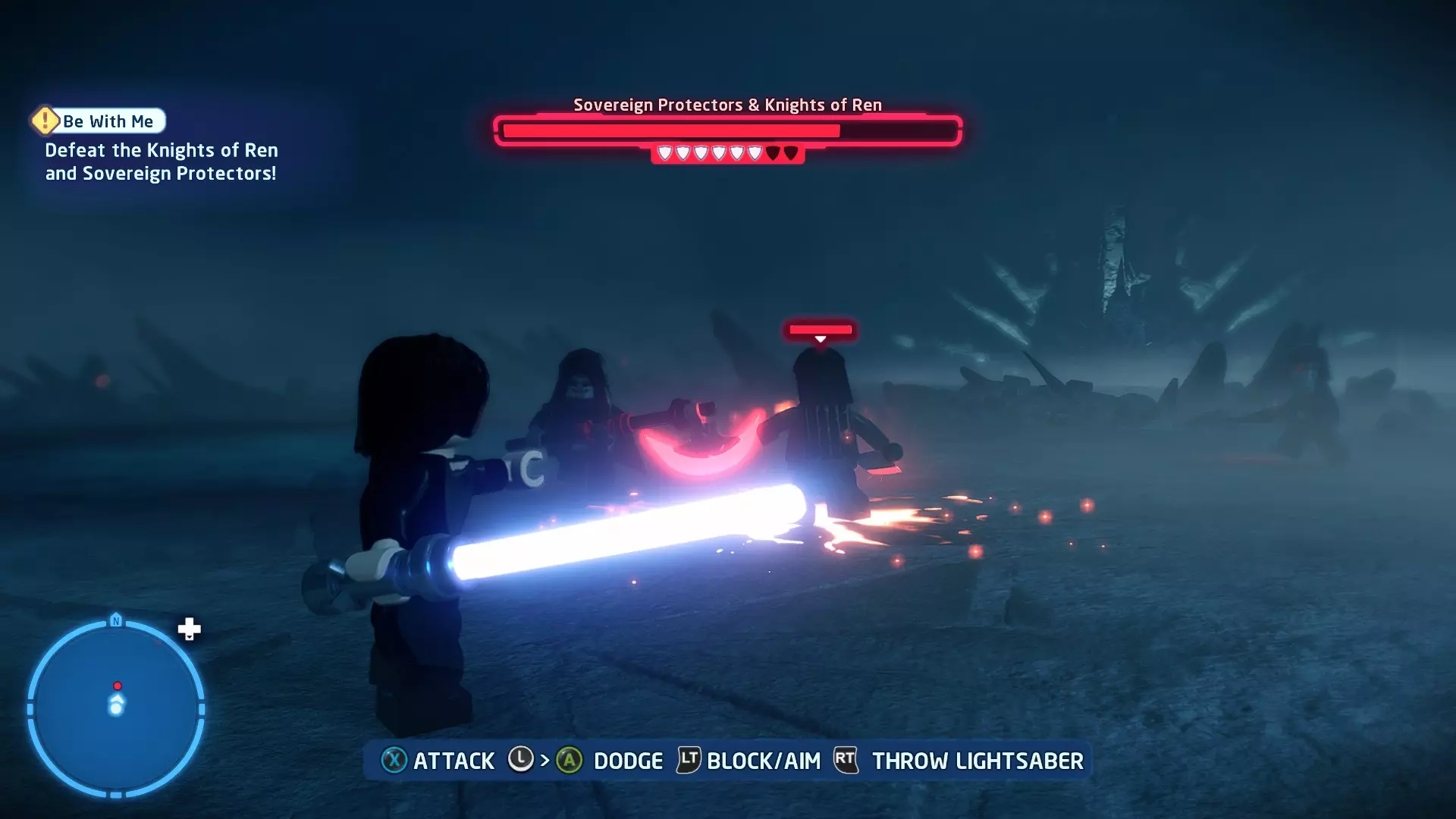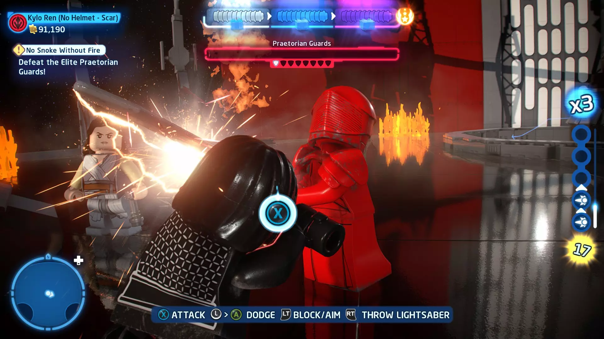 当你骑着奥尔巴克兽(Orbak)冲下歼星舰时,钛匕首战机(TIE Daggers)会对你进行扫射攻击。这些扫射会用红色矩形标记出来。待在这些矩形区域外,以避免受到钛战机的伤害。在不被扫射击中的情况下抵达BB- Boss,即可完成此挑战! 挑战3 - 不屑一顾 详情:以本·索洛的身份击败伦武士团且不死亡