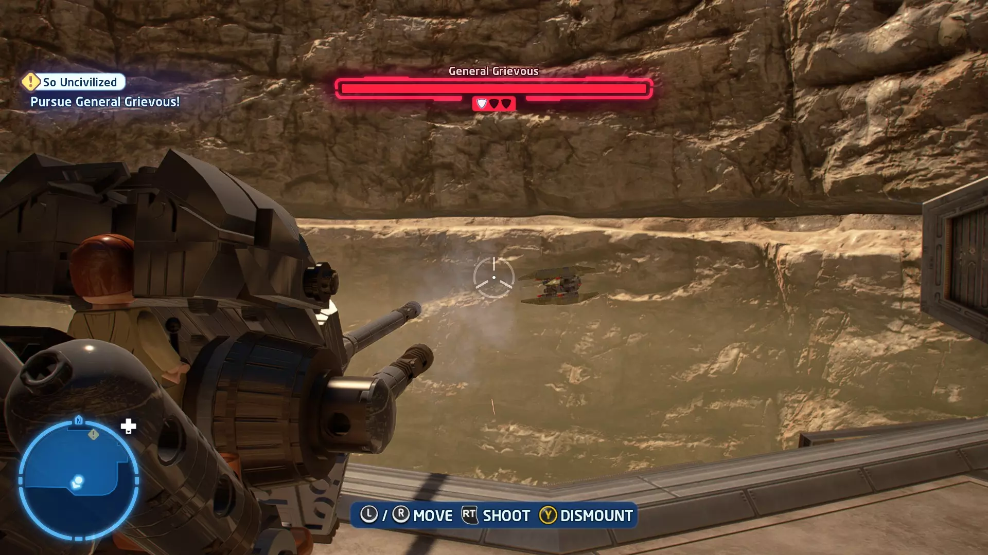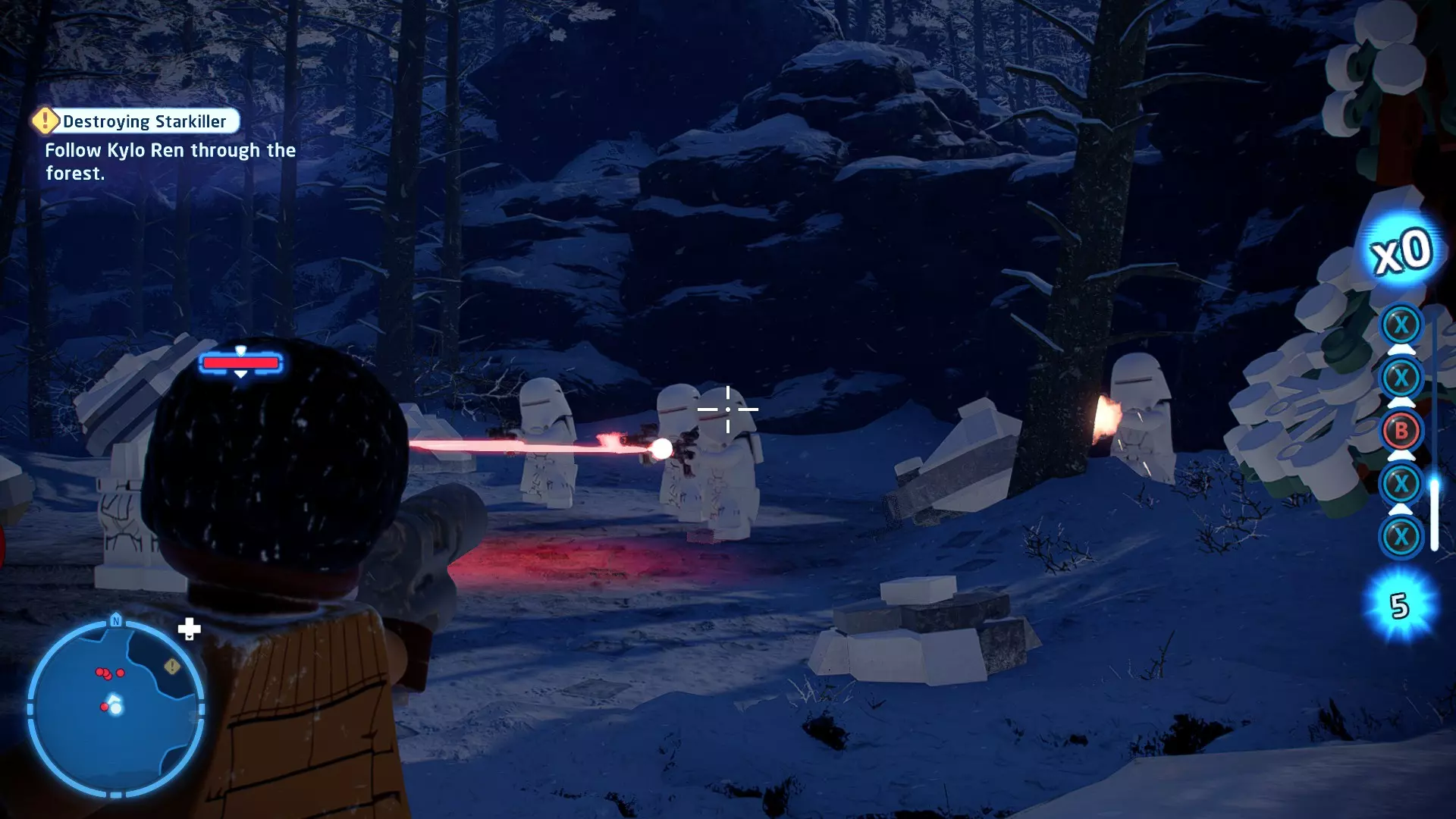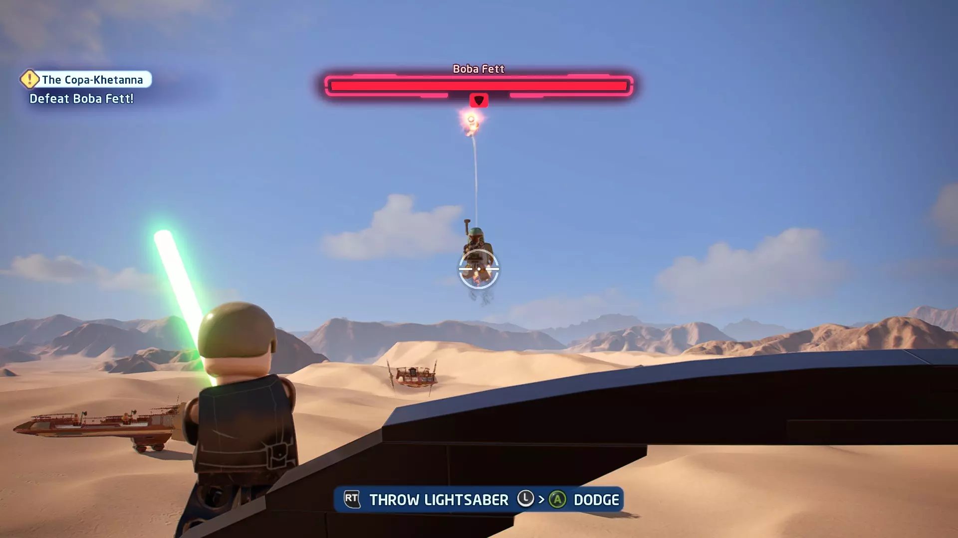 当你骑着奥尔巴克兽(Orbak)冲下歼星舰时,钛匕首战机(TIE Daggers)会对你进行扫射攻击。这些扫射会用红色矩形标记出来。待在这些矩形区域外,以避免受到钛战机的伤害。在不被扫射击中的情况下抵达BB- Boss,即可完成此挑战! 挑战3 - 不屑一顾 详情:以本·索洛的身份击败伦武士团且不死亡