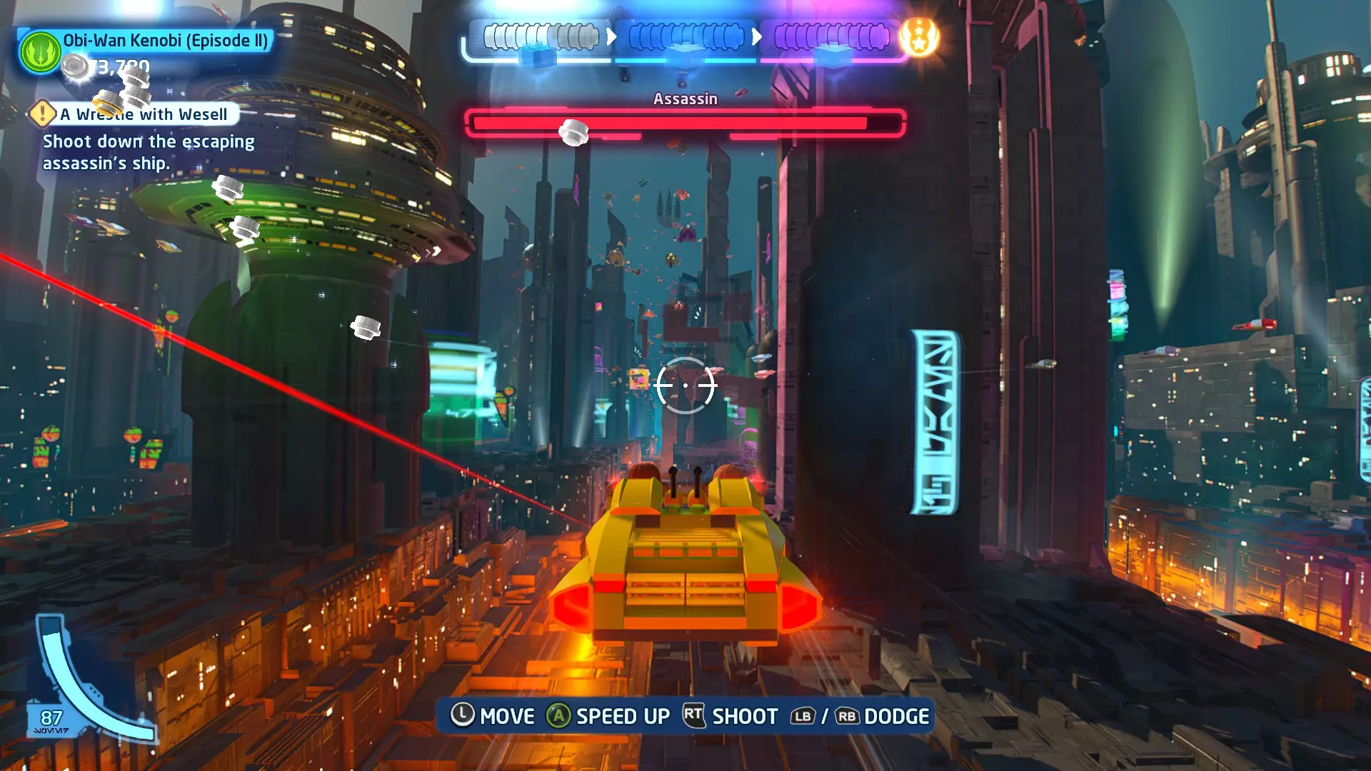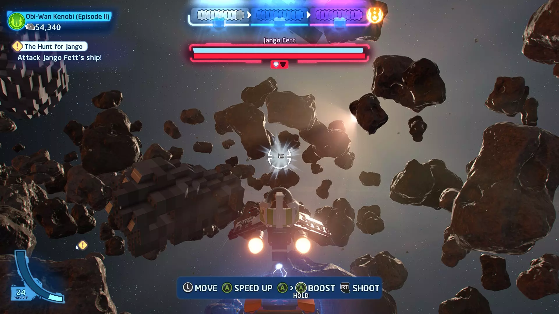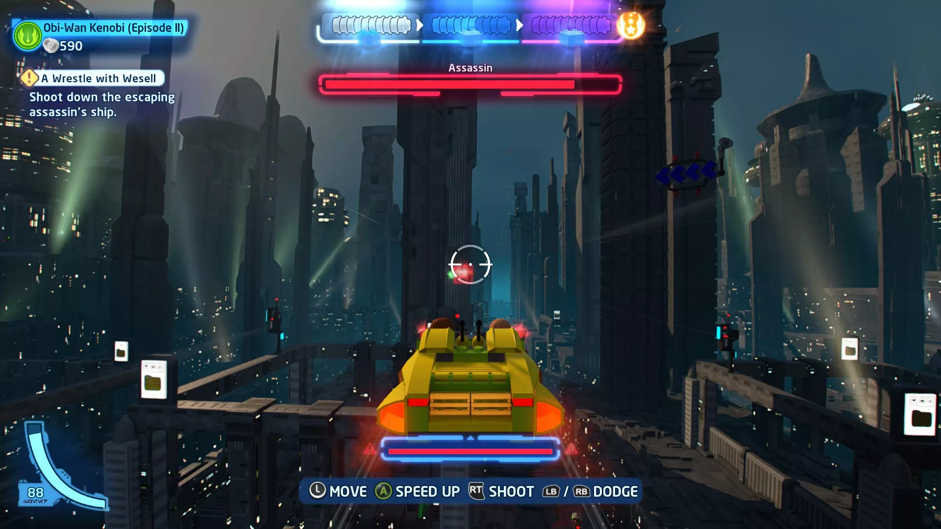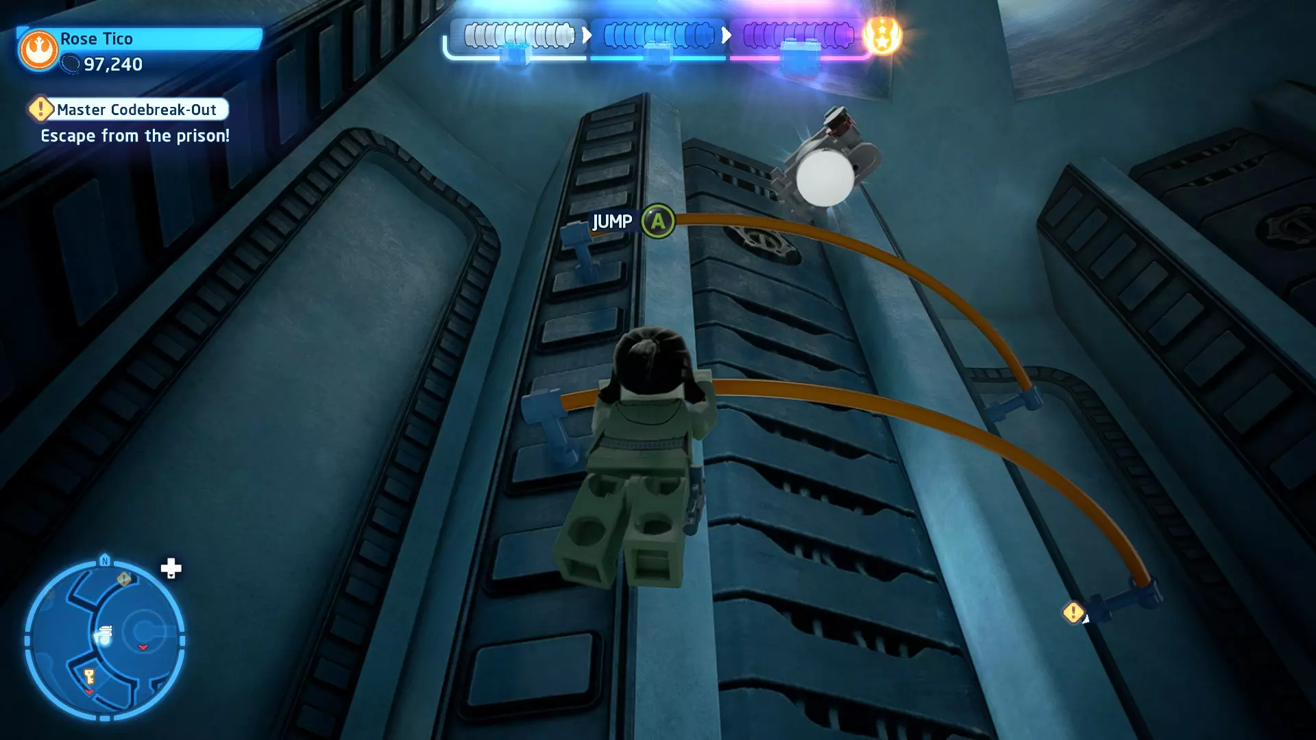 你可以在路径右侧的一些蒸汽喷口上方找到这个迷你套件。射击它即可收集。 微型飞船:抵抗组织Y翼(微型) 一次跳跃 - 关卡挑战 挑战1 - 锁定解除 详情:连续3次避免被锁定