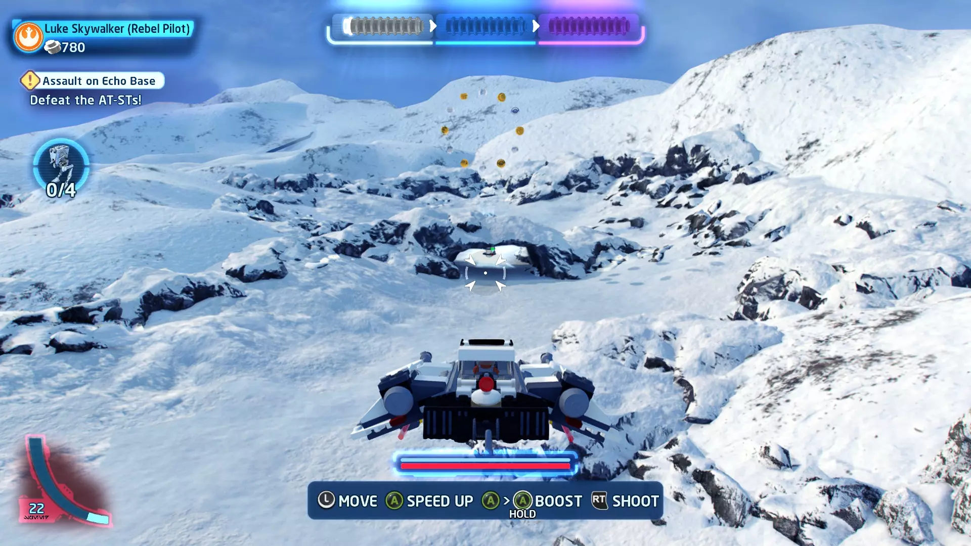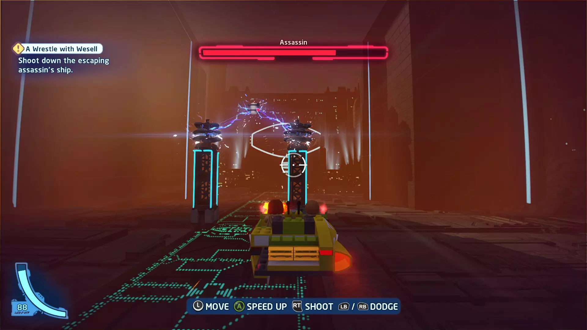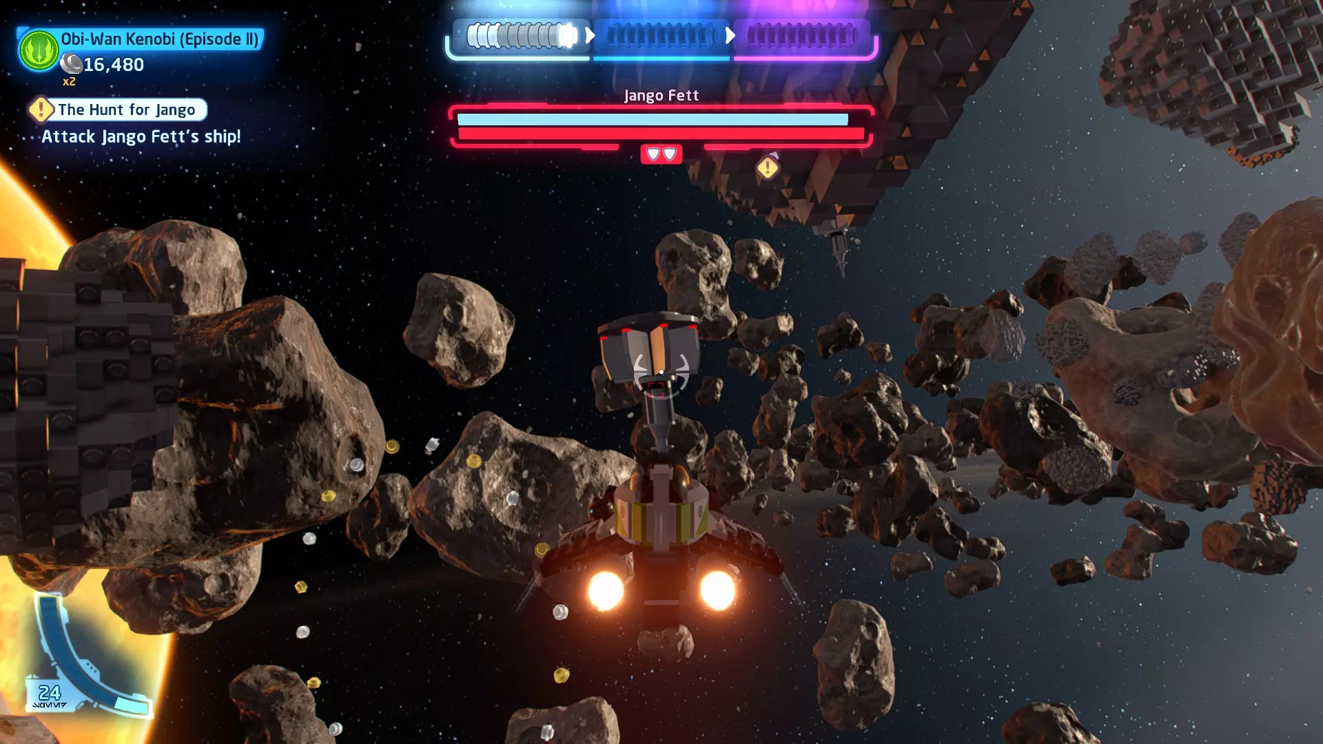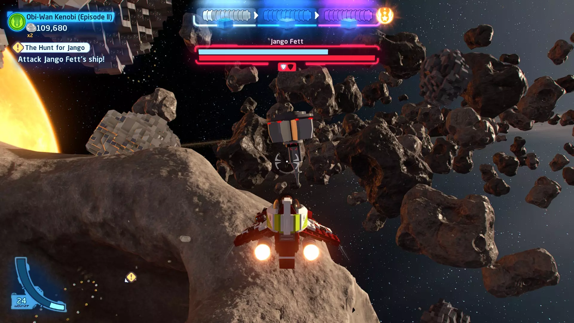 你可以在路径右侧的一些蒸汽喷口上方找到这个迷你套件。射击它即可收集。 微型飞船:抵抗组织Y翼(微型) 一次跳跃 - 关卡挑战 挑战1 - 锁定解除 详情:连续3次避免被锁定