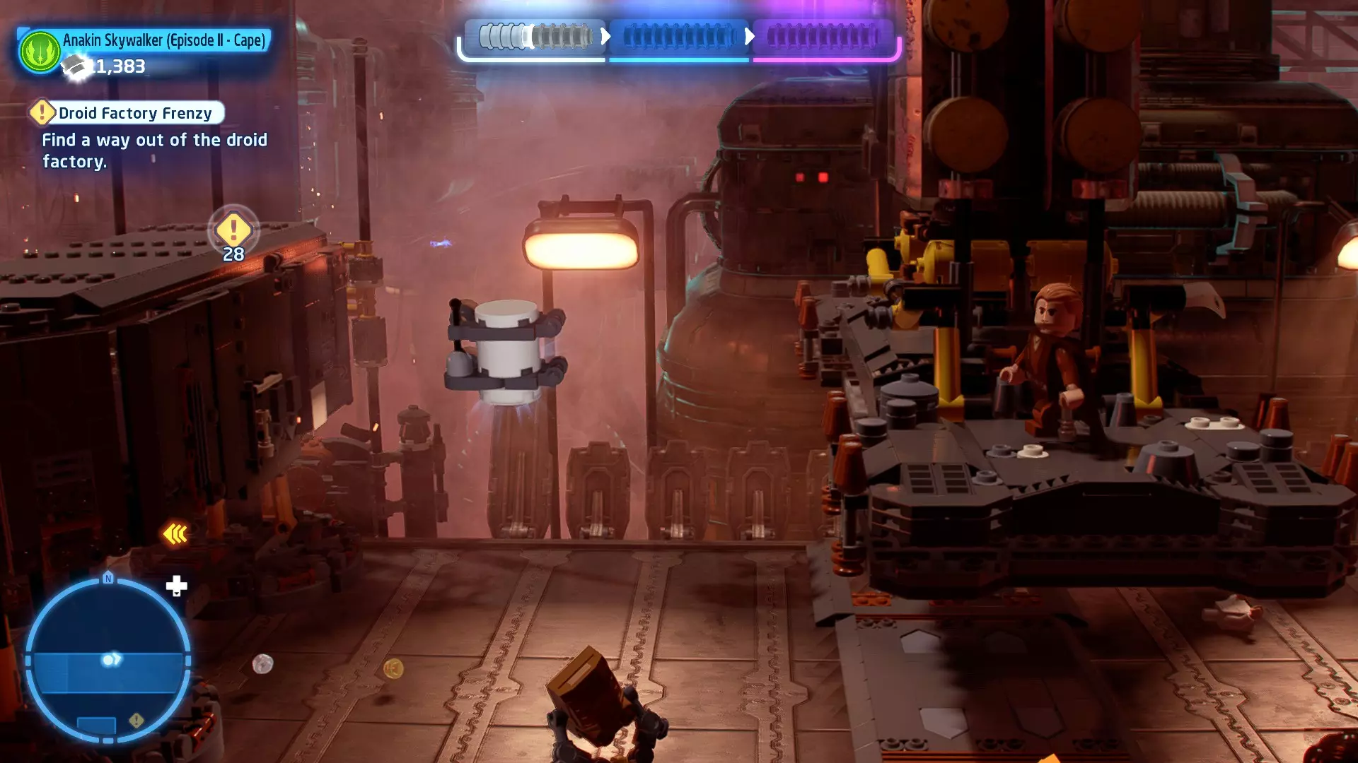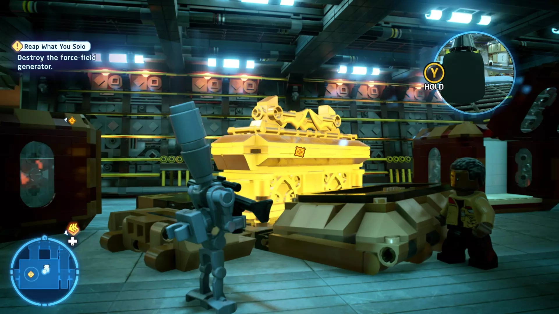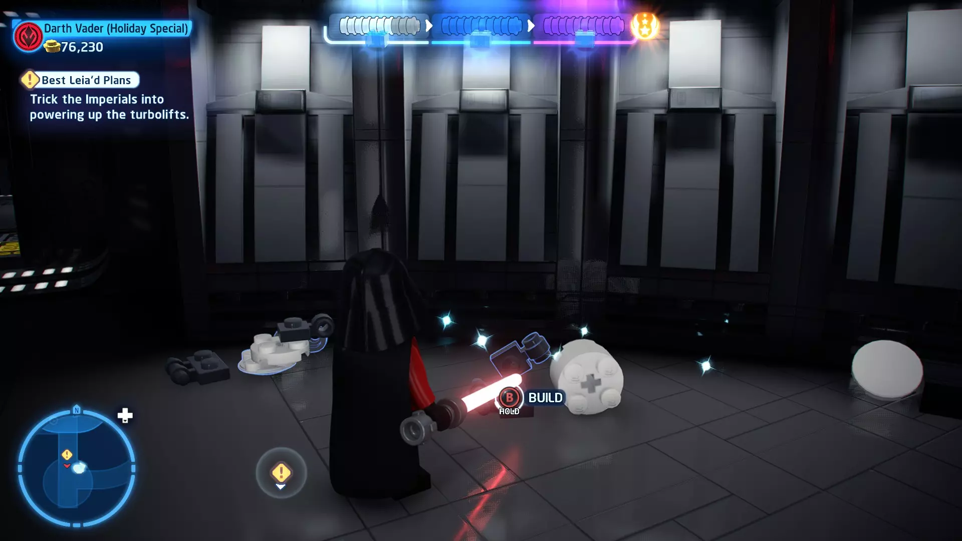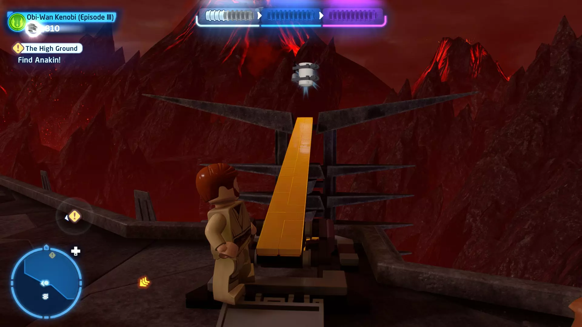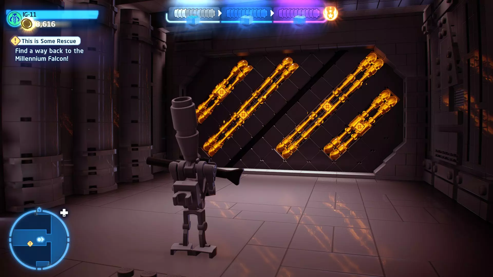 摧毁第一队西斯士兵右侧的黄金发电机,以获得乐高积木。将它们组装成这个迷你套件。 迷你套件3 - 无法束缚我