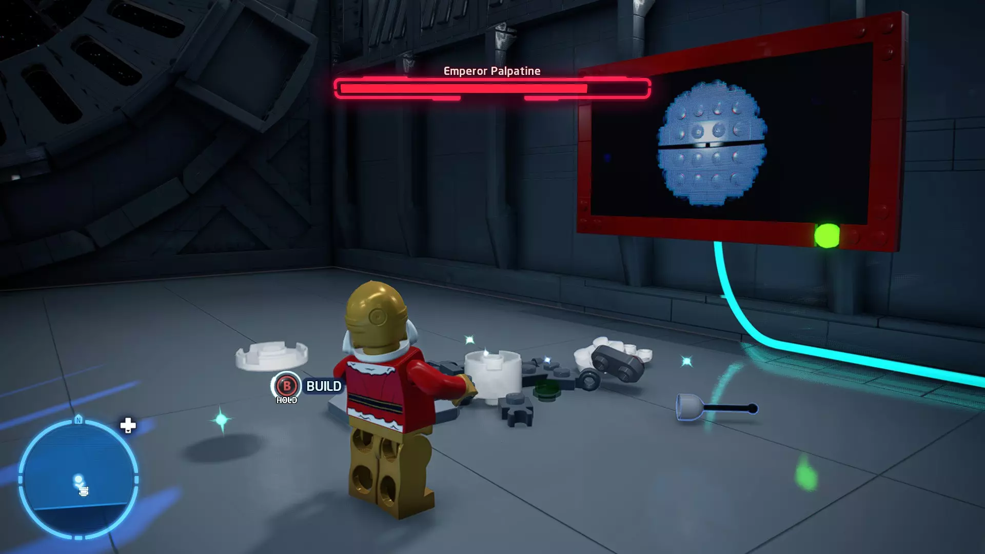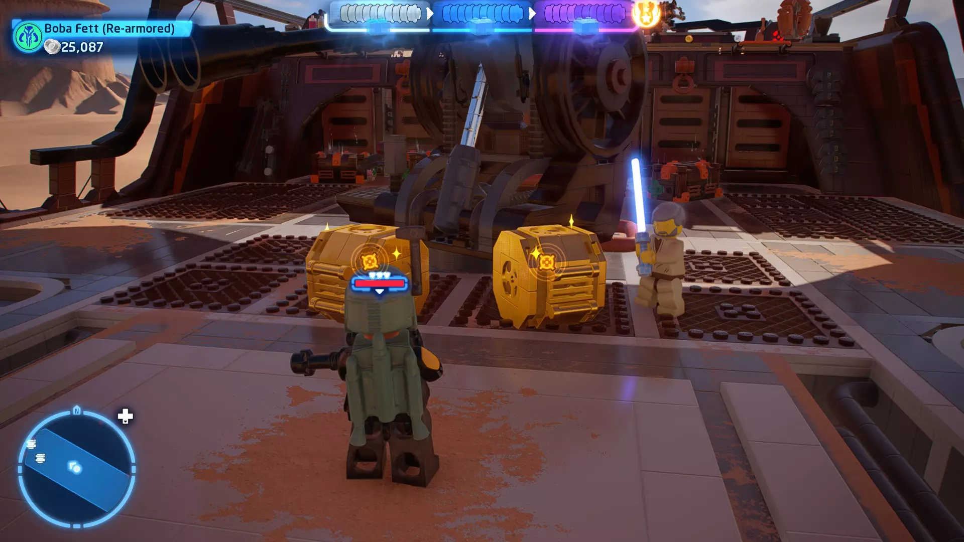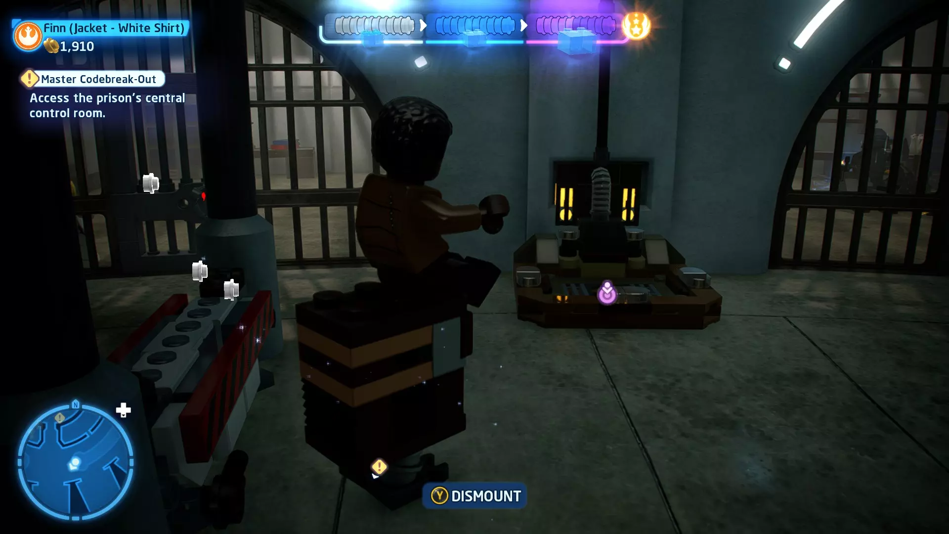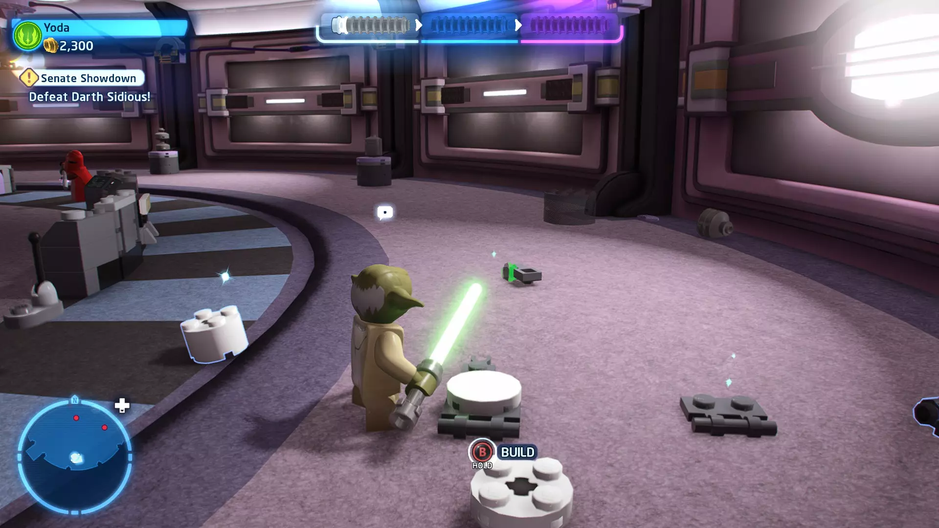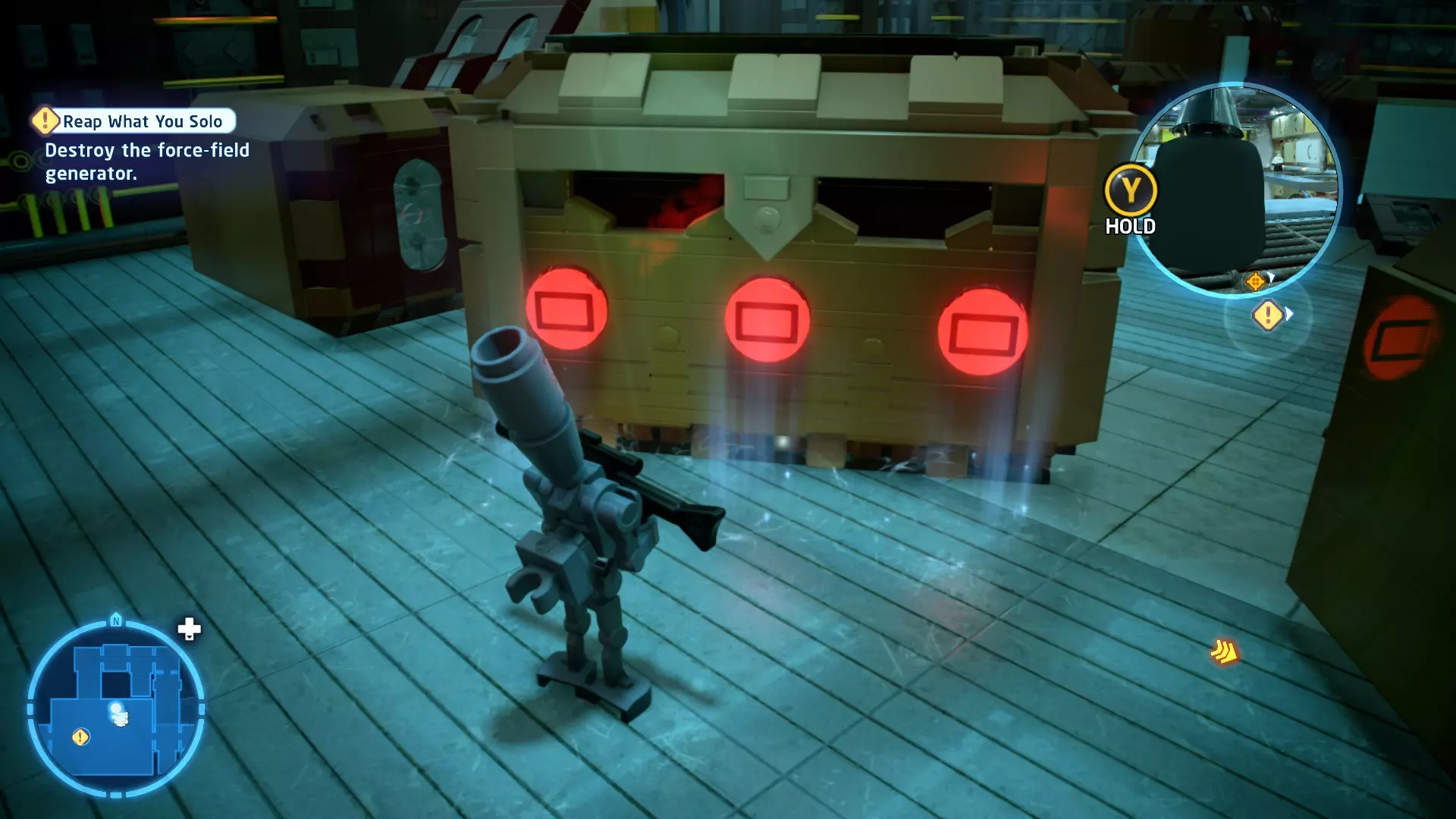 摧毁第一队西斯士兵右侧的黄金发电机,以获得乐高积木。将它们组装成这个迷你套件。 迷你套件3 - 无法束缚我