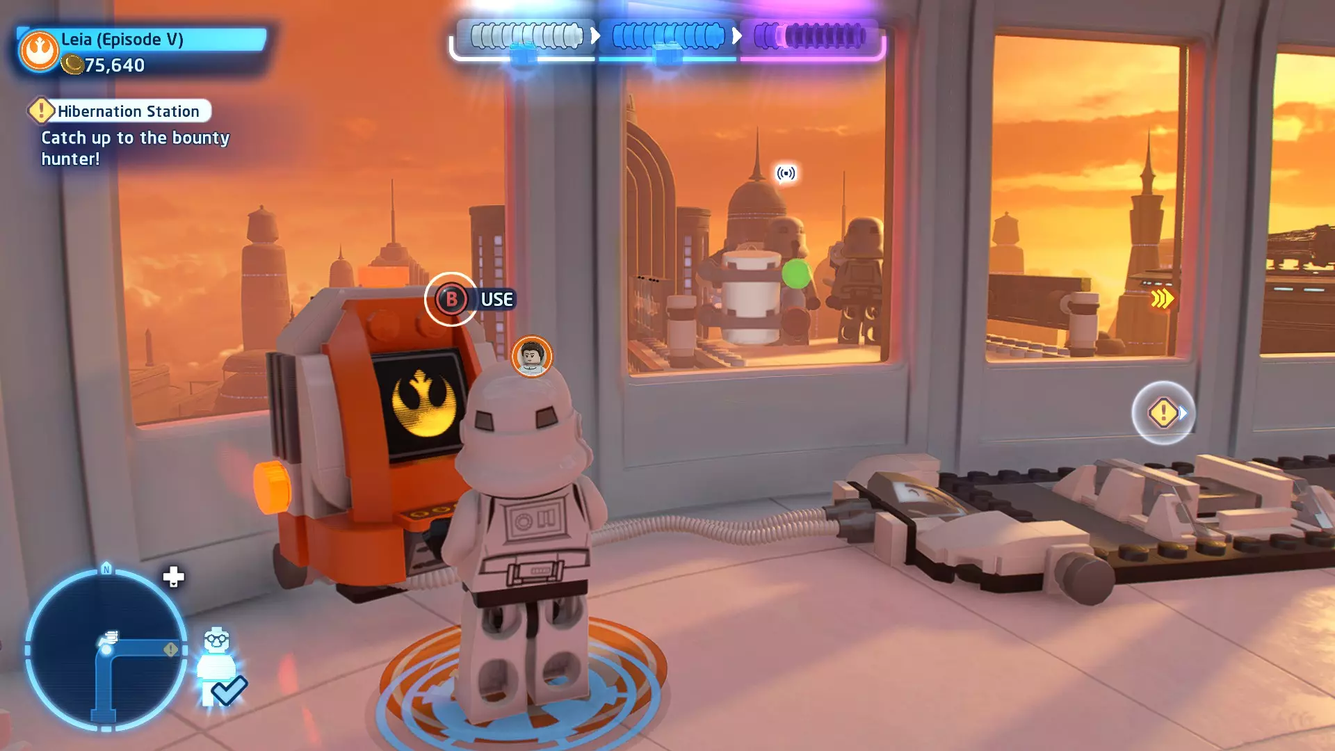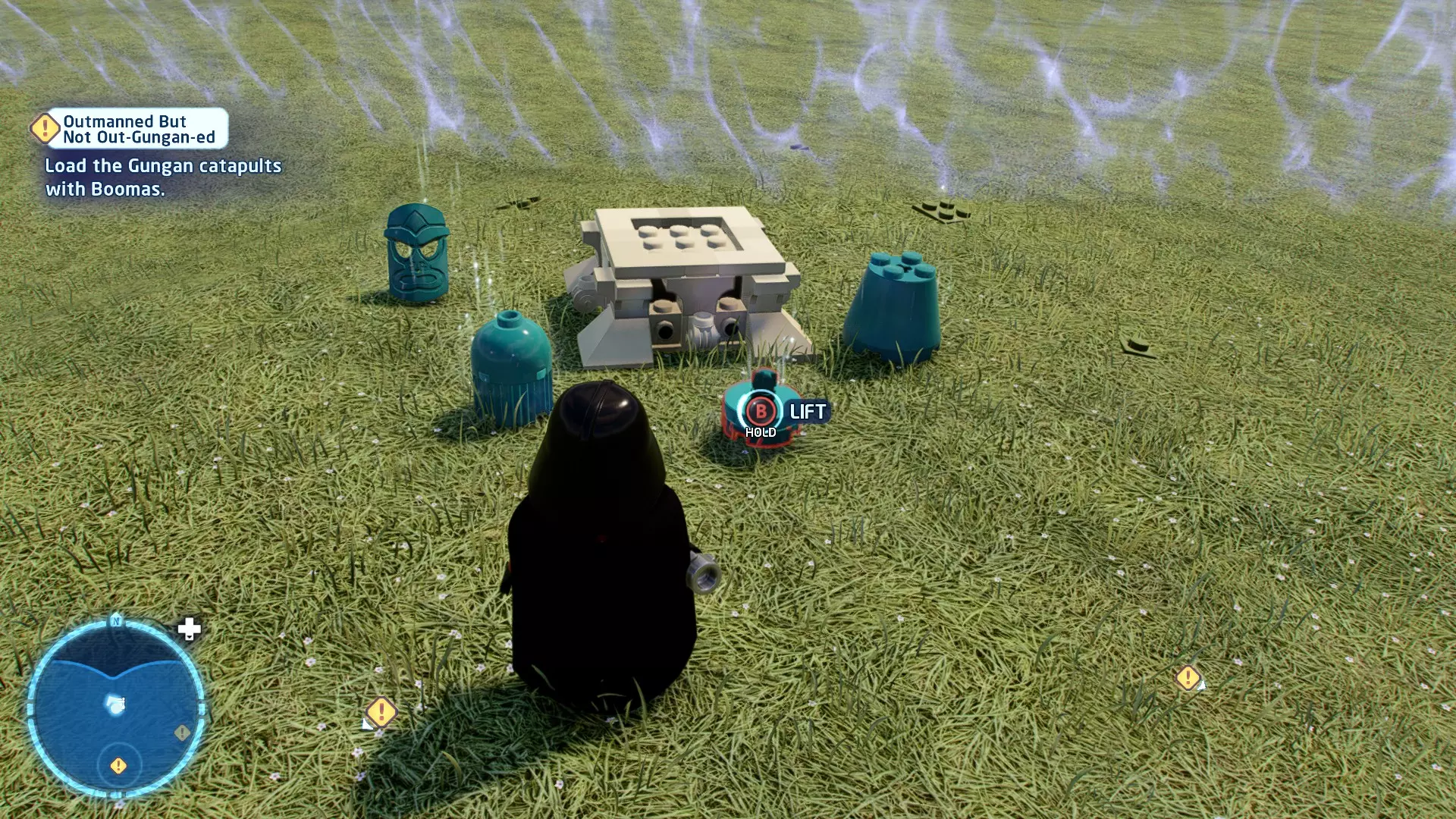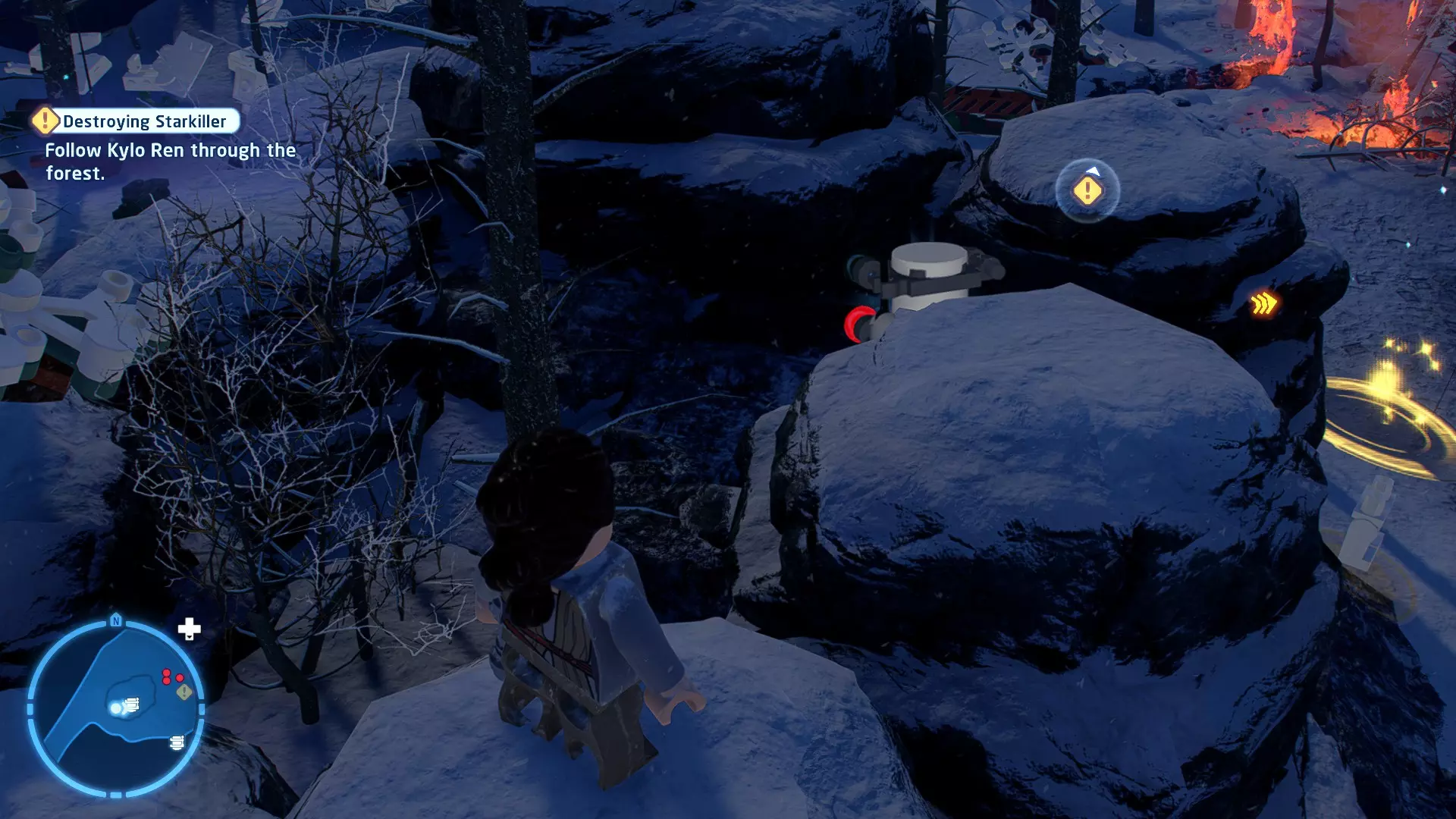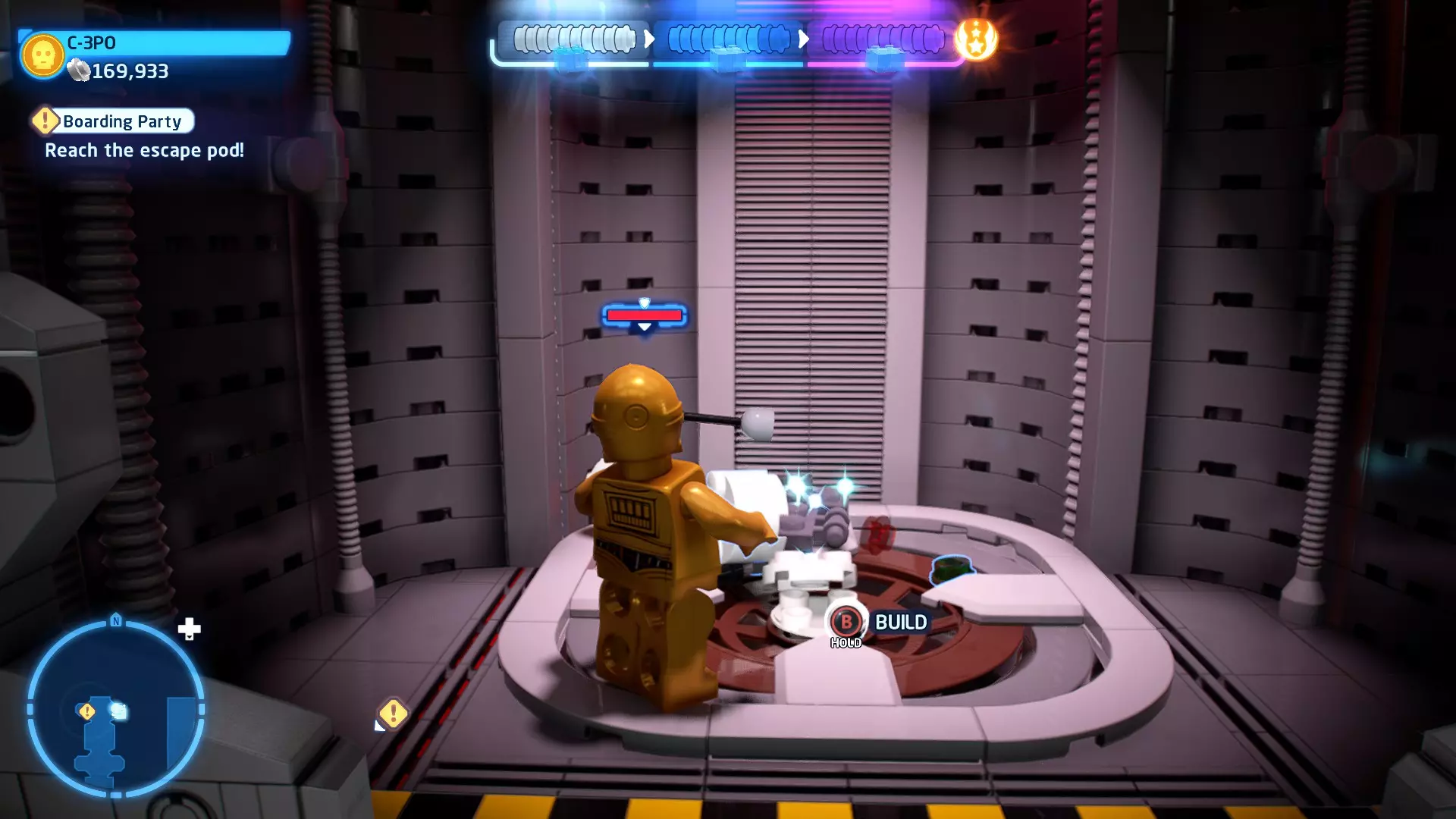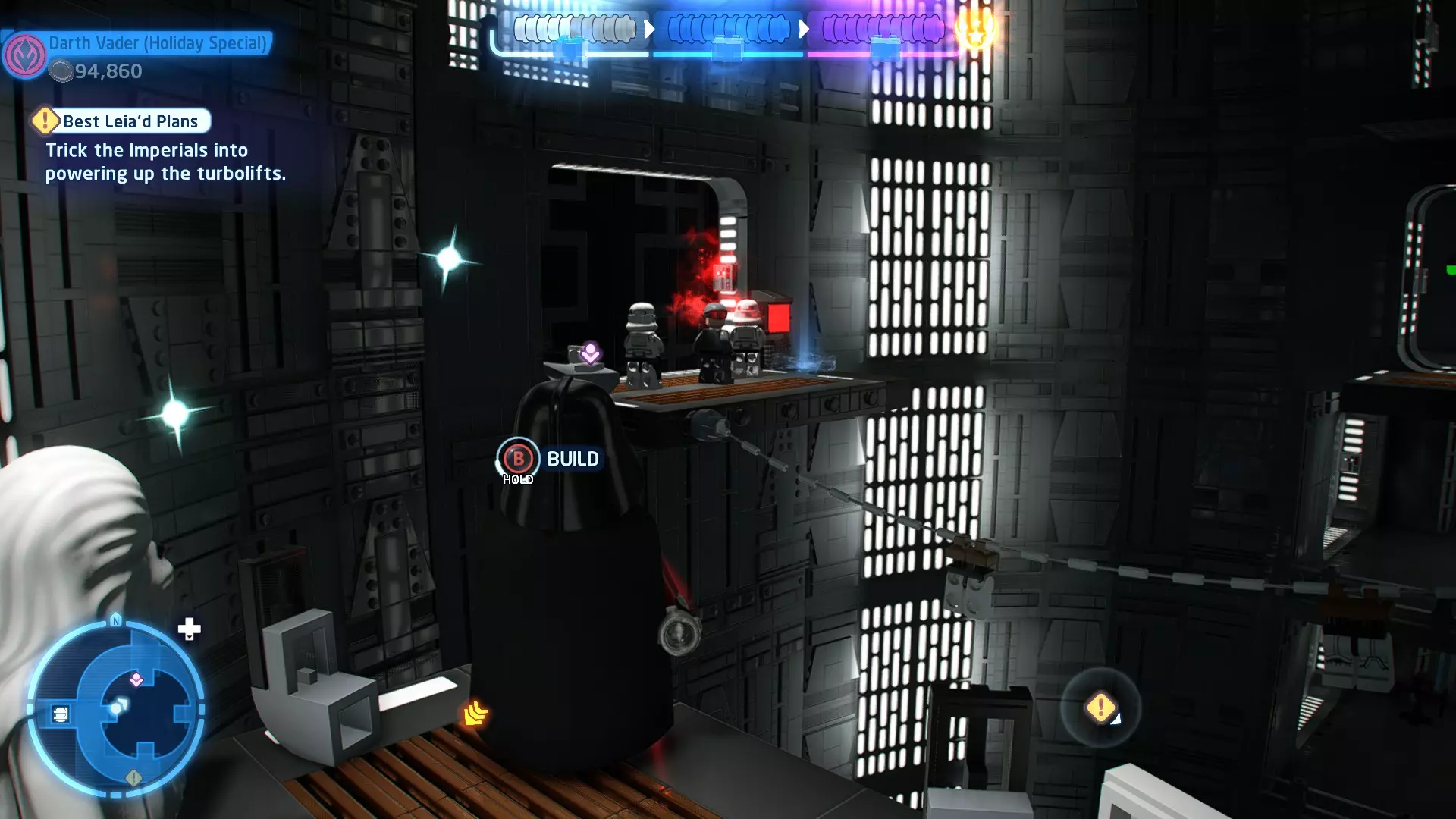 摧毁第一队西斯士兵右侧的黄金发电机,以获得乐高积木。将它们组装成这个迷你套件。 迷你套件3 - 无法束缚我