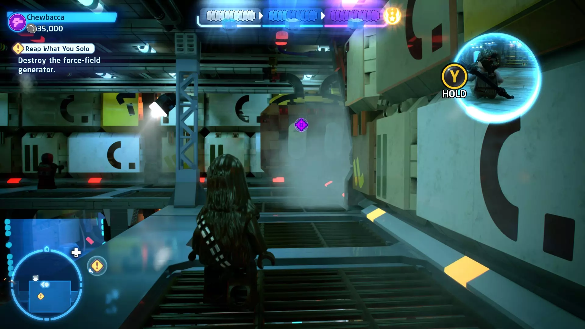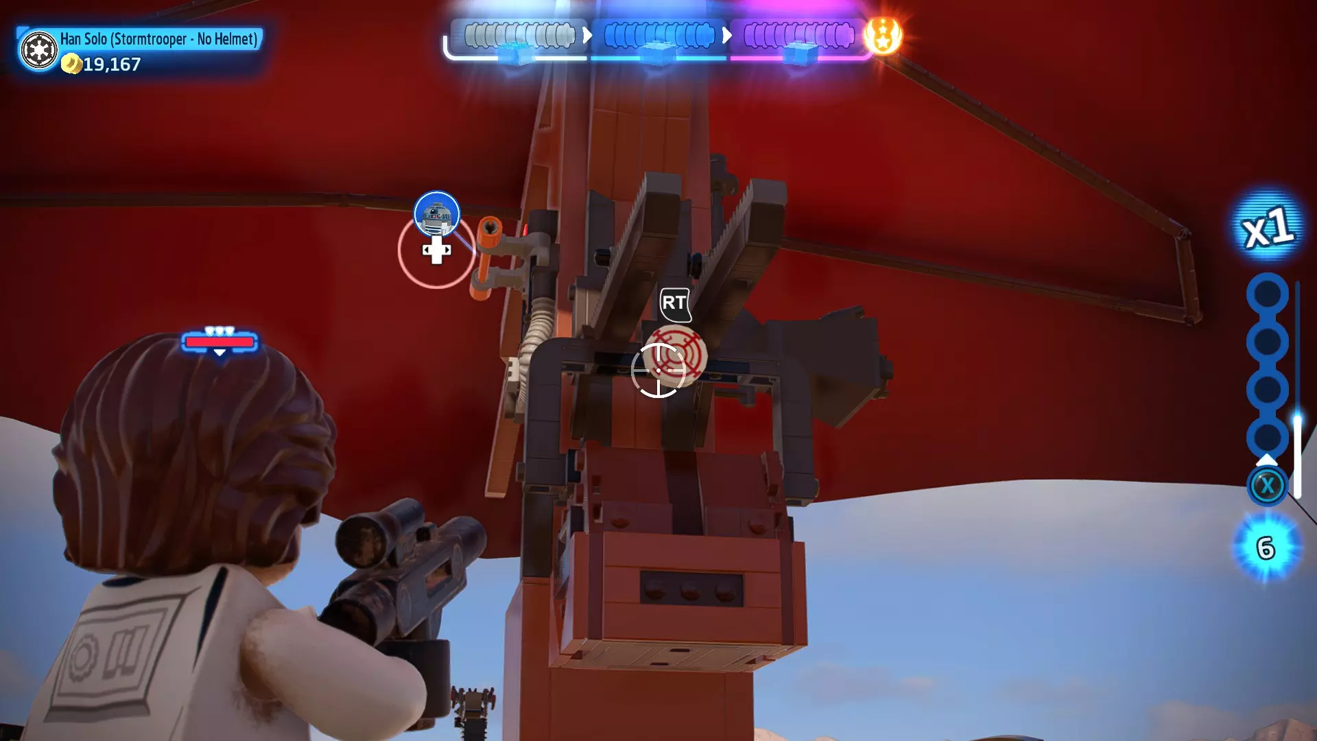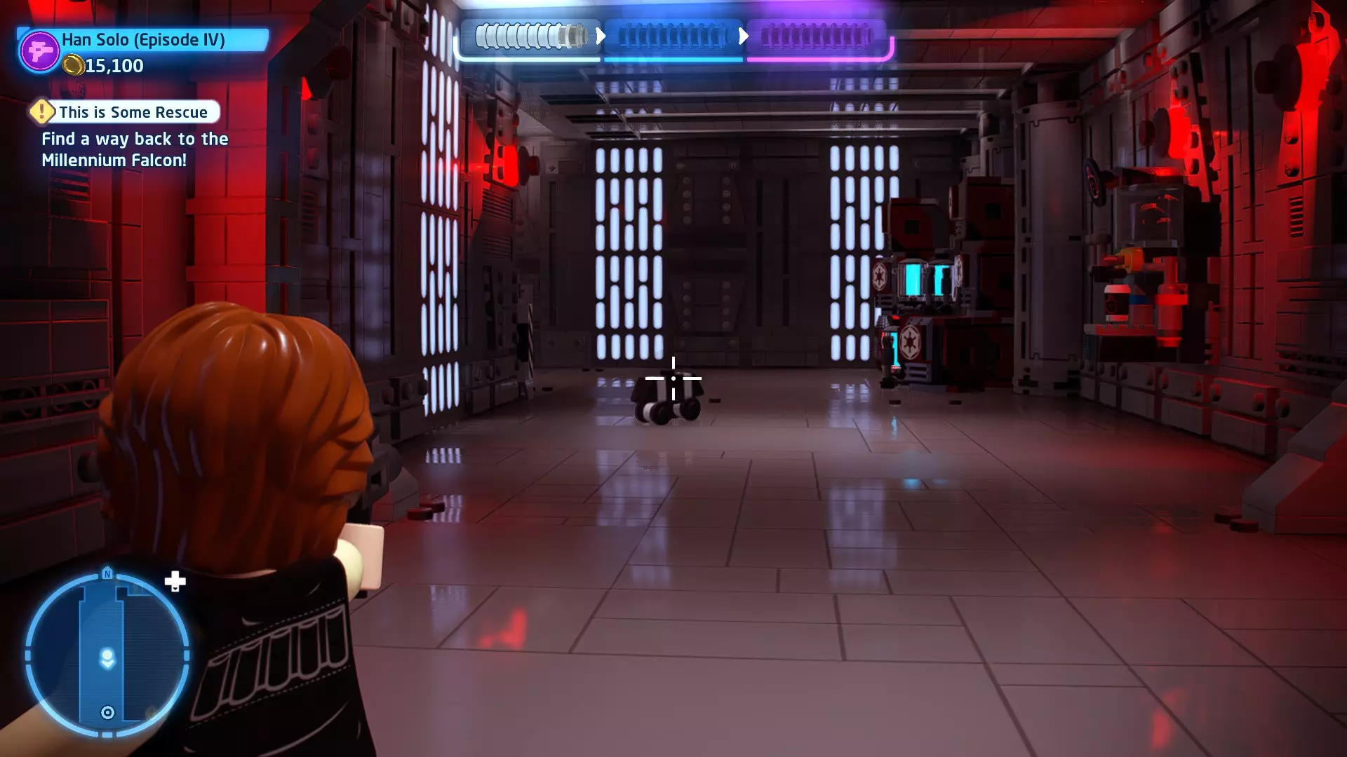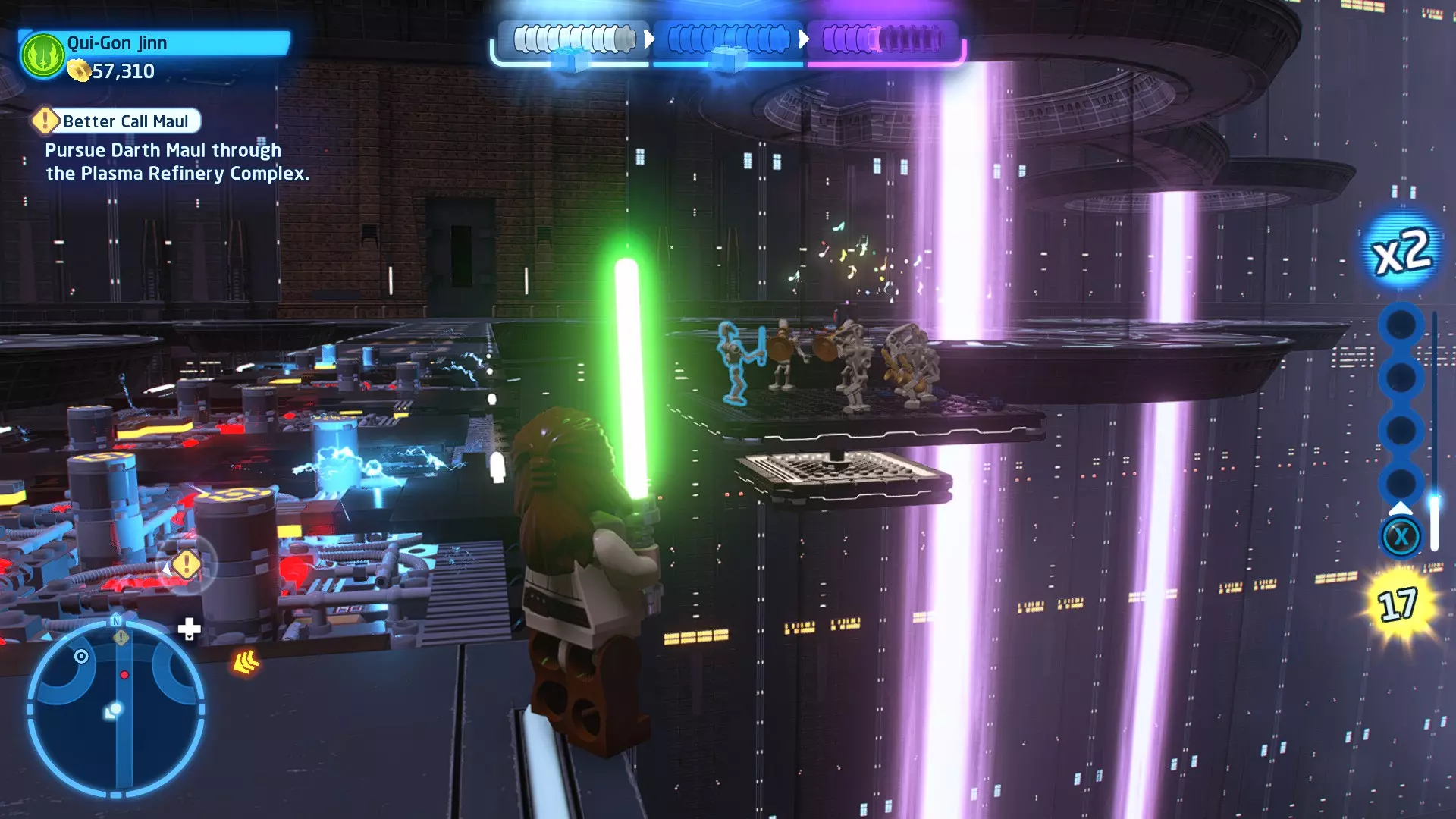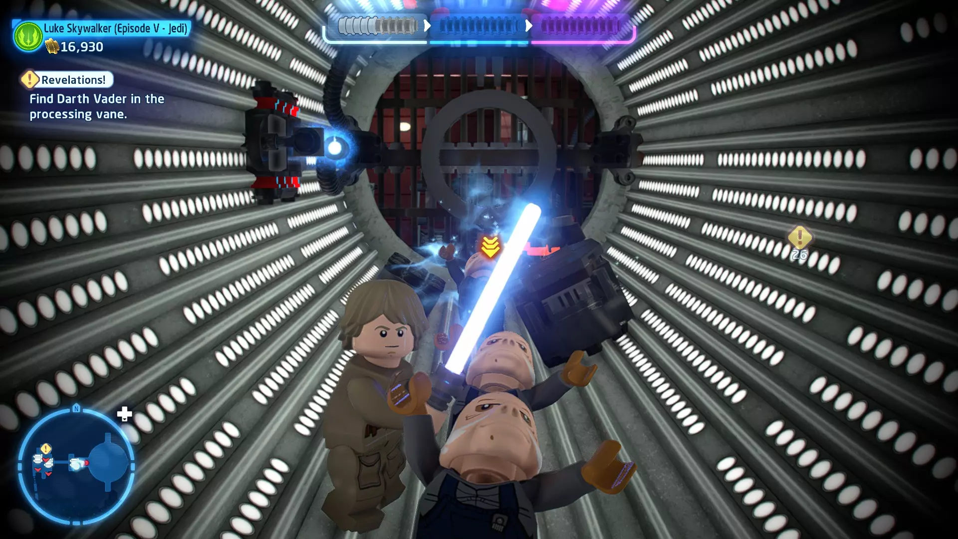 摧毁第一队西斯士兵右侧的黄金发电机,以获得乐高积木。将它们组装成这个迷你套件。 迷你套件3 - 无法束缚我