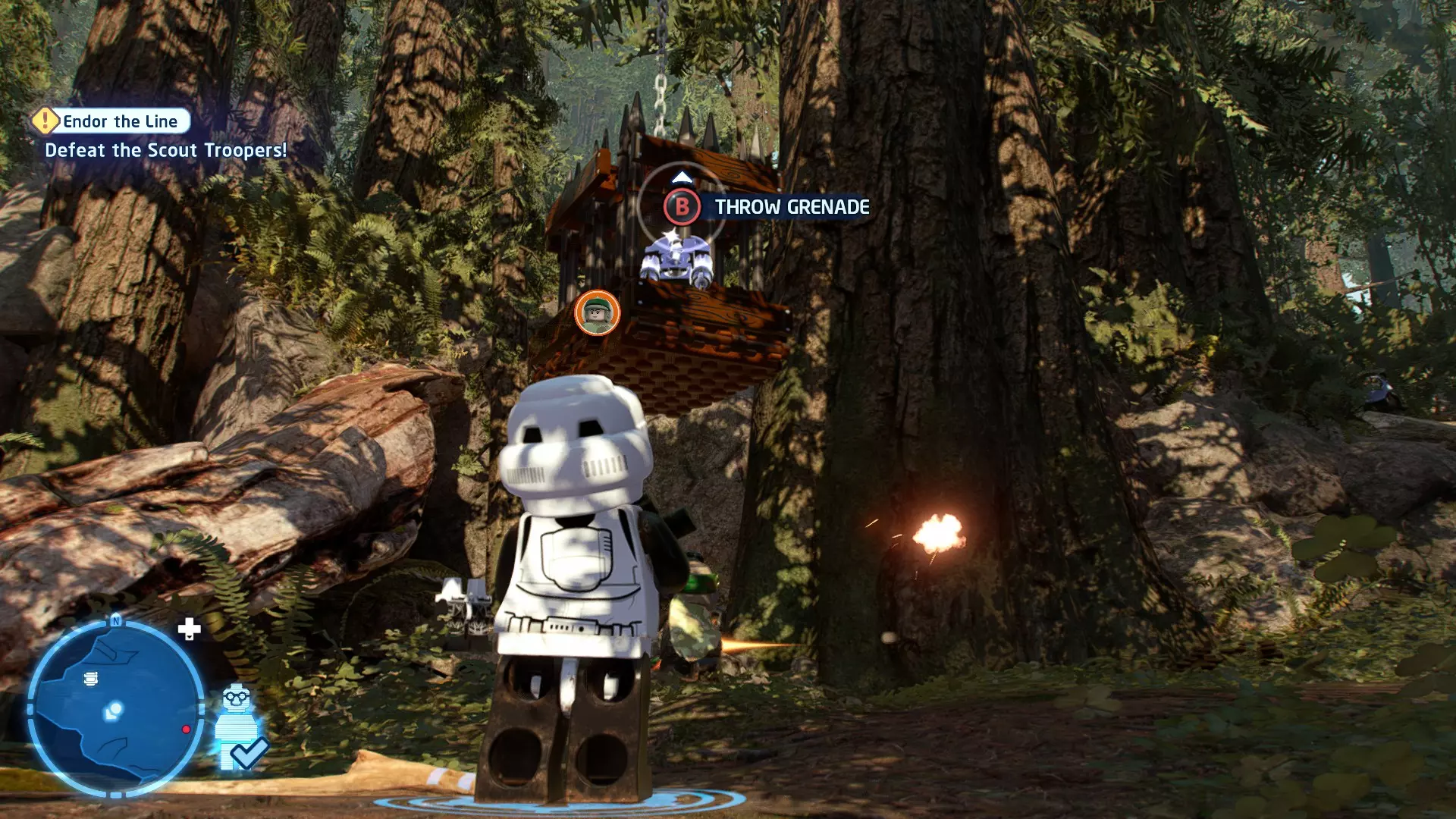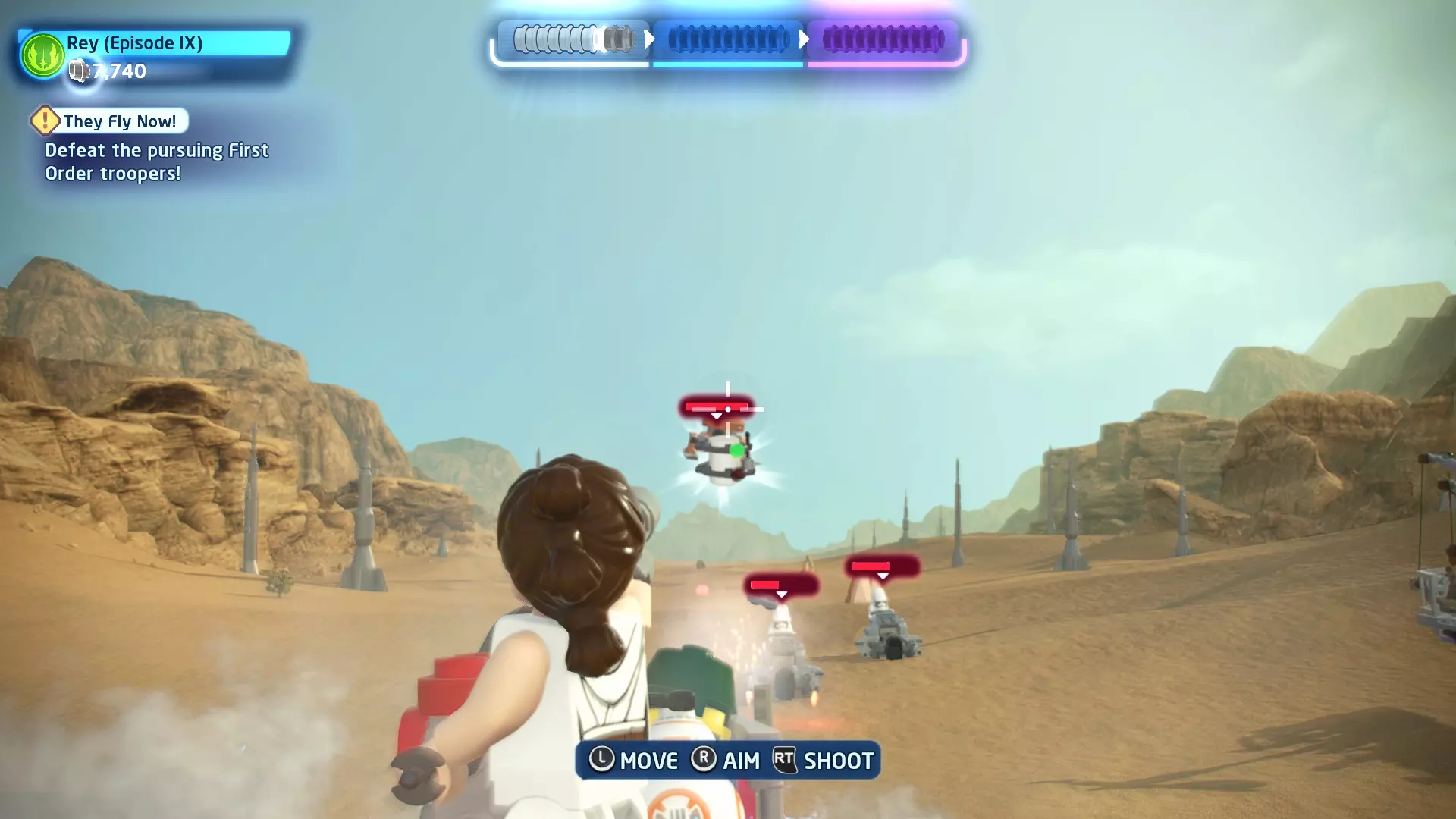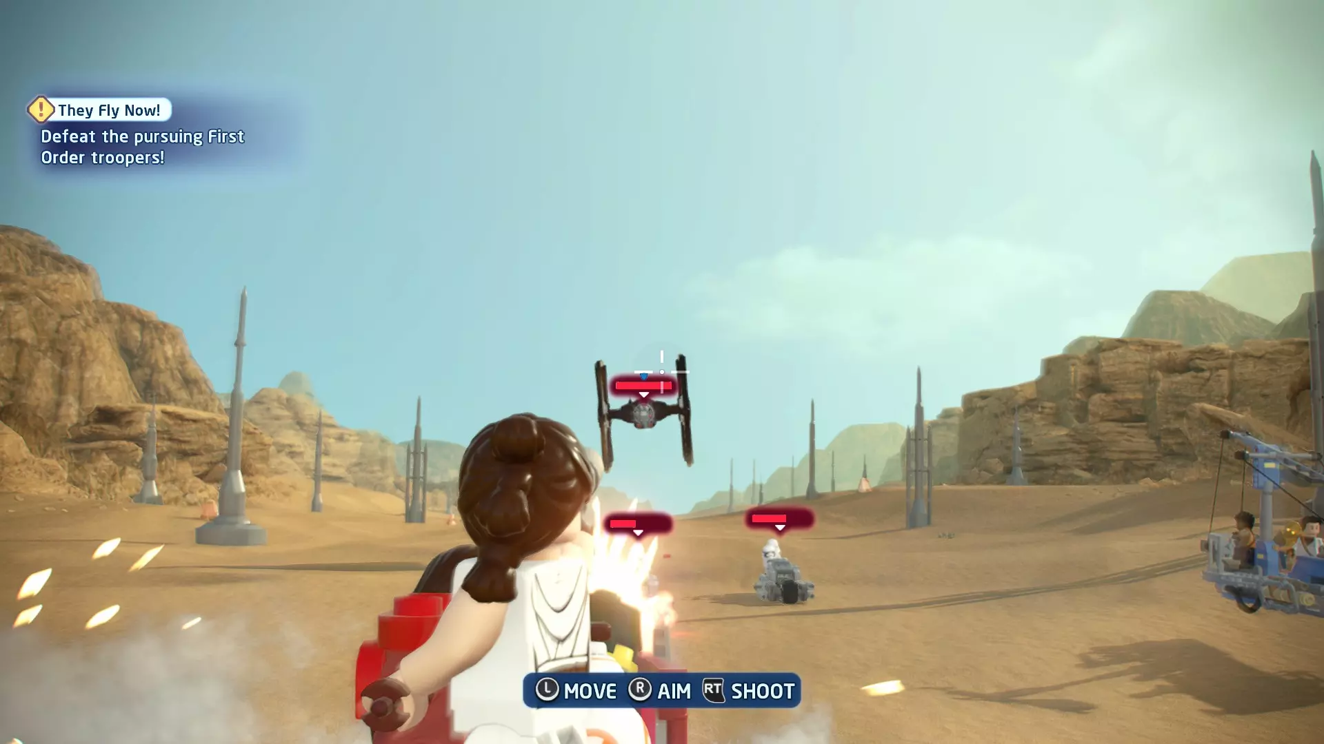 作为BB-8,按下【特殊】按钮向敌人发射粉末罐。用粉末罐击中一名喷气士兵即可完成此挑战。 挑战3 - 团队合作! 详情:先用粉末罐让驾驶员眩晕,然后射击一辆轮式摩托。