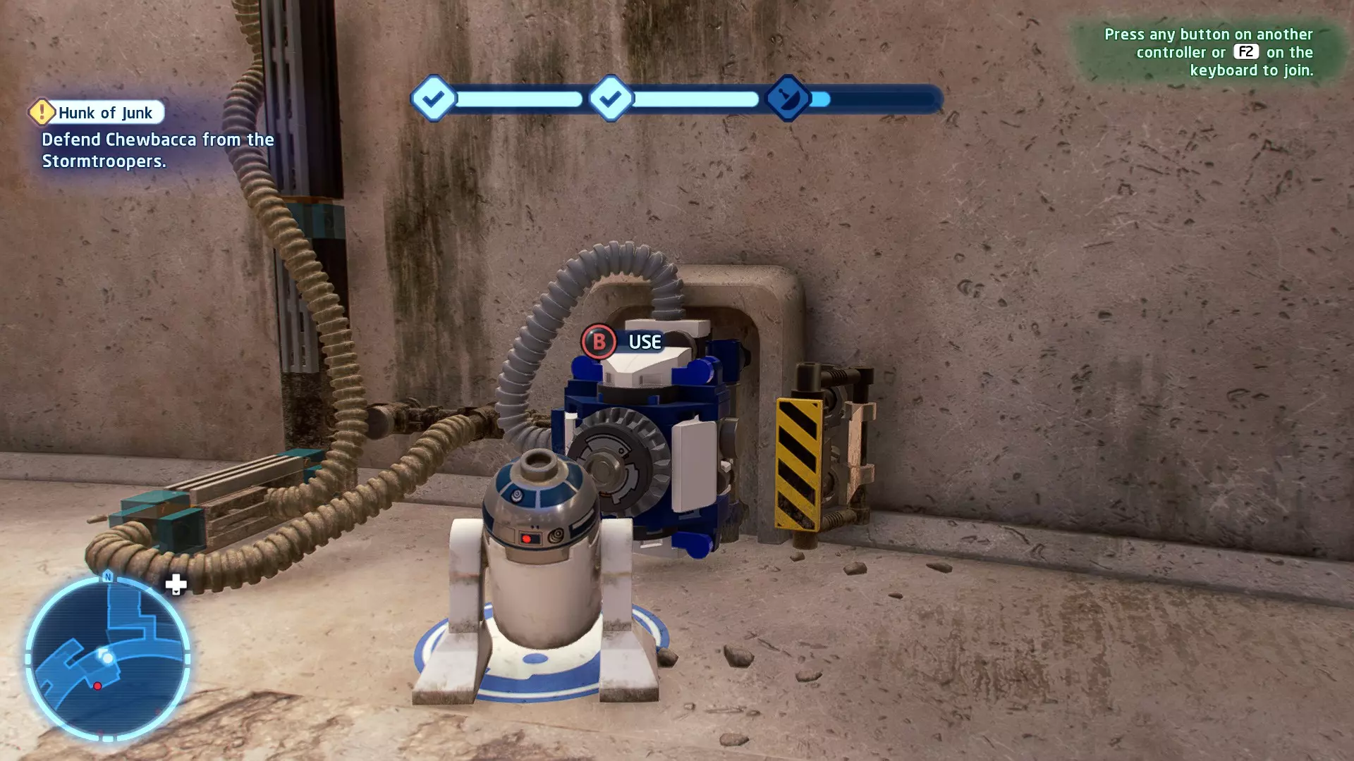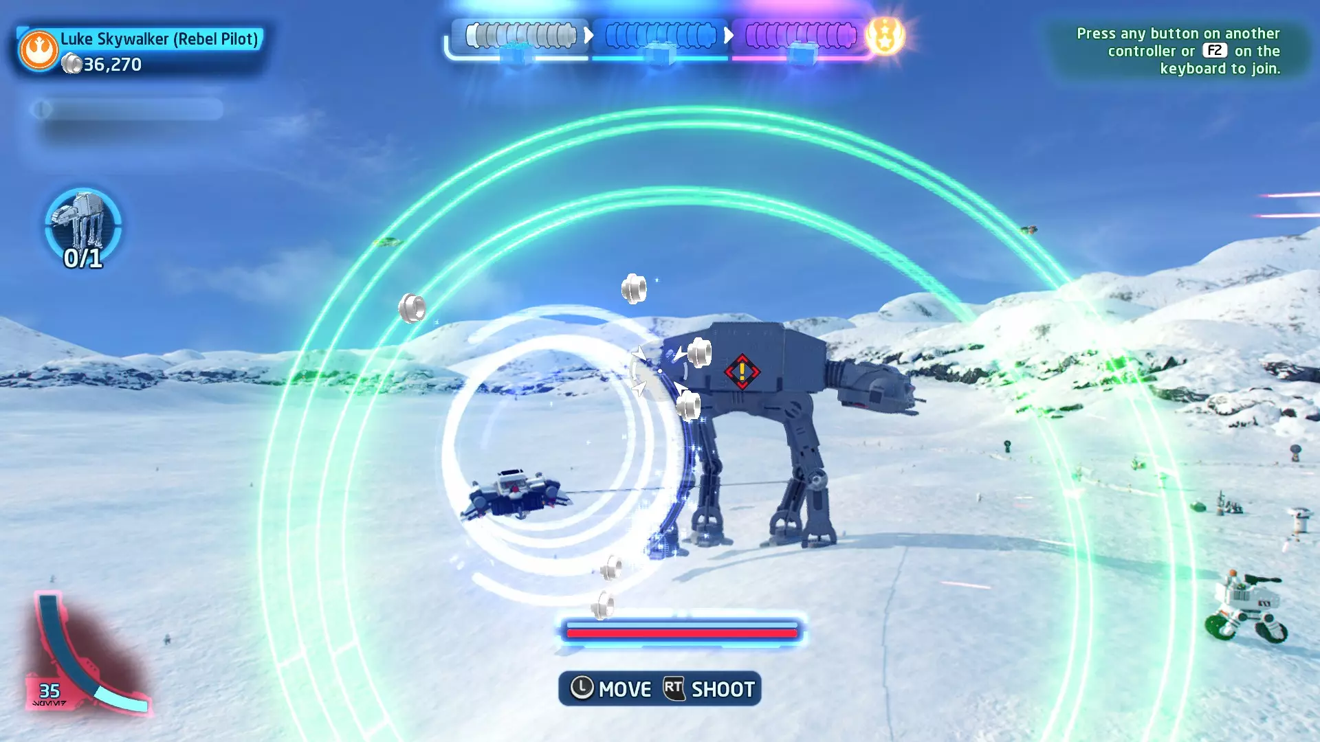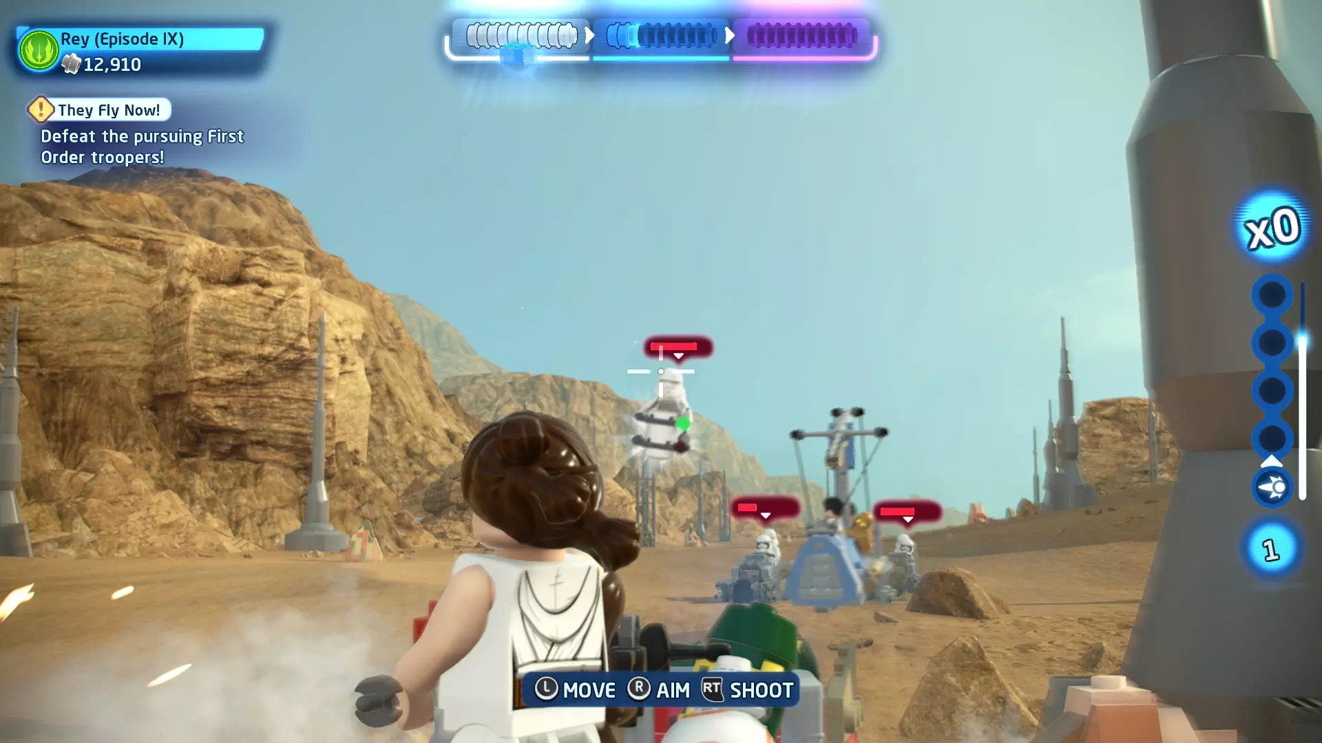 作为BB-8,按下【特殊】按钮向敌人发射粉末罐。用粉末罐击中一名喷气士兵即可完成此挑战。 挑战3 - 团队合作! 详情:先用粉末罐让驾驶员眩晕,然后射击一辆轮式摩托。