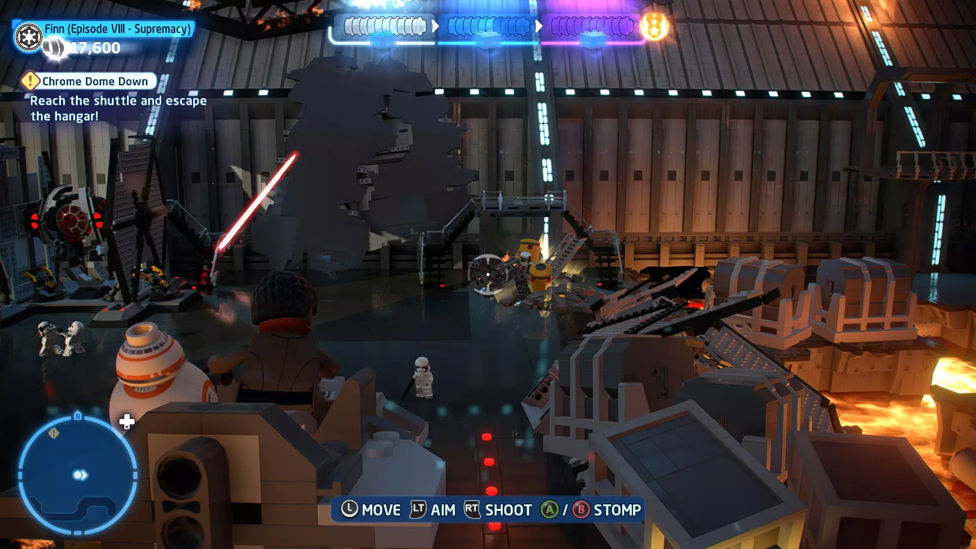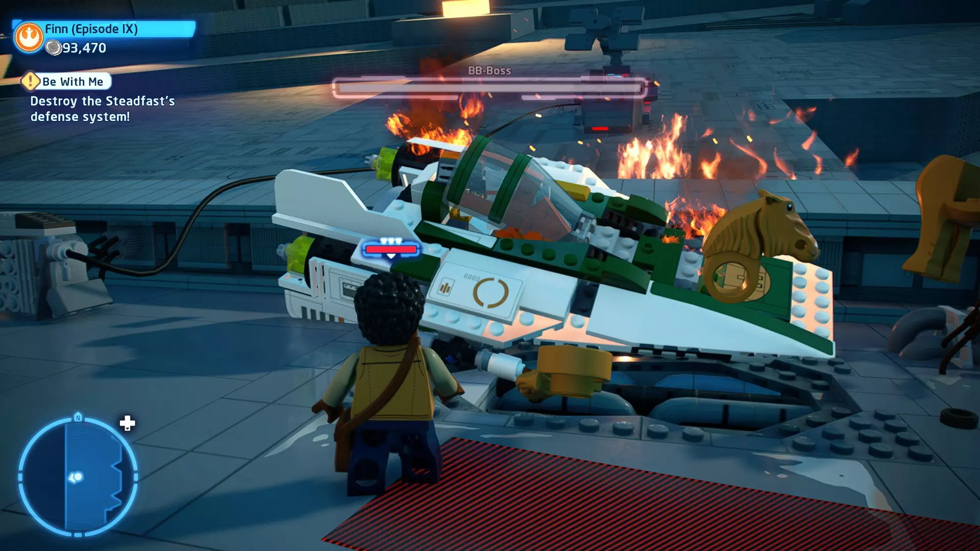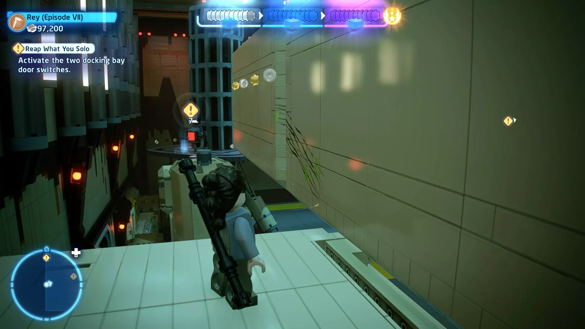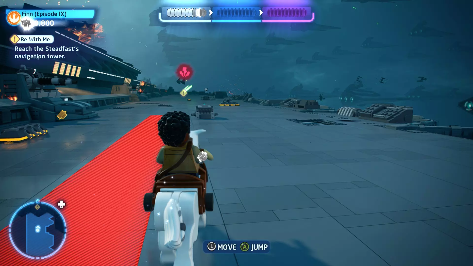 敌人:西斯士兵、西斯喷气士兵 首领:至尊卫兵、伦武士、BB-首领、帕尔帕廷皇帝 初始角色:蕾伊(第九部)、本·索洛 新增角色:芬恩(第九部)、珍娜、BB-8 绝地大师分数:72,000 第一部分 - 仪式 当前目标:击败伦武士和至尊卫兵! 是时候解决至尊卫兵和伦武士了!你将在蕾伊和本之间切换来对抗攻击者。与每个对手决斗以消耗其生命值。击败所有敌人后,将播放过场动画。 第二部分 - 星际驱逐舰地面突袭 当前目标:抵达坚定号的导航塔 我们现在正骑着奥巴克在星际驱逐舰上!享受这段旅程,收集 studs 并避开障碍物。最终,你将从奥尔巴克坐骑上下来,面对一些西斯士兵。 新目标:击败西斯士兵! 消灭来袭的西斯士兵,包括空中的喷气士兵。当他们全部被消灭后,你的目标将会更新。 新目标:抵达坚定号的导航塔 我们需要继续前往导航塔。不幸的是,我们的奥尔巴克无法跨越歼星舰上的缺口。幸运的是,一架TIE匕首战斗机将在附近坠毁。抓住机翼上的抓钩点,然后拉动以创建一座桥梁,让你能够继续前进。 朝着奥尔巴克跑去,你会骑上它。继续沿着歼星舰骑行,收集 studs,避开障碍物。斯纳普会驾驶他的X翼战机坠毁,使路径带电,并将你与一些西斯士兵困在一起。新任务目标:击败西斯士兵! 击败下一波西斯士兵,任务目标将再次更新。 新任务目标:抵达坚定号的导航塔 士兵被消灭后,我们需要想办法切断电源才能继续前进。有两种方法可以做到: 1. 炮塔 2. 发电机 炮塔:使用X翼战机右侧的宇航技工机器人接口来启动炮塔,摧毁发电机并清理道路。 发电机:击败西斯士兵,他们会掉落盔甲碎片。穿上他们的盔甲伪装自己,这样就能使用反派终端。在X翼战机左侧的平台上可以找到一个反派终端。抓住柱子并将它们移动到平台附近的位置,这样你就能跳上反派终端。使用终端关闭电源,以便继续前进。 清理完路径后,你会跳回自己的奥尔巴克兽。继续沿着路径骑行到底部,在那里你将遭遇BB- Boss! 新目标:摧毁坚定号的防御系统! 要摧毁那座炮塔,我们需要破坏冷却通风口。当炮塔开火时,通风口会关闭。一旦炮塔停止开火,通风口就会打开,此时你可以对其造成伤害。射击烧红的线路来摧毁通风口。摧毁所有四个通风口后,炮塔会爆炸,露出一些乐高积木。 新目标:打开舱门并摧毁导航塔!将乐高积木组装成激光切割机,然后抓住附近的抓钩点并拉动,露出一个宇航技工机器人接口。使用该接口可在激光切割机上显示一个旋转手柄。抓住旋转手柄并推动,以切开舱门,触发过场动画。 第三部分 - 我即众绝地 当前目标:击败皇帝! 是时候结束这一切了。按照按钮提示击败皇帝,完成你的宿命并结束天行者传奇!已解锁角色:本·索洛、珍娜、帕尔帕廷皇帝(克隆体)(200,000)、阿普莱克(200,000)、卡多(200,000)、库鲁克(200,000)、特鲁根(200,000)、乌沙尔(200,000)、维克鲁尔(200,000)、莱娅(训练闪回)(200,000)、卢克·天行者(训练闪回)(100,000)、蕾伊·天行者(200,000)、罗丝·蒂科(第九部)(35,000)、西斯士兵(100,000)、西斯喷气士兵(100,000) 如果尚未解锁,你还将解锁BB-9E(100,000) 与我同在 - 迷你套件 所需能力:爆炸、原力、英雄、快速射击 迷你套件1 - 跨栏比赛