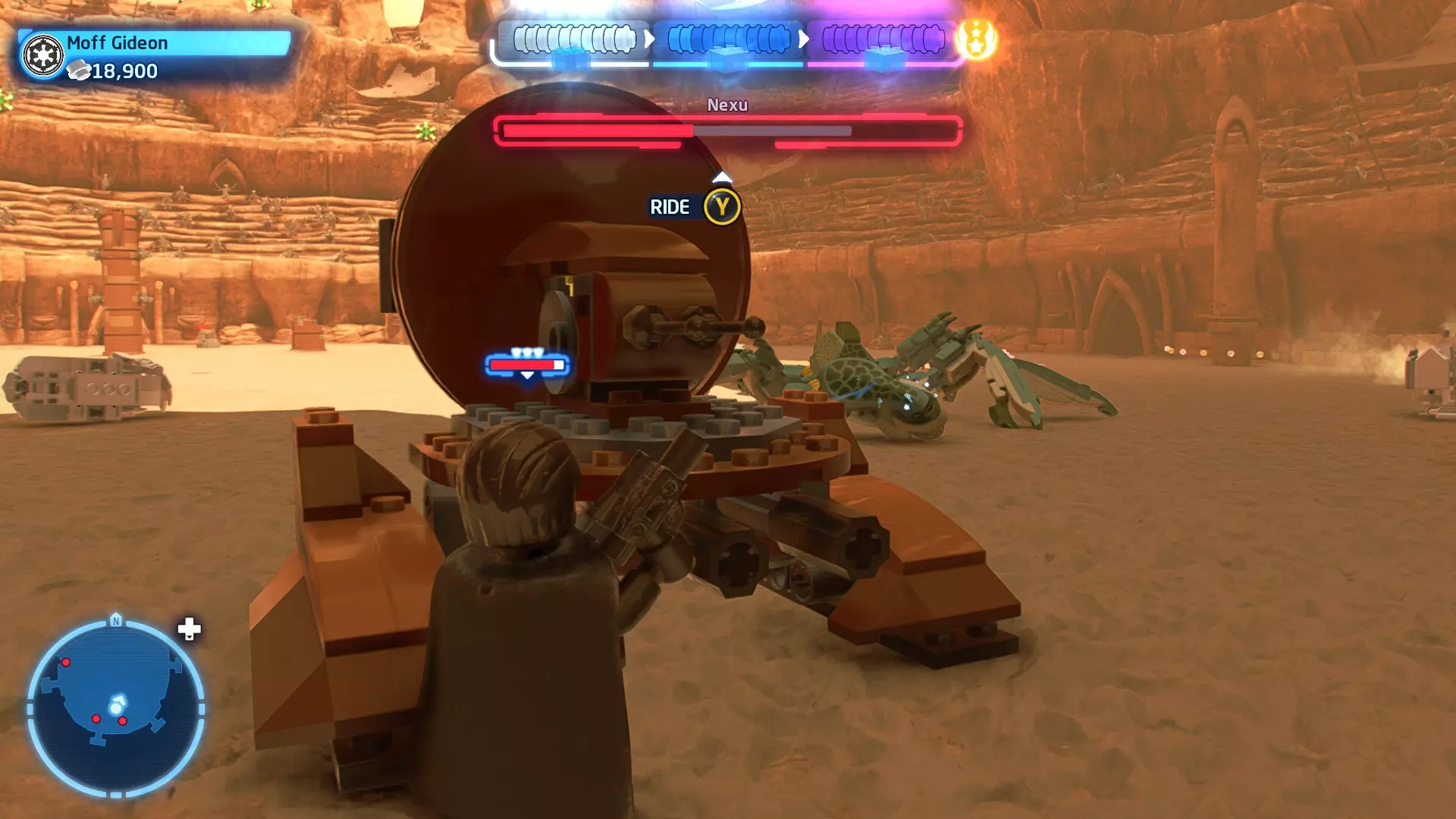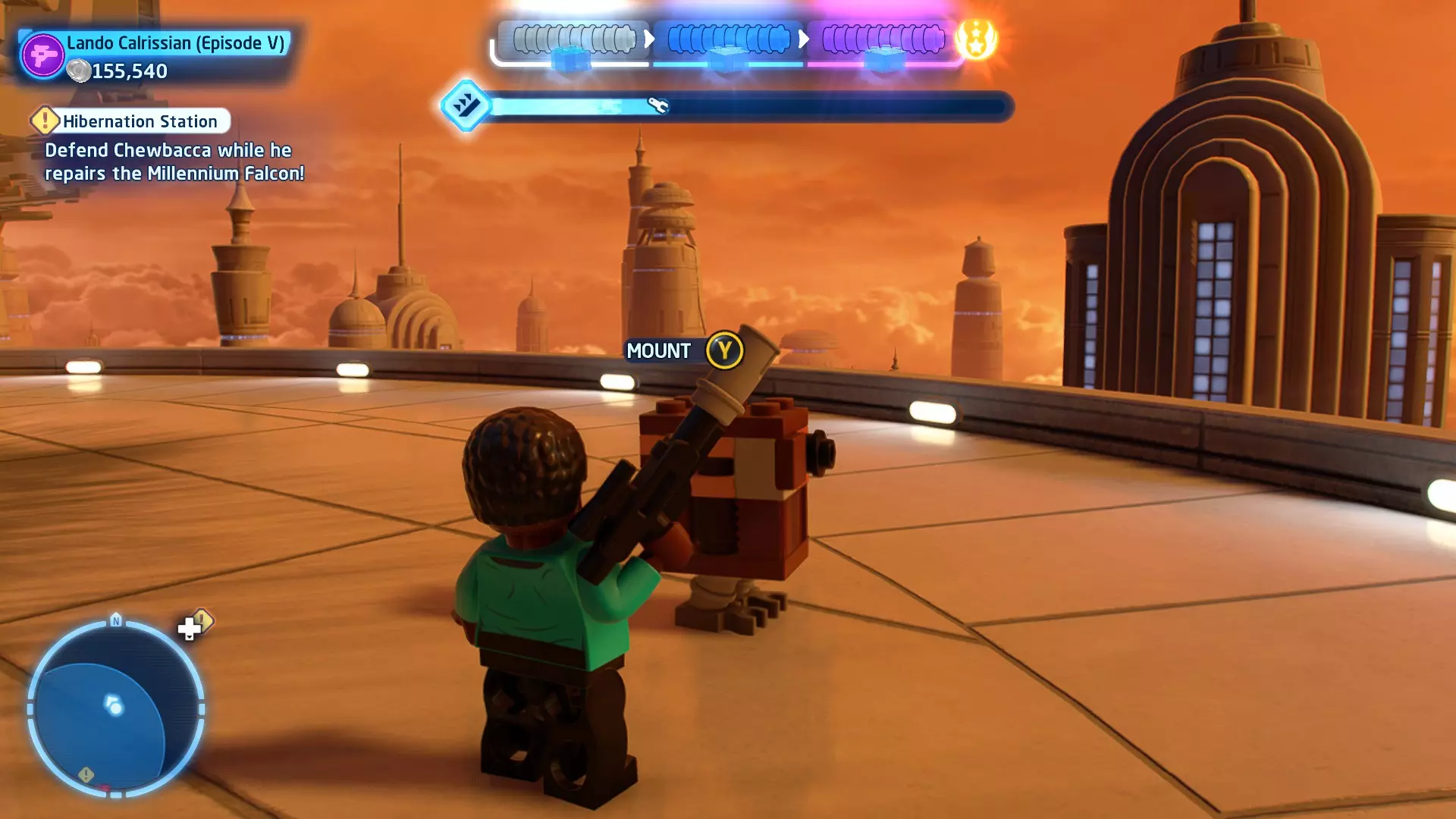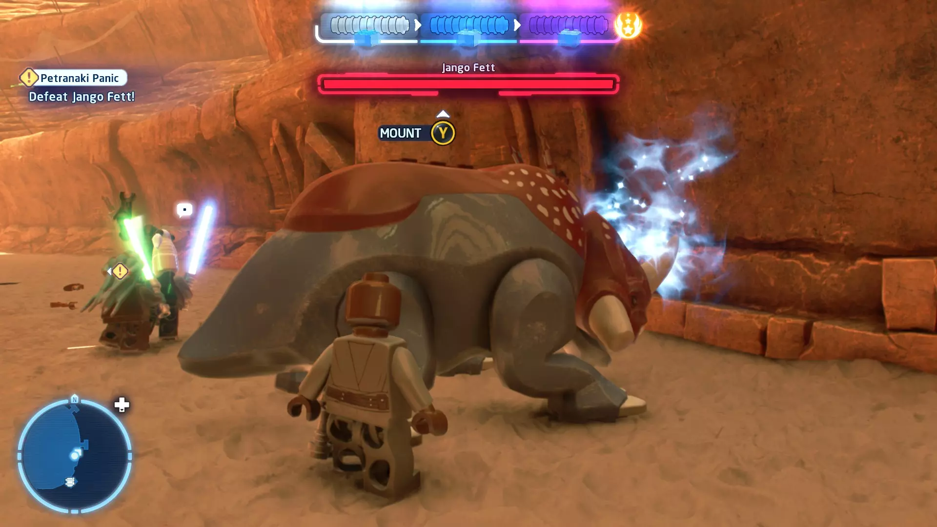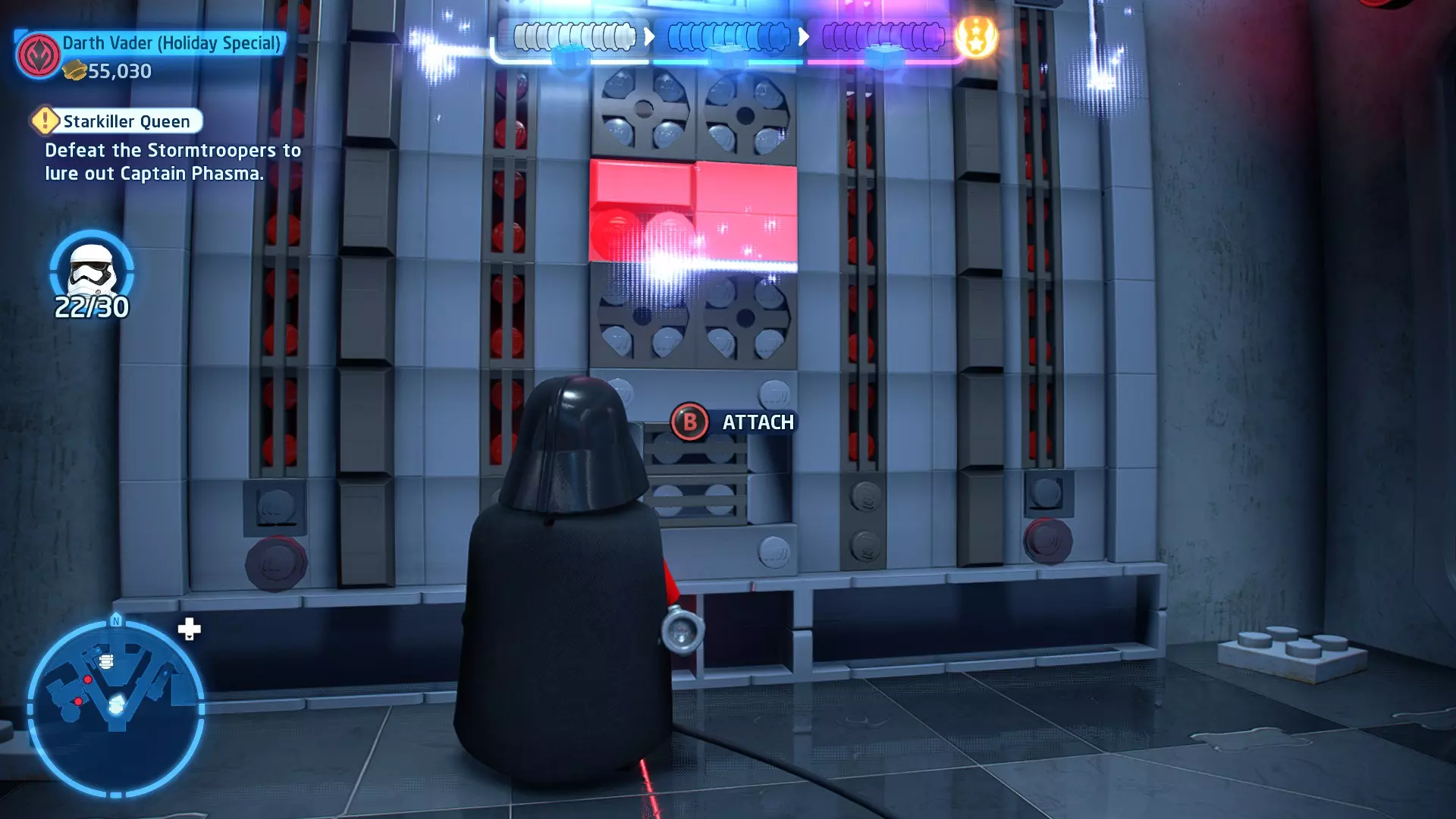 敌人:西斯士兵、西斯喷气士兵 首领:至尊卫兵、伦武士、BB-首领、帕尔帕廷皇帝 初始角色:蕾伊(第九部)、本·索洛 新增角色:芬恩(第九部)、珍娜、BB-8 绝地大师分数:72,000 第一部分 - 仪式 当前目标:击败伦武士和至尊卫兵! 是时候解决至尊卫兵和伦武士了!你将在蕾伊和本之间切换来对抗攻击者。与每个对手决斗以消耗其生命值。击败所有敌人后,将播放过场动画。 第二部分 - 星际驱逐舰地面突袭 当前目标:抵达坚定号的导航塔 我们现在正骑着奥巴克在星际驱逐舰上!享受这段旅程,收集 studs 并避开障碍物。最终,你将从奥尔巴克坐骑上下来,面对一些西斯士兵。 新目标:击败西斯士兵! 消灭来袭的西斯士兵,包括空中的喷气士兵。当他们全部被消灭后,你的目标将会更新。 新目标:抵达坚定号的导航塔 我们需要继续前往导航塔。不幸的是,我们的奥尔巴克无法跨越歼星舰上的缺口。幸运的是,一架TIE匕首战斗机将在附近坠毁。抓住机翼上的抓钩点,然后拉动以创建一座桥梁,让你能够继续前进。 朝着奥尔巴克跑去,你会骑上它。继续沿着歼星舰骑行,收集 studs,避开障碍物。斯纳普会驾驶他的X翼战机坠毁,使路径带电,并将你与一些西斯士兵困在一起。新任务目标:击败西斯士兵! 击败下一波西斯士兵,任务目标将再次更新。 新任务目标:抵达坚定号的导航塔 士兵被消灭后,我们需要想办法切断电源才能继续前进。有两种方法可以做到: 1. 炮塔 2. 发电机 炮塔:使用X翼战机右侧的宇航技工机器人接口来启动炮塔,摧毁发电机并清理道路。 发电机:击败西斯士兵,他们会掉落盔甲碎片。穿上他们的盔甲伪装自己,这样就能使用反派终端。在X翼战机左侧的平台上可以找到一个反派终端。抓住柱子并将它们移动到平台附近的位置,这样你就能跳上反派终端。使用终端关闭电源,以便继续前进。 清理完路径后,你会跳回自己的奥尔巴克兽。继续沿着路径骑行到底部,在那里你将遭遇BB- Boss! 新目标:摧毁坚定号的防御系统! 要摧毁那座炮塔,我们需要破坏冷却通风口。当炮塔开火时,通风口会关闭。一旦炮塔停止开火,通风口就会打开,此时你可以对其造成伤害。射击烧红的线路来摧毁通风口。摧毁所有四个通风口后,炮塔会爆炸,露出一些乐高积木。 新目标:打开舱门并摧毁导航塔!将乐高积木组装成激光切割机,然后抓住附近的抓钩点并拉动,露出一个宇航技工机器人接口。使用该接口可在激光切割机上显示一个旋转手柄。抓住旋转手柄并推动,以切开舱门,触发过场动画。 第三部分 - 我即众绝地 当前目标:击败皇帝! 是时候结束这一切了。按照按钮提示击败皇帝,完成你的宿命并结束天行者传奇!已解锁角色:本·索洛、珍娜、帕尔帕廷皇帝(克隆体)(200,000)、阿普莱克(200,000)、卡多(200,000)、库鲁克(200,000)、特鲁根(200,000)、乌沙尔(200,000)、维克鲁尔(200,000)、莱娅(训练闪回)(200,000)、卢克·天行者(训练闪回)(100,000)、蕾伊·天行者(200,000)、罗丝·蒂科(第九部)(35,000)、西斯士兵(100,000)、西斯喷气士兵(100,000) 如果尚未解锁,你还将解锁BB-9E(100,000) 与我同在 - 迷你套件 所需能力:爆炸、原力、英雄、快速射击 迷你套件1 - 跨栏比赛