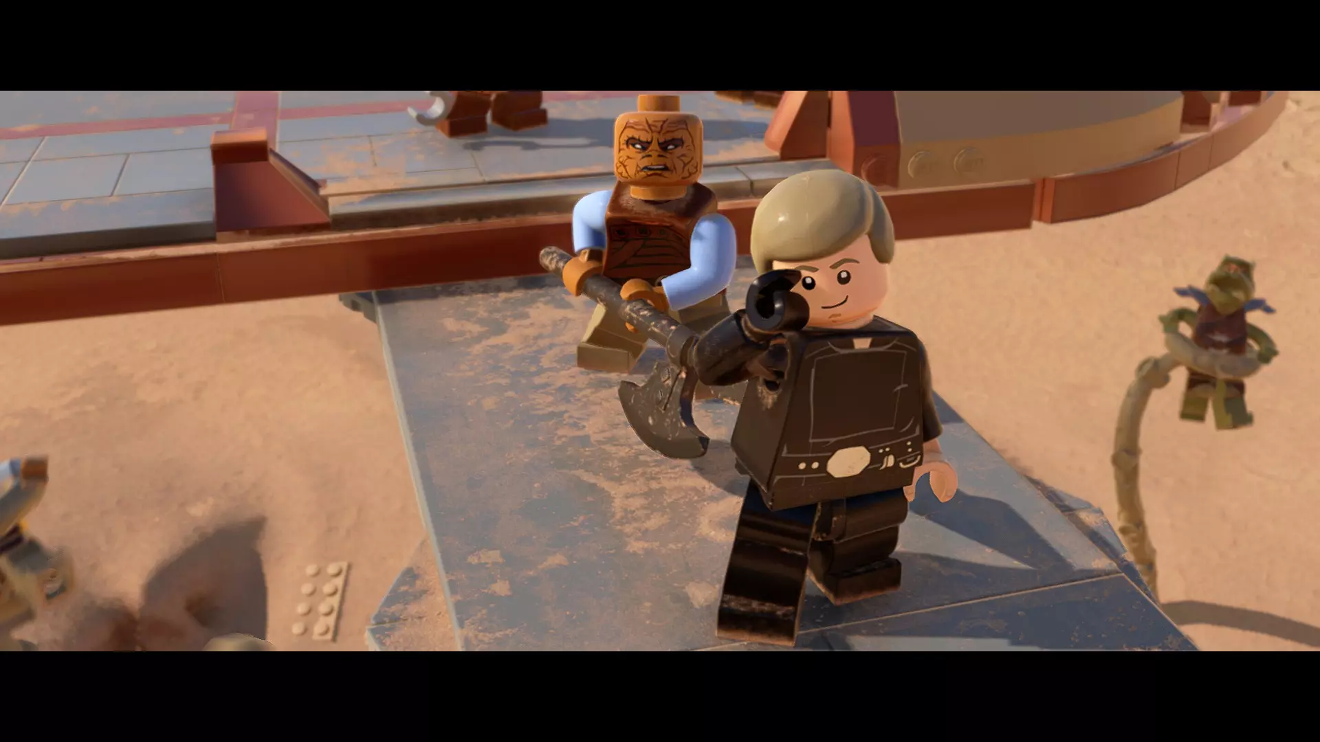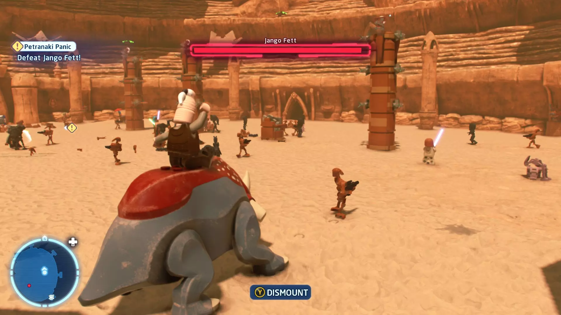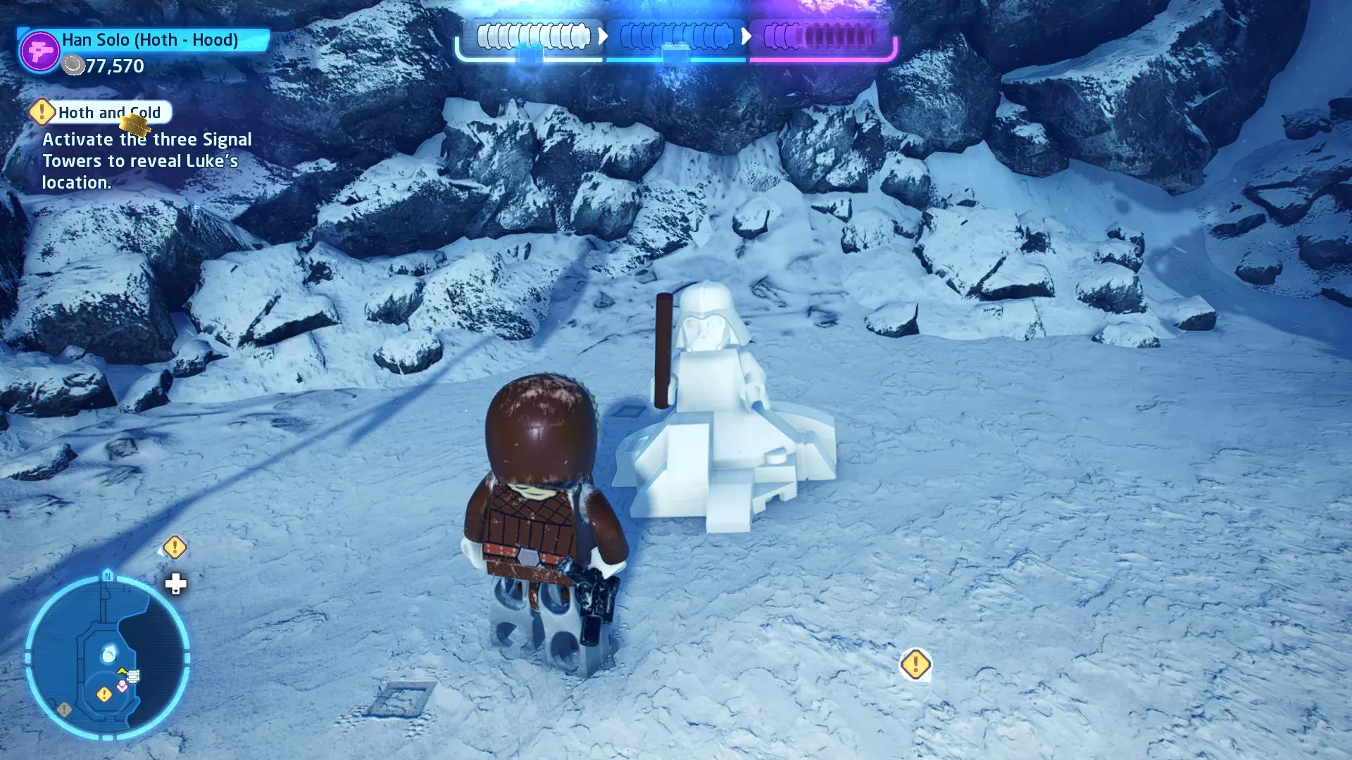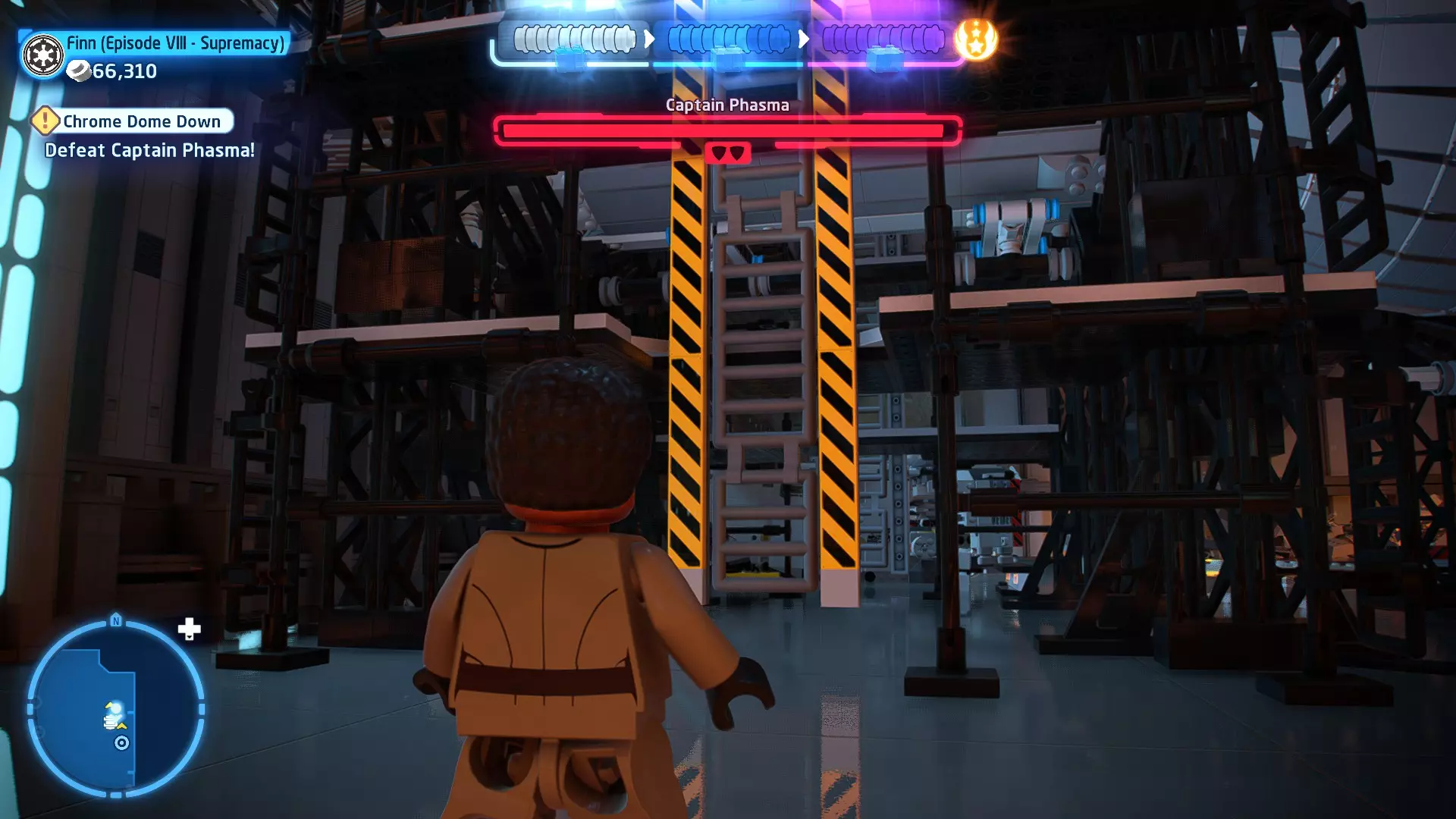 敌人:西斯士兵、西斯喷气士兵 首领:至尊卫兵、伦武士、BB-首领、帕尔帕廷皇帝 初始角色:蕾伊(第九部)、本·索洛 新增角色:芬恩(第九部)、珍娜、BB-8 绝地大师分数:72,000 第一部分 - 仪式 当前目标:击败伦武士和至尊卫兵! 是时候解决至尊卫兵和伦武士了!你将在蕾伊和本之间切换来对抗攻击者。与每个对手决斗以消耗其生命值。击败所有敌人后,将播放过场动画。 第二部分 - 星际驱逐舰地面突袭 当前目标:抵达坚定号的导航塔 我们现在正骑着奥巴克在星际驱逐舰上!享受这段旅程,收集 studs 并避开障碍物。最终,你将从奥尔巴克坐骑上下来,面对一些西斯士兵。 新目标:击败西斯士兵! 消灭来袭的西斯士兵,包括空中的喷气士兵。当他们全部被消灭后,你的目标将会更新。 新目标:抵达坚定号的导航塔 我们需要继续前往导航塔。不幸的是,我们的奥尔巴克无法跨越歼星舰上的缺口。幸运的是,一架TIE匕首战斗机将在附近坠毁。抓住机翼上的抓钩点,然后拉动以创建一座桥梁,让你能够继续前进。 朝着奥尔巴克跑去,你会骑上它。继续沿着歼星舰骑行,收集 studs,避开障碍物。斯纳普会驾驶他的X翼战机坠毁,使路径带电,并将你与一些西斯士兵困在一起。新任务目标:击败西斯士兵! 击败下一波西斯士兵,任务目标将再次更新。 新任务目标:抵达坚定号的导航塔 士兵被消灭后,我们需要想办法切断电源才能继续前进。有两种方法可以做到: 1. 炮塔 2. 发电机 炮塔:使用X翼战机右侧的宇航技工机器人接口来启动炮塔,摧毁发电机并清理道路。 发电机:击败西斯士兵,他们会掉落盔甲碎片。穿上他们的盔甲伪装自己,这样就能使用反派终端。在X翼战机左侧的平台上可以找到一个反派终端。抓住柱子并将它们移动到平台附近的位置,这样你就能跳上反派终端。使用终端关闭电源,以便继续前进。 清理完路径后,你会跳回自己的奥尔巴克兽。继续沿着路径骑行到底部,在那里你将遭遇BB- Boss! 新目标:摧毁坚定号的防御系统! 要摧毁那座炮塔,我们需要破坏冷却通风口。当炮塔开火时,通风口会关闭。一旦炮塔停止开火,通风口就会打开,此时你可以对其造成伤害。射击烧红的线路来摧毁通风口。摧毁所有四个通风口后,炮塔会爆炸,露出一些乐高积木。 新目标:打开舱门并摧毁导航塔!将乐高积木组装成激光切割机,然后抓住附近的抓钩点并拉动,露出一个宇航技工机器人接口。使用该接口可在激光切割机上显示一个旋转手柄。抓住旋转手柄并推动,以切开舱门,触发过场动画。 第三部分 - 我即众绝地 当前目标:击败皇帝! 是时候结束这一切了。按照按钮提示击败皇帝,完成你的宿命并结束天行者传奇!已解锁角色:本·索洛、珍娜、帕尔帕廷皇帝(克隆体)(200,000)、阿普莱克(200,000)、卡多(200,000)、库鲁克(200,000)、特鲁根(200,000)、乌沙尔(200,000)、维克鲁尔(200,000)、莱娅(训练闪回)(200,000)、卢克·天行者(训练闪回)(100,000)、蕾伊·天行者(200,000)、罗丝·蒂科(第九部)(35,000)、西斯士兵(100,000)、西斯喷气士兵(100,000) 如果尚未解锁,你还将解锁BB-9E(100,000) 与我同在 - 迷你套件 所需能力:爆炸、原力、英雄、快速射击 迷你套件1 - 跨栏比赛