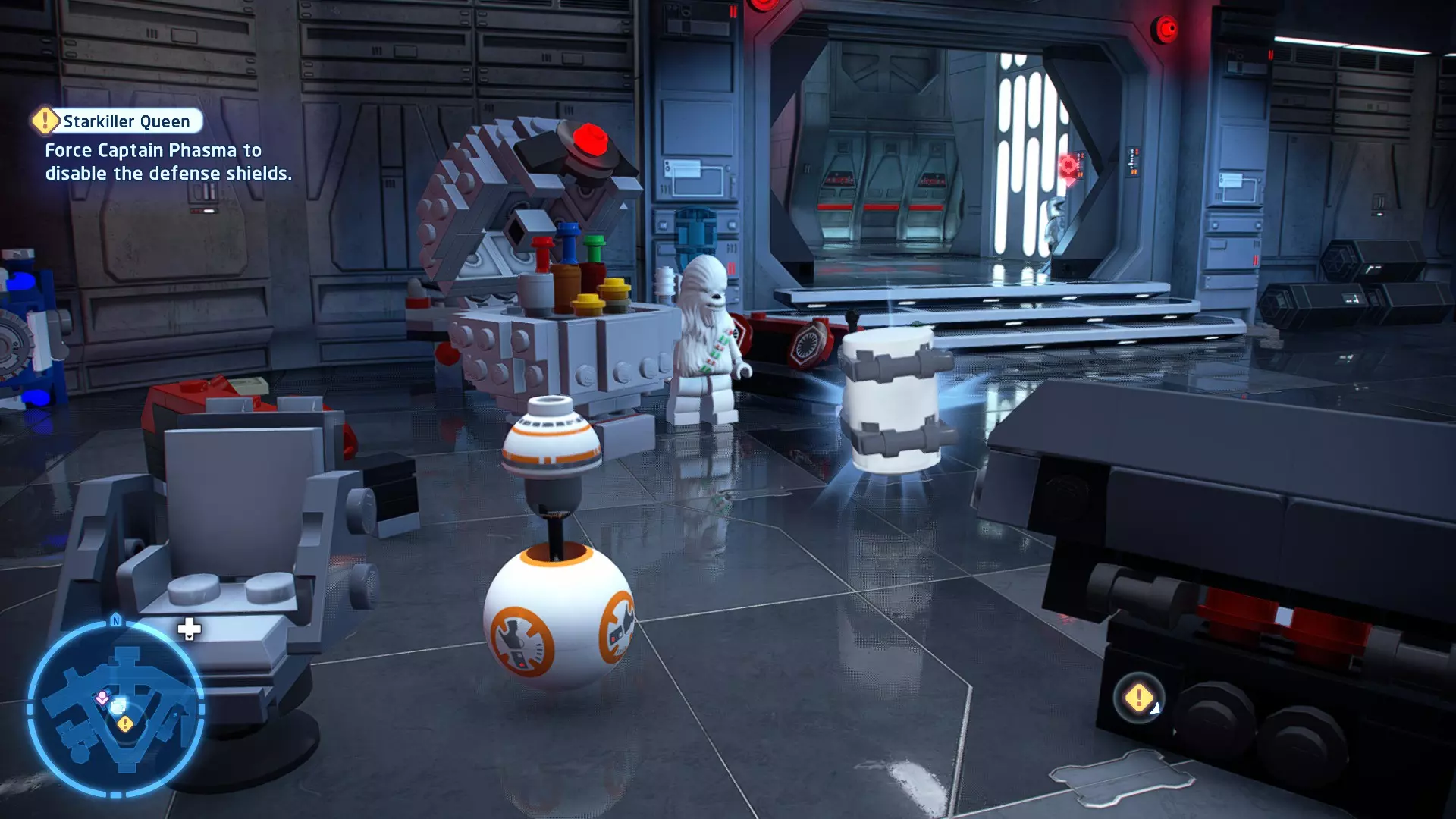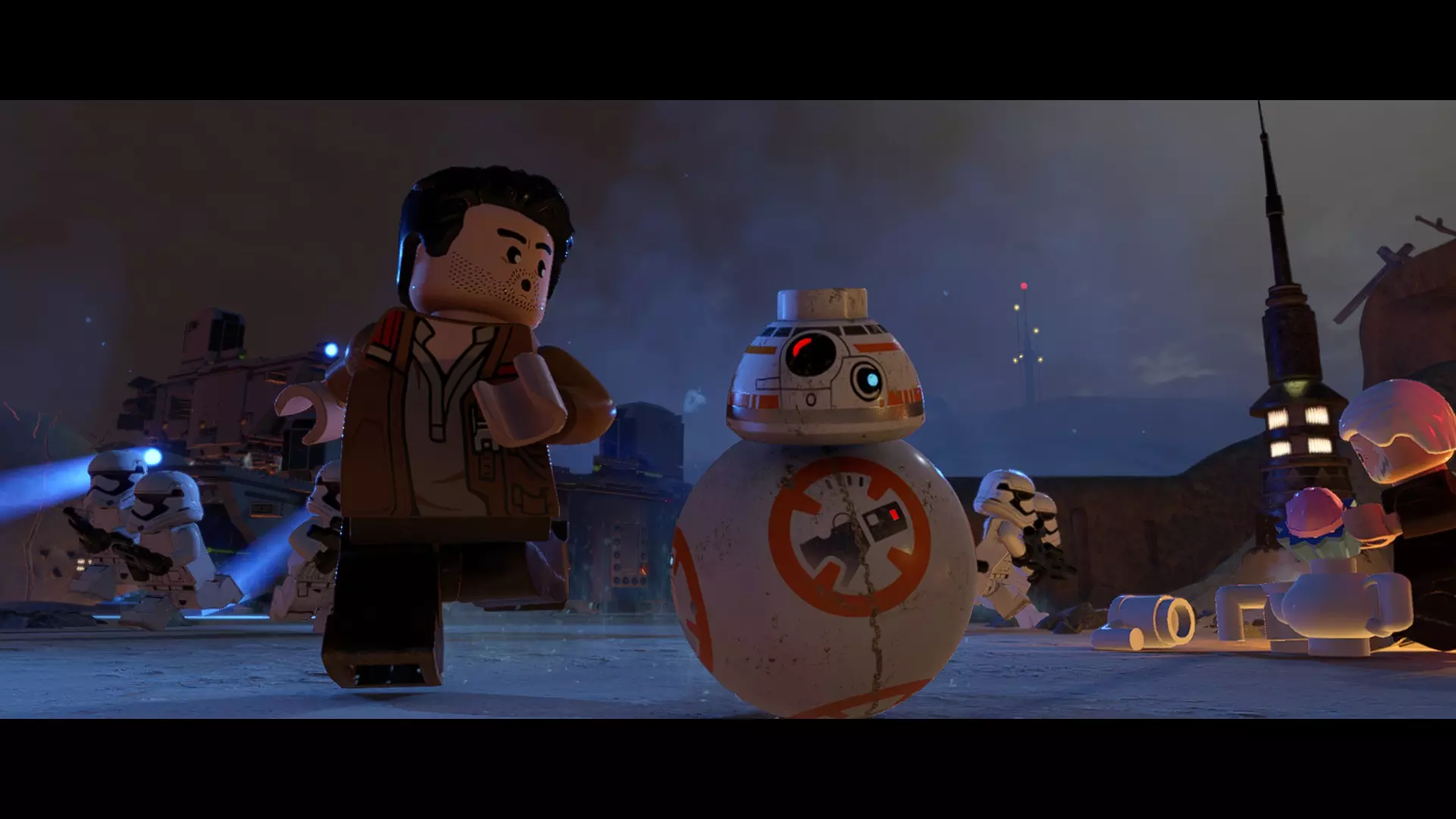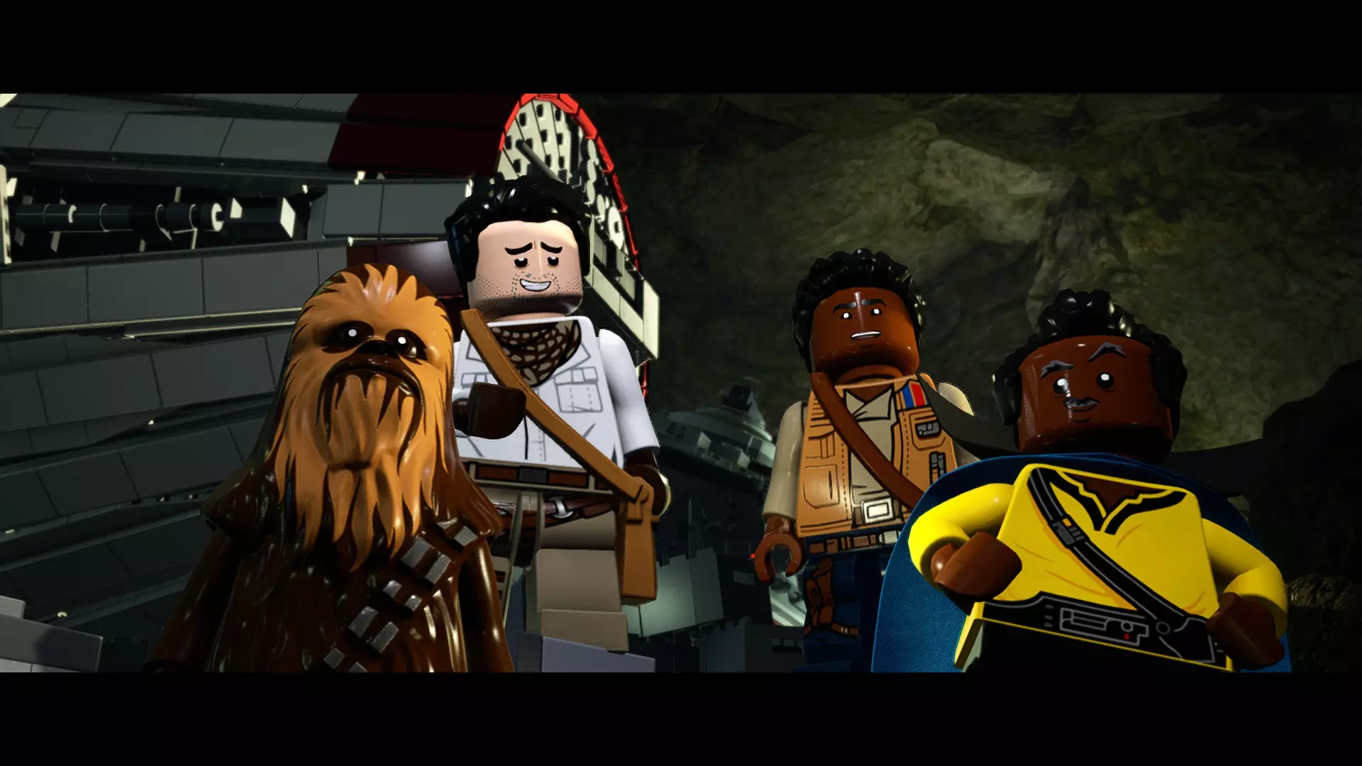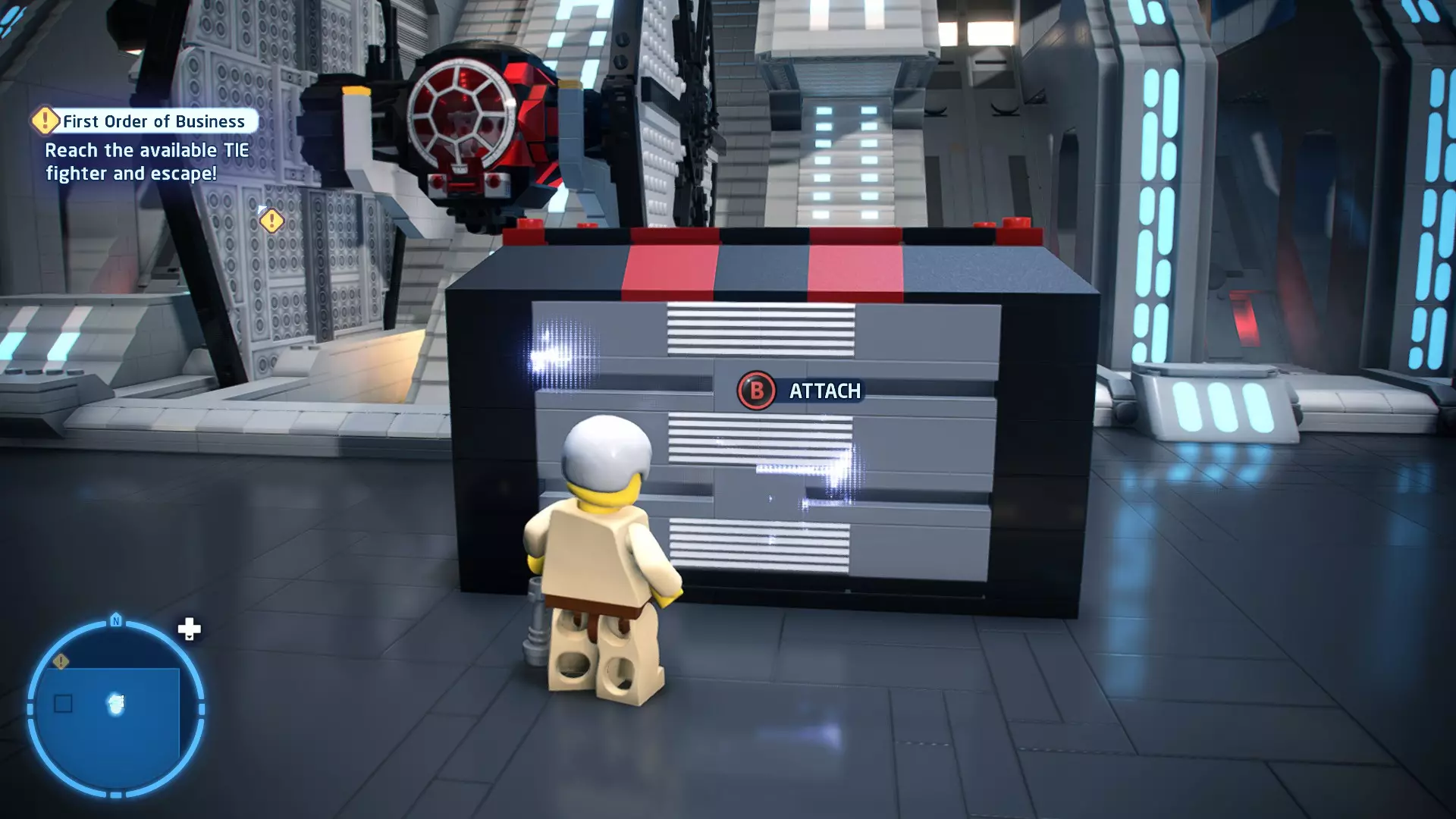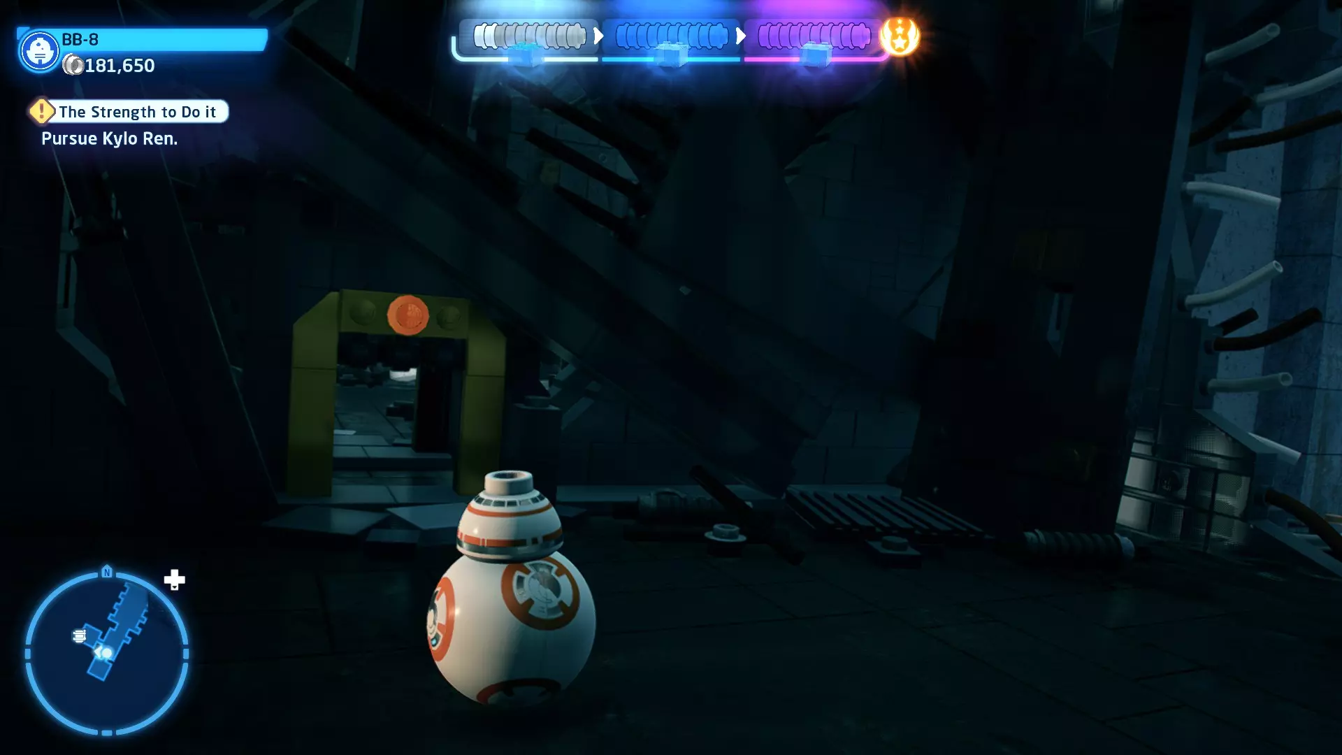 本关卡中有数台UA-TT步行机,每台都配备了探照灯。射击探照灯使其失效,即可完成此挑战。 幕间插曲 - 伍基人的救援 灾难降临!蕾伊意外使用原力闪电摧毁了丘巴卡的运输船后,丘巴卡和西斯匕首似乎都已遗失。幸运的是,关键的西斯铭文仍存在C-3PO的记忆中。 为了翻译西斯语言,波·达默龙带他们前往基吉米星球,寻求传奇机器人技师巴布·弗里克的帮助。 这位可爱的修补匠成功了,C-3PO为了获取寻路者的位置,光荣地牺牲了自己的记忆。 哦对了,丘巴卡还活着……角色:芬恩(第九部)、波·达默龙(第九部)、蕾伊(第九部) 当前任务:登上坚定号 是时候去营救丘伊了!飞向坚定号并降落在机库。 新任务:寻找丘巴卡 一路战斗穿过飞船,沿着标记穿过走廊。最终,你会到达一个安检站。对里面的士兵使用【心灵控制】技能,然后抓住拉杆打开门,这样你就能继续前进了。 继续沿着走廊前进,找到标记以继续剧情。