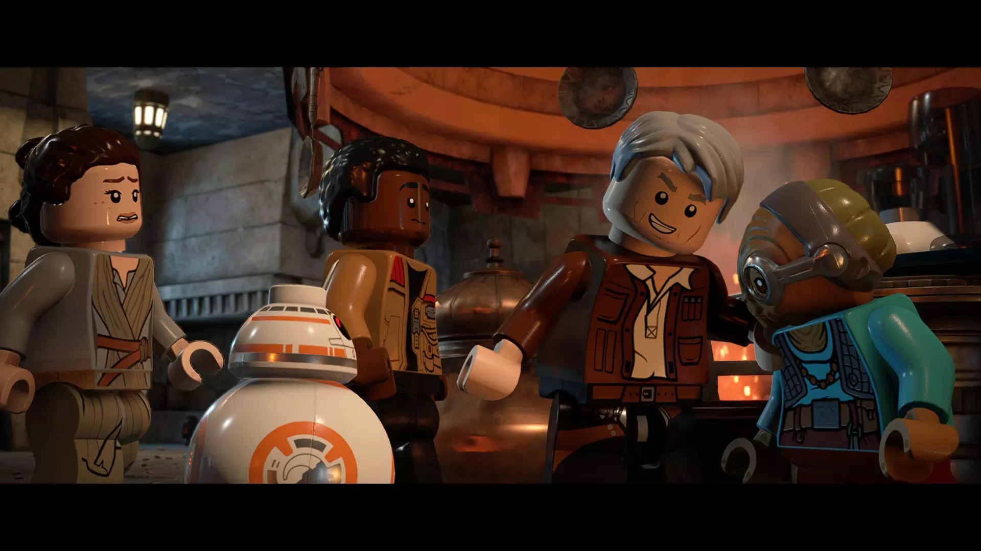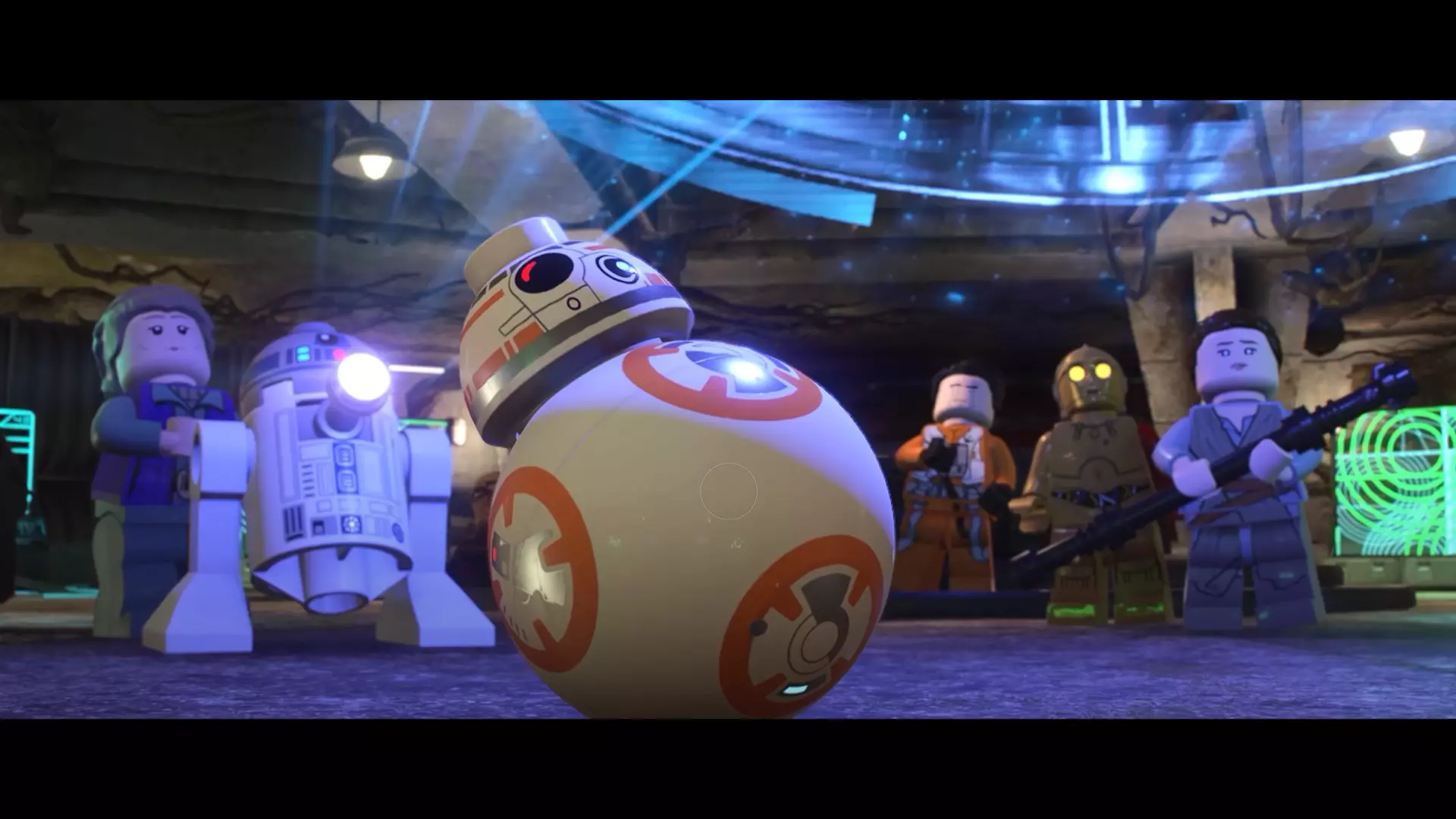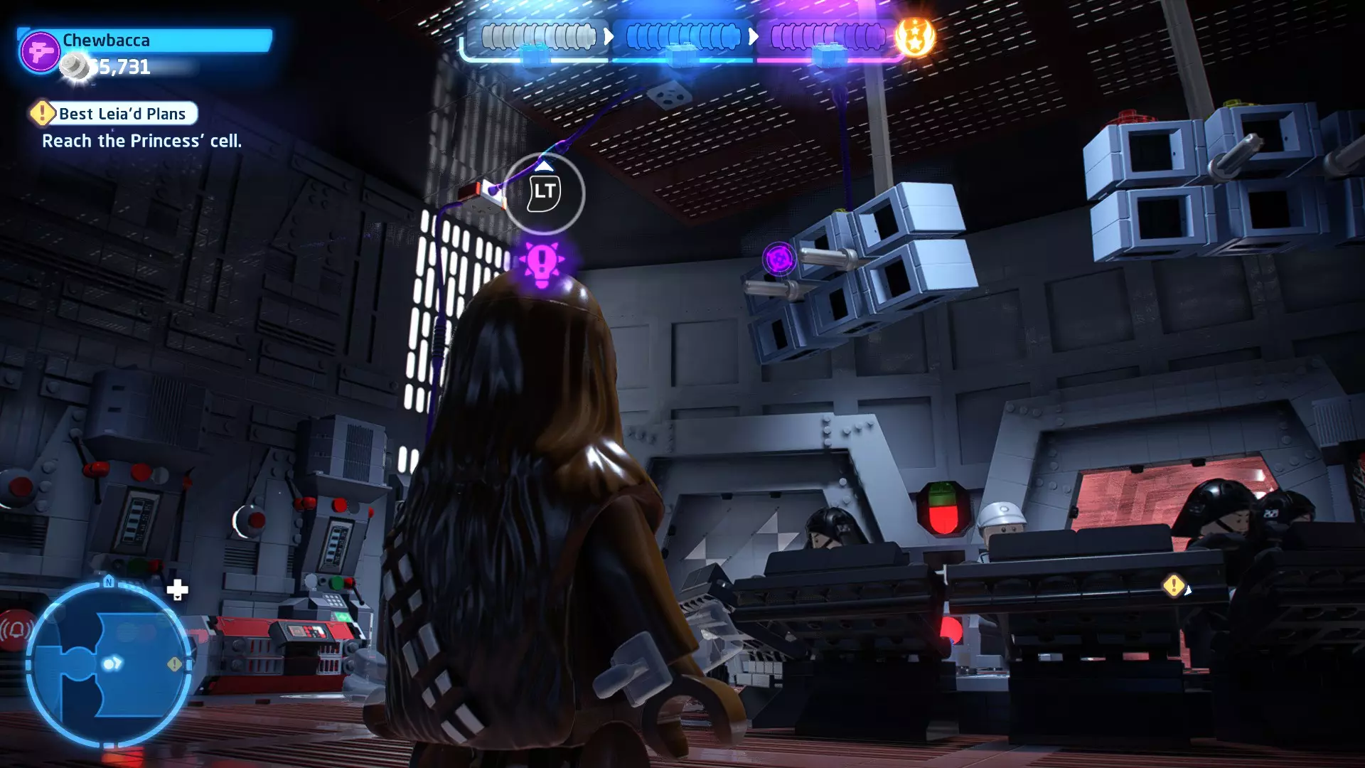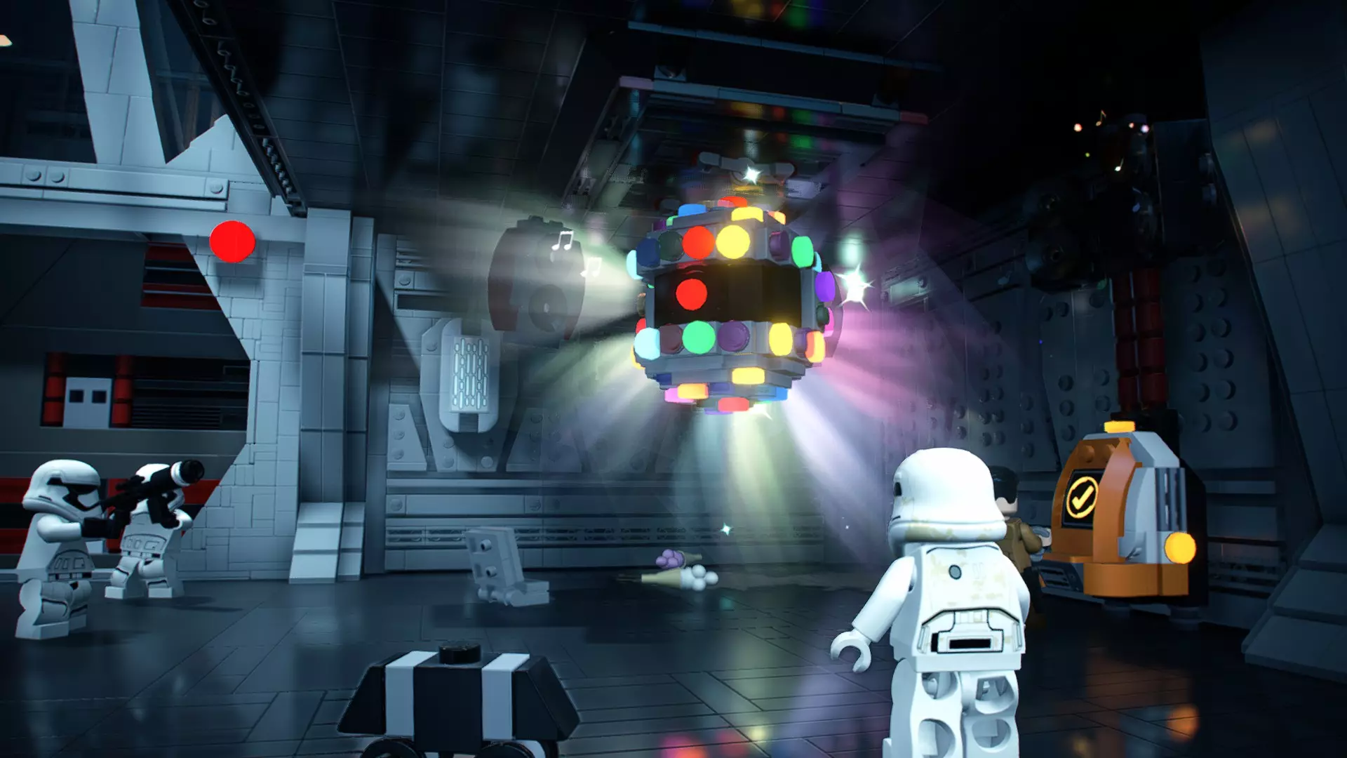 本关卡中有数台UA-TT步行机,每台都配备了探照灯。射击探照灯使其失效,即可完成此挑战。 幕间插曲 - 伍基人的救援 灾难降临!蕾伊意外使用原力闪电摧毁了丘巴卡的运输船后,丘巴卡和西斯匕首似乎都已遗失。幸运的是,关键的西斯铭文仍存在C-3PO的记忆中。 为了翻译西斯语言,波·达默龙带他们前往基吉米星球,寻求传奇机器人技师巴布·弗里克的帮助。 这位可爱的修补匠成功了,C-3PO为了获取寻路者的位置,光荣地牺牲了自己的记忆。 哦对了,丘巴卡还活着……角色:芬恩(第九部)、波·达默龙(第九部)、蕾伊(第九部) 当前任务:登上坚定号 是时候去营救丘伊了!飞向坚定号并降落在机库。 新任务:寻找丘巴卡 一路战斗穿过飞船,沿着标记穿过走廊。最终,你会到达一个安检站。对里面的士兵使用【心灵控制】技能,然后抓住拉杆打开门,这样你就能继续前进了。 继续沿着走廊前进,找到标记以继续剧情。