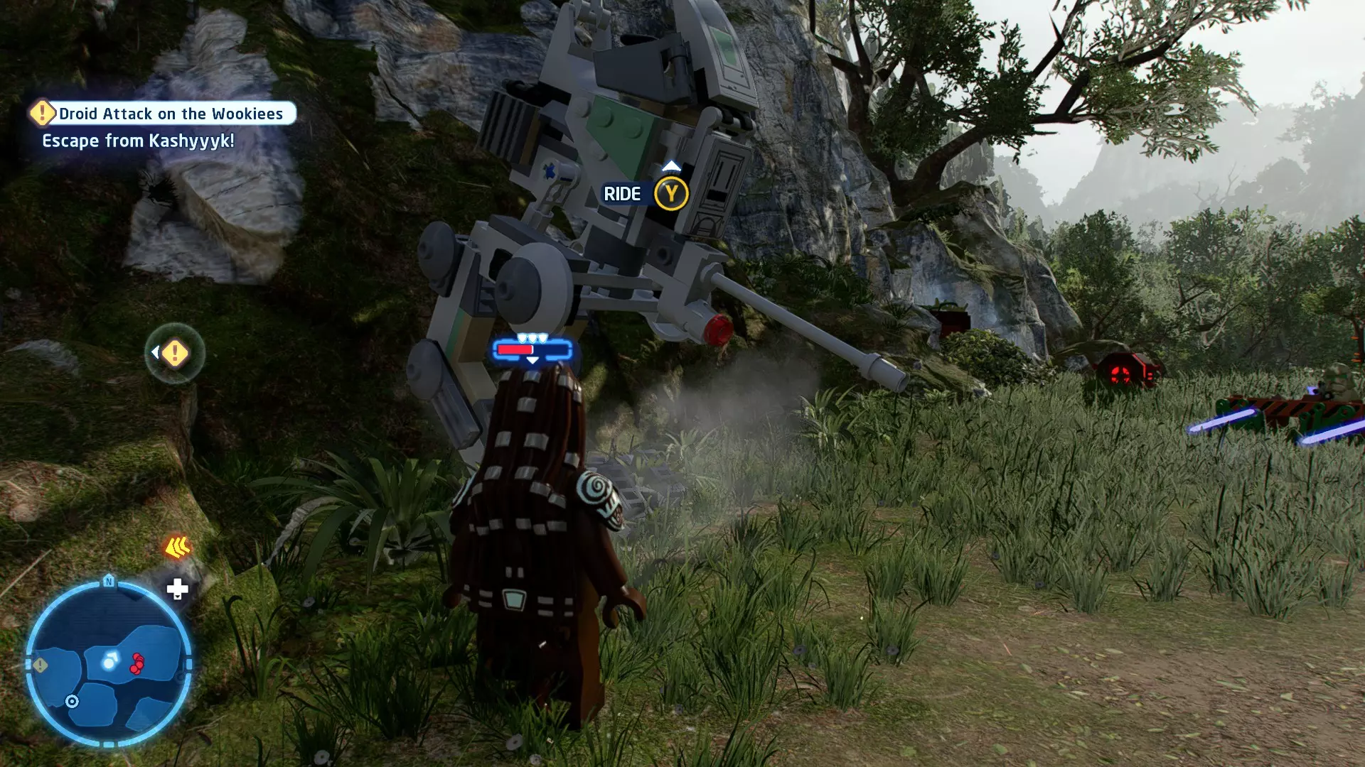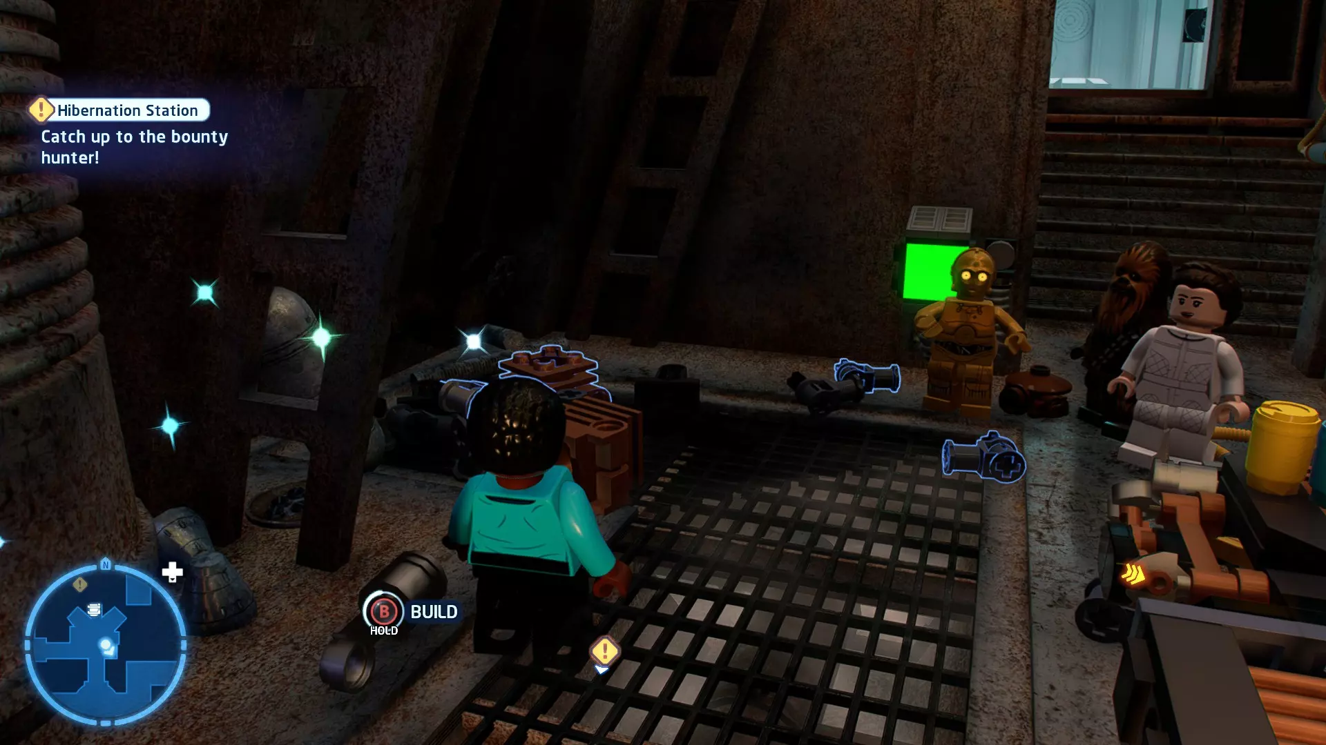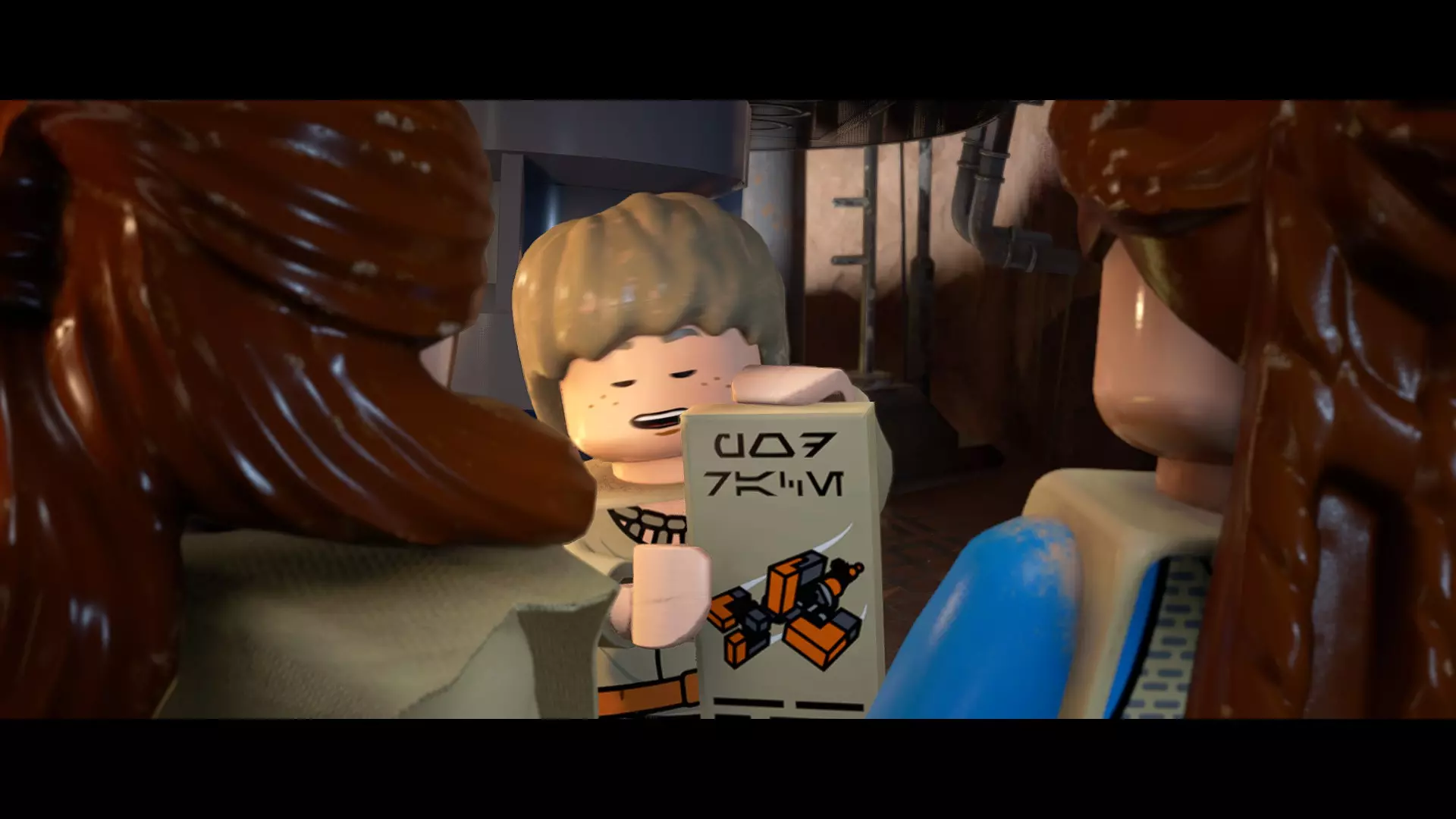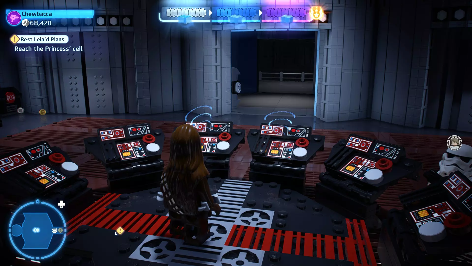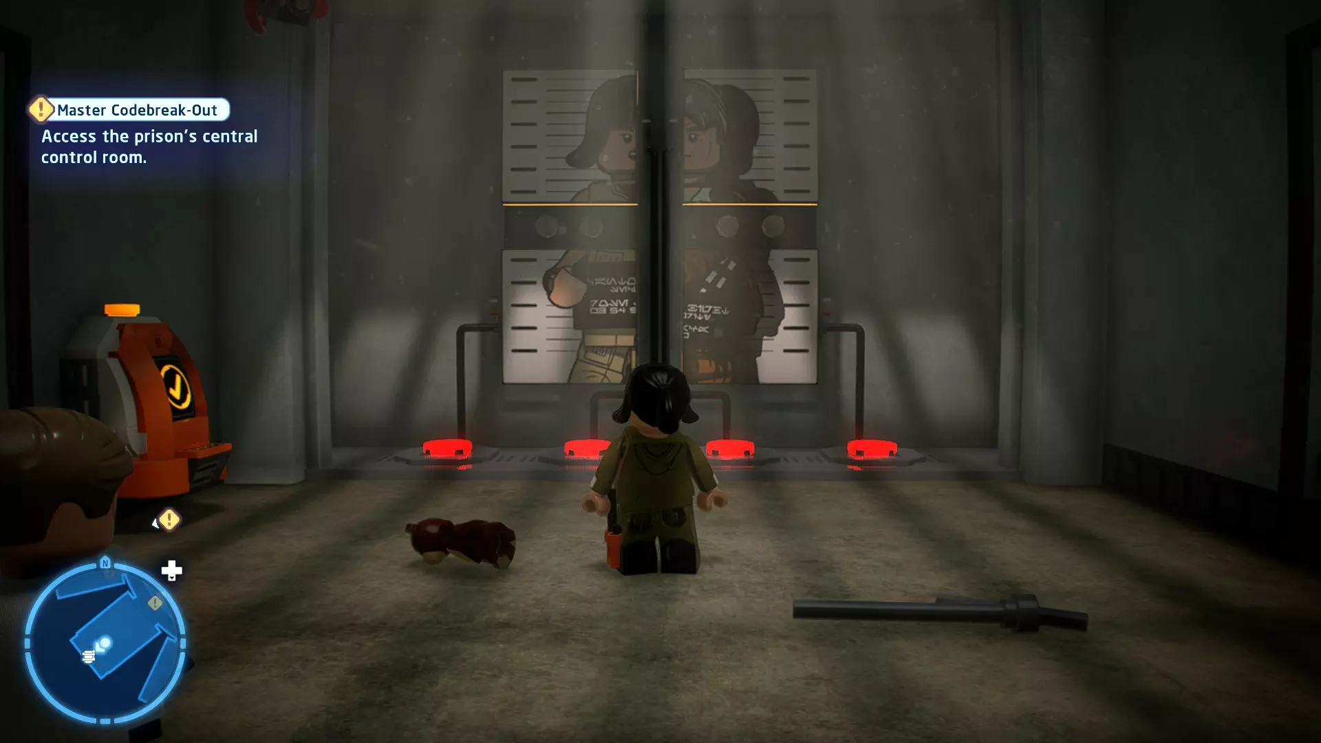 本关卡中有数台UA-TT步行机,每台都配备了探照灯。射击探照灯使其失效,即可完成此挑战。 幕间插曲 - 伍基人的救援 灾难降临!蕾伊意外使用原力闪电摧毁了丘巴卡的运输船后,丘巴卡和西斯匕首似乎都已遗失。幸运的是,关键的西斯铭文仍存在C-3PO的记忆中。 为了翻译西斯语言,波·达默龙带他们前往基吉米星球,寻求传奇机器人技师巴布·弗里克的帮助。 这位可爱的修补匠成功了,C-3PO为了获取寻路者的位置,光荣地牺牲了自己的记忆。 哦对了,丘巴卡还活着……角色:芬恩(第九部)、波·达默龙(第九部)、蕾伊(第九部) 当前任务:登上坚定号 是时候去营救丘伊了!飞向坚定号并降落在机库。 新任务:寻找丘巴卡 一路战斗穿过飞船,沿着标记穿过走廊。最终,你会到达一个安检站。对里面的士兵使用【心灵控制】技能,然后抓住拉杆打开门,这样你就能继续前进了。 继续沿着走廊前进,找到标记以继续剧情。