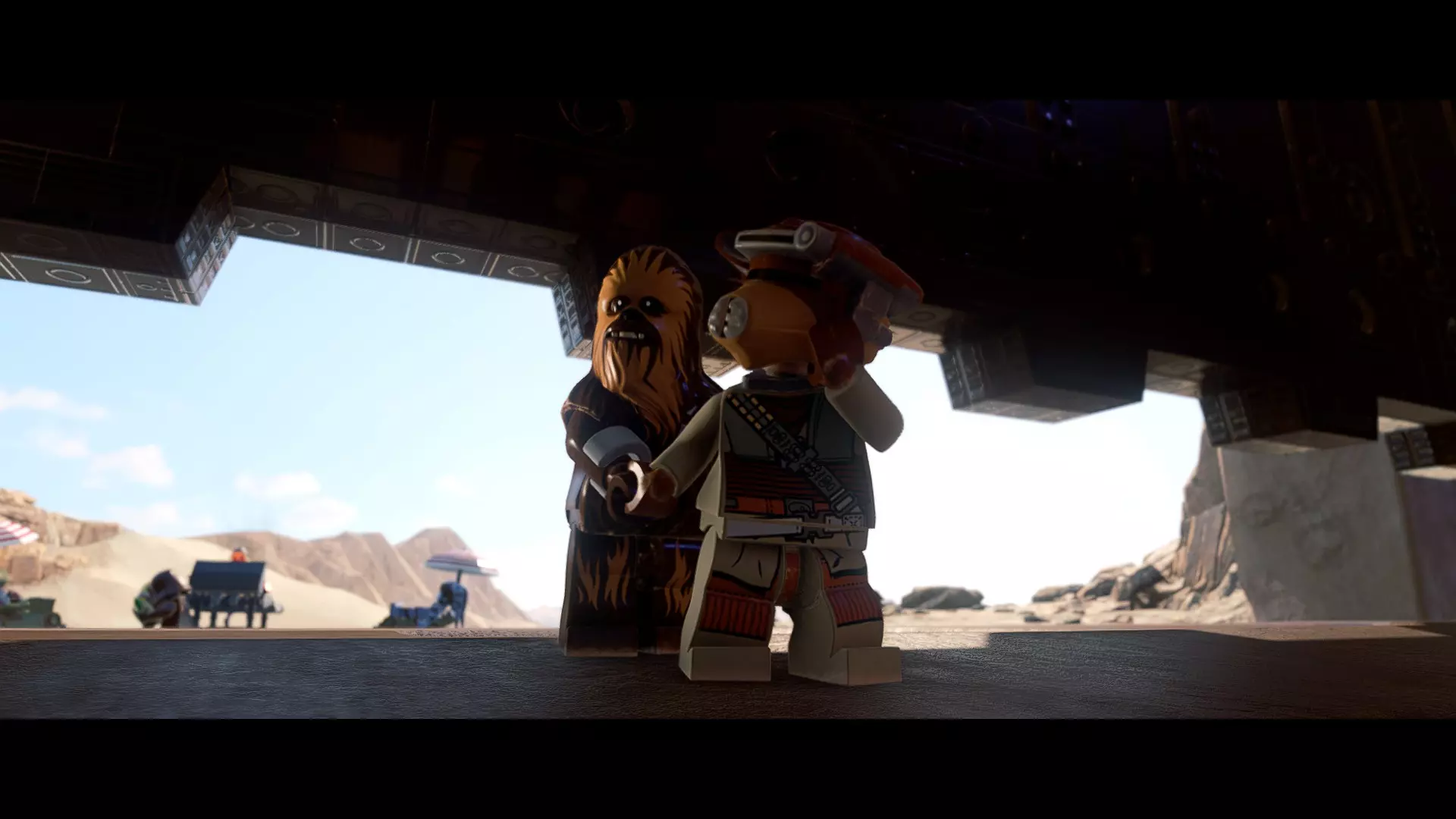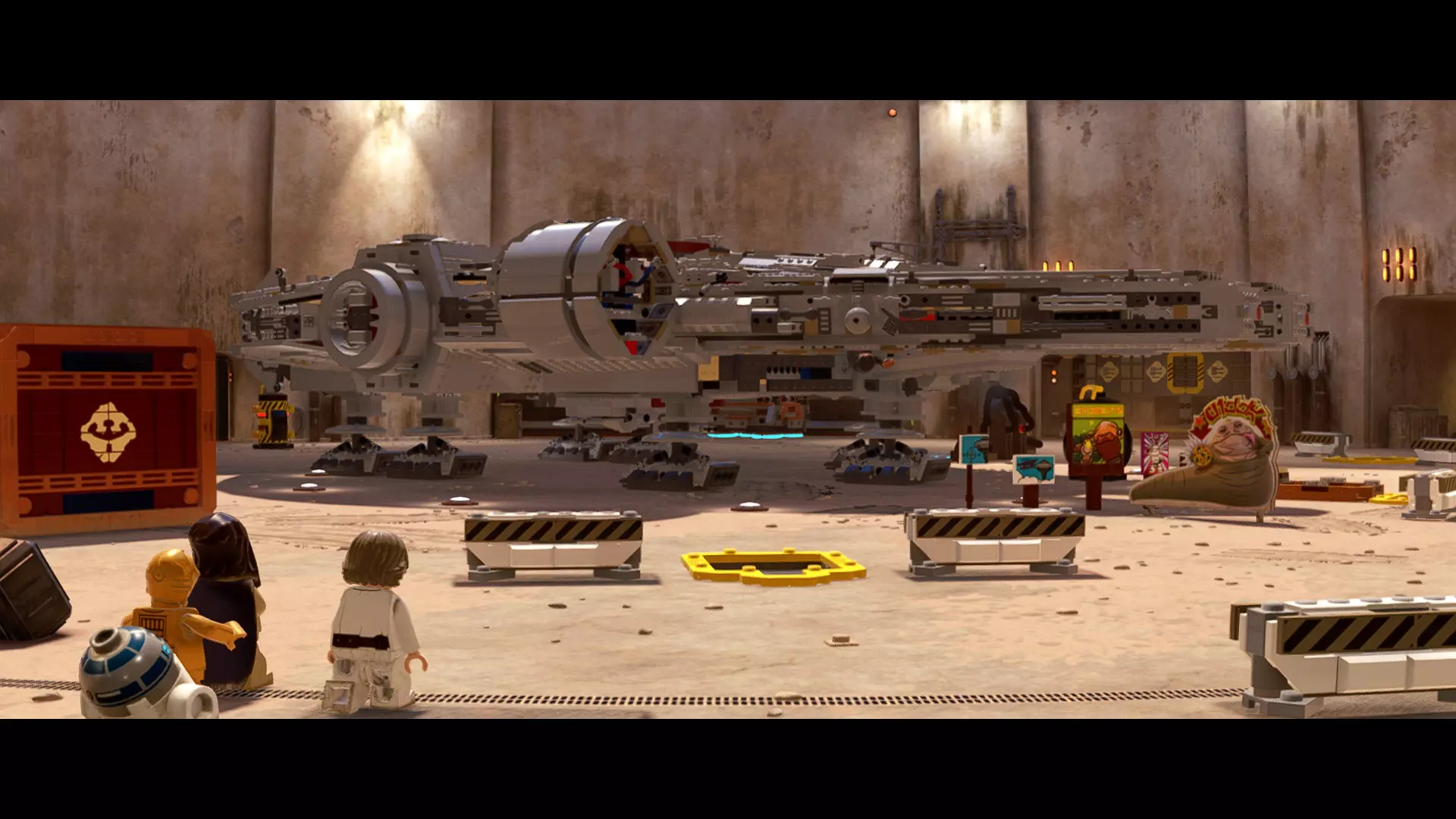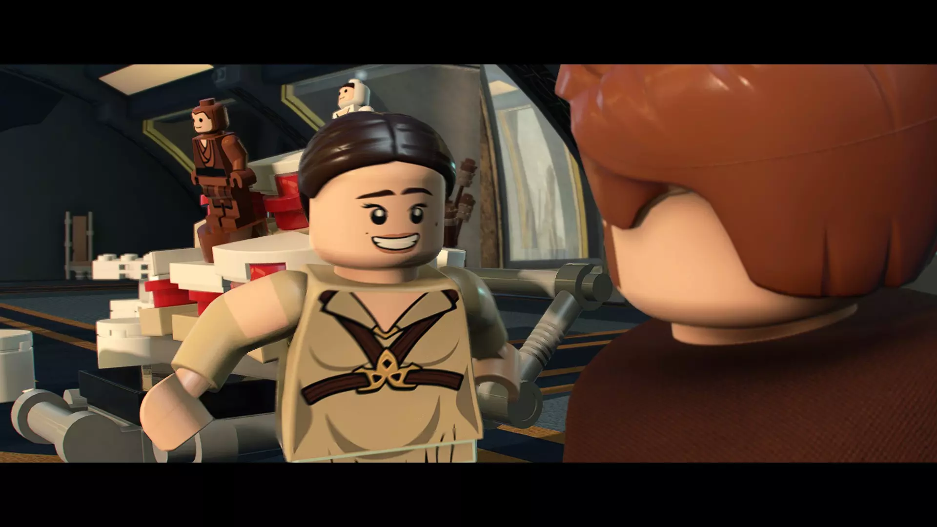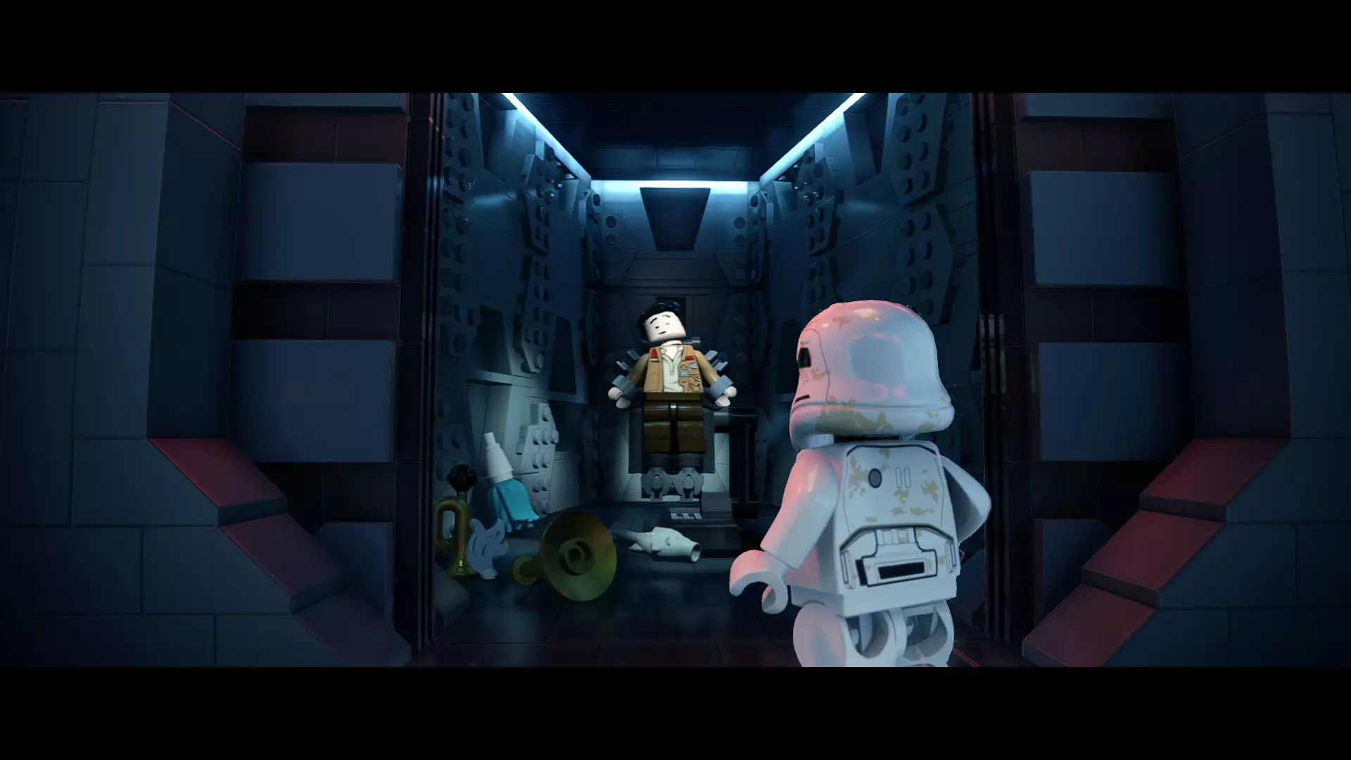 本关卡中有数台UA-TT步行机,每台都配备了探照灯。射击探照灯使其失效,即可完成此挑战。 幕间插曲 - 伍基人的救援 灾难降临!蕾伊意外使用原力闪电摧毁了丘巴卡的运输船后,丘巴卡和西斯匕首似乎都已遗失。幸运的是,关键的西斯铭文仍存在C-3PO的记忆中。 为了翻译西斯语言,波·达默龙带他们前往基吉米星球,寻求传奇机器人技师巴布·弗里克的帮助。 这位可爱的修补匠成功了,C-3PO为了获取寻路者的位置,光荣地牺牲了自己的记忆。 哦对了,丘巴卡还活着……角色:芬恩(第九部)、波·达默龙(第九部)、蕾伊(第九部) 当前任务:登上坚定号 是时候去营救丘伊了!飞向坚定号并降落在机库。 新任务:寻找丘巴卡 一路战斗穿过飞船,沿着标记穿过走廊。最终,你会到达一个安检站。对里面的士兵使用【心灵控制】技能,然后抓住拉杆打开门,这样你就能继续前进了。 继续沿着走廊前进,找到标记以继续剧情。