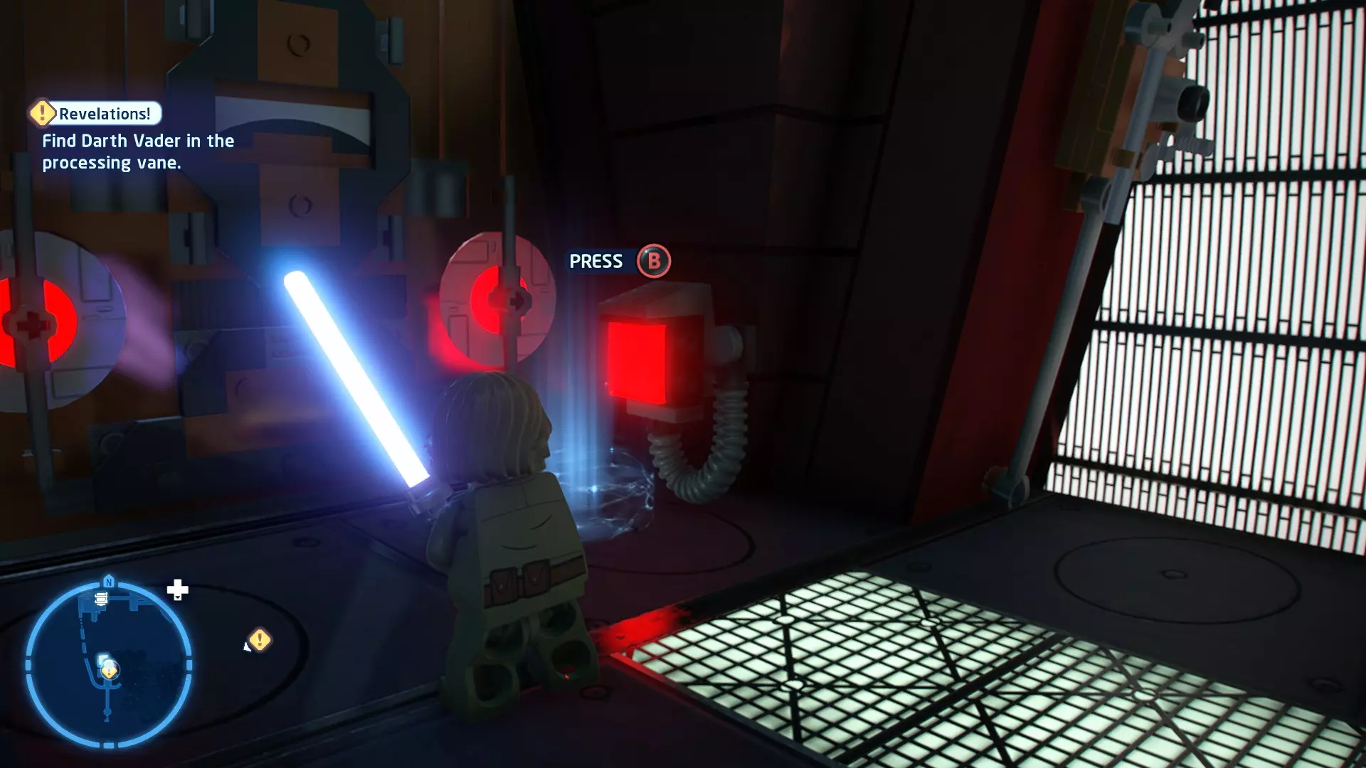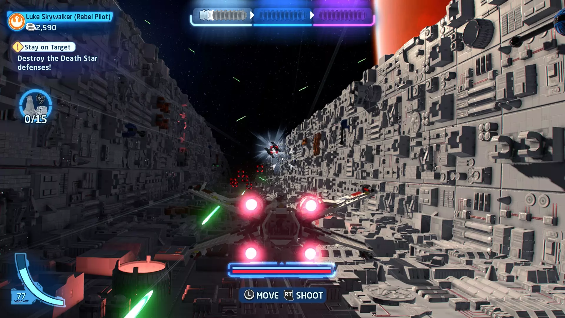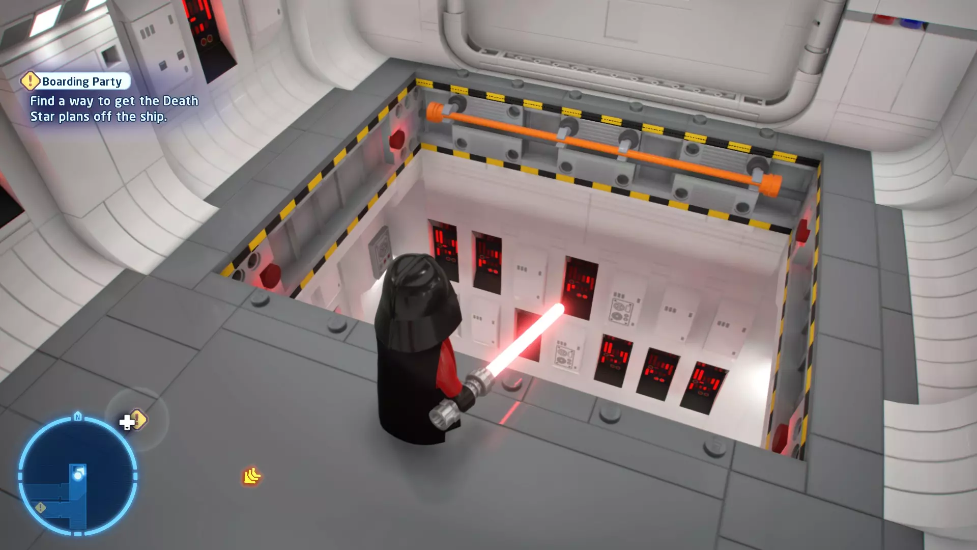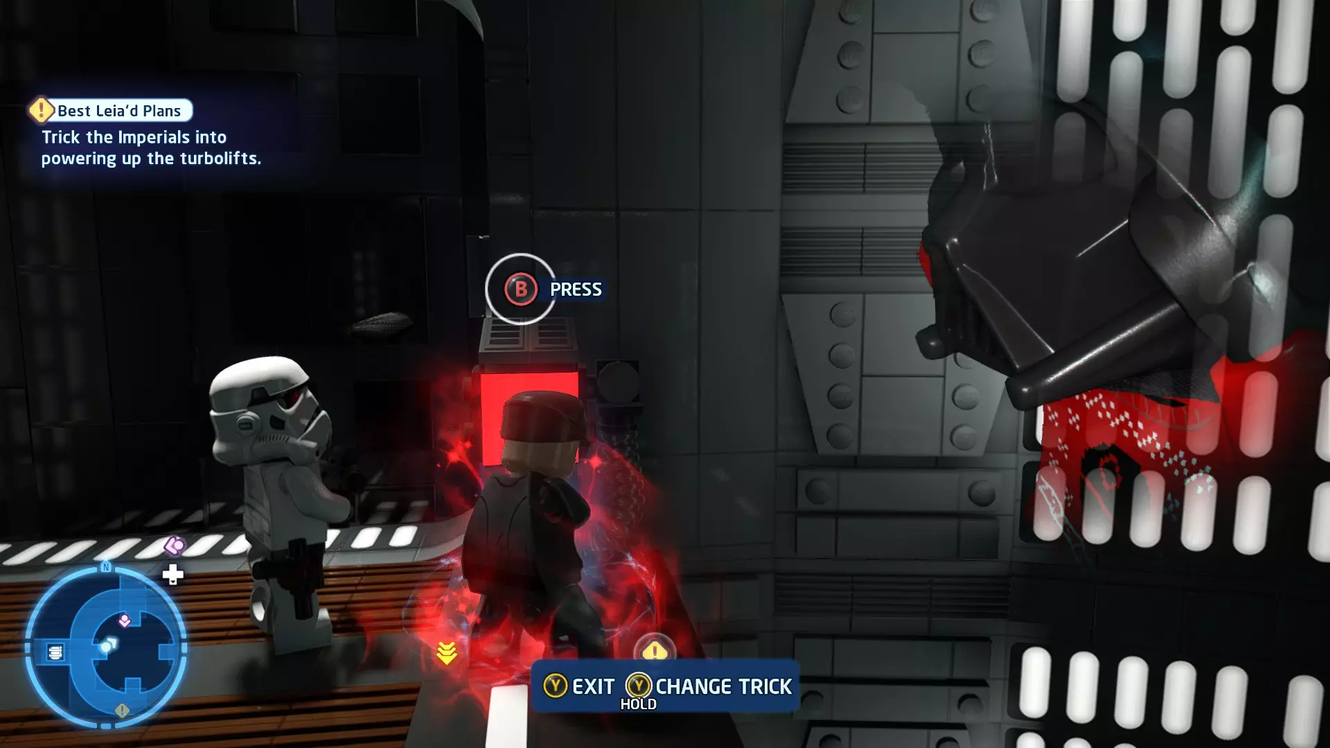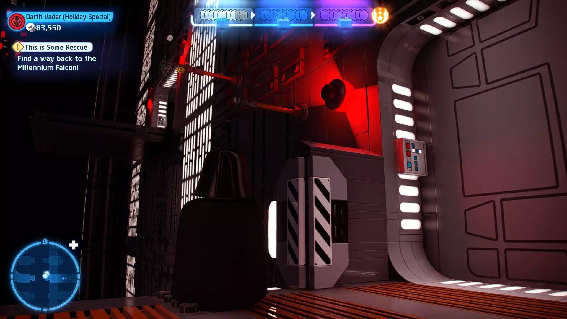 在水边与凯洛战斗时,会有海浪不时涌入该区域。即将到来的海浪会用一个大红矩形标记,你需要引诱凯洛进入矩形区域,让他被海浪击中。注意,海浪也可能会把你冲出去! 挑战3 - 黄金机会 详情:找到一条无需打开任何门就能穿过死星的路线