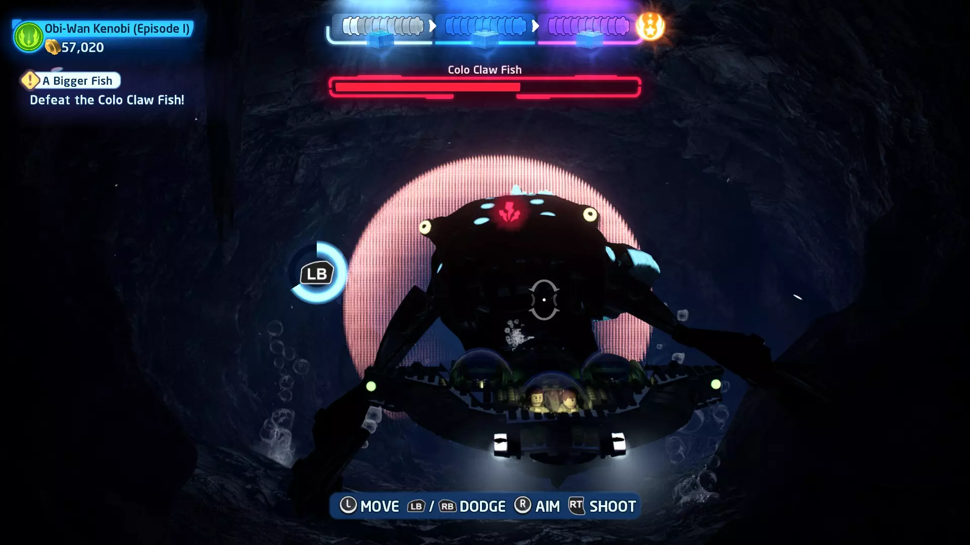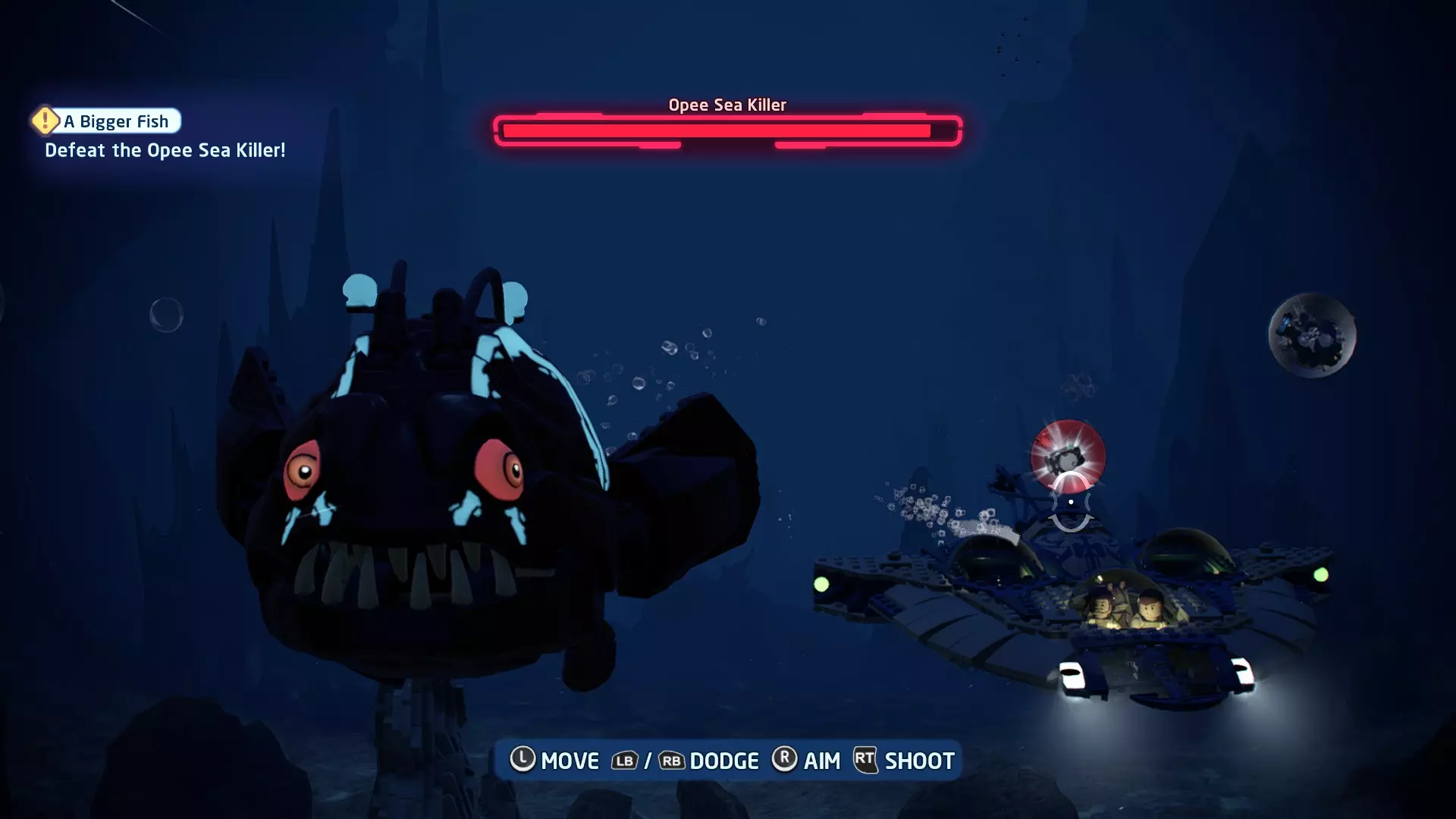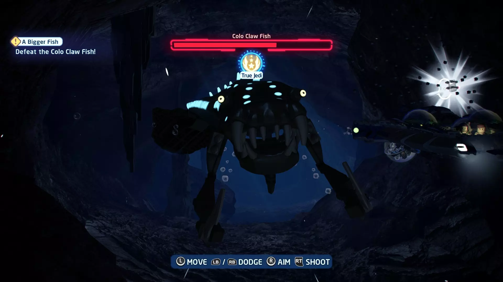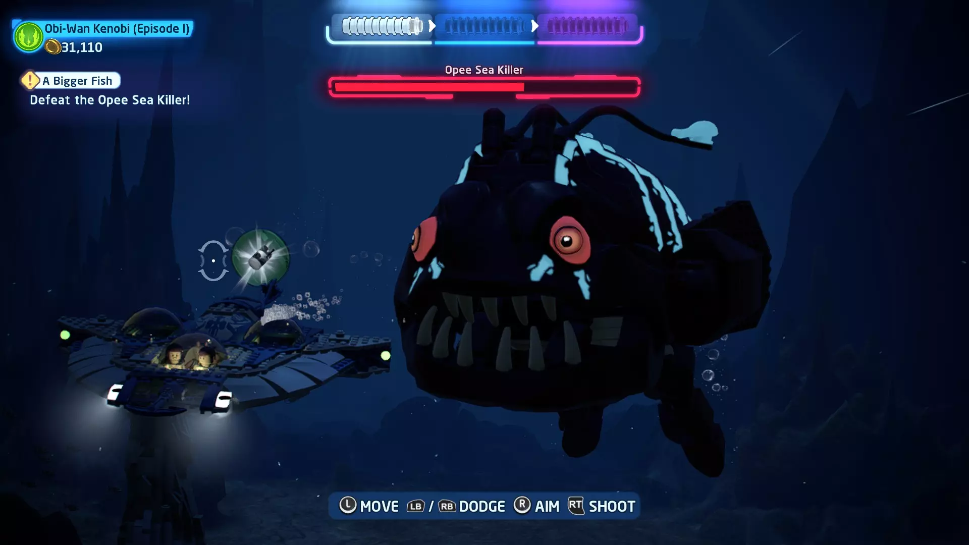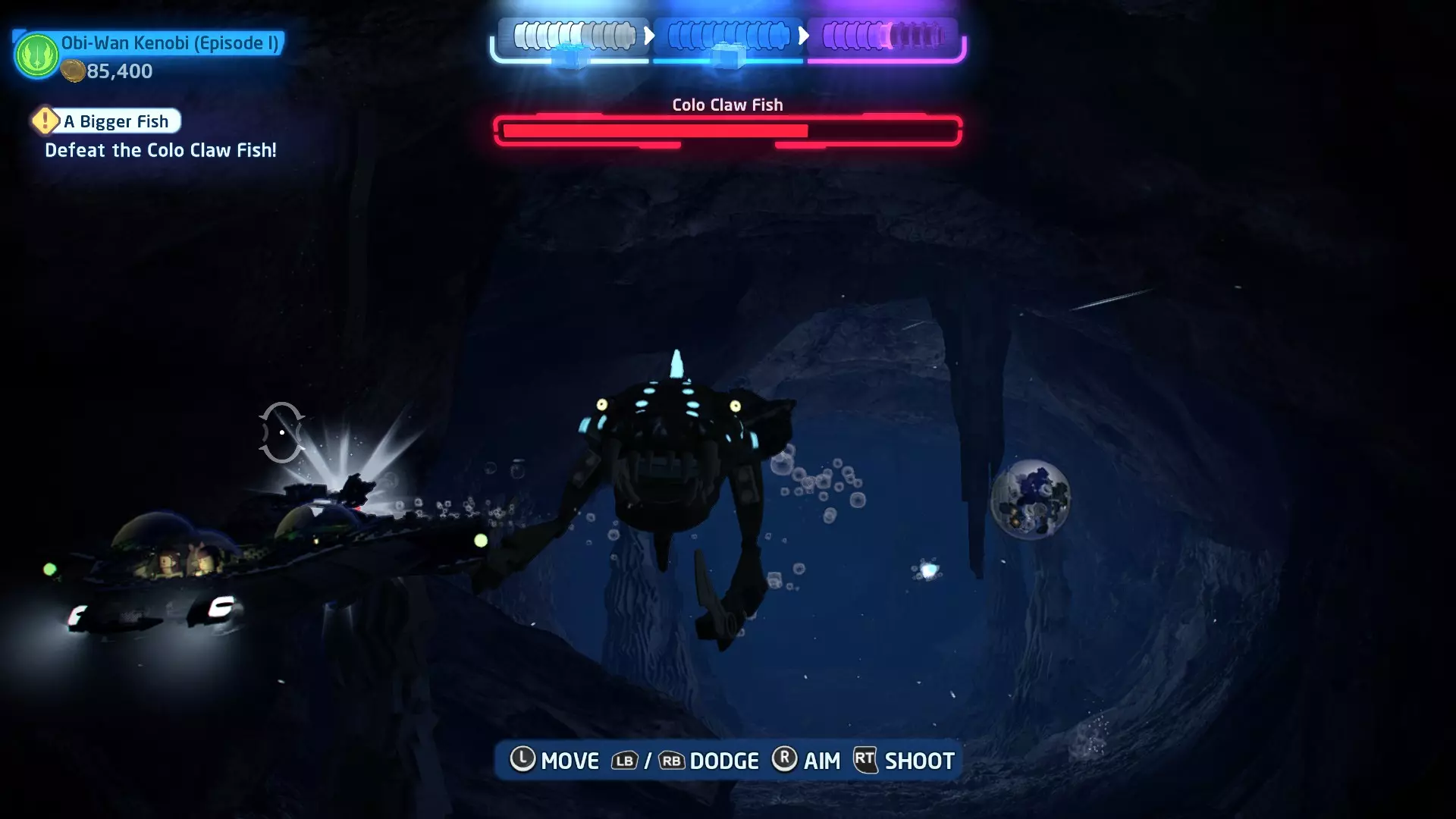 新任务:前往三泡邦戈船坞 过场动画结束后,贾巴·宾克斯将加入队伍。跟随标记前往邦戈船坞,在那里你会找到一个英雄终端。 新任务:寻找打开邦戈船坞入口的方法 让贾巴·宾克斯使用英雄终端降下屏障,这样你就能进入内部。 新任务:驾驶邦戈潜艇穿越星球核心 进入内部,找到开始第一个故事关卡的标记。 解锁角色:贾巴·宾克斯 A Bigger Fish - 故事模式