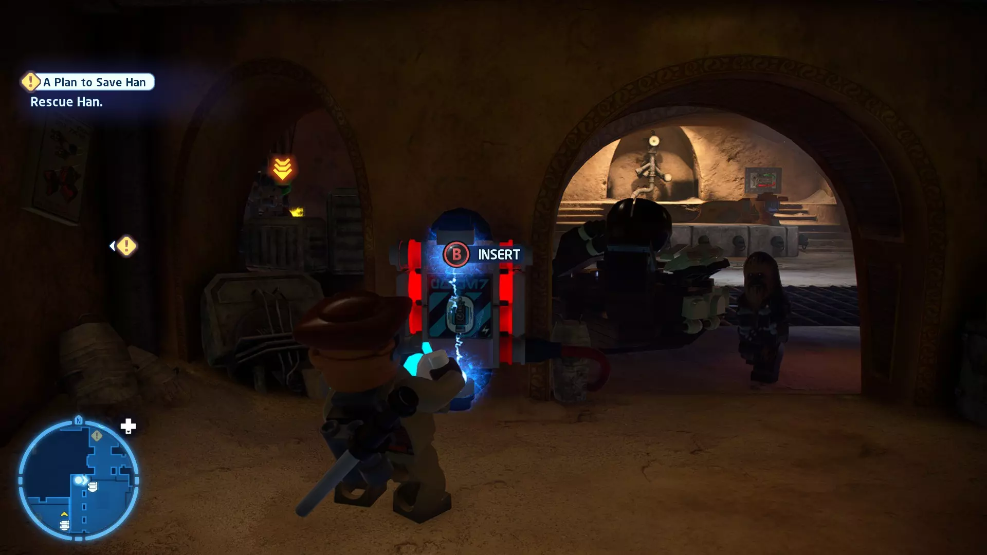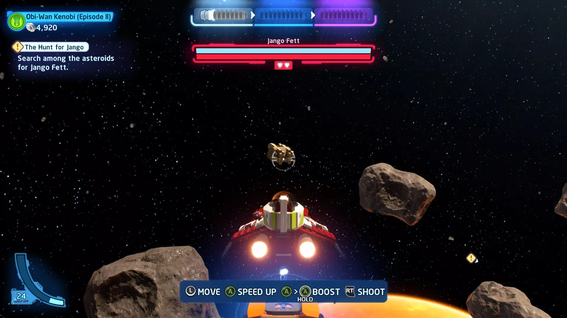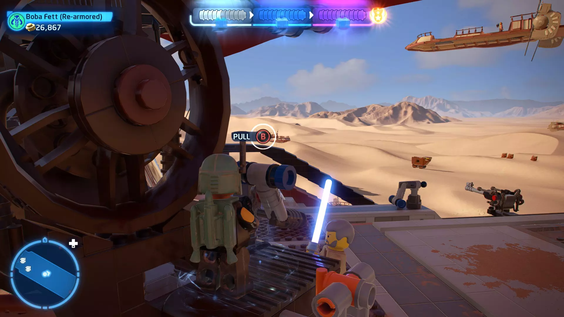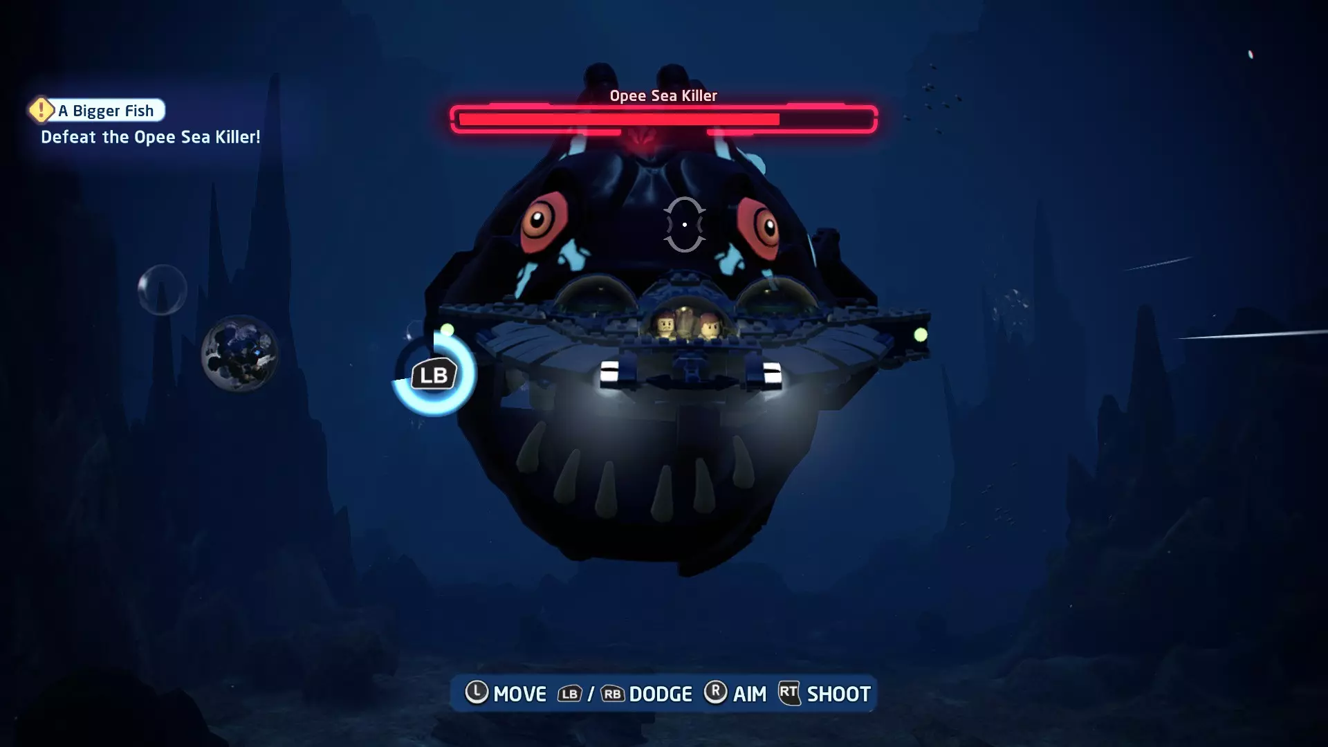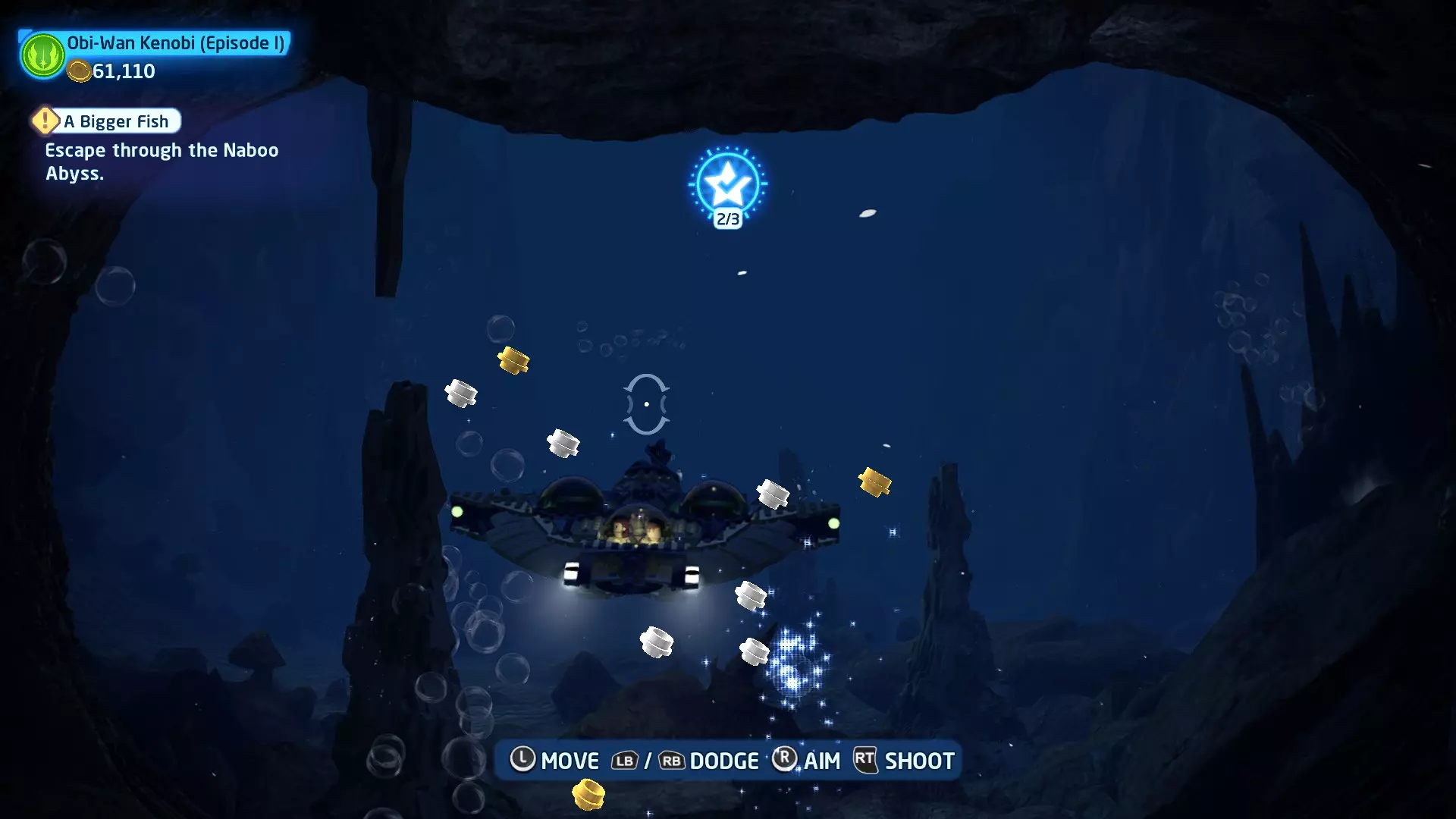 新任务:前往三泡邦戈船坞 过场动画结束后,贾巴·宾克斯将加入队伍。跟随标记前往邦戈船坞,在那里你会找到一个英雄终端。 新任务:寻找打开邦戈船坞入口的方法 让贾巴·宾克斯使用英雄终端降下屏障,这样你就能进入内部。 新任务:驾驶邦戈潜艇穿越星球核心 进入内部,找到开始第一个故事关卡的标记。 解锁角色:贾巴·宾克斯 A Bigger Fish - 故事模式